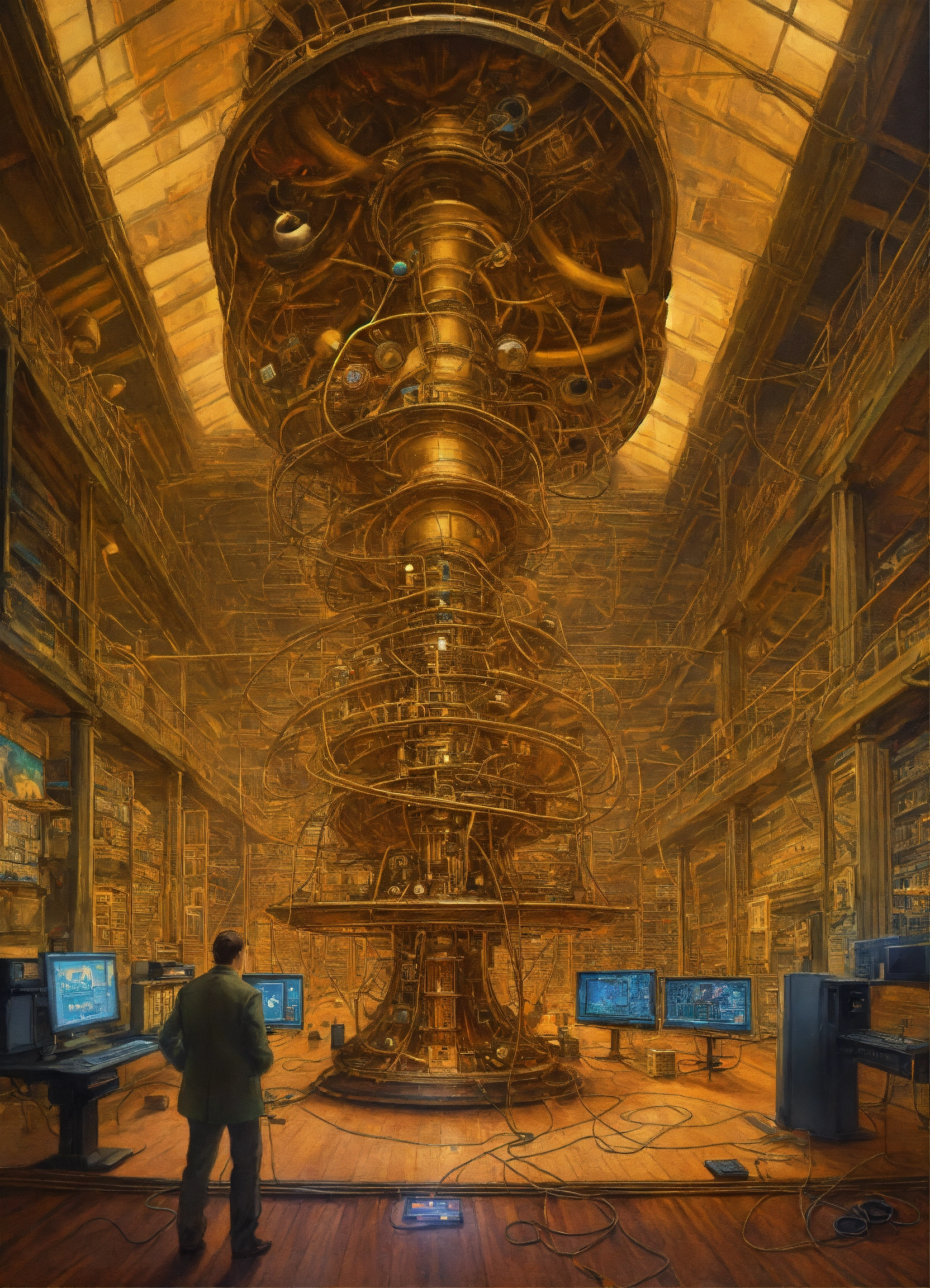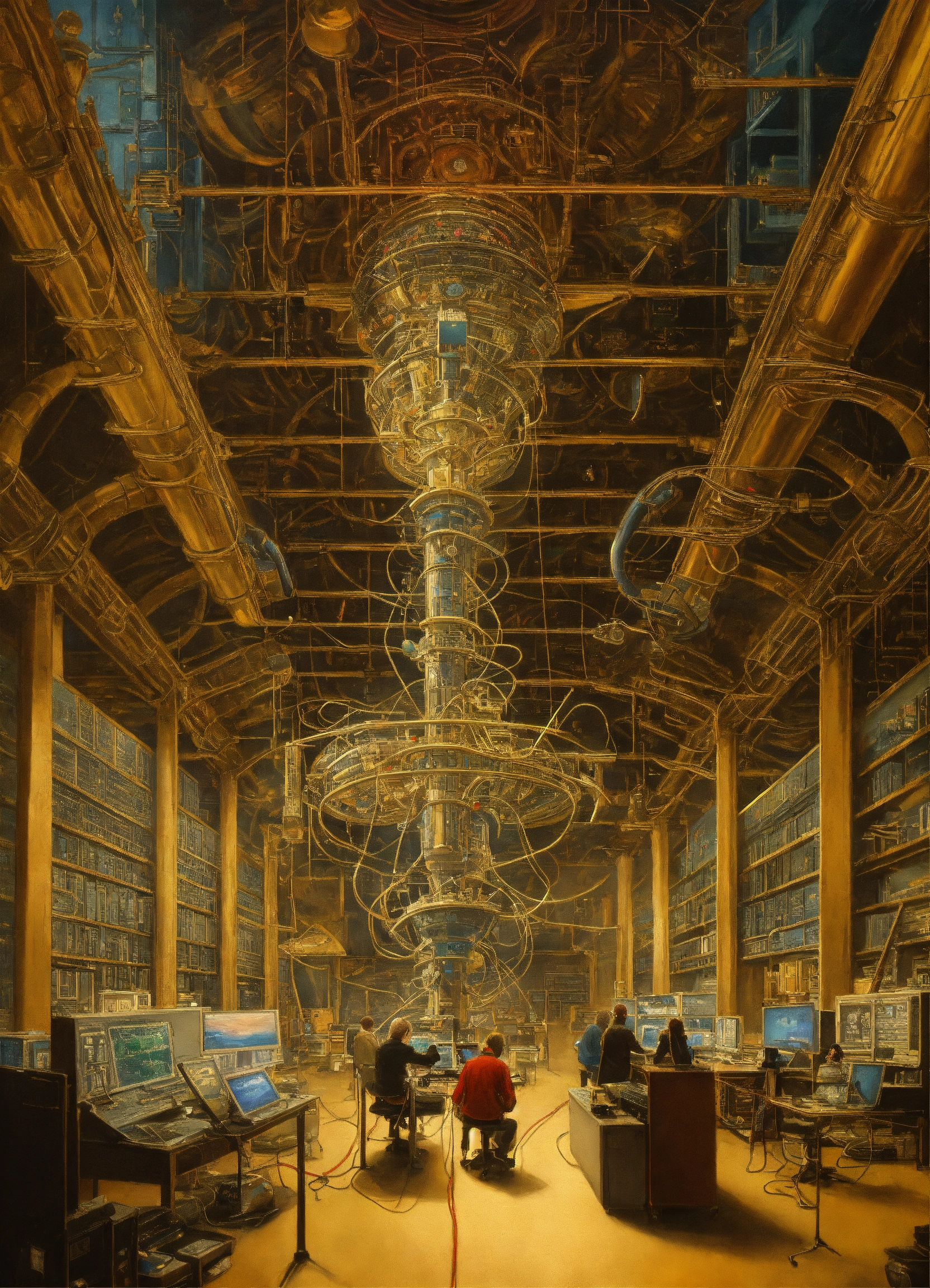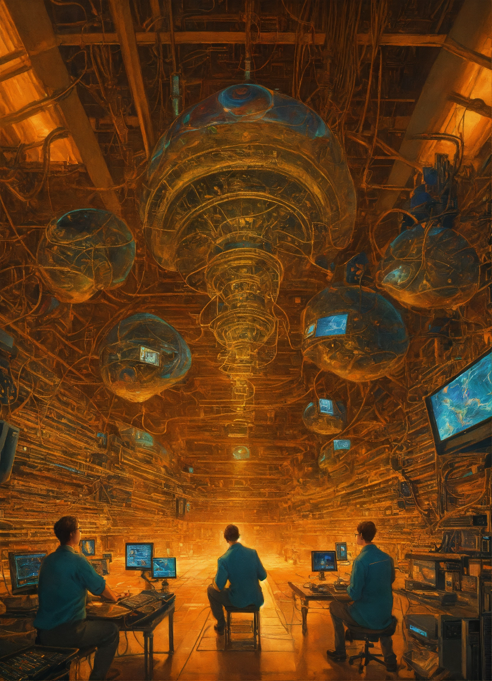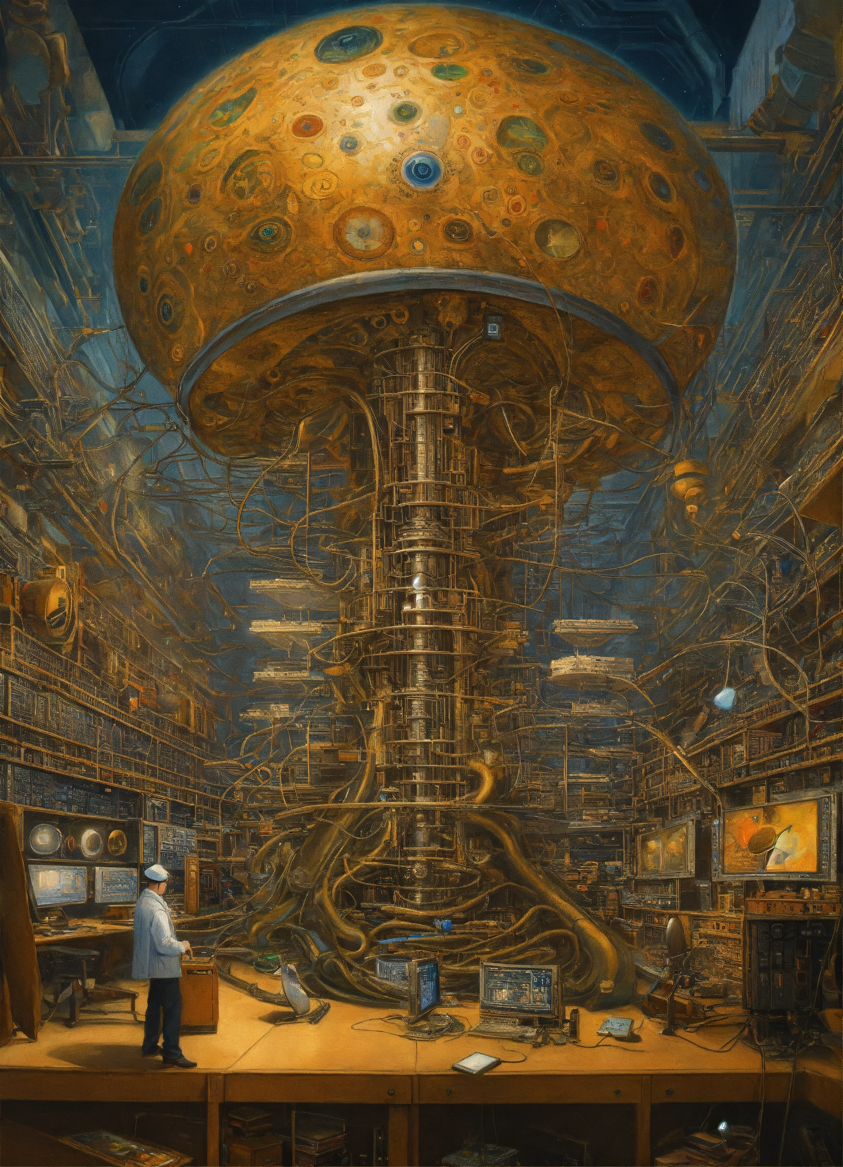 In the center of the room, a colossal trumpet is intricately connected to advanced computers housed in the surrounding racks by millions of wires. this extraordinary brain possesses two eyes that fixate upon us with astonishing precision, captured in a painting with unparalleled detail and resolution at 64k, there are two alien scientists who are examining the brain