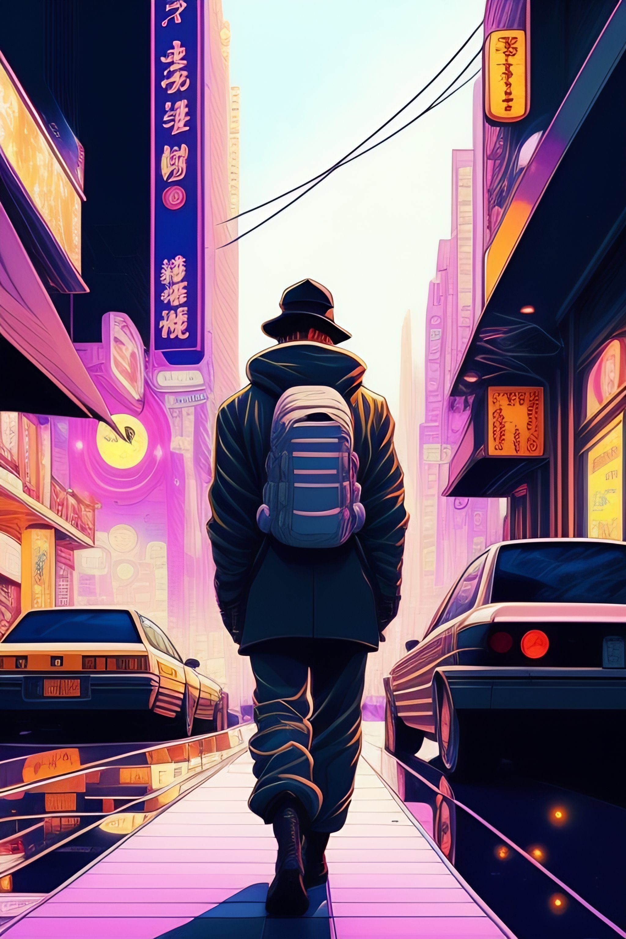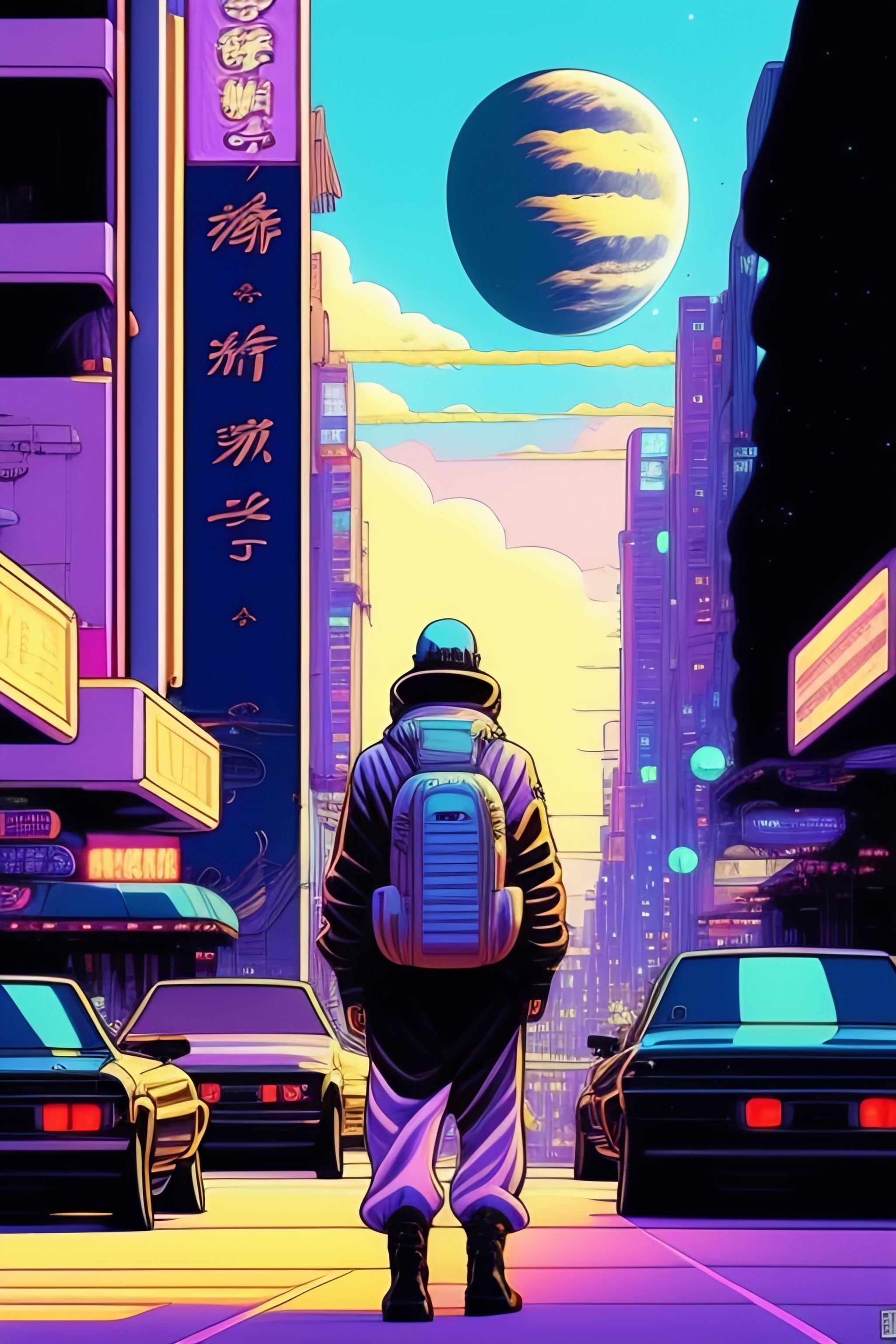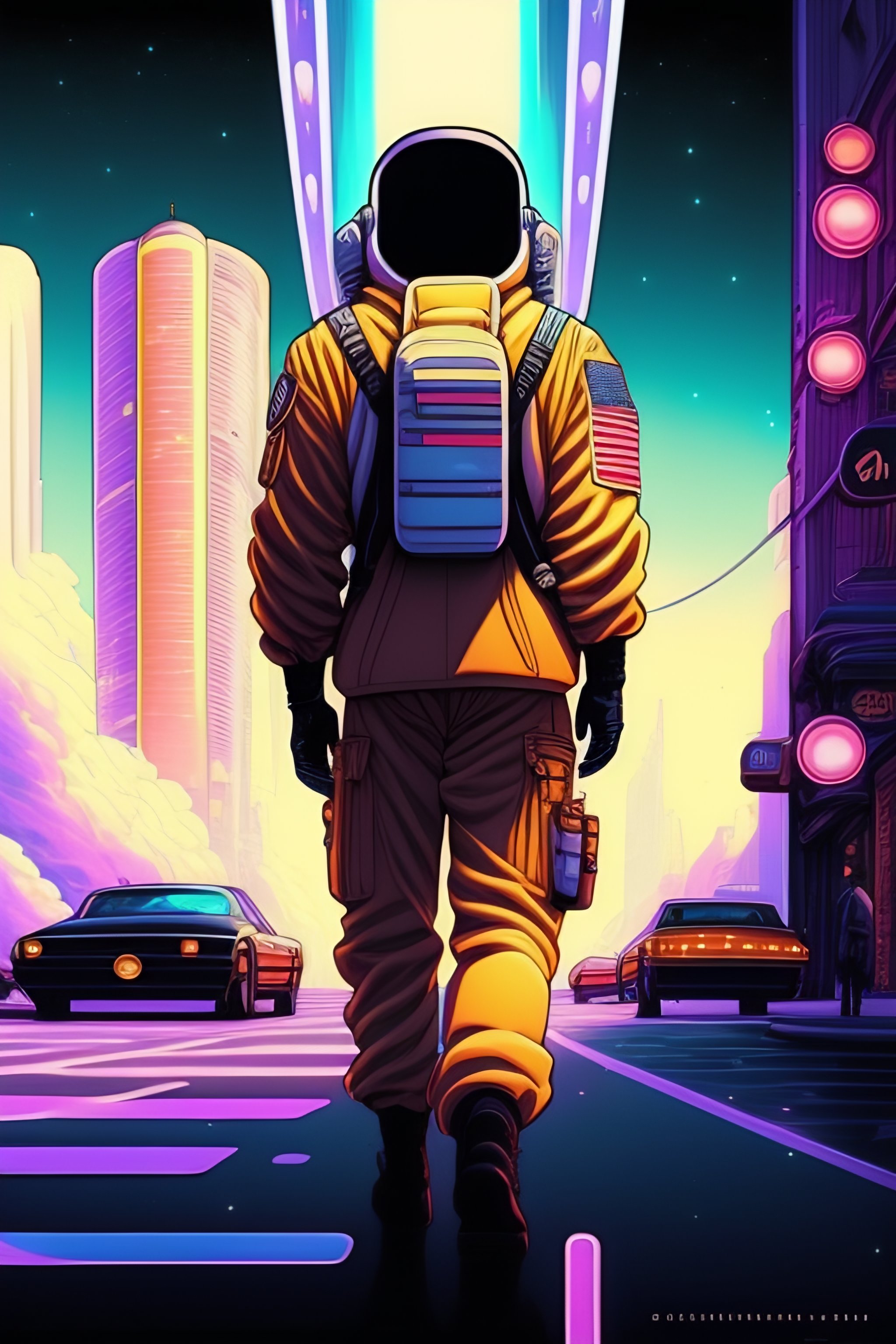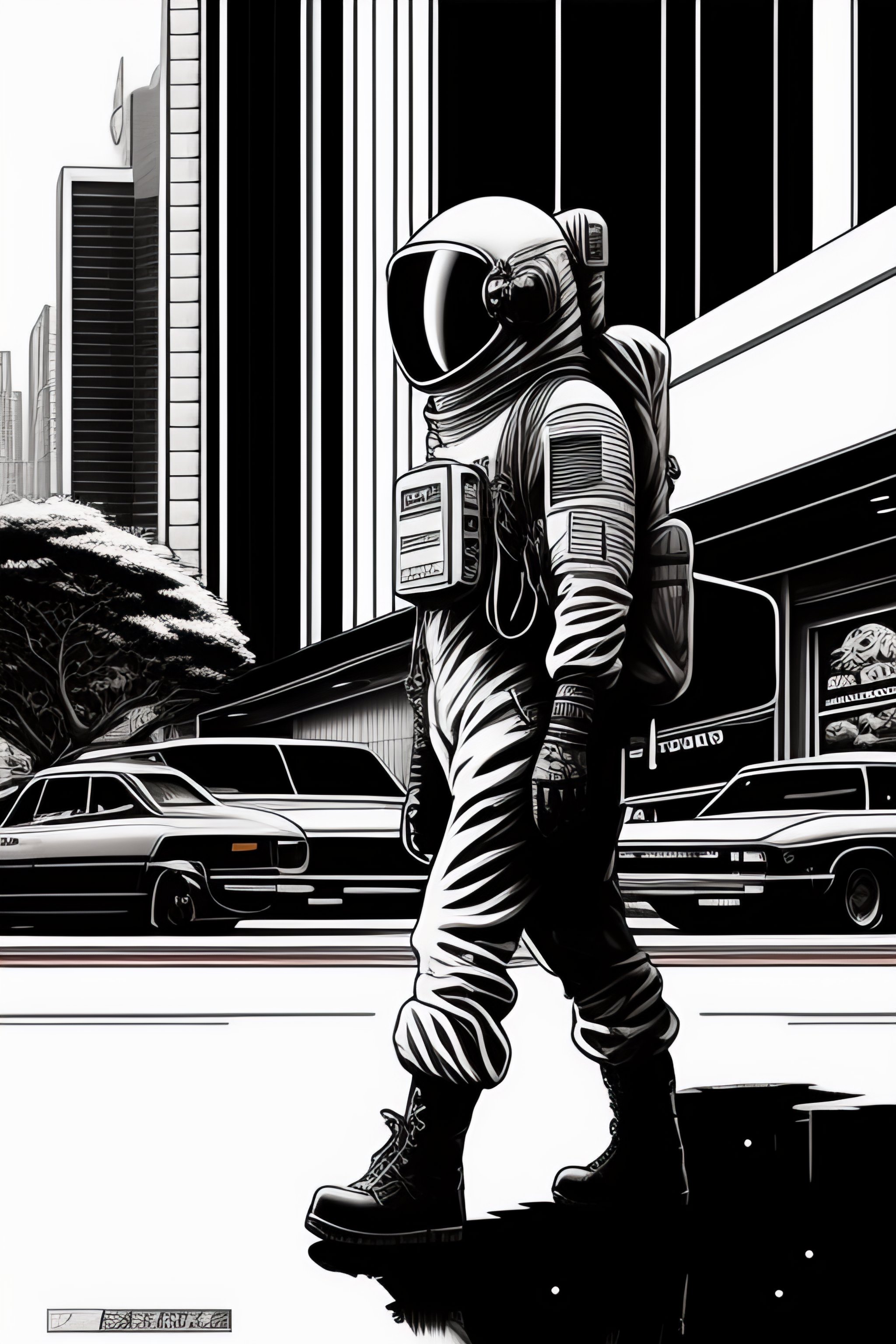 Vintage 90's anime style. a lonely astronaut walking down the street; by hajime sorayama, greg tocchini, virgil finlay, sci-fi. line art. environmental arcade art.