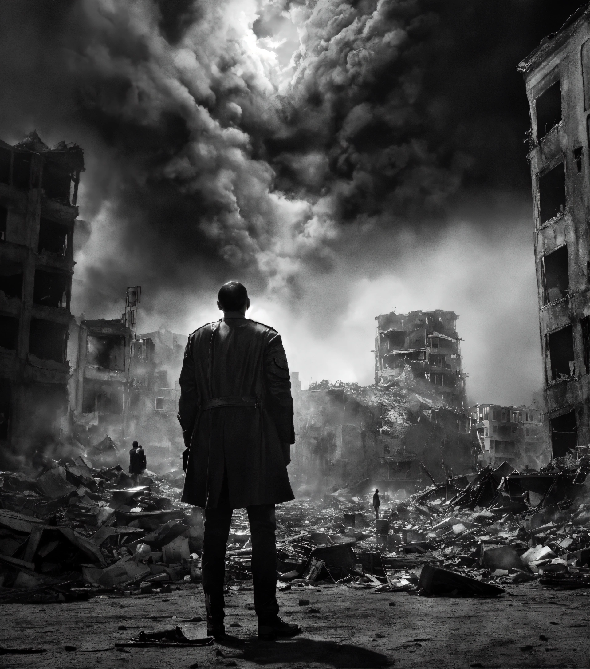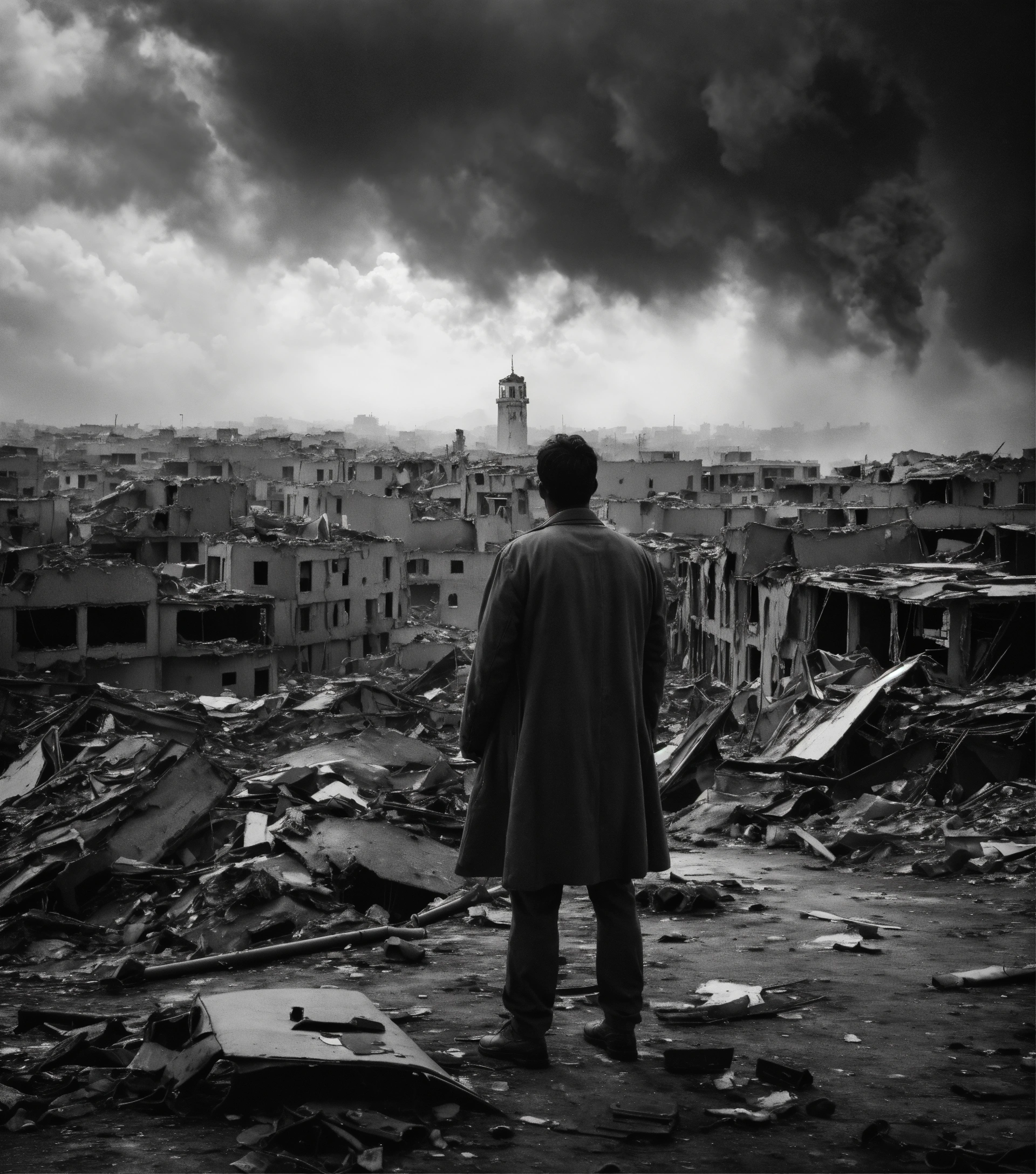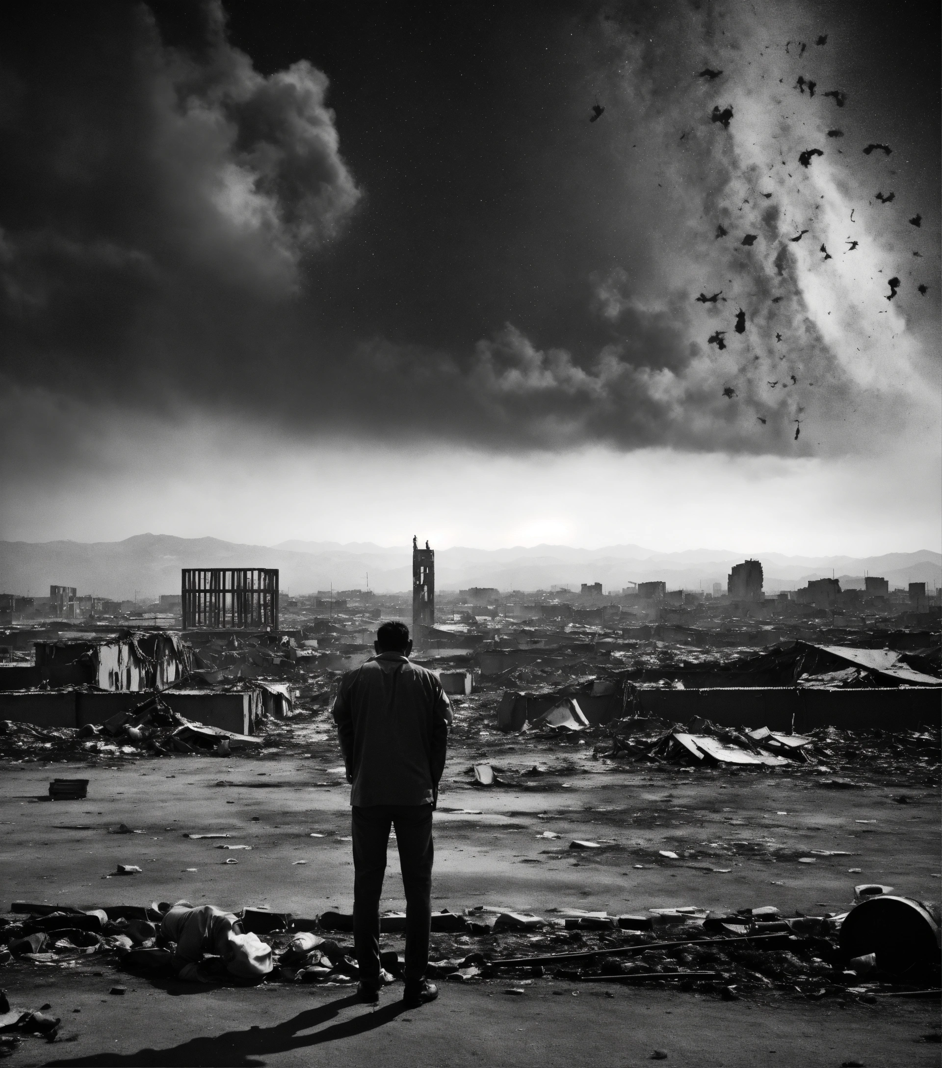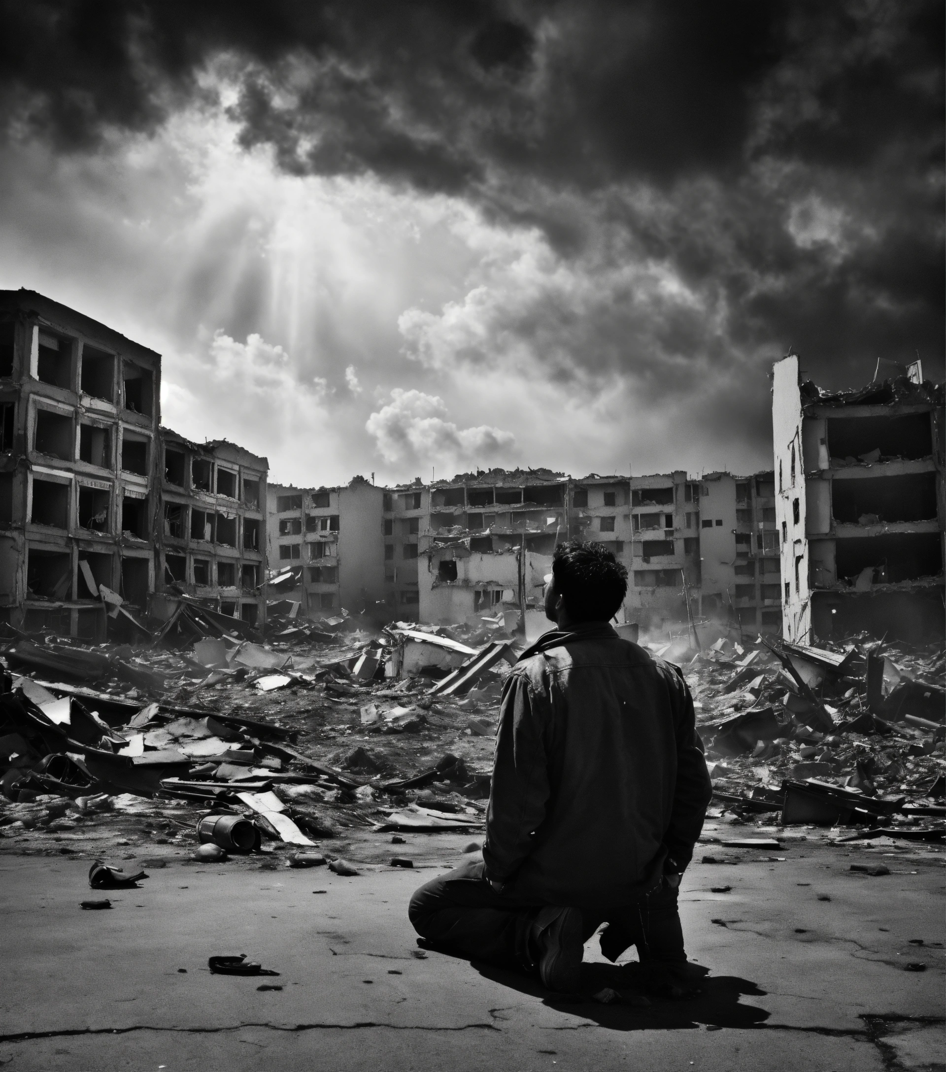 A man standing in a war torn city staring up to the heavens praying with a rear rolling down his face black and white