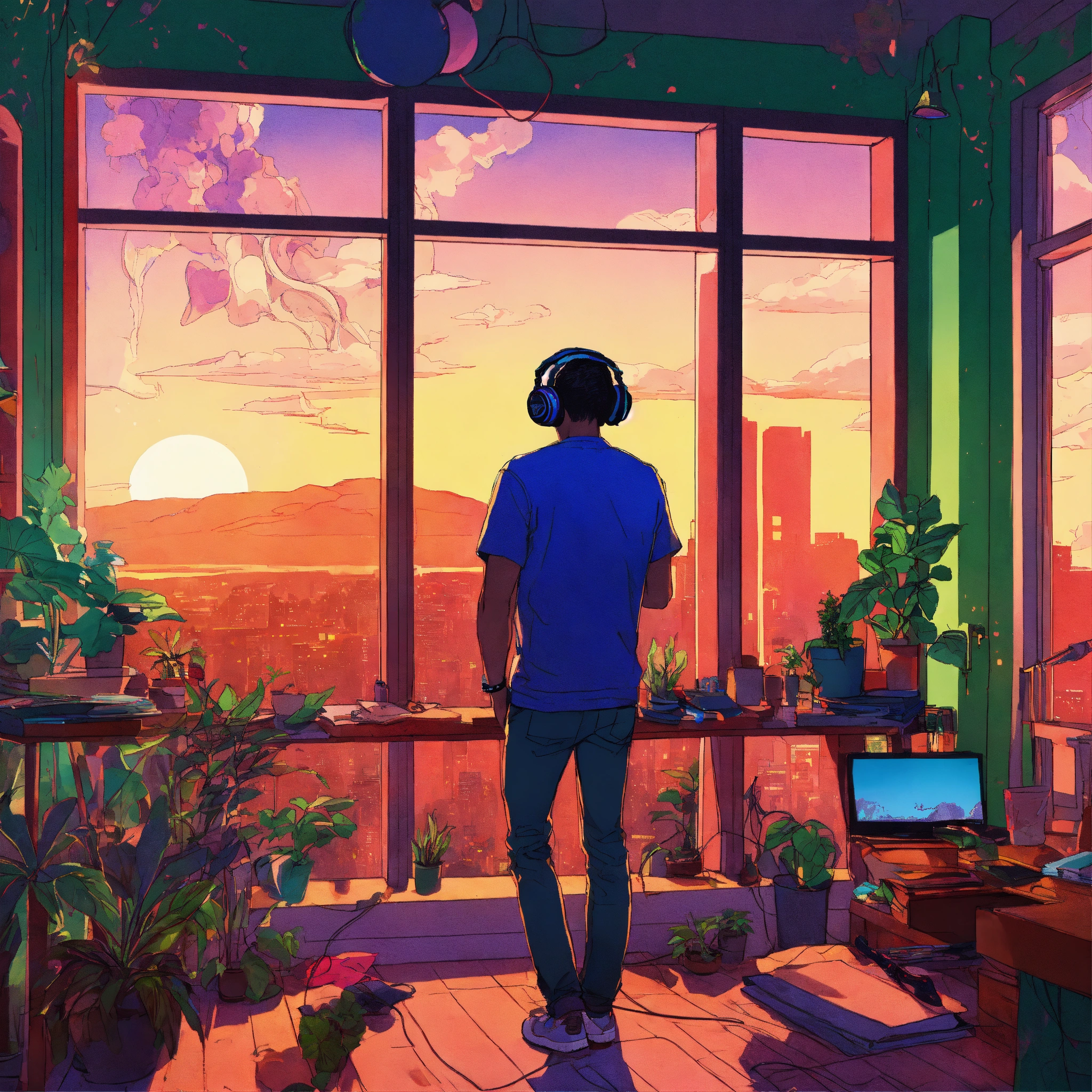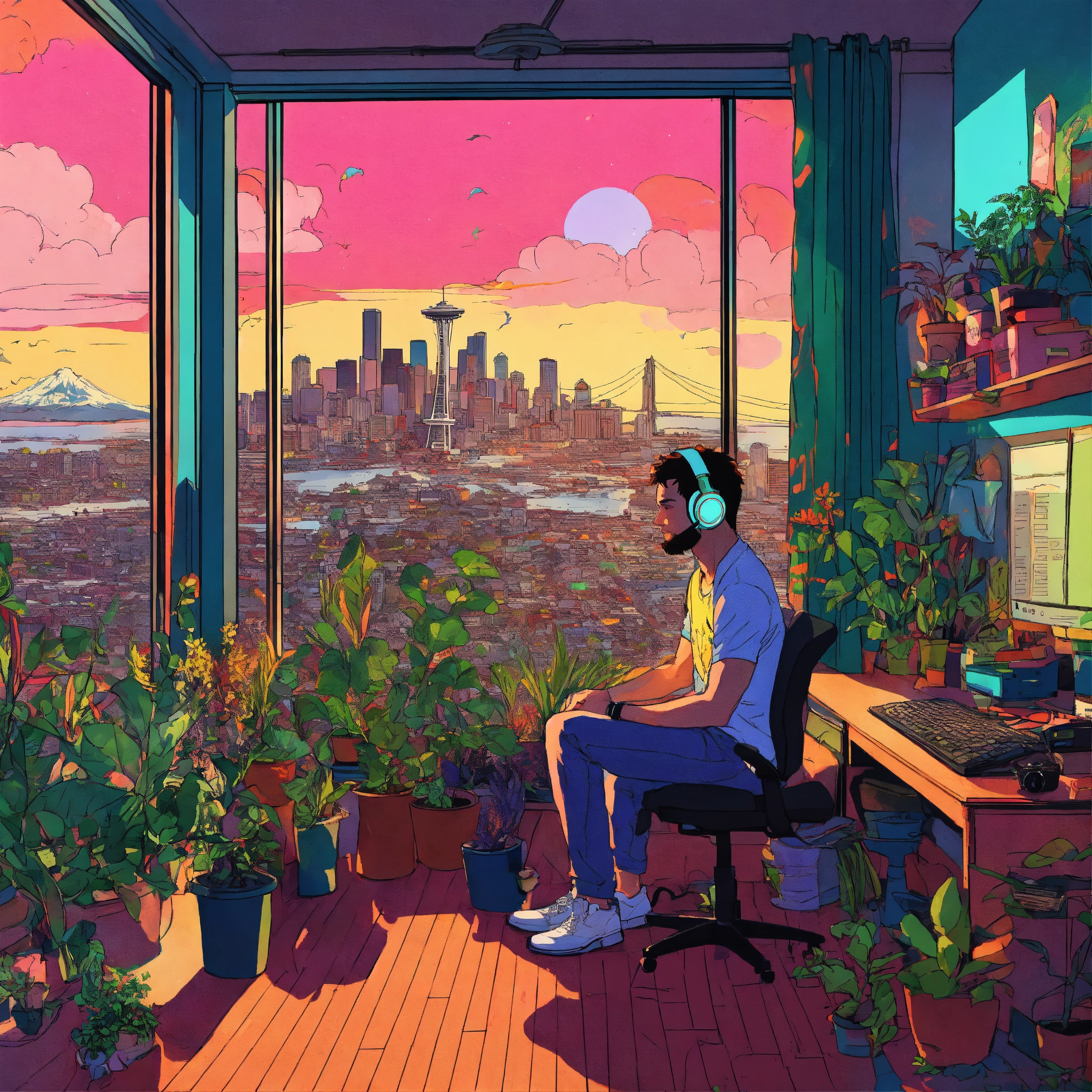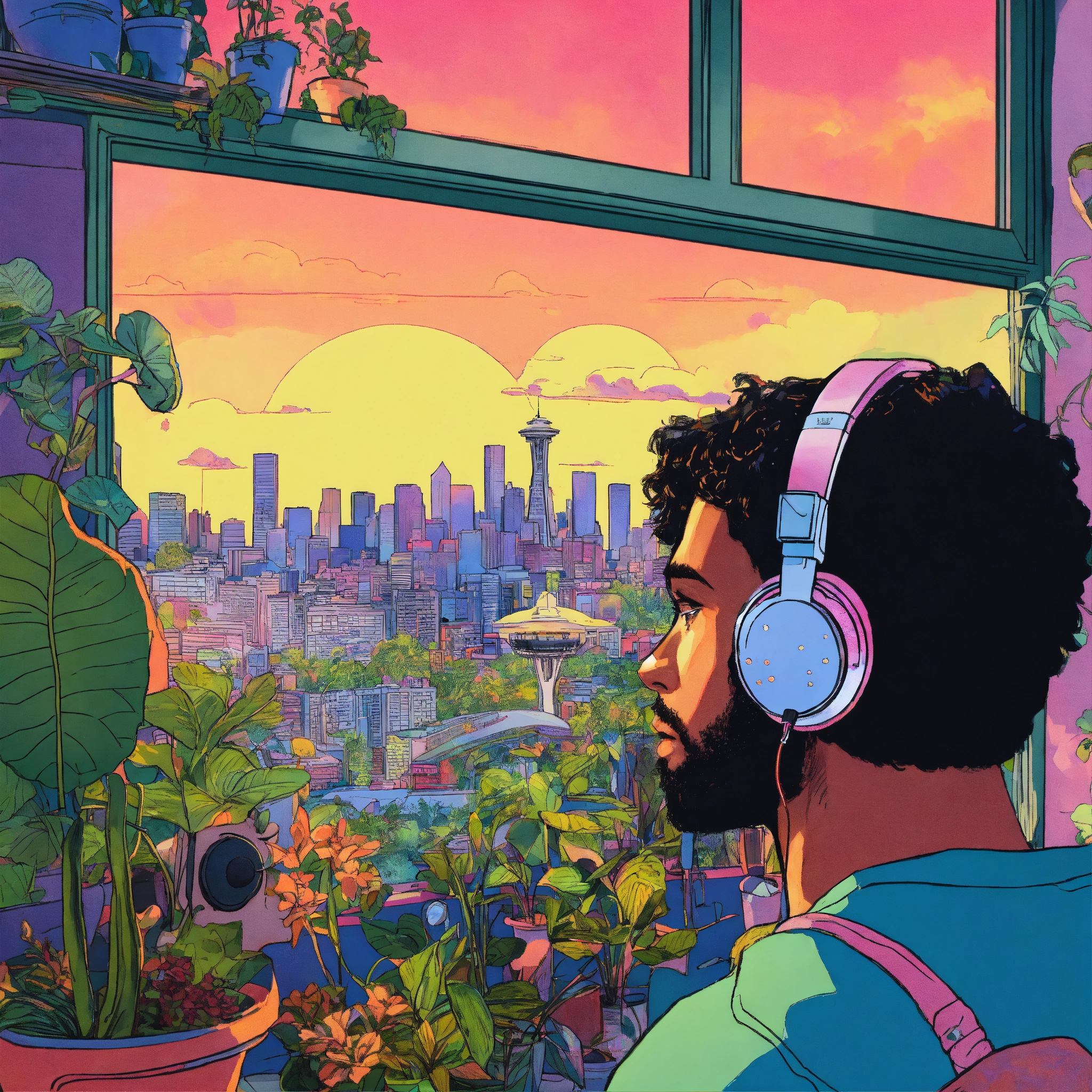 A man wearing headphones looking out over seattle, messy room with plants, psychedelic henry schein illustration