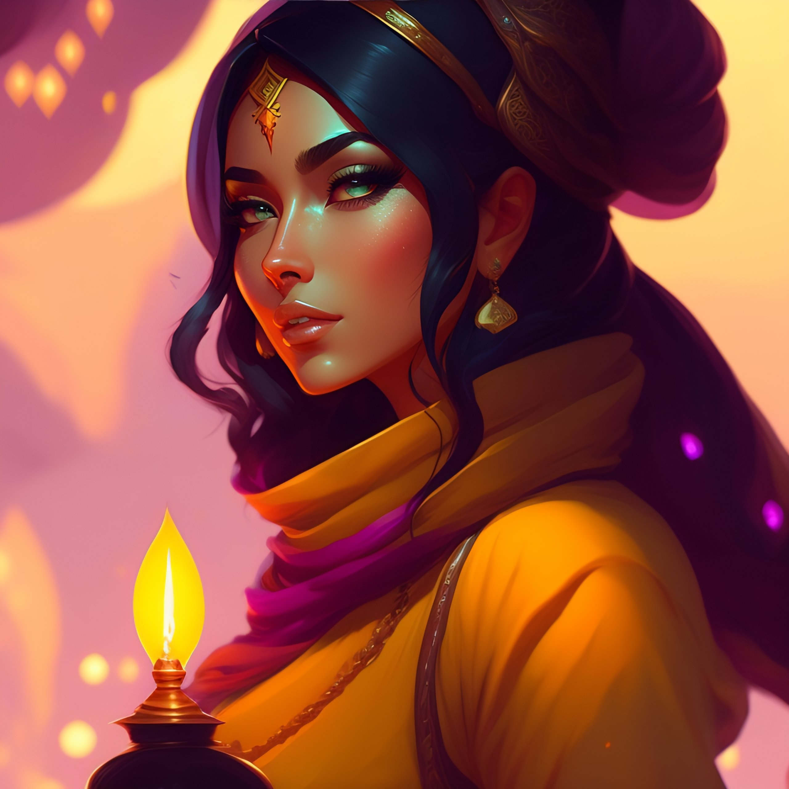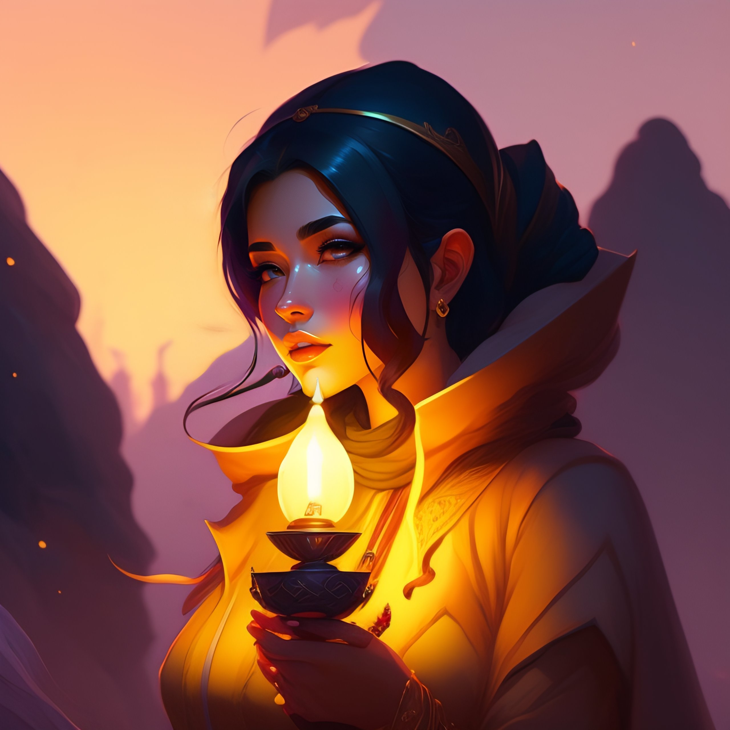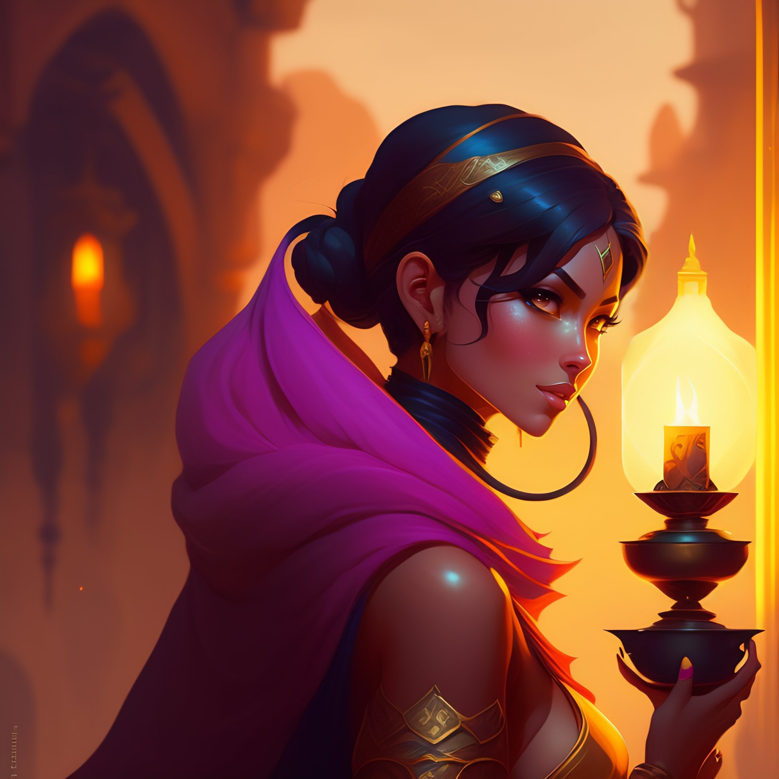 Aladin oil lamp, dnd, heroic fantasy, by atey ghailan, by greg tocchini, by james gilleard, by joe fenton, by kaethe butcher, gradient yellow, black, brown and magenta color scheme, concept art, digital painting
