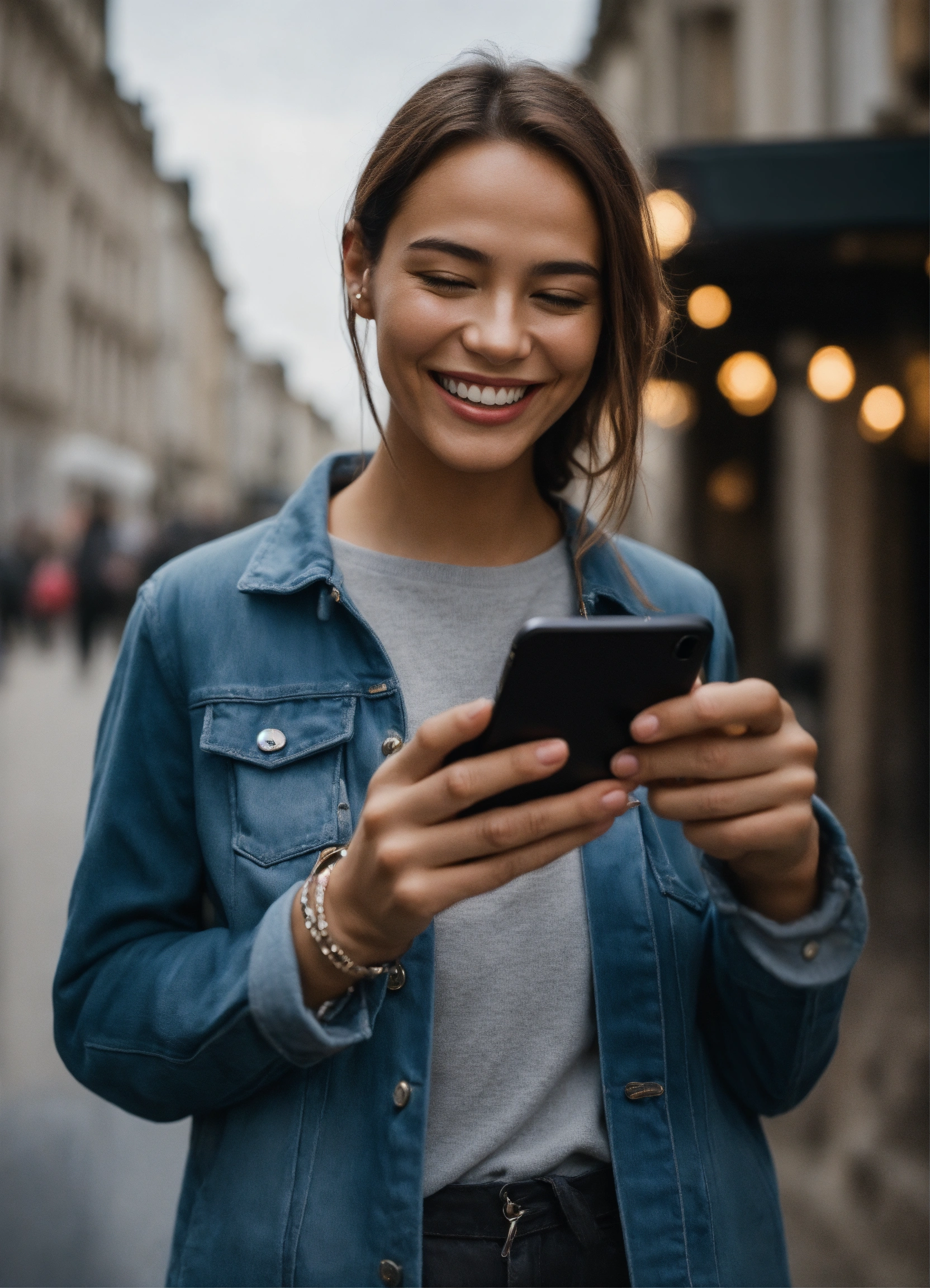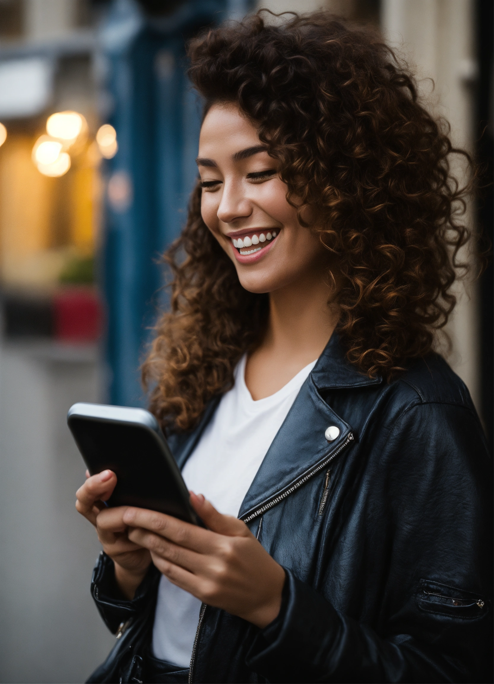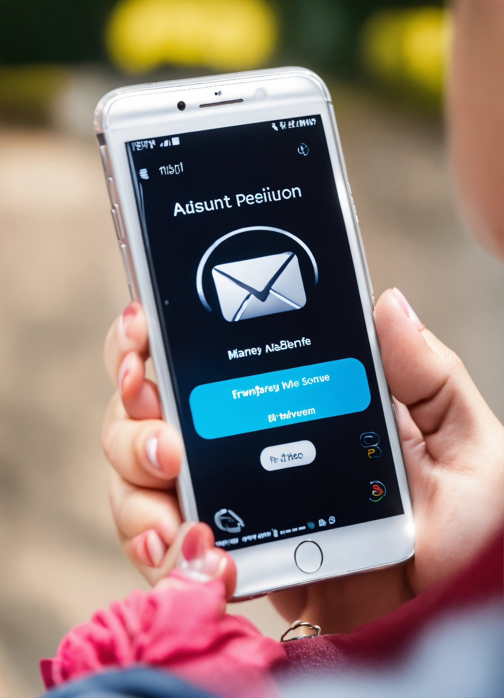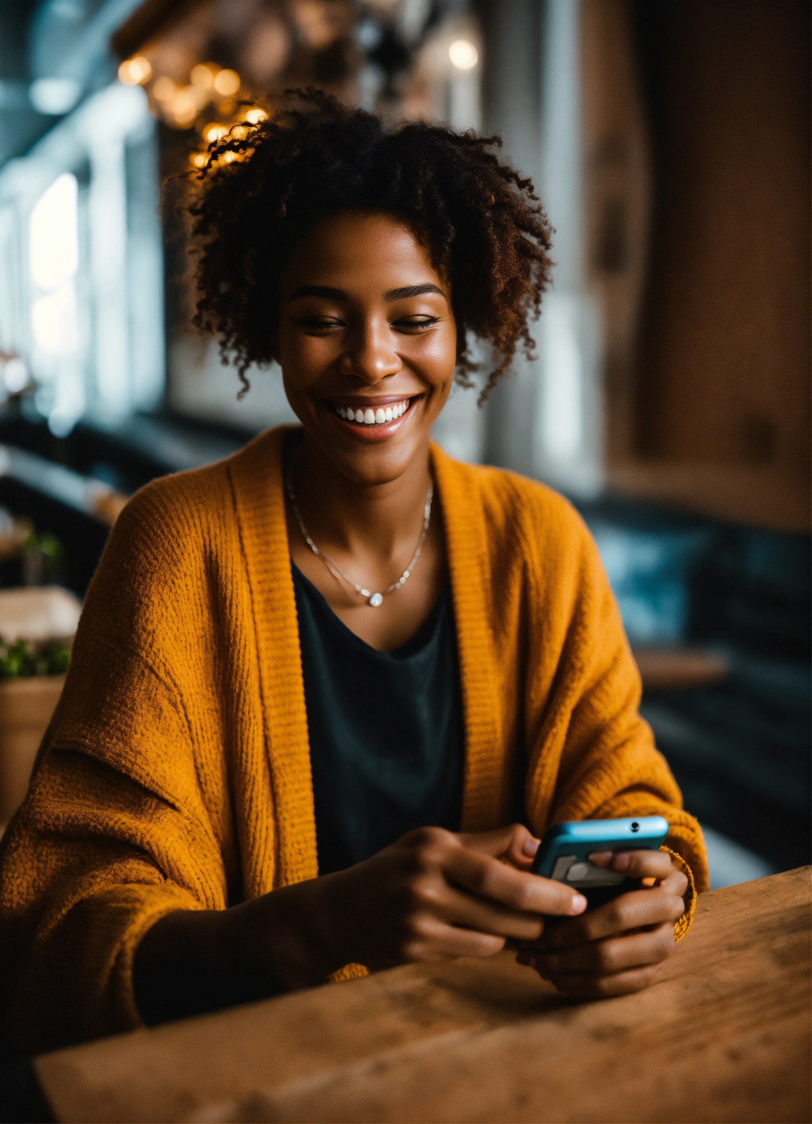 Une personne souriante tenant un smartphone et à coté beaucoup de billet d'argent