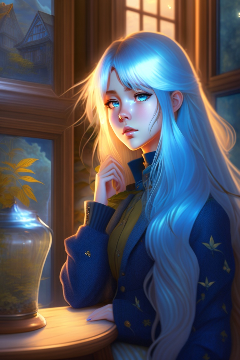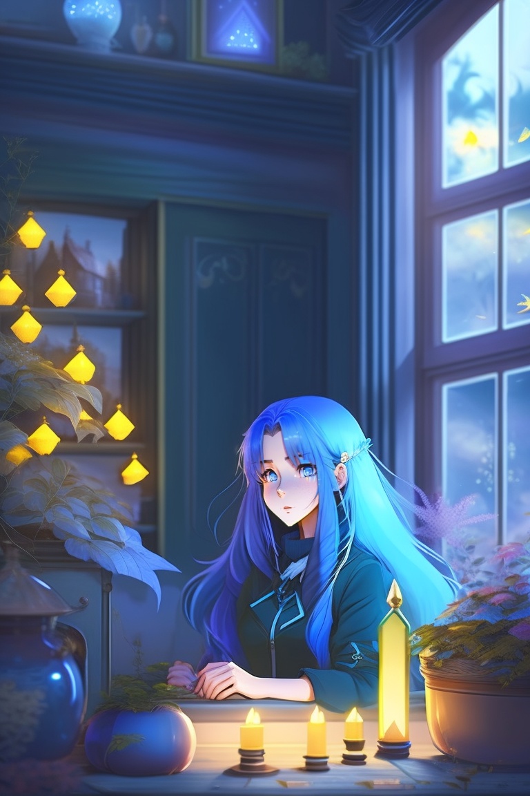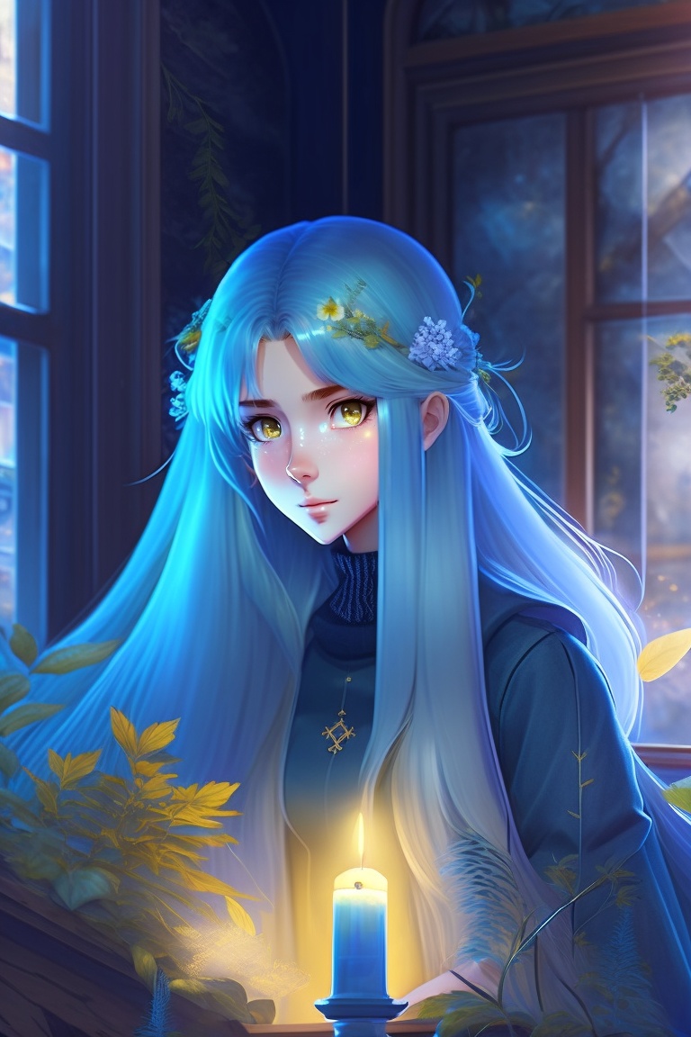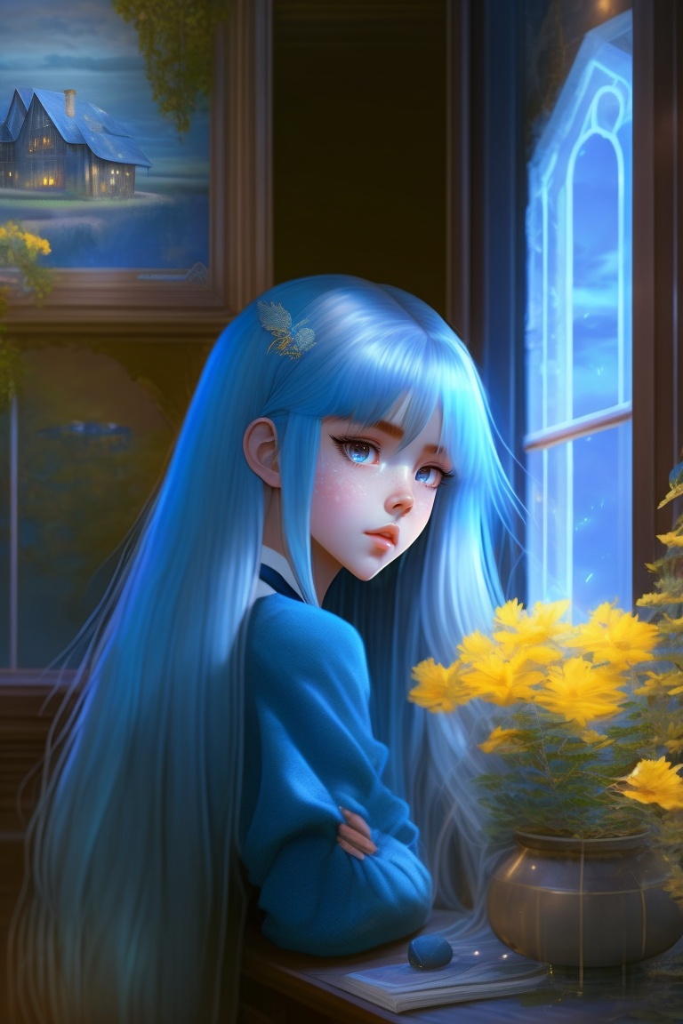 90s anime. sad girl with long silver hair, yellow eyes and blue skin. girl is in a spooky old house with cracked photos on the walls and wilted plants in vases.