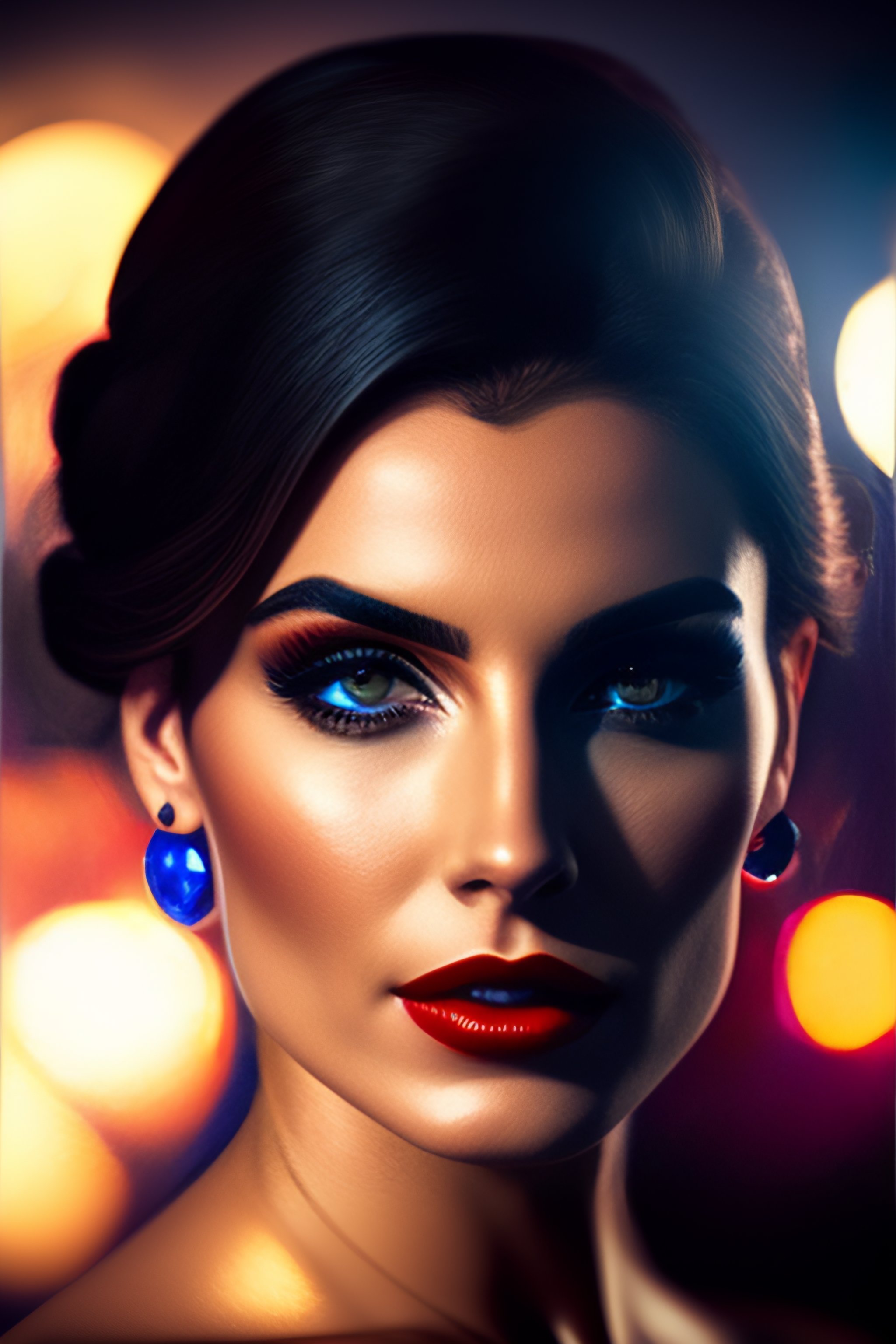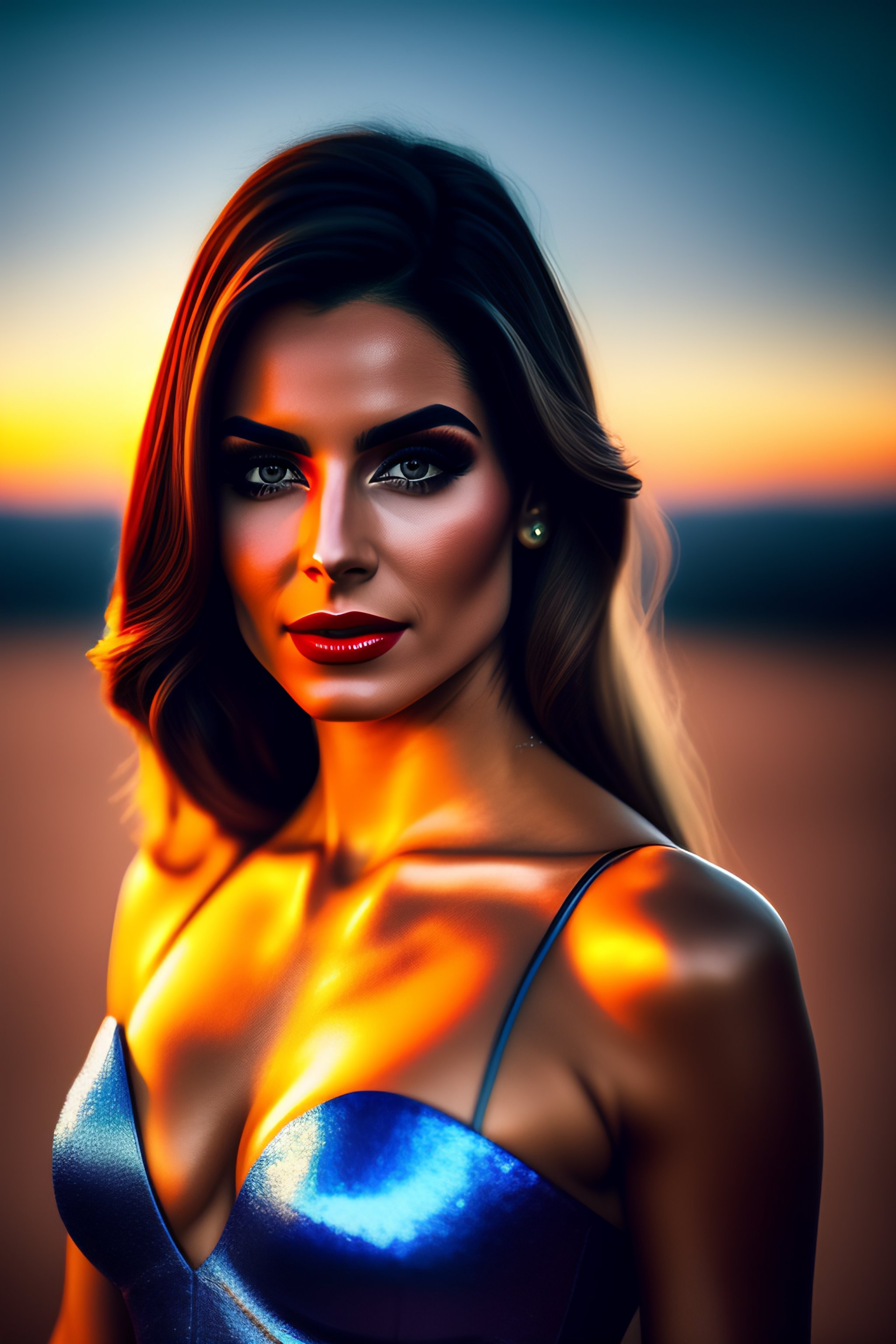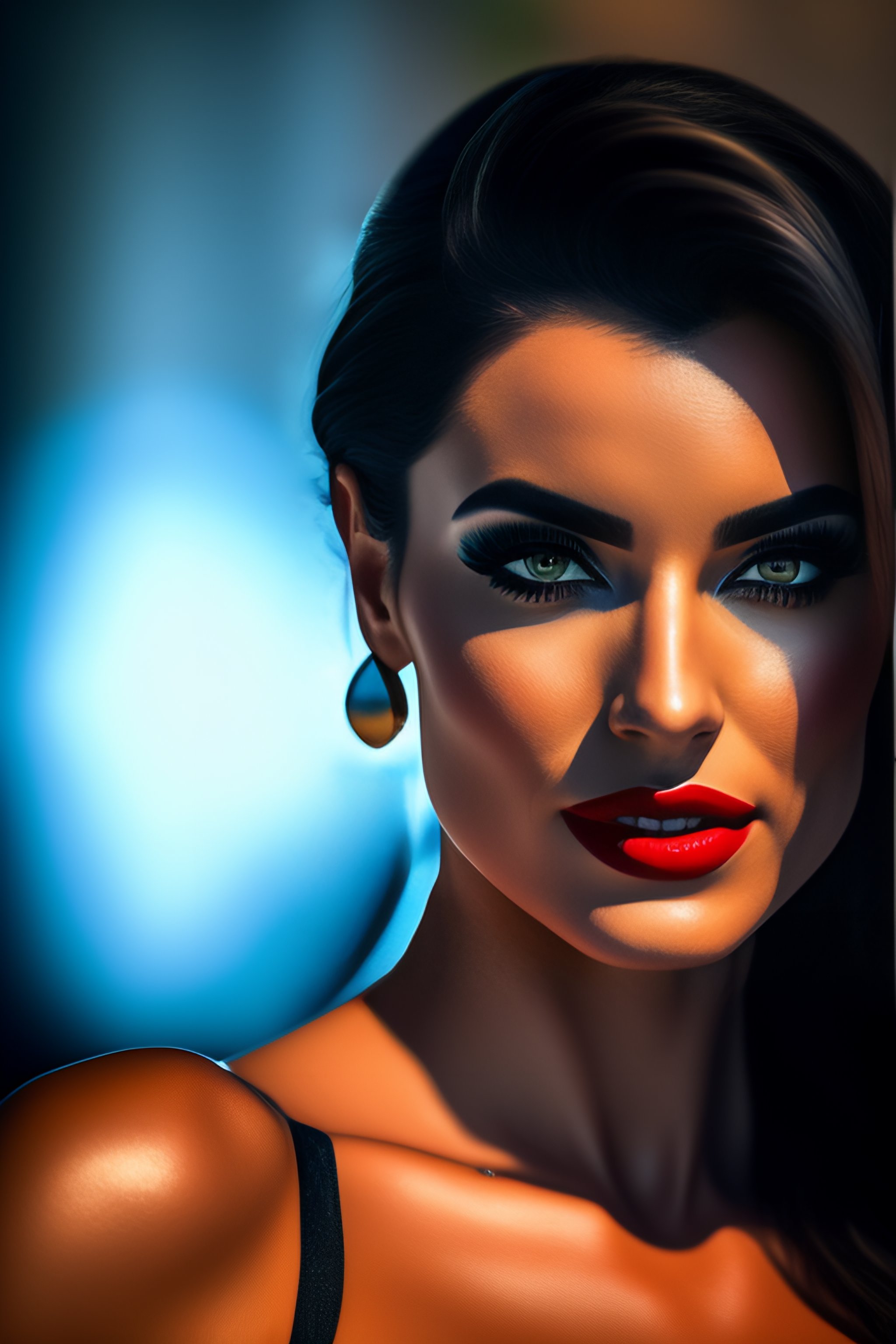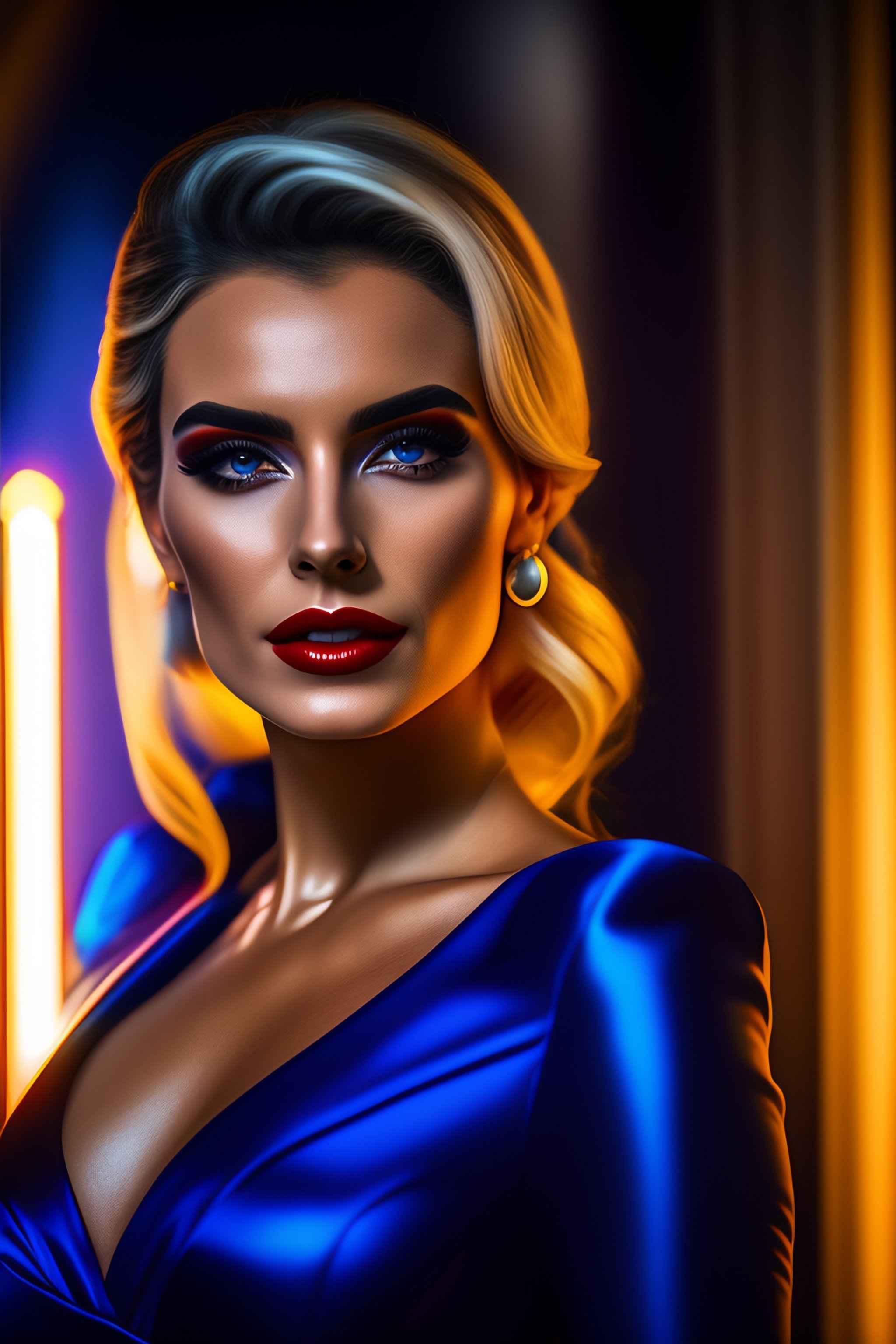 Diletta leotta, red lips, hot gorgerous makeup, wearing blue dress viewed in mega-city one, photorealistic, ultra detail, hdr, 32k, 16k, iso 800, cinematic light, photorealisc, ultra detail, cinematic, epic, 16k, hdr, high detail, unreal engine 5 --s 1000 --uplight --ar 3:2