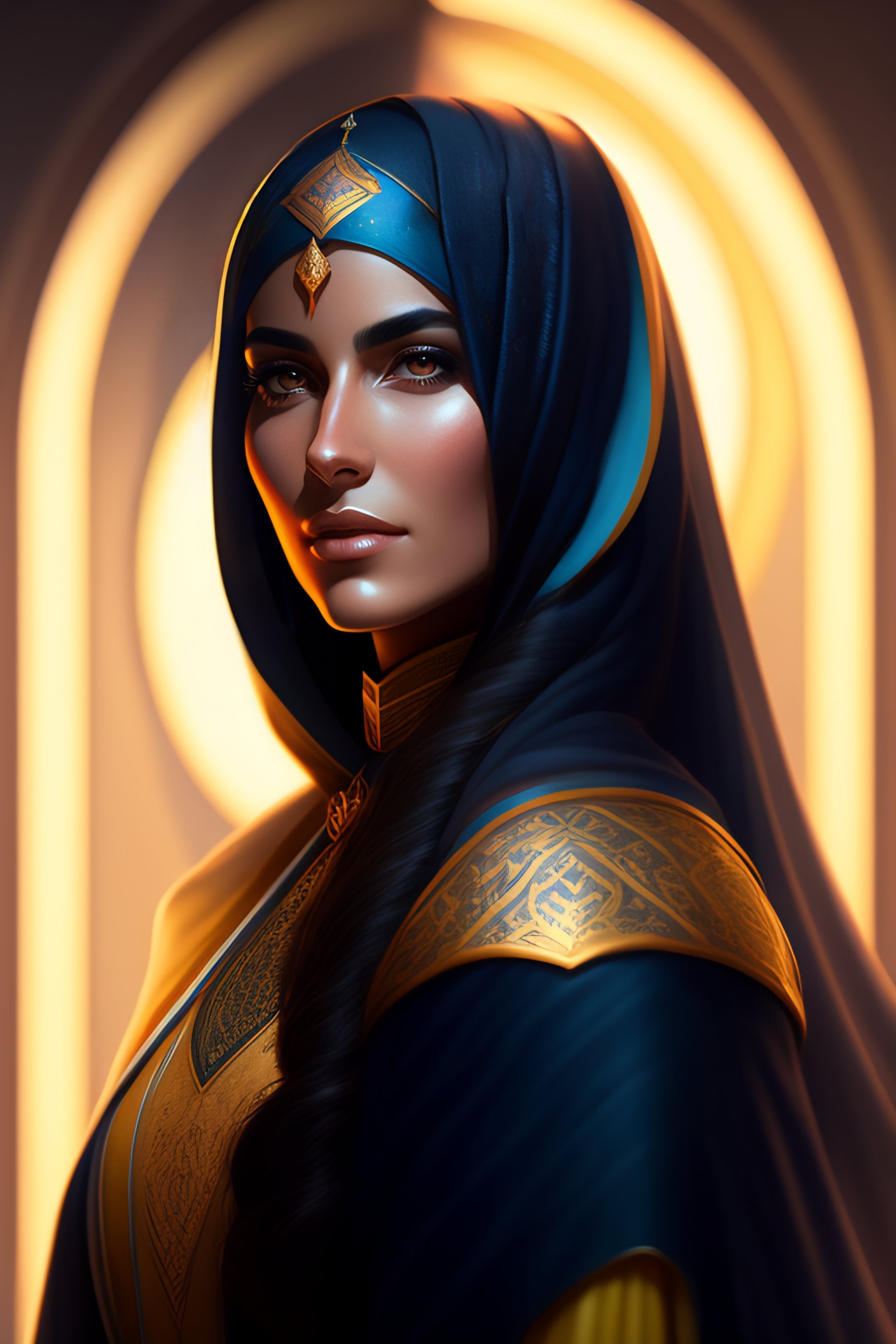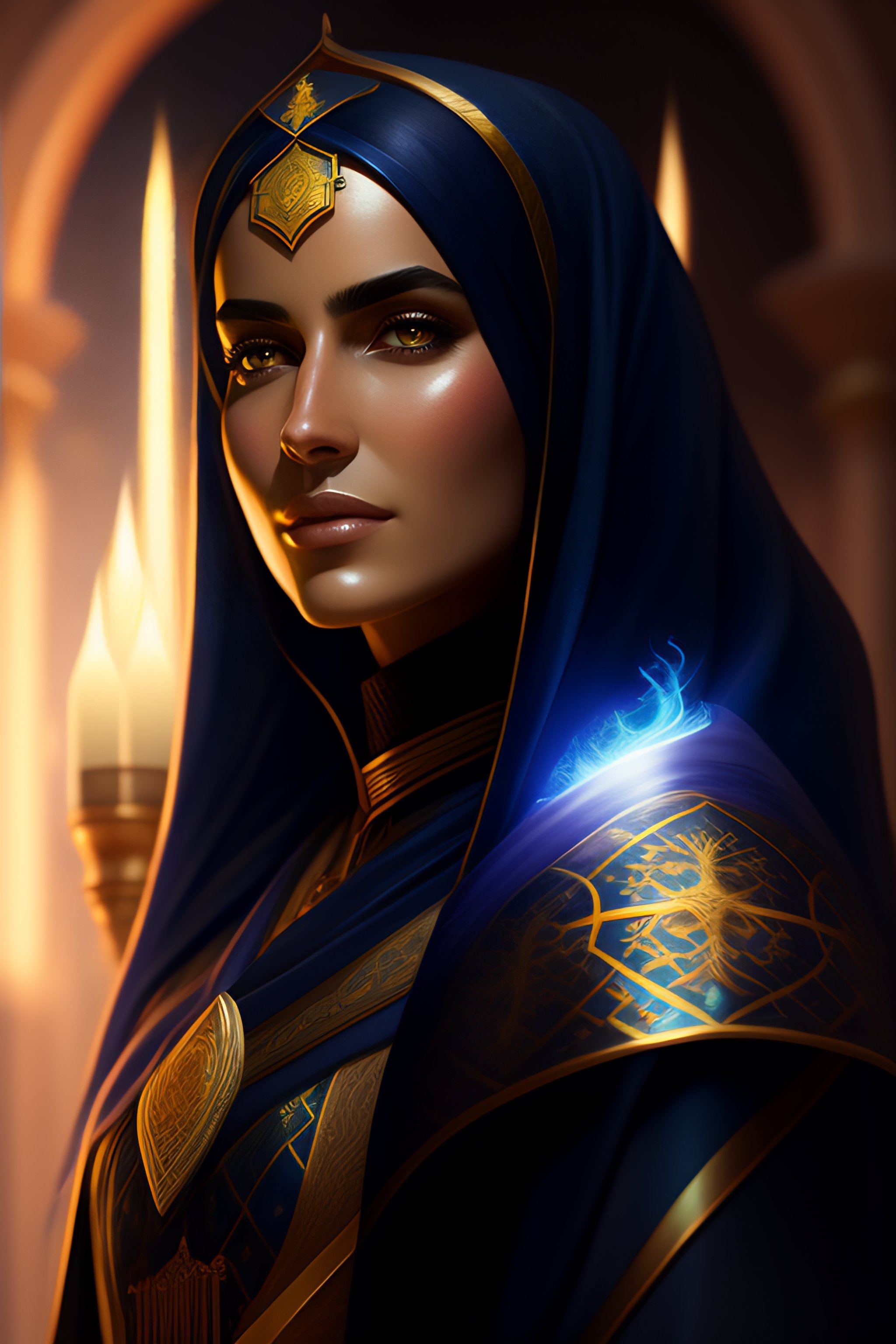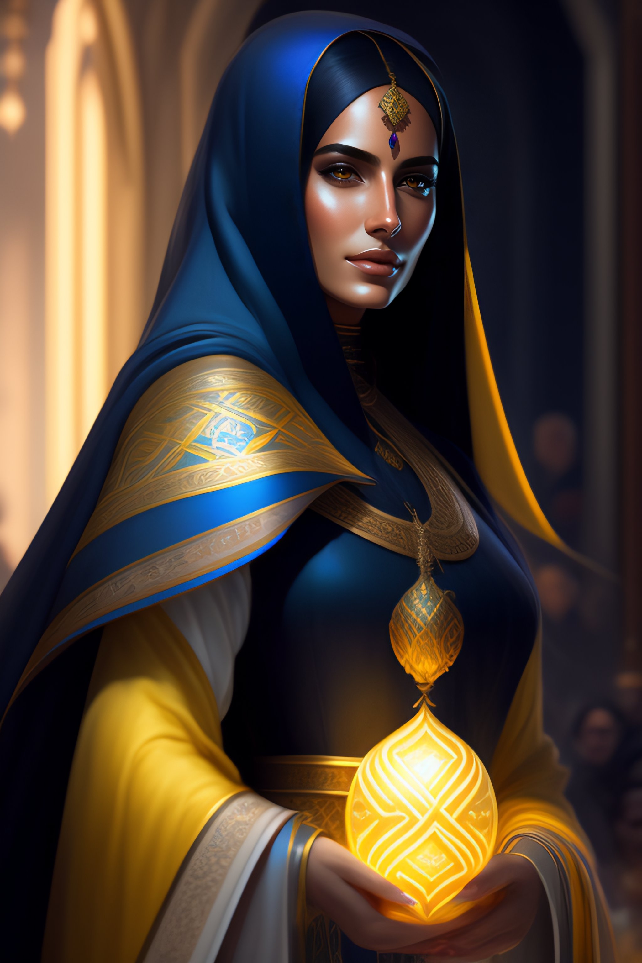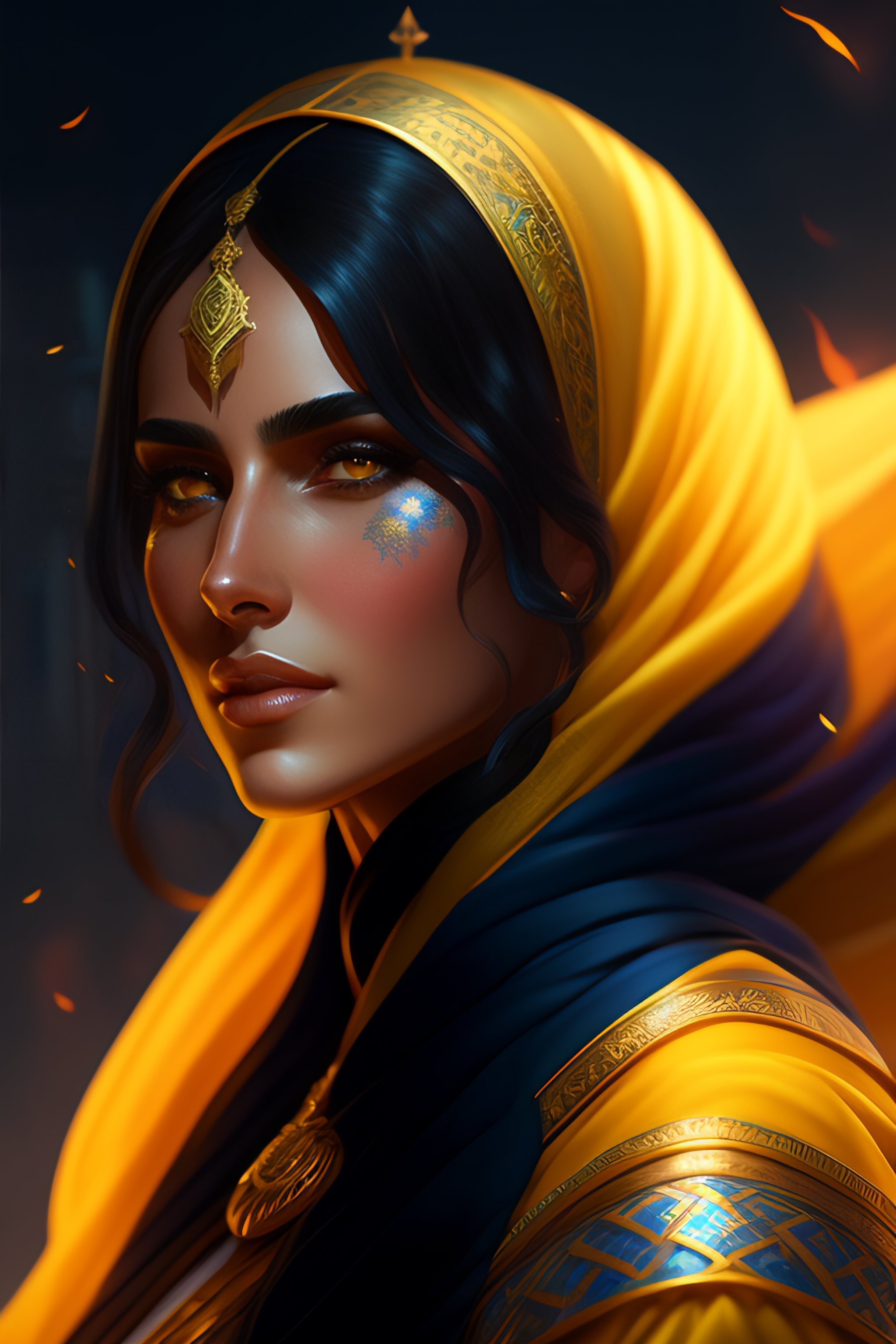 Portrait of a middle - eastern female cleric with straight black hair wearing blue and yellow vestments casting fireball, fantasy, highly detailed, digital painting, artstation, concept art, character art, art by greg rutkowski and tyler jacobson and alphonse mucha