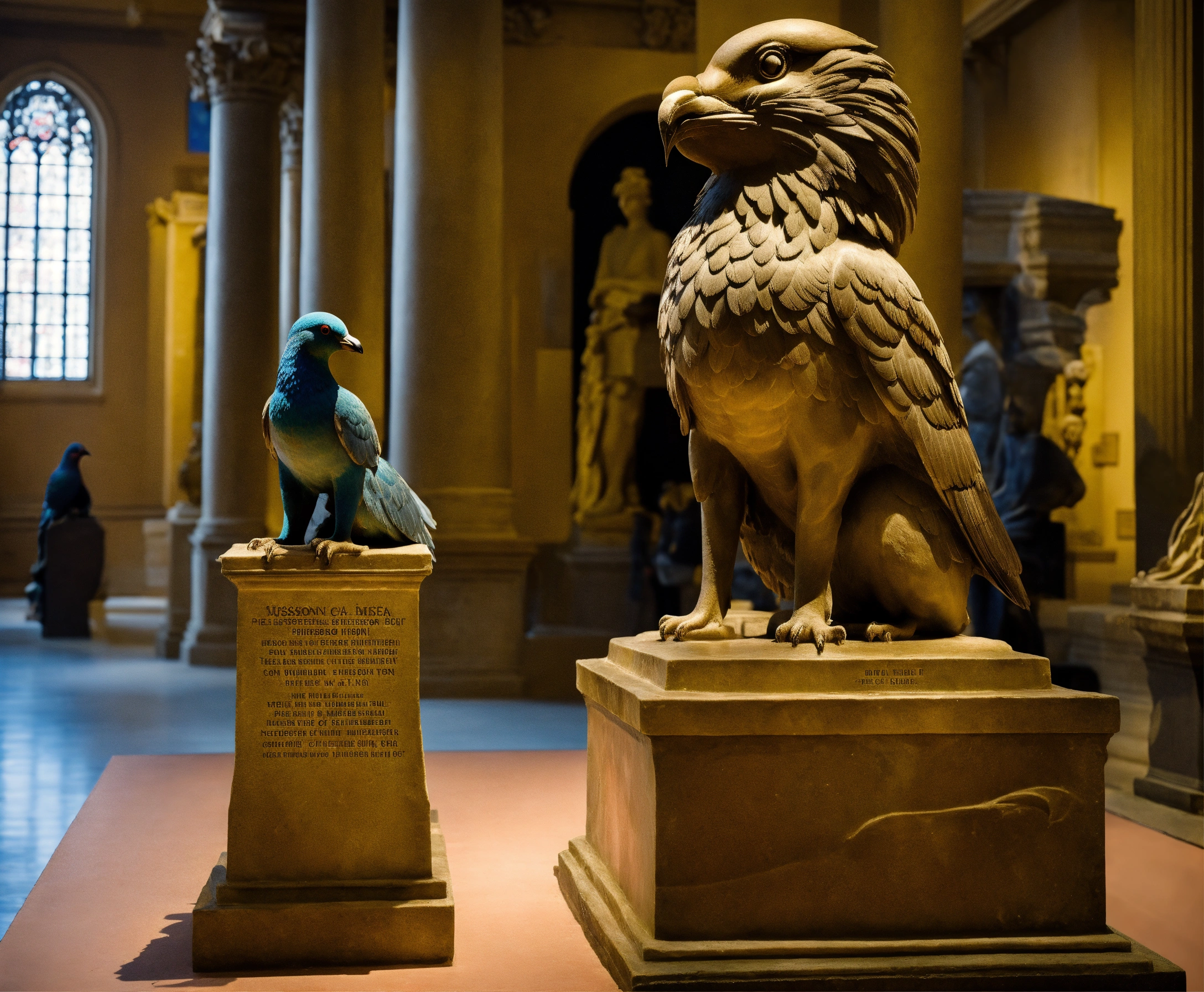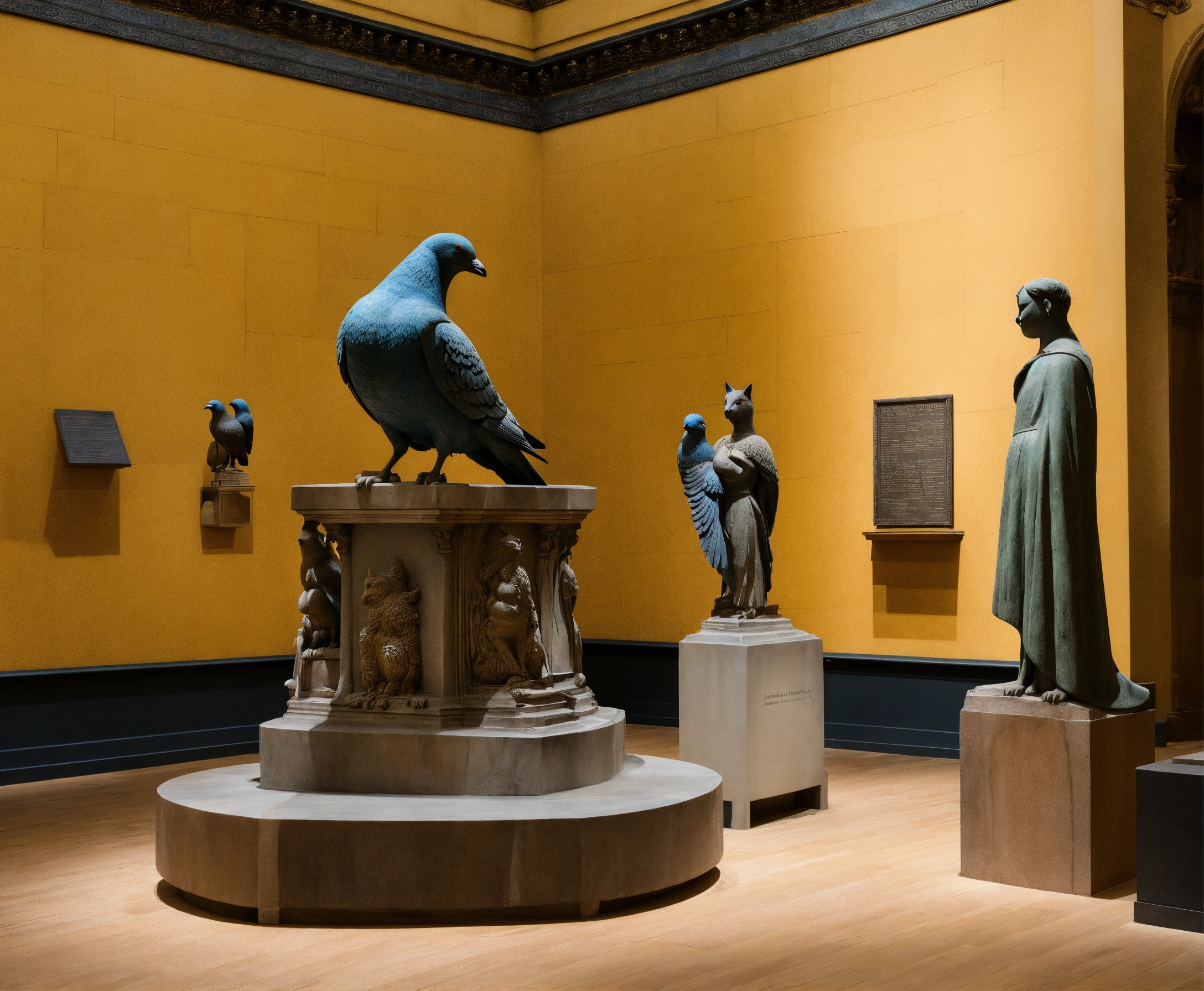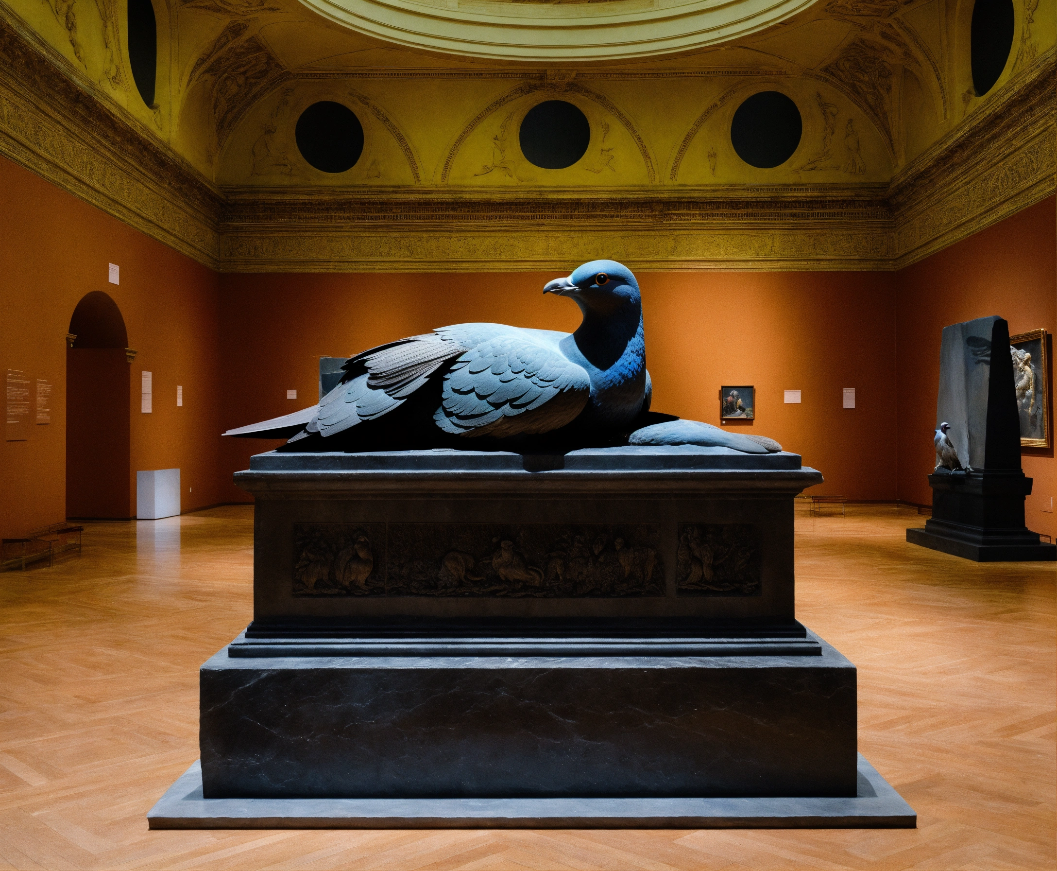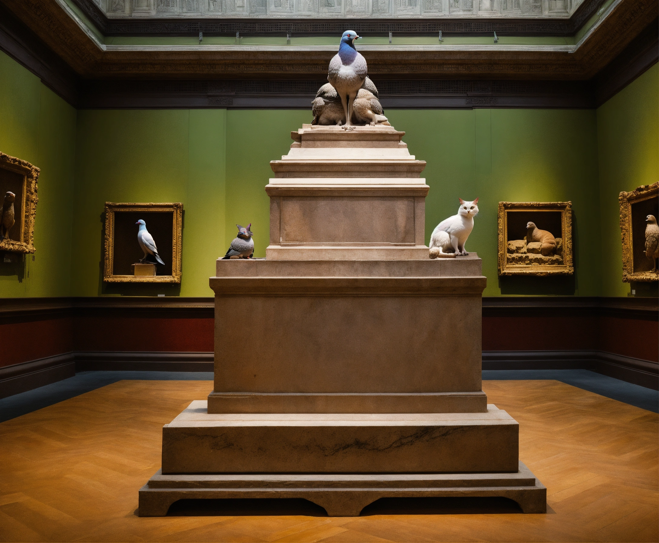A sculpture of pigeon and a sculpture of cat perched atop a colossal tombstone in museum or gallery
