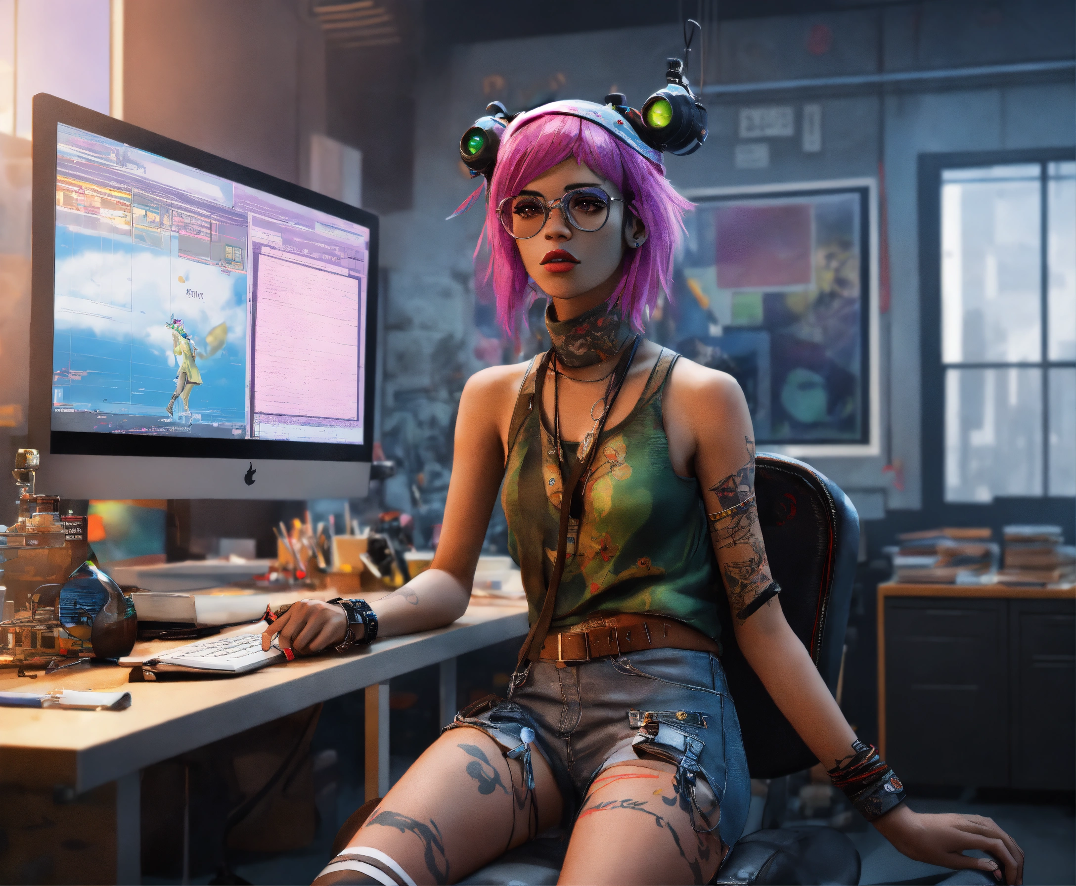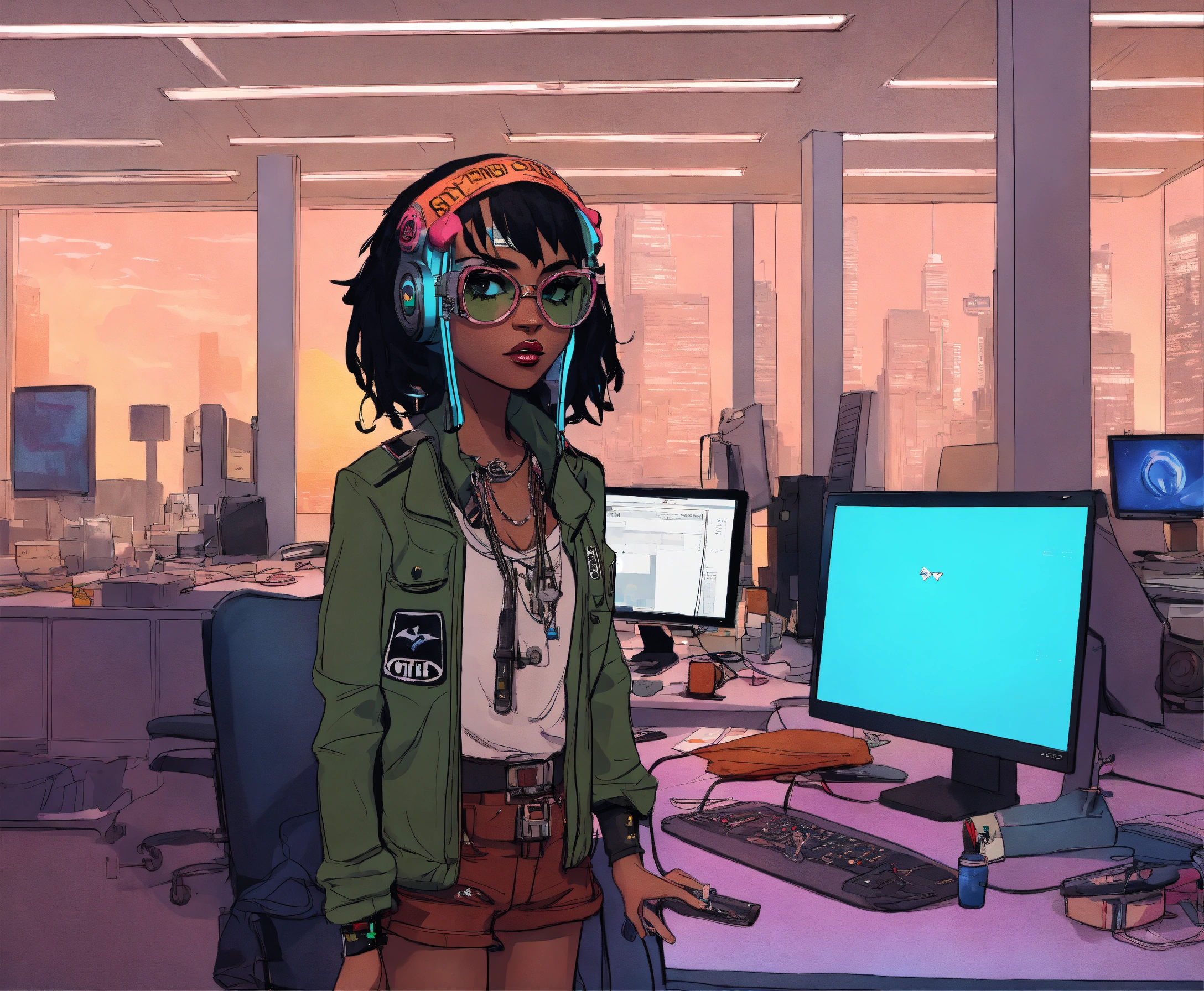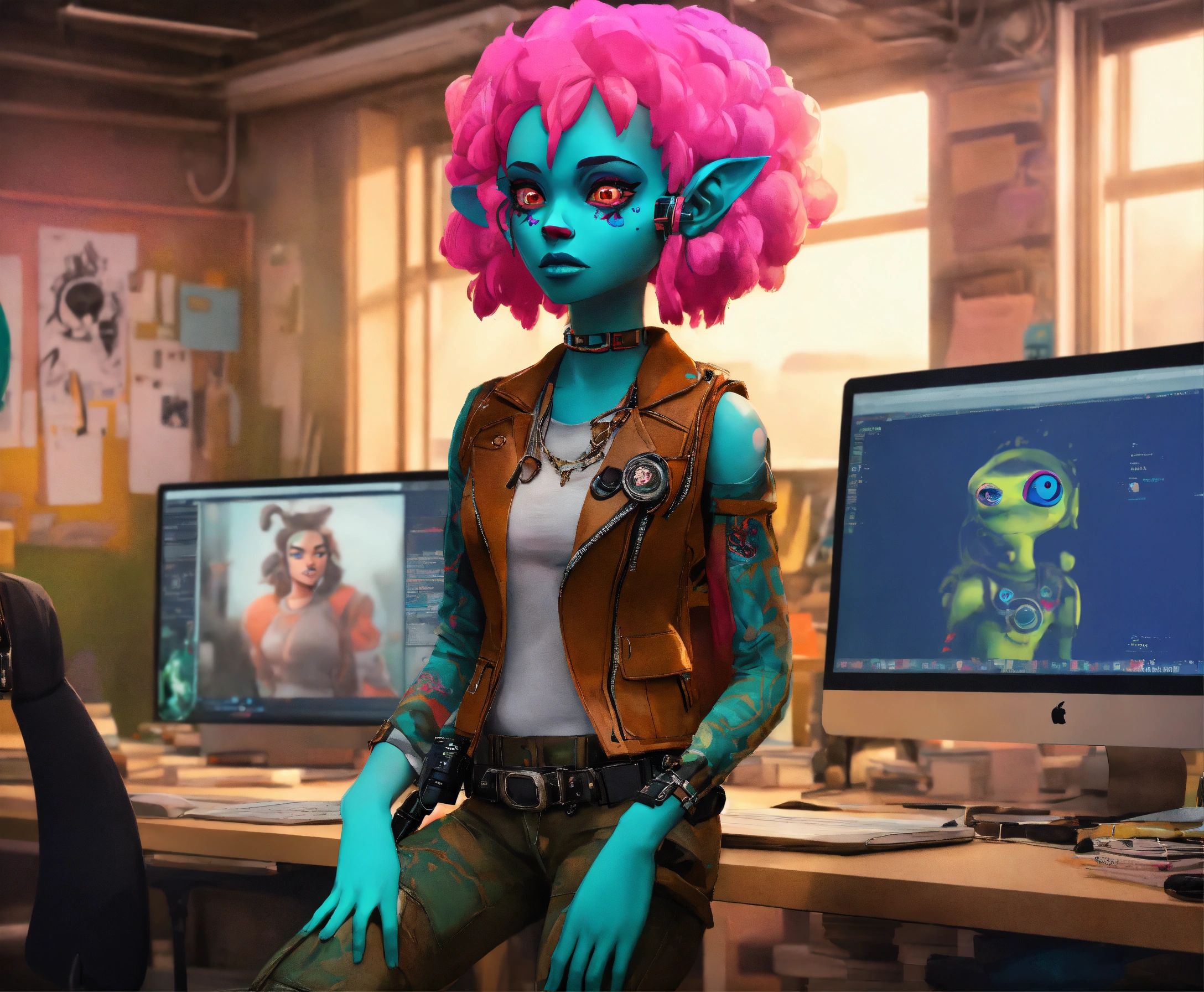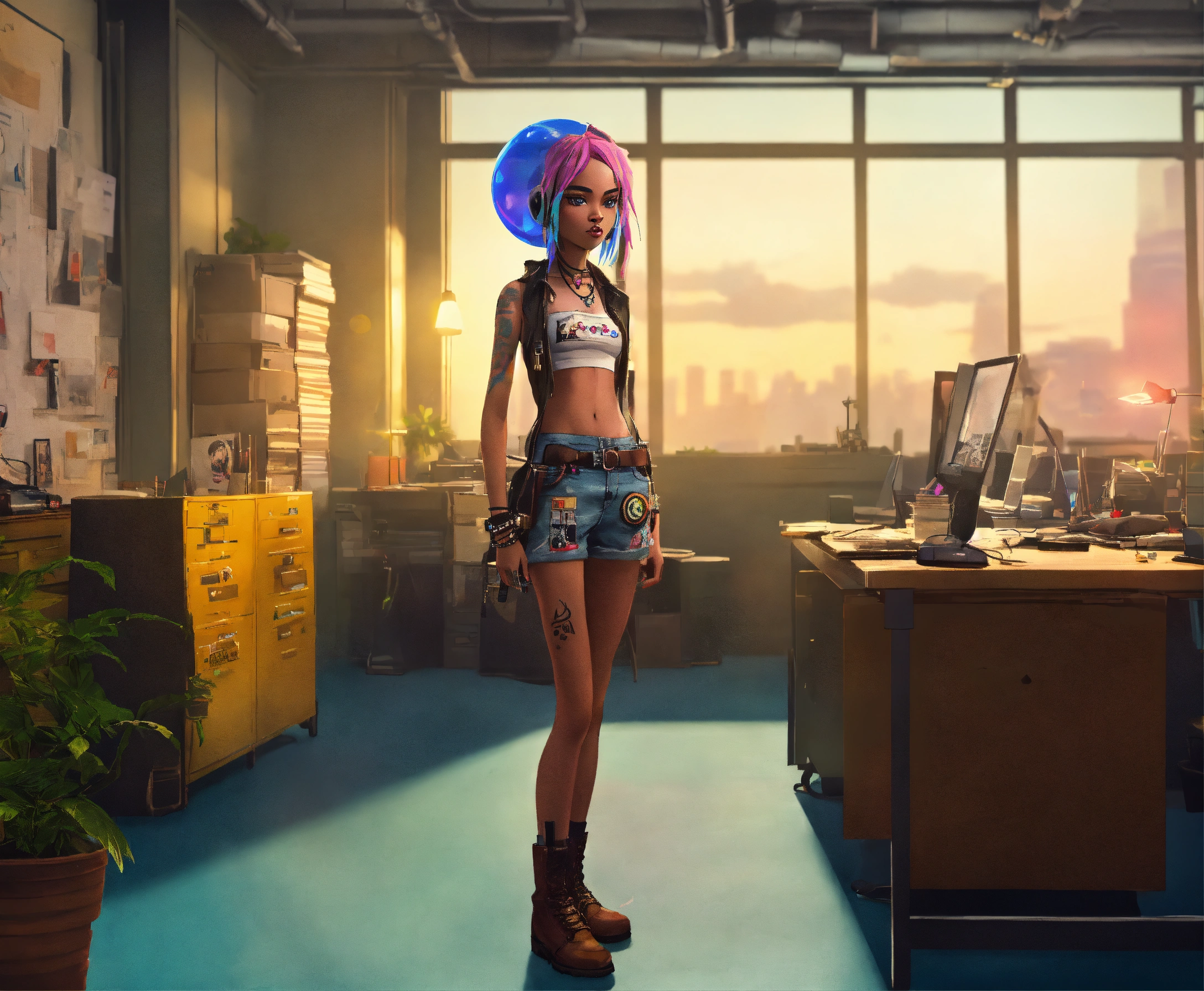 Orion, a strange girl, half alien, standing up in a boring office with, adhd, trippy, corporate, hippy, hipster, millennial girl, eccentric style, artist, co-workers, nyc, punk visual art, gorillaz, tank girl, unreal engine, orion is the only alien in the corporate office