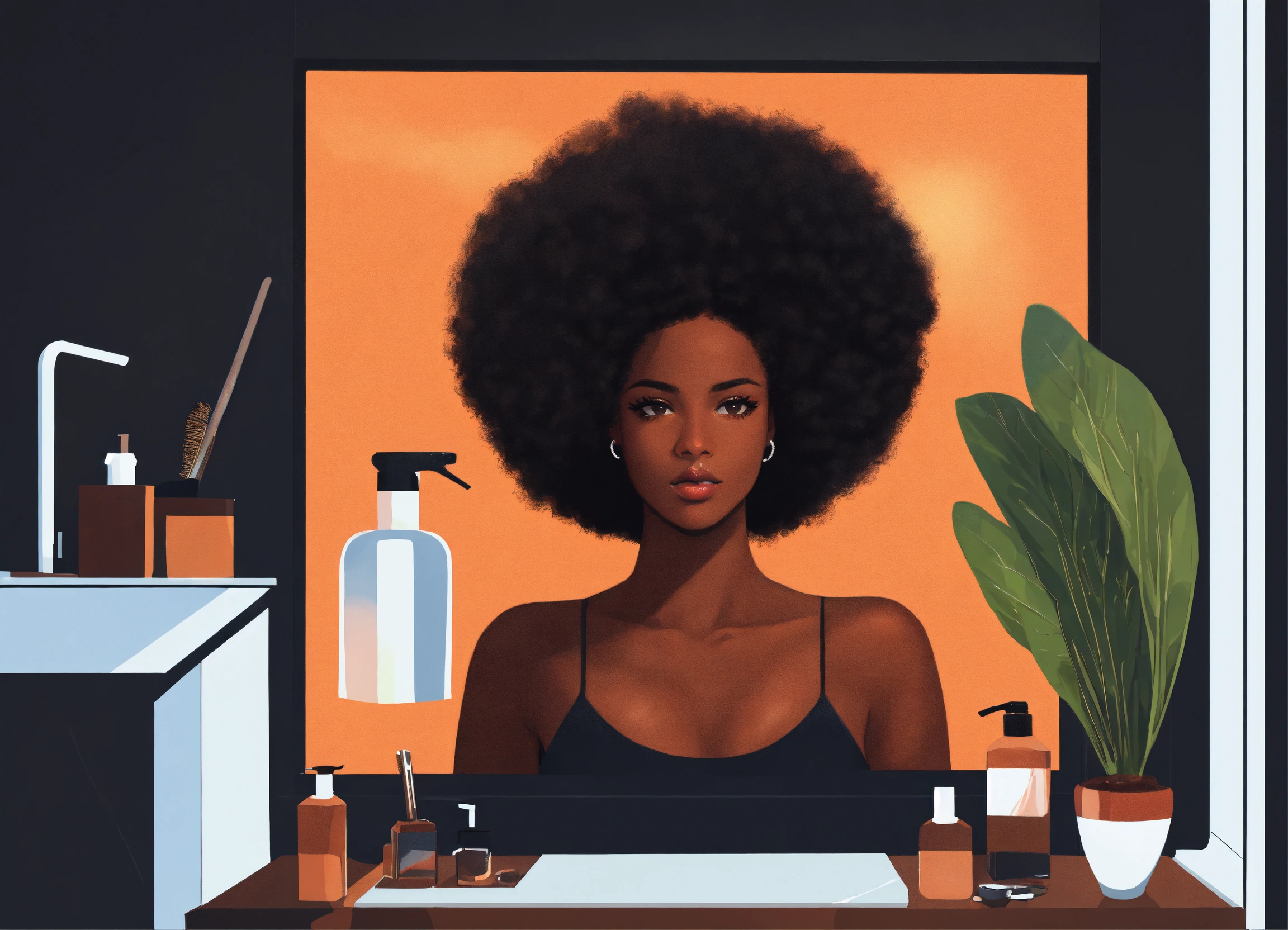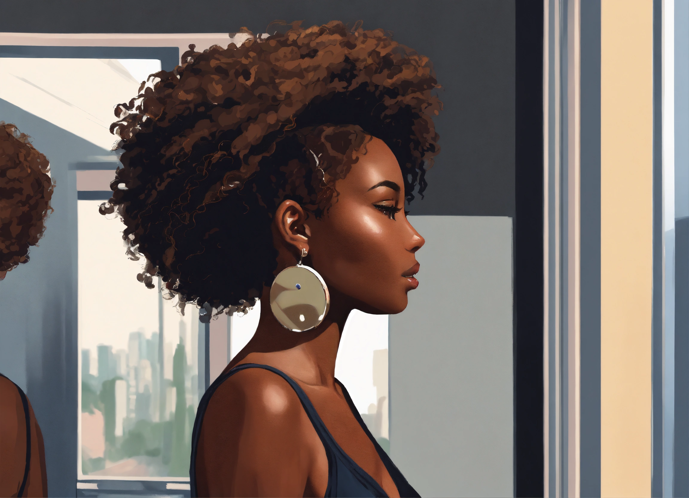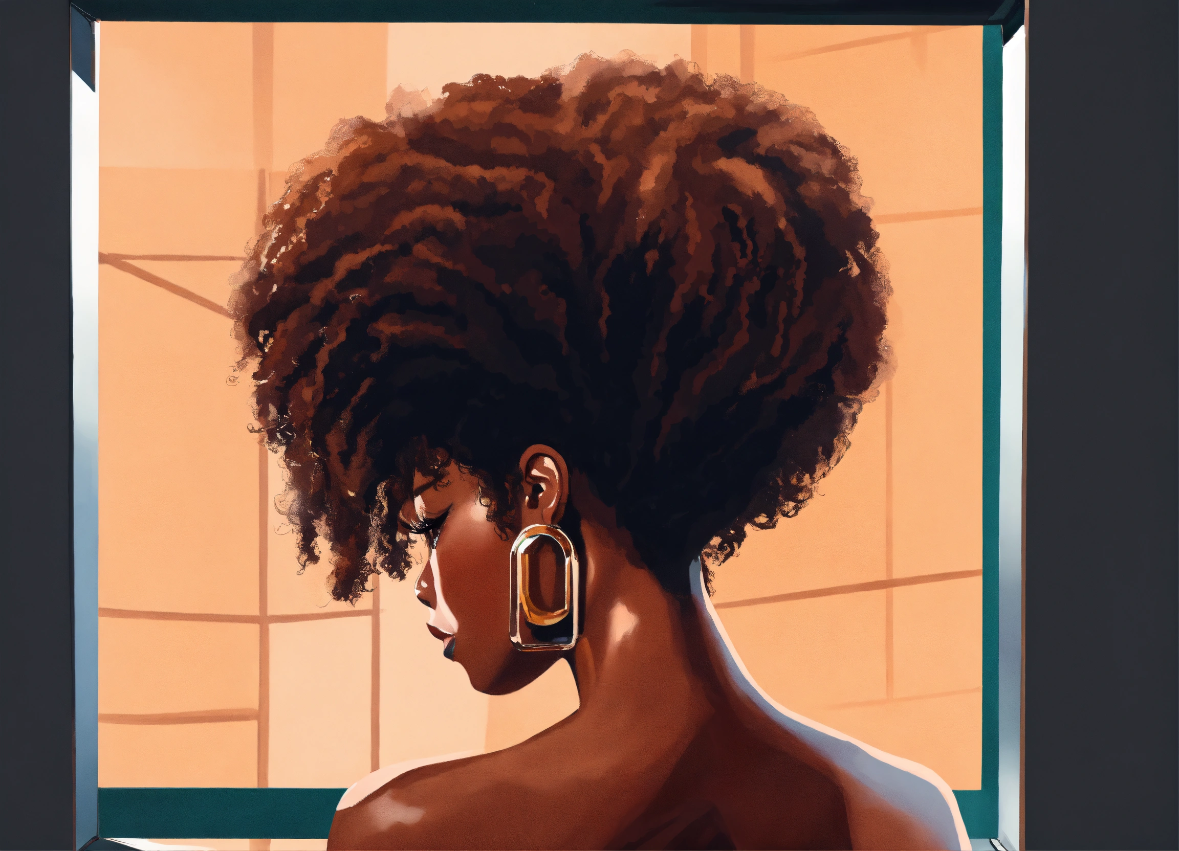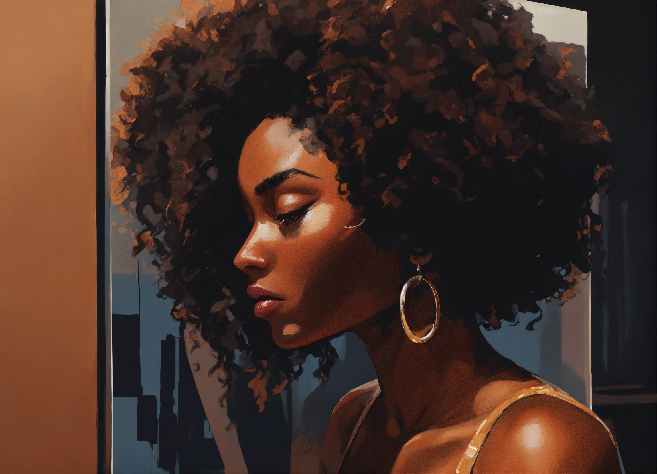A realistic acrylic painting, 5d, flat vector faceless illustration, extreme close, urban brown skin woman, standing in the mirror adoring her kinky coily hair, flat black background, flat white background .