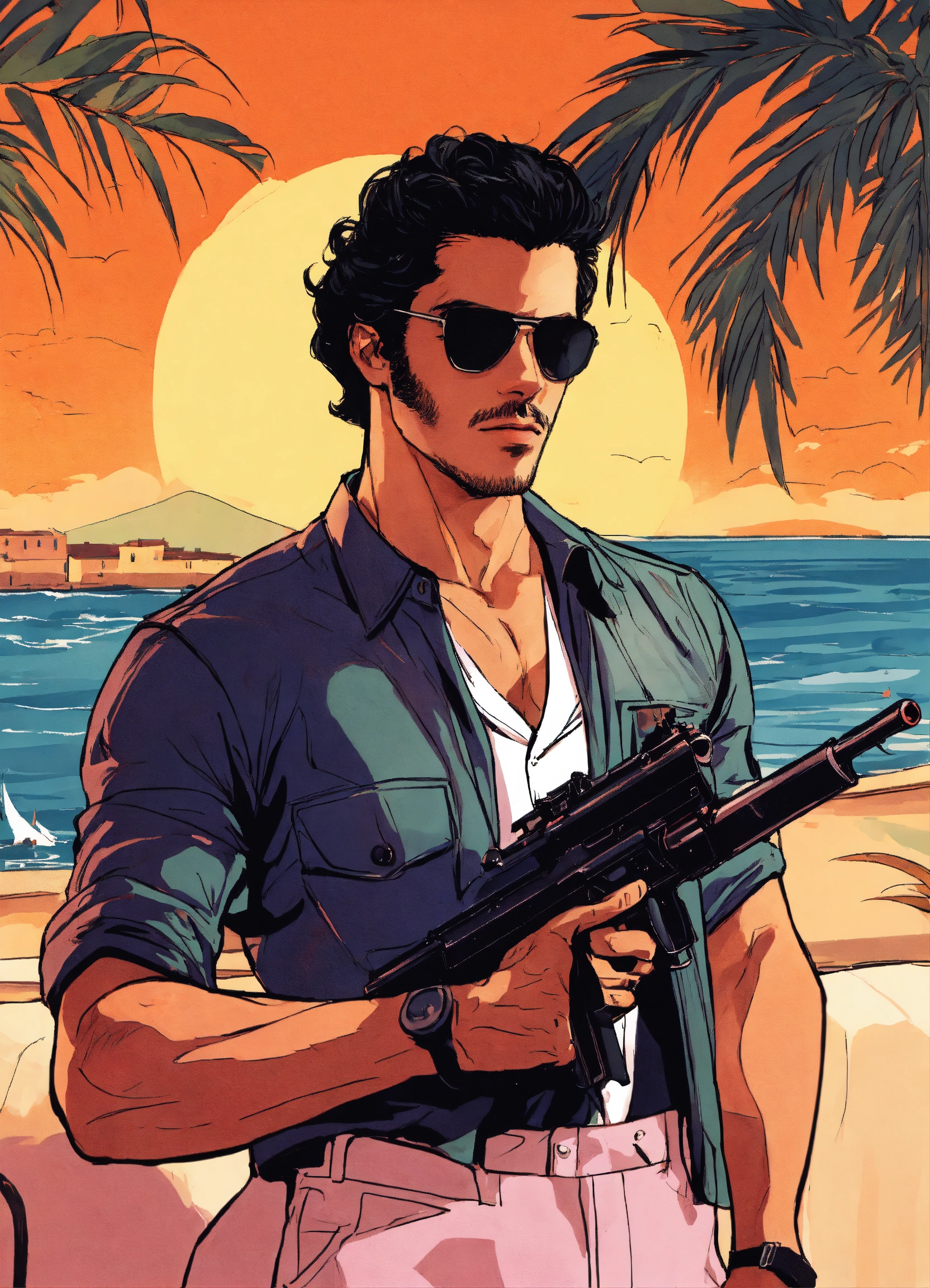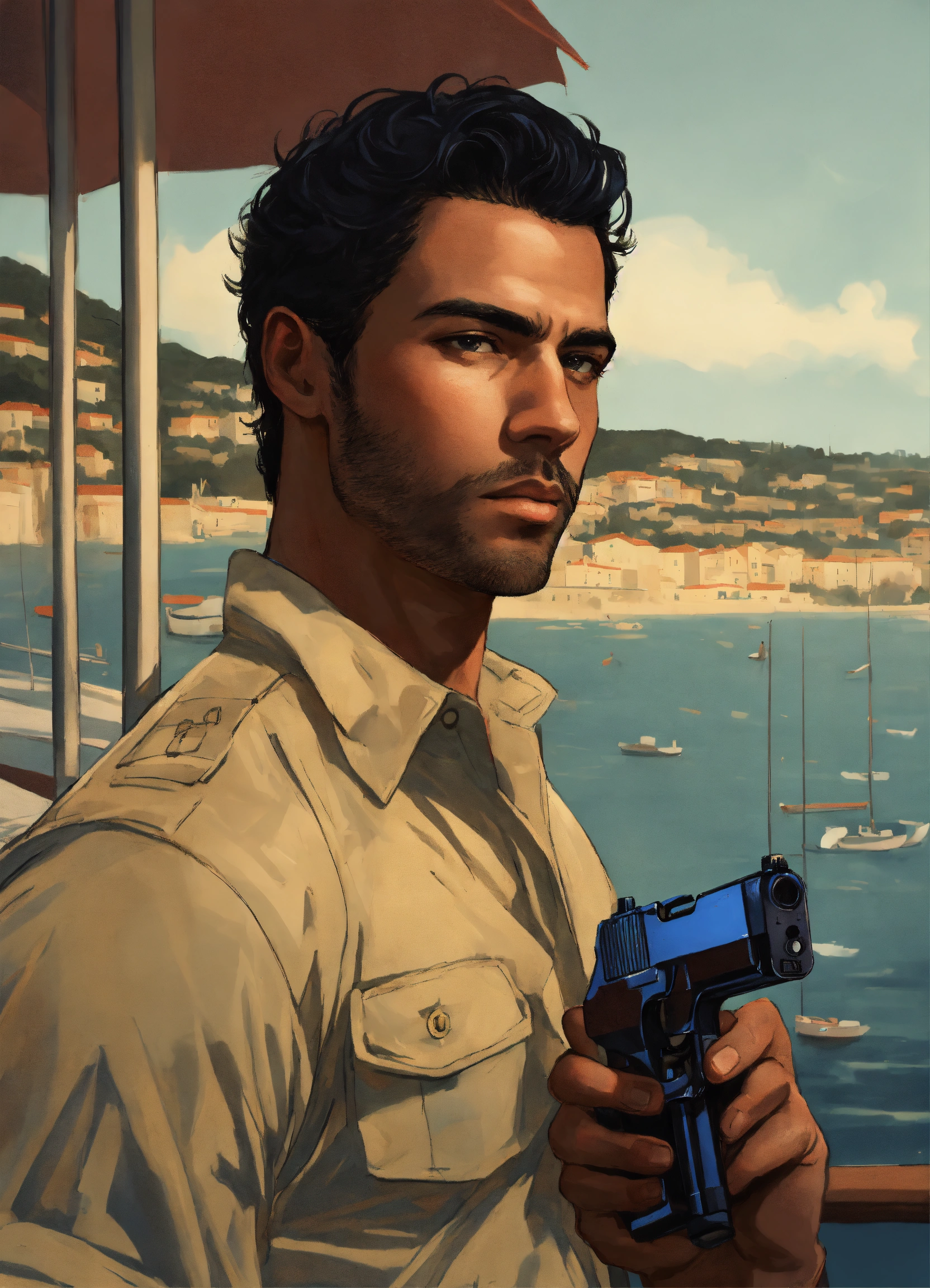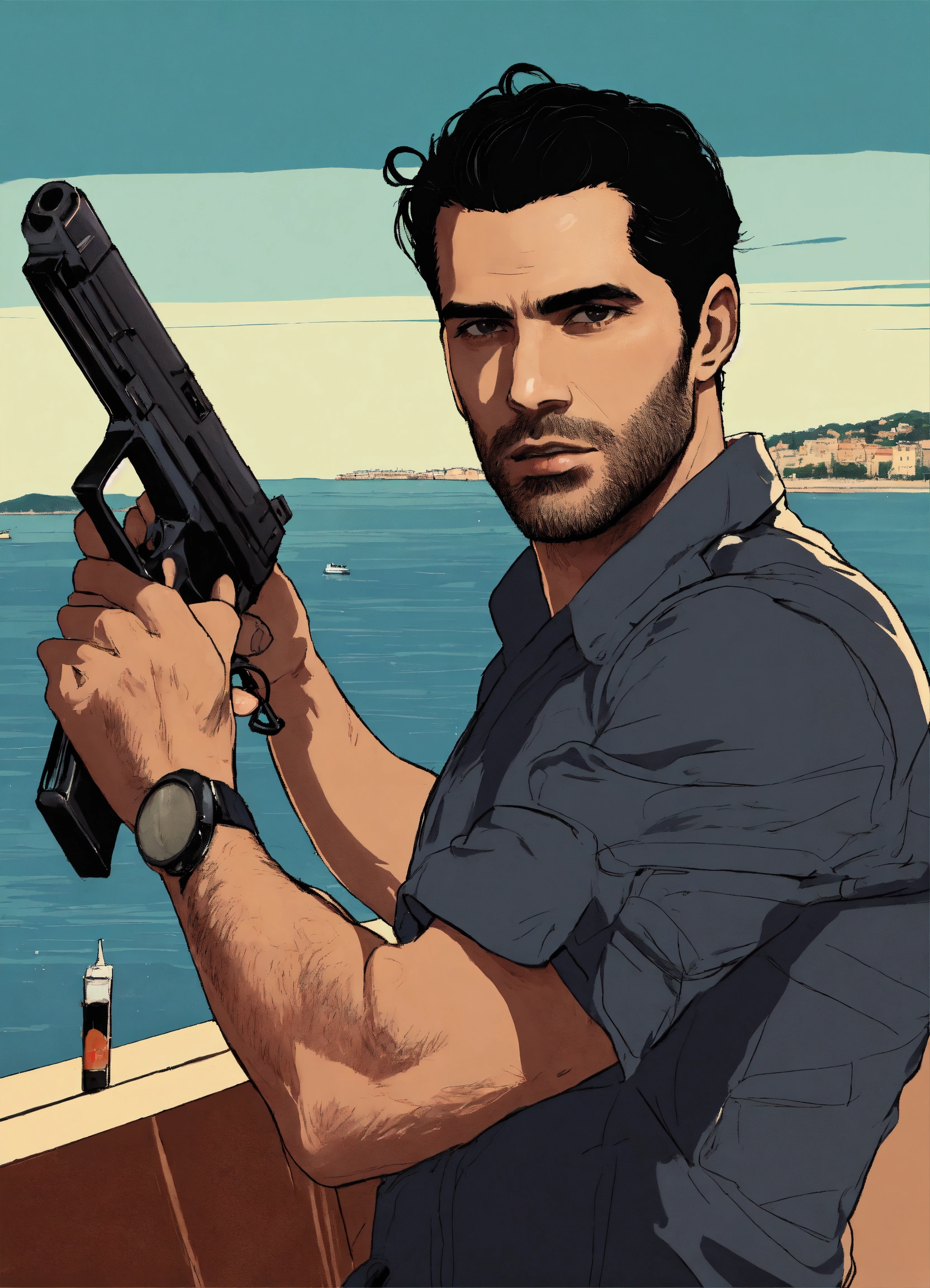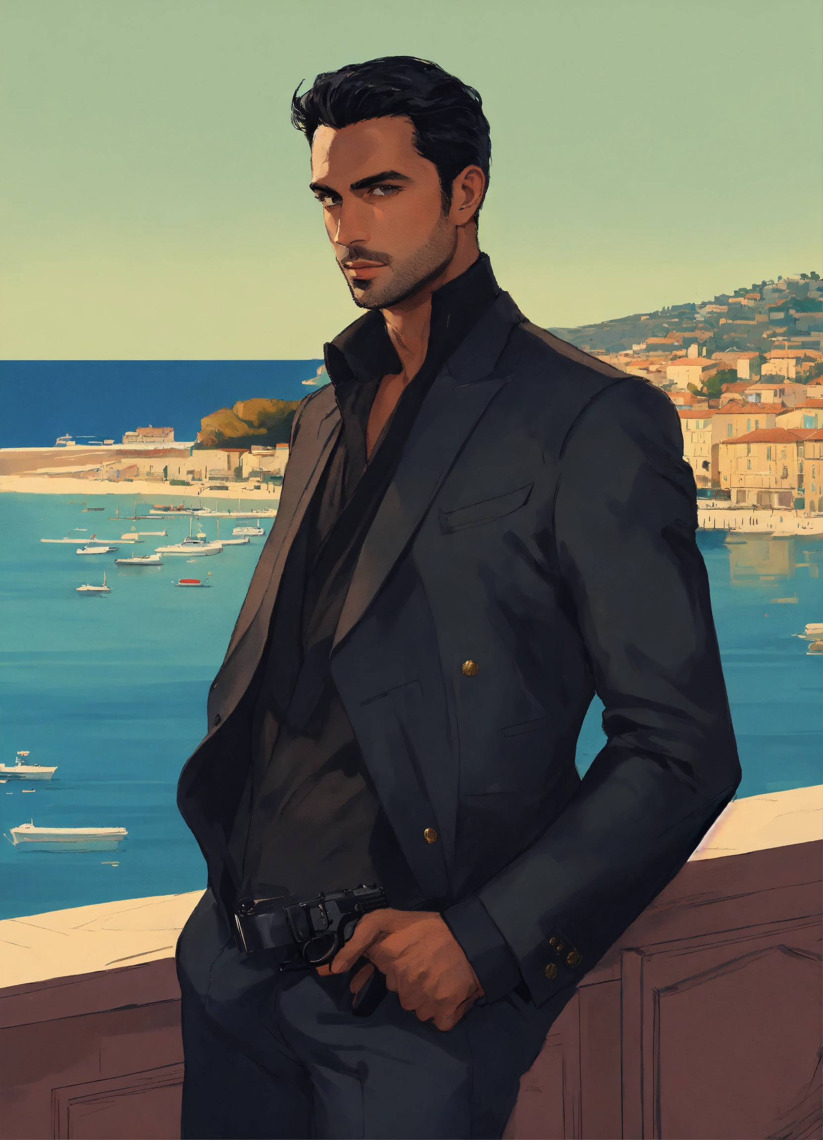 A dark french riviera sea background and in front, the modern drawing of a black hair handsome man in his late thirties wearing a hand gun