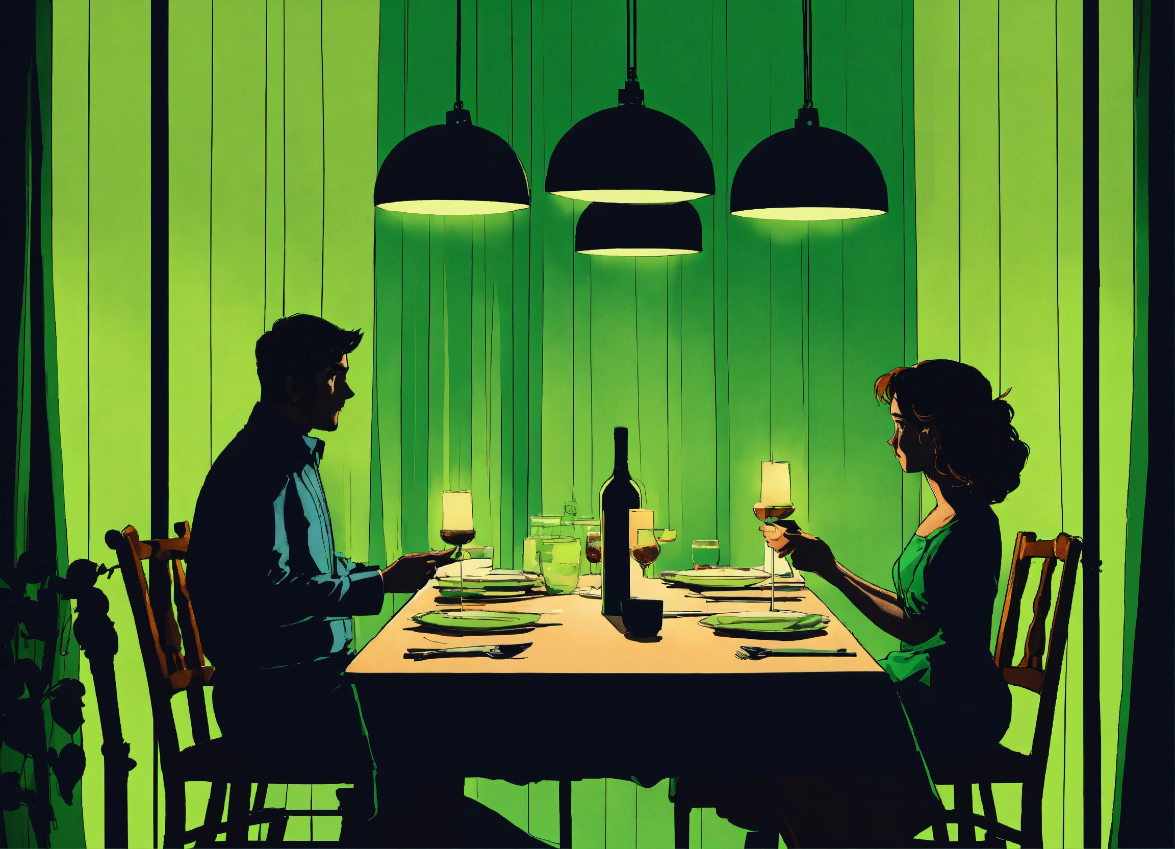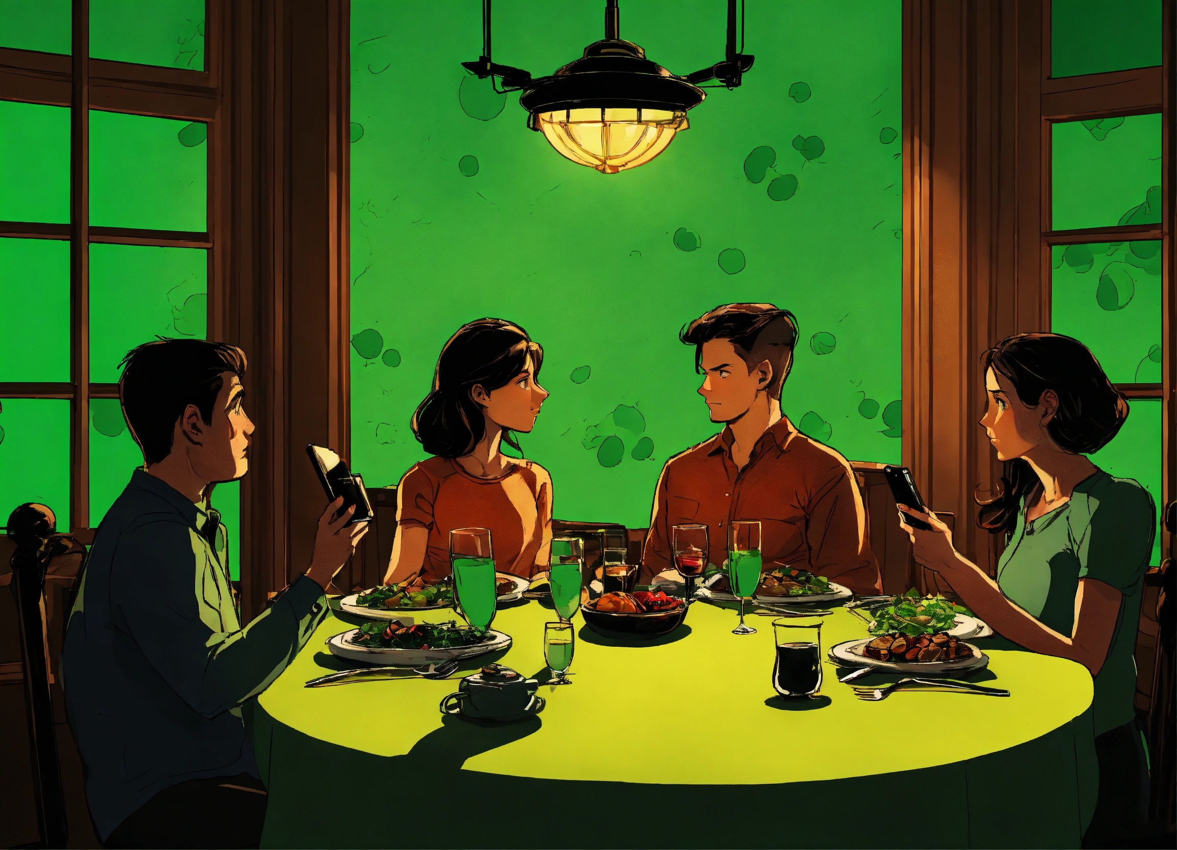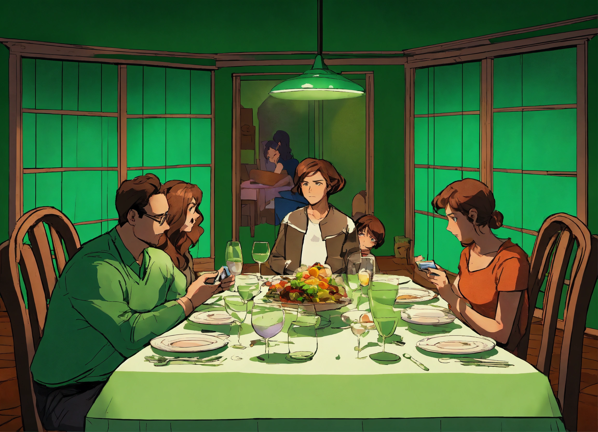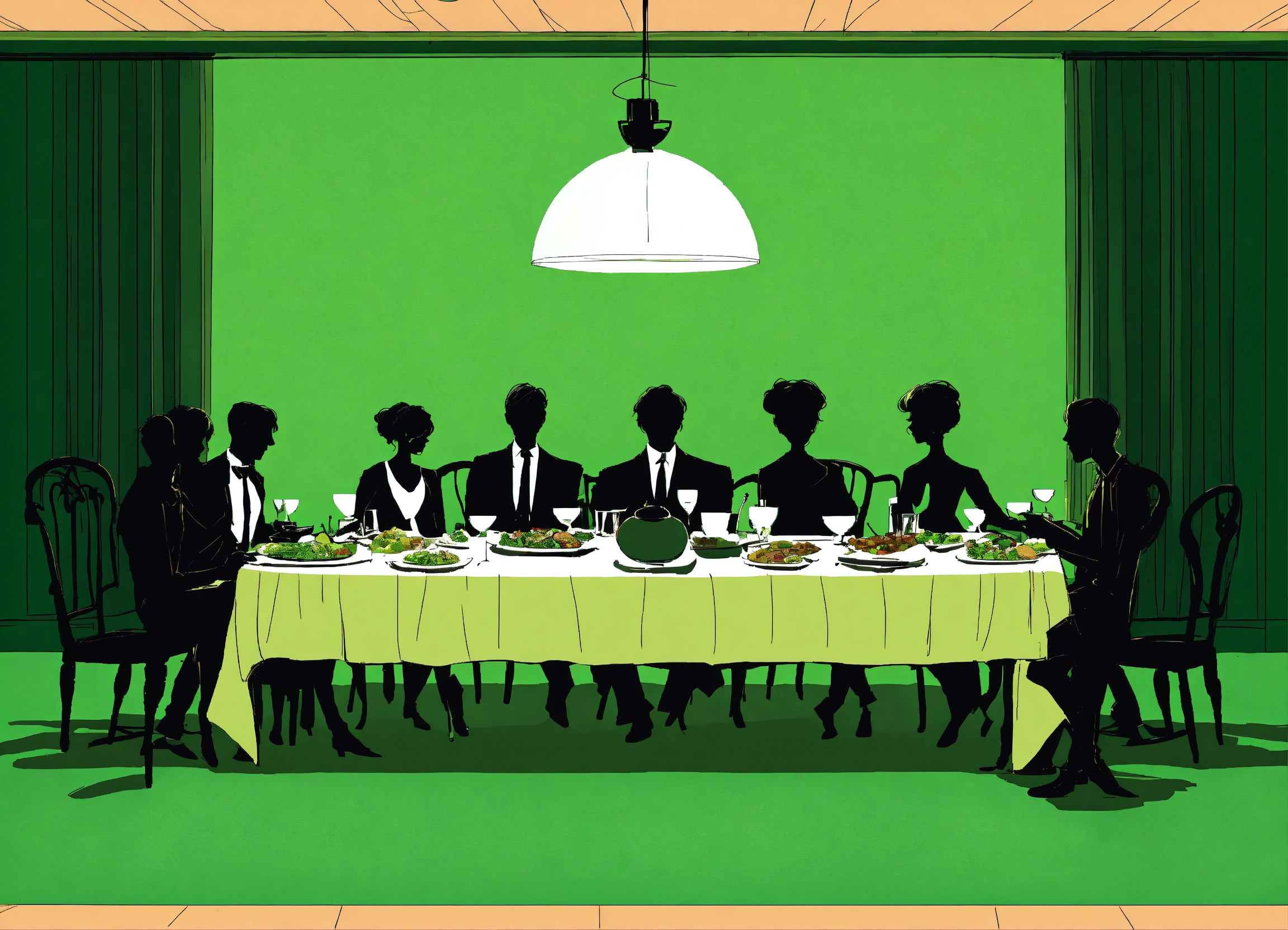 Envision a comic cartoon poster for a somber dinner scene, where the family appears as silhouettes against a backdrop of green screen light. their movements are slow and puppet-like as they glance at phones instead of each other, in a room where the darkness seems to be closing in
