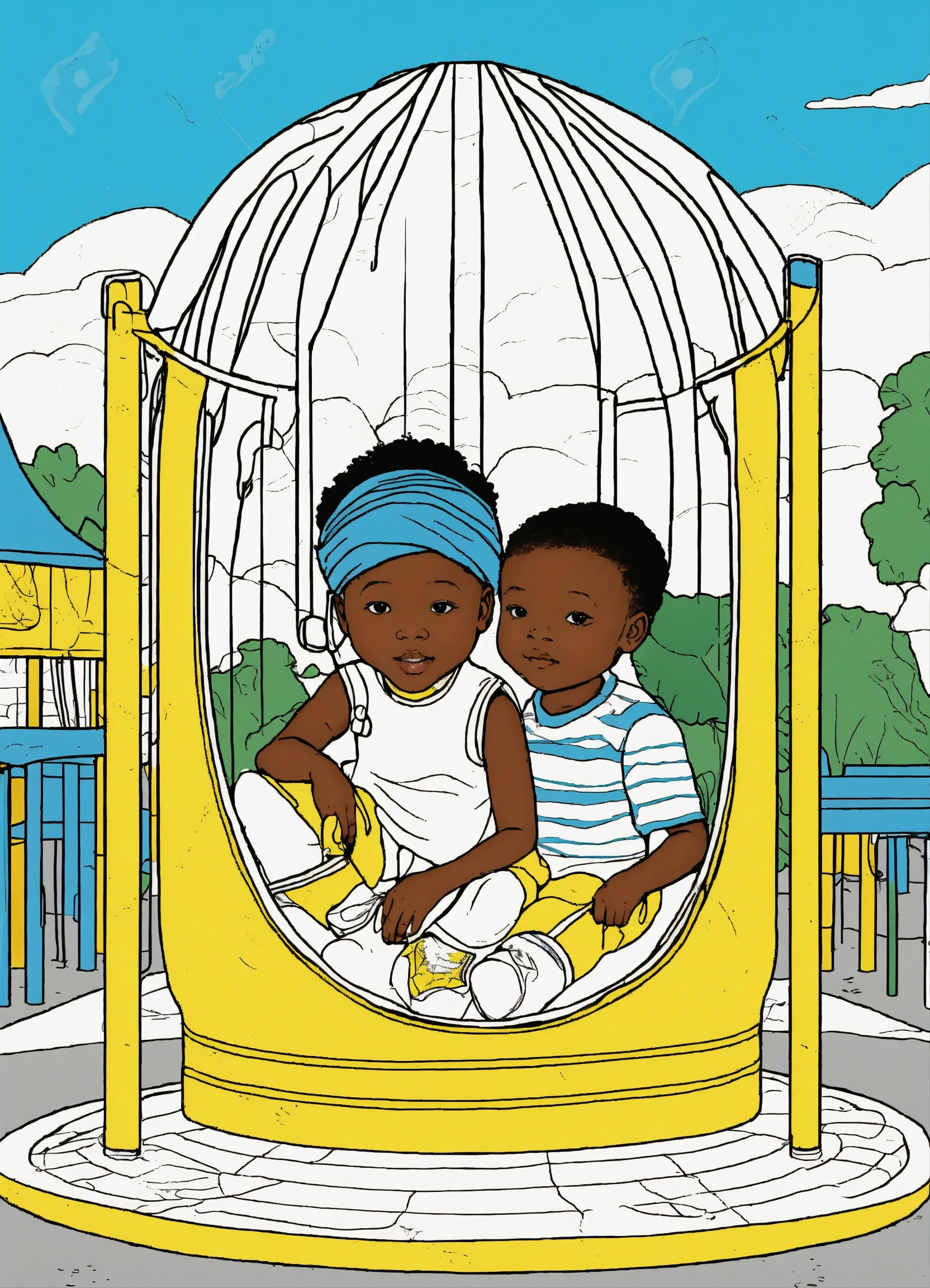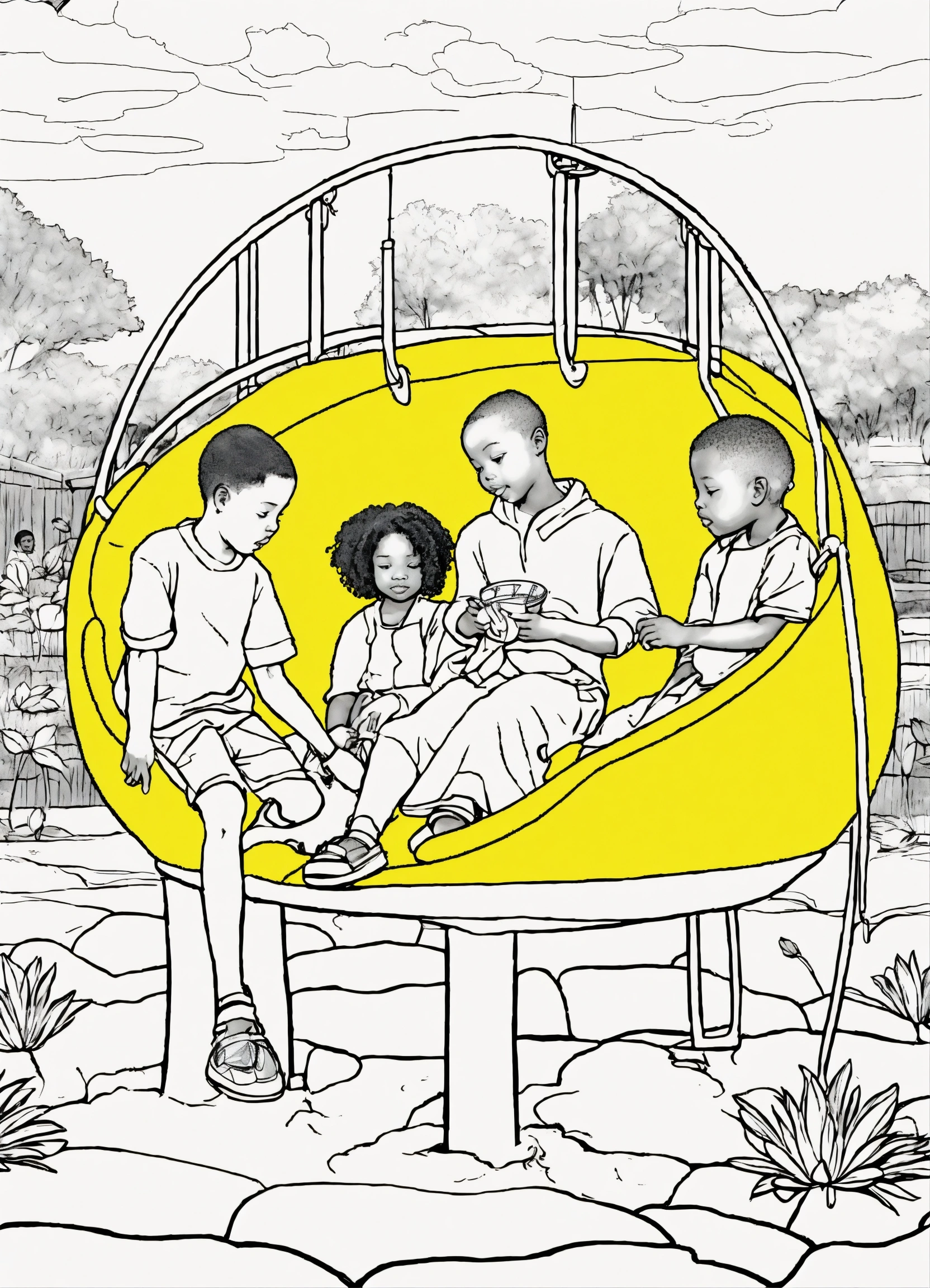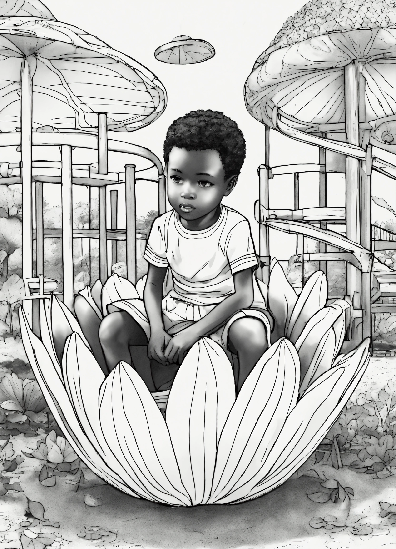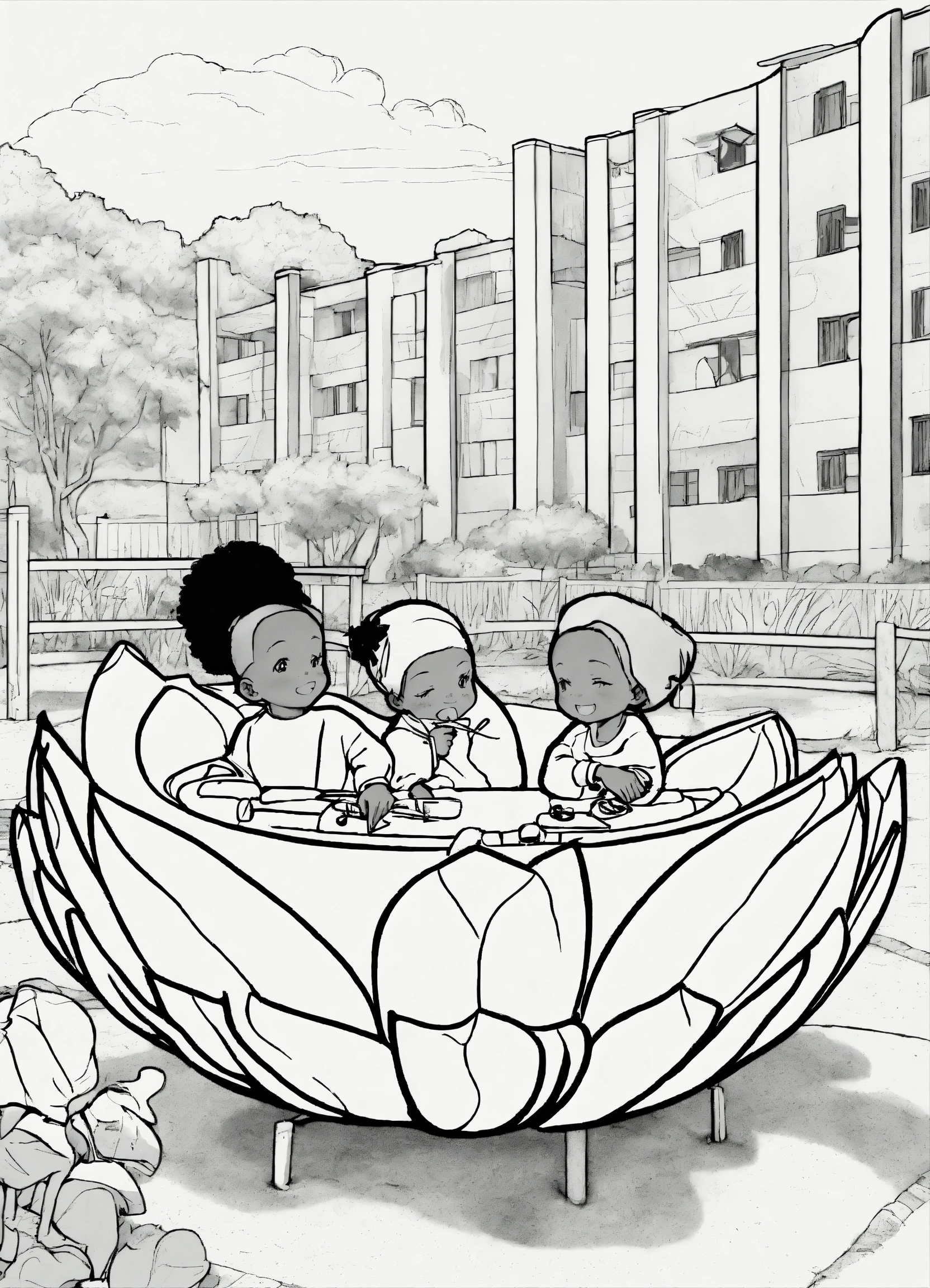 Black and white image coloring book african children inside a lotus bud on a playground, yellow and blue