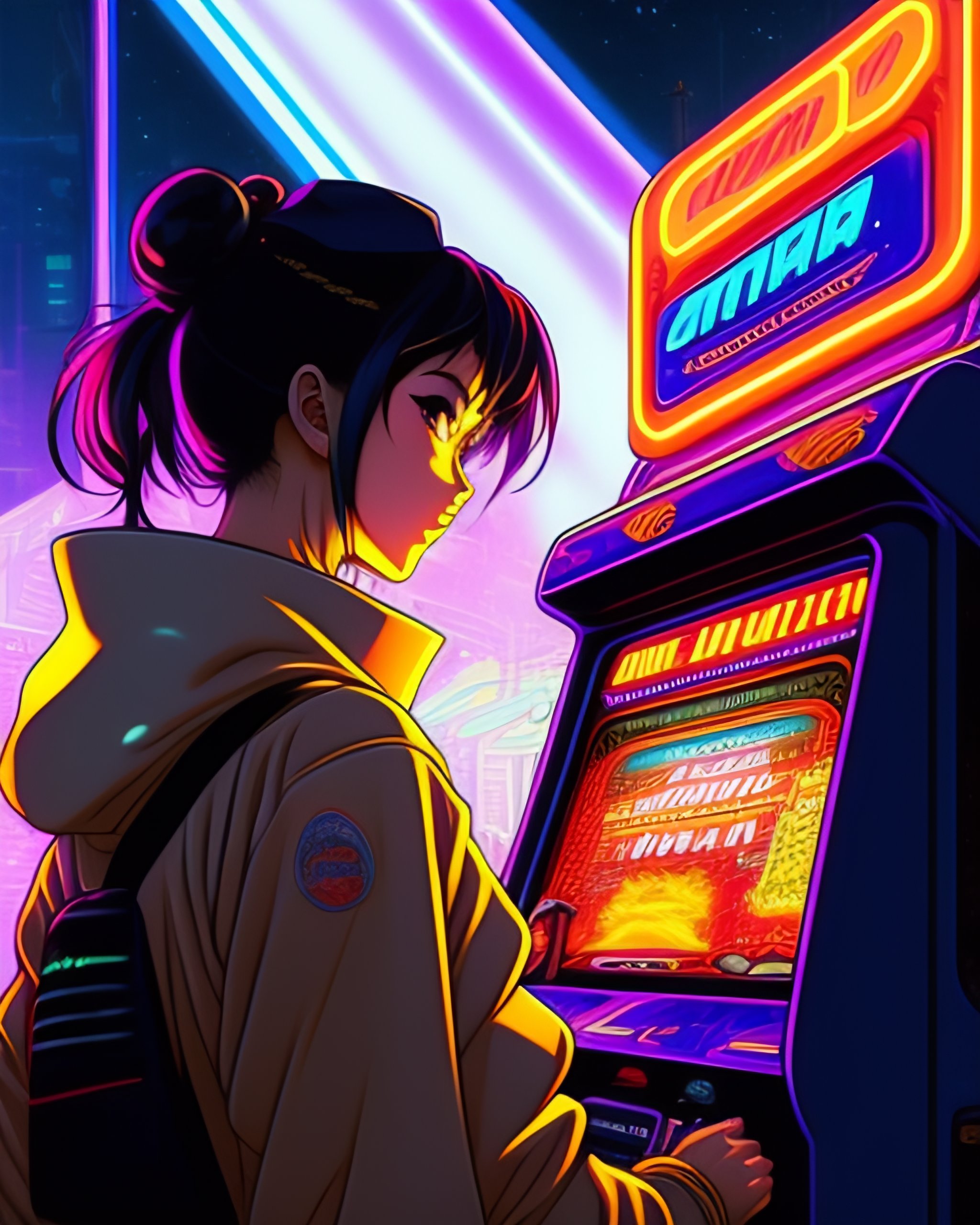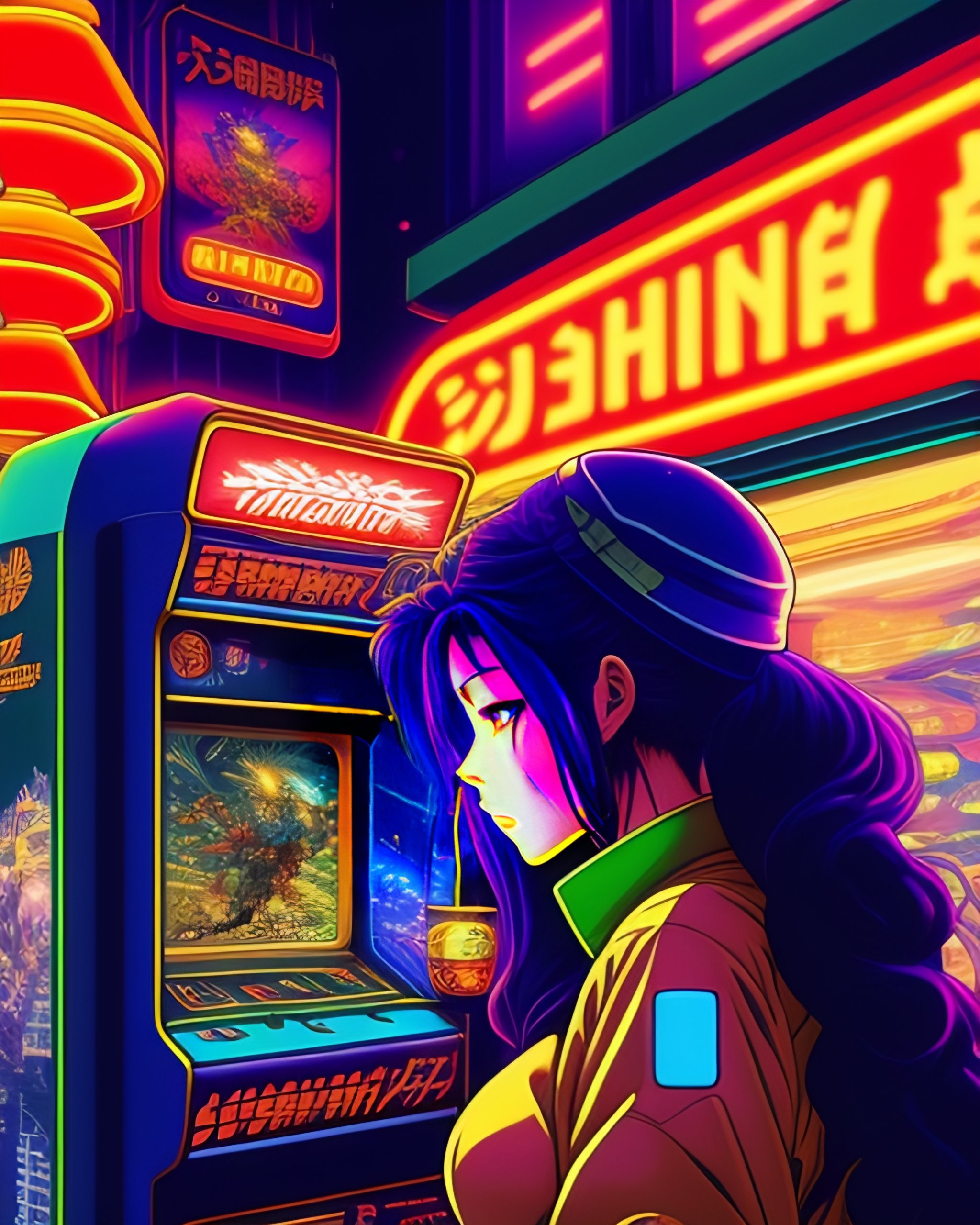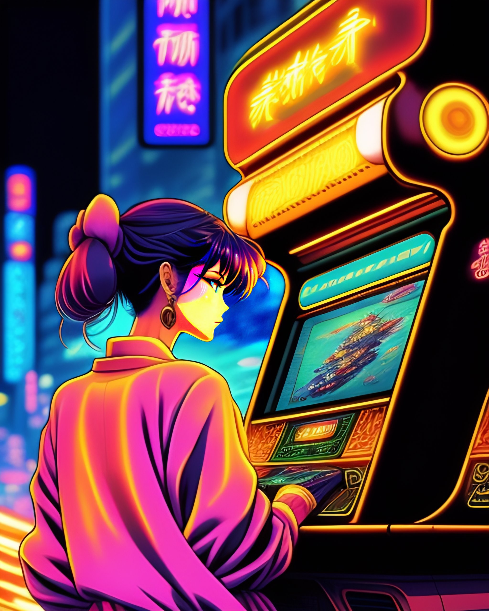Vintage 90's anime style environmental wide shot of a chaotic arcade at night; a woman wearing streetwear playing an arcade game; by hajime sorayama, greg tocchini, virgil finlay, sci-fi. line art. environmental arcade art.