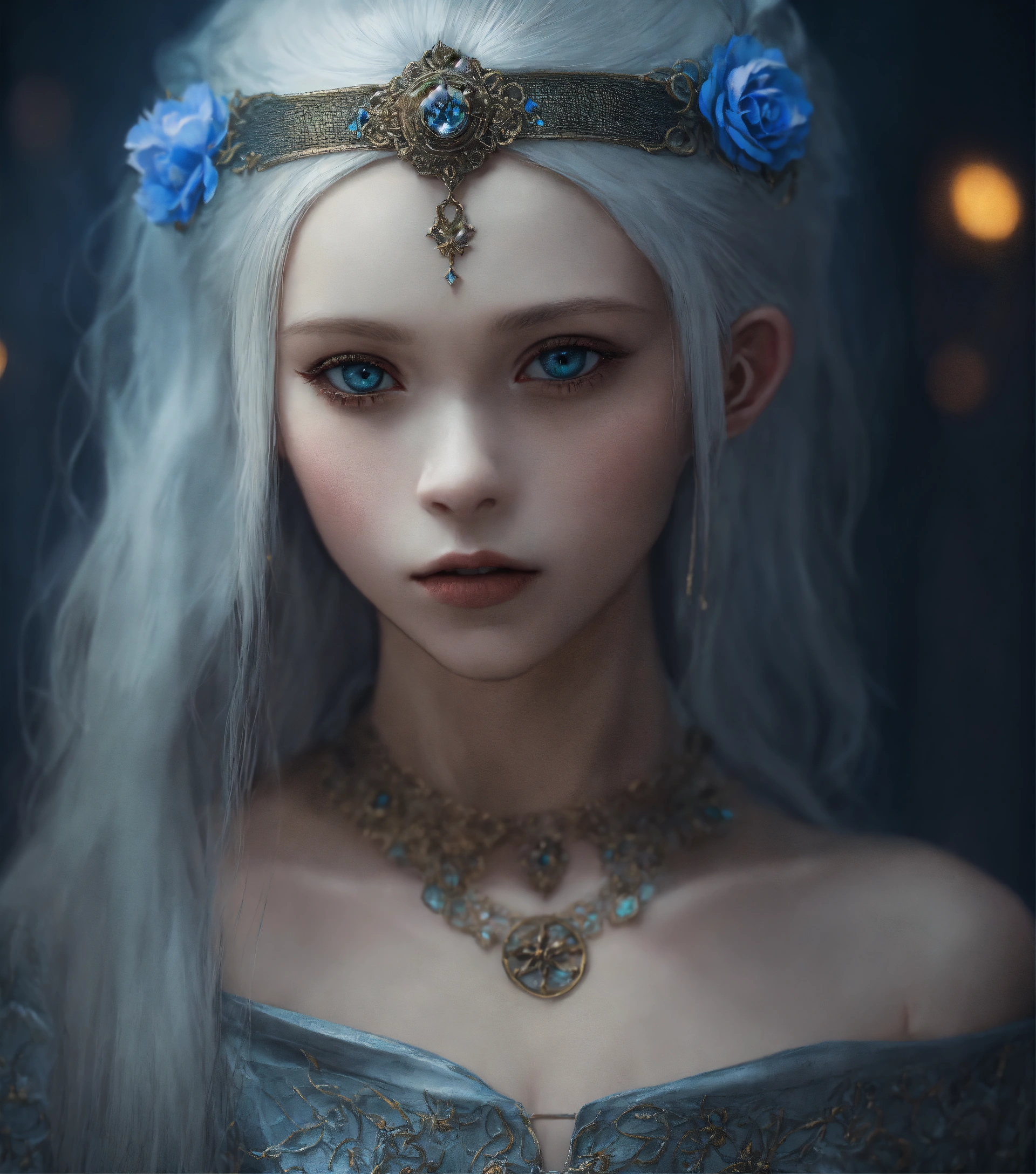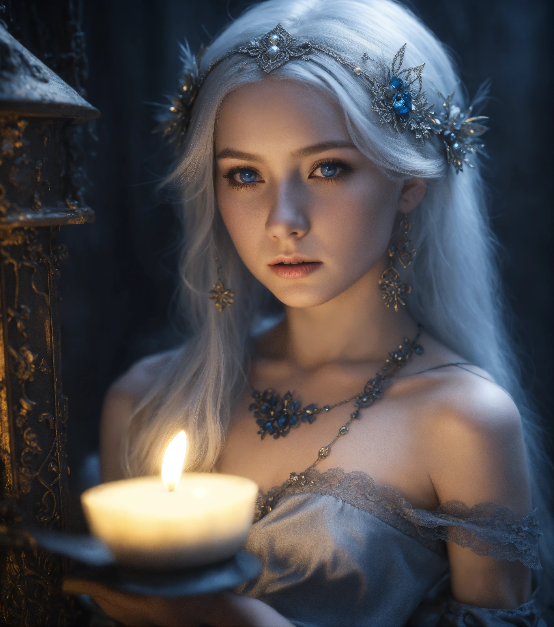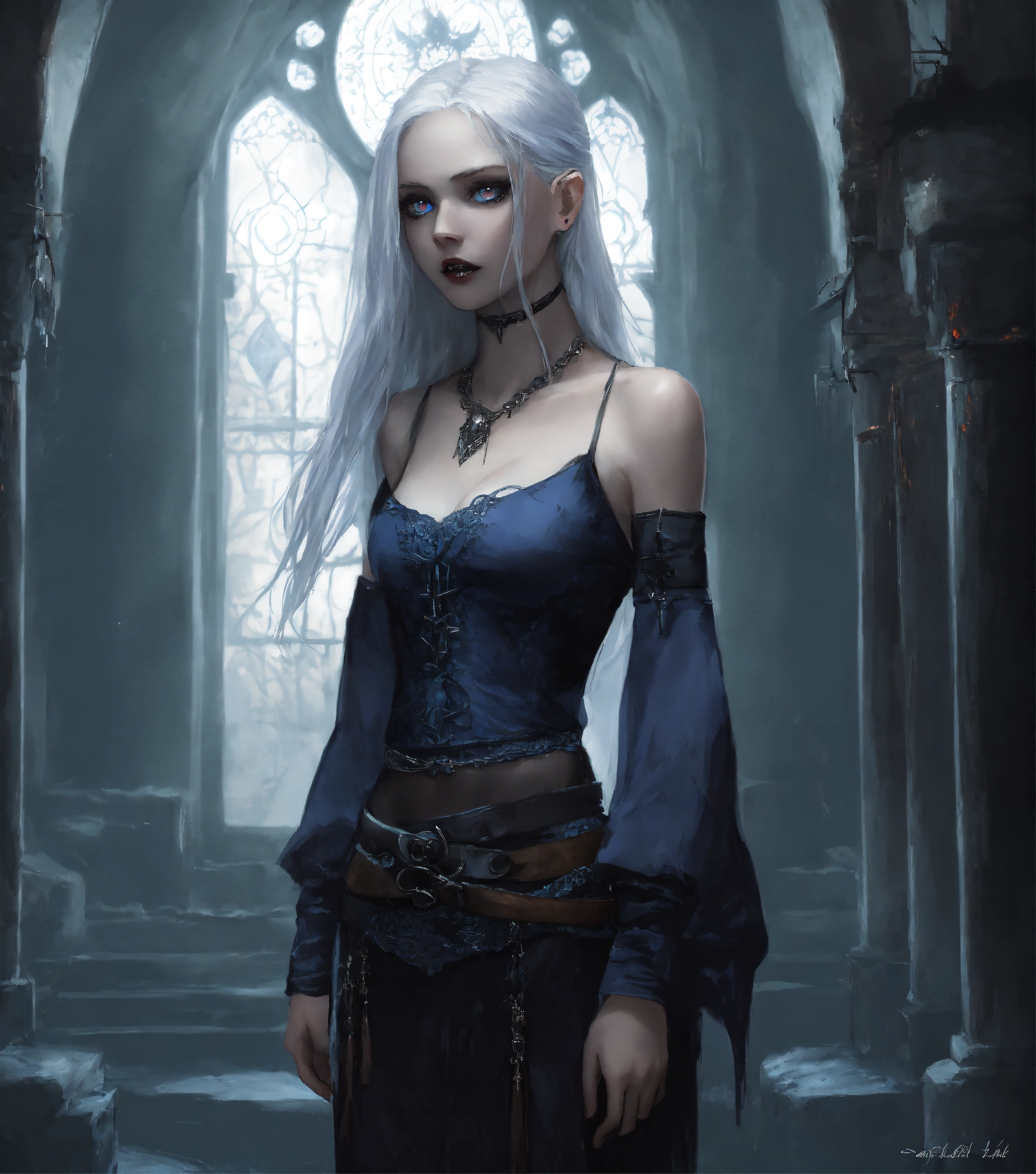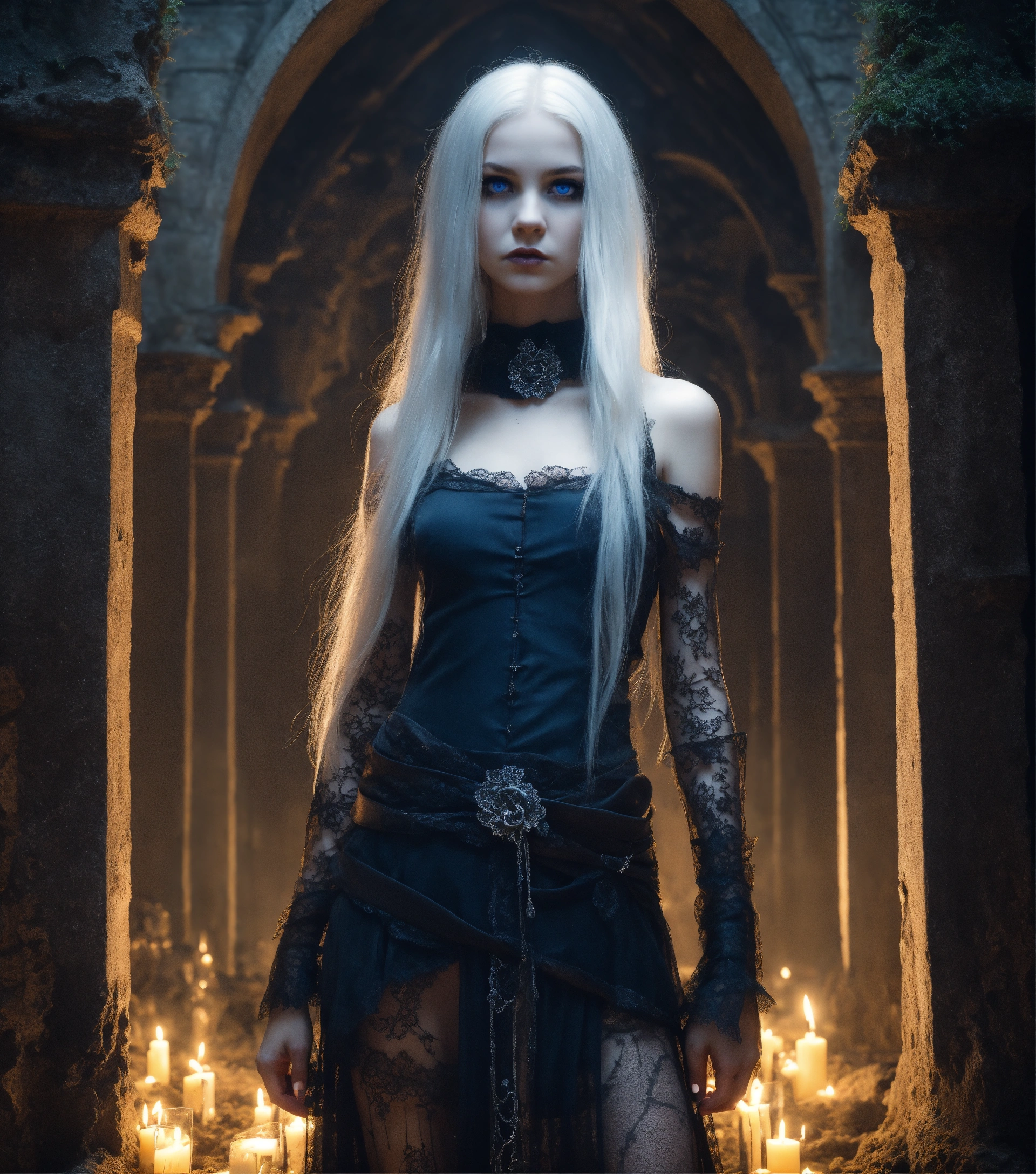 Sehr kindhafte deadly pale twelve year old female goth necromancer child with waist long silverwhite hair and a aufreizendes off-the-shoulder lace silk cropped top mit tiefem ausschnitt and a low-waisted high slit skirt, very flat belly, extremely skinny, extremely slim and emaciated body, very narrow face, alabaster skin, pale as a corpse, glowing blue eyes, slim face, innocent looking, in a gloomy crypt, kindlich, unschuldig, childlike, juvenile, graceful, wispy, glowing blue eyes, ghostly, dead, evil, demonic, undead, darkness, grotesque, mysterious, dark, dark, cold ambient lighting, extremely detailed, fantasy, medieval setting