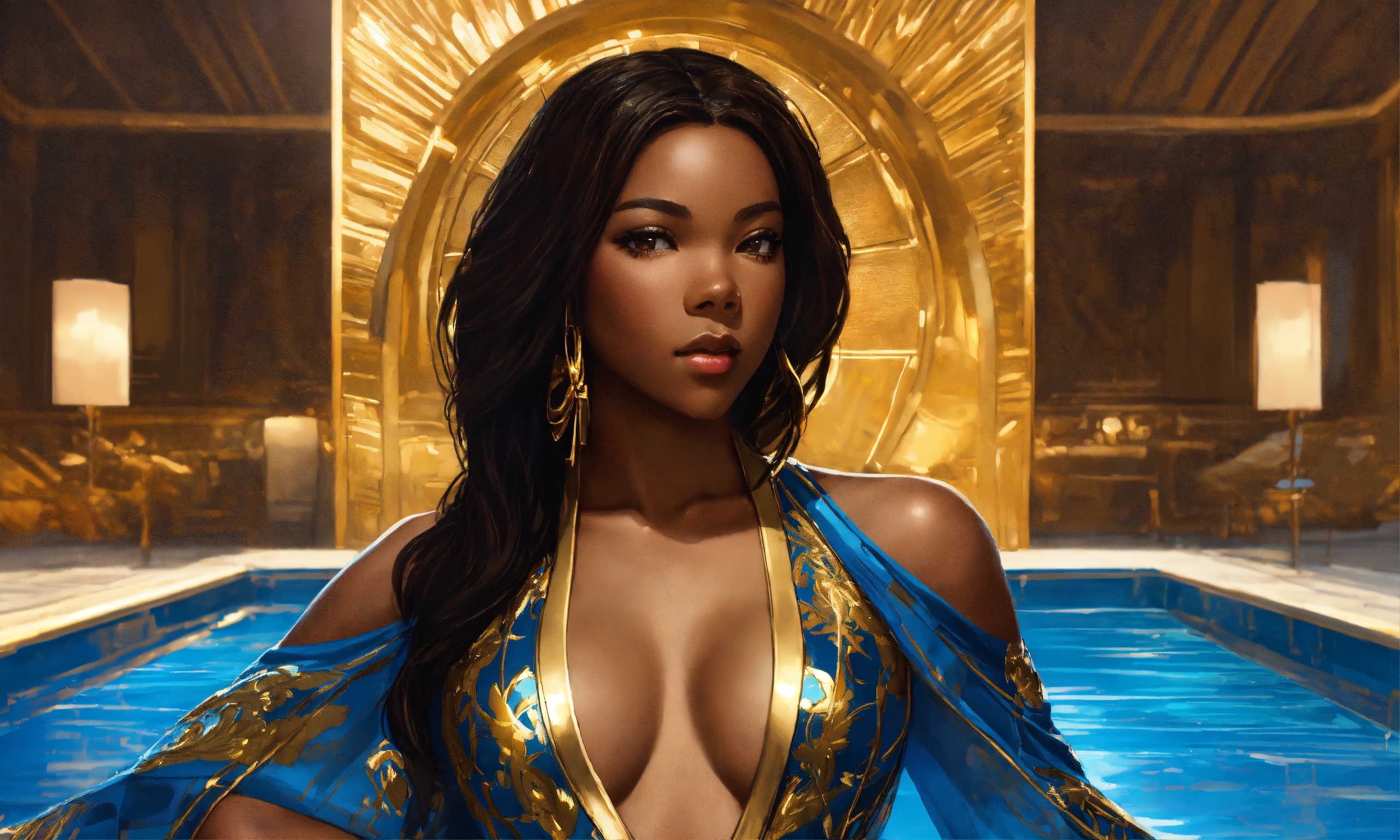 Solo beautiful gabrielle union classy brown skinned in gold swimsuit with black hair, in gold and blue pool area, brown eyes, with blue and gold suit, mother body, full body, intricate, elegant, highly detailed, digital painting, concept art, art station, smooth, sharp focus