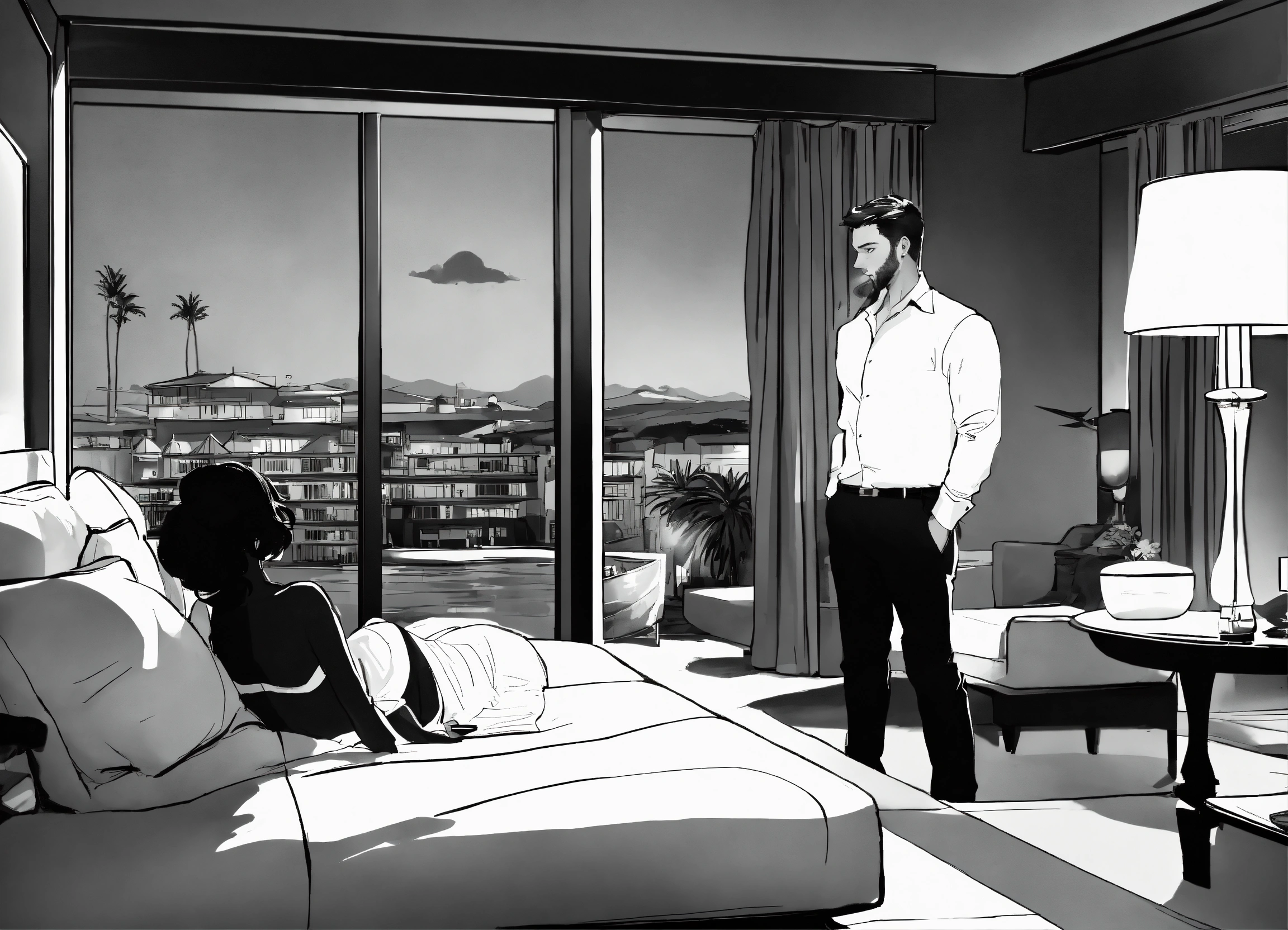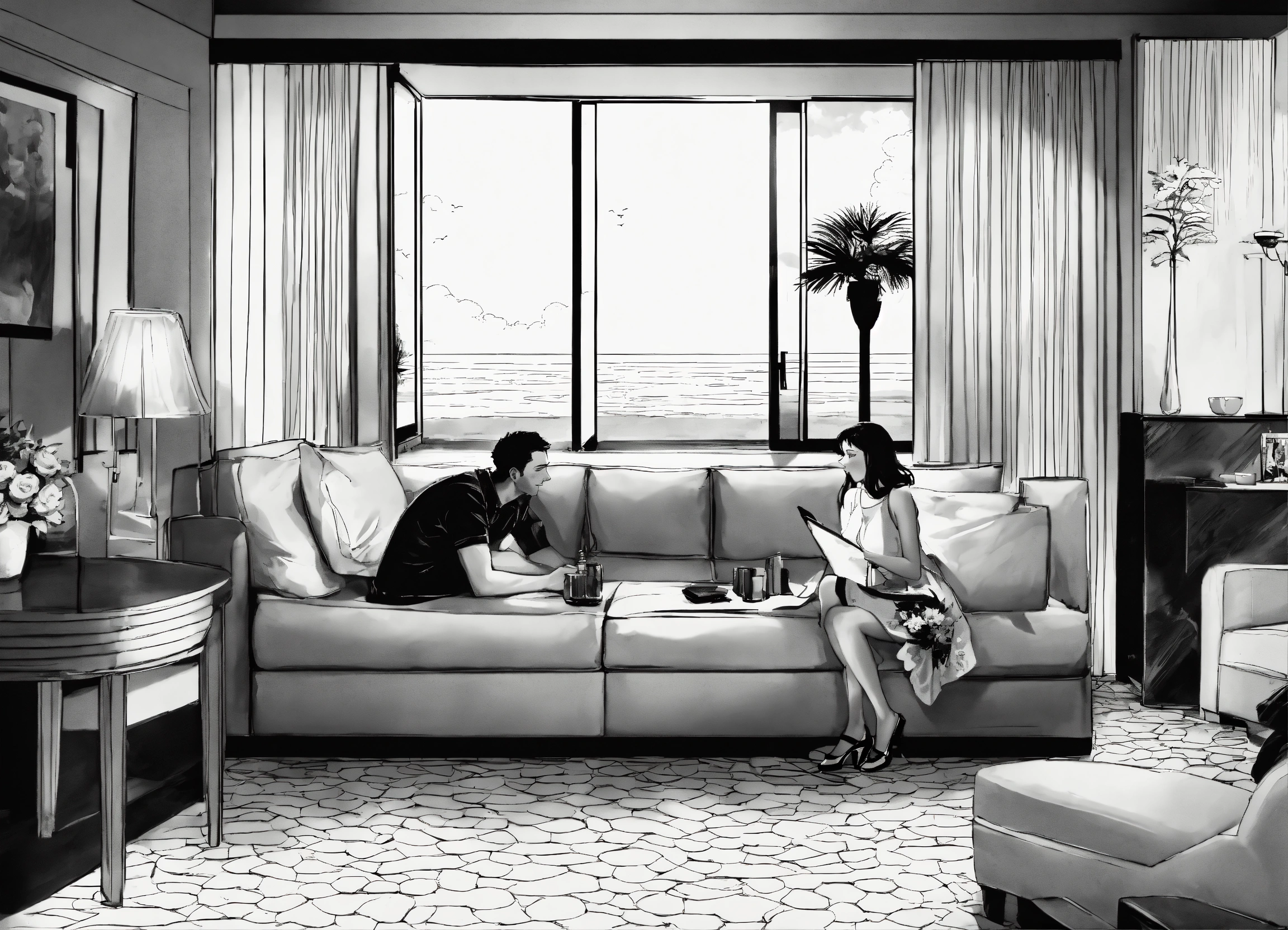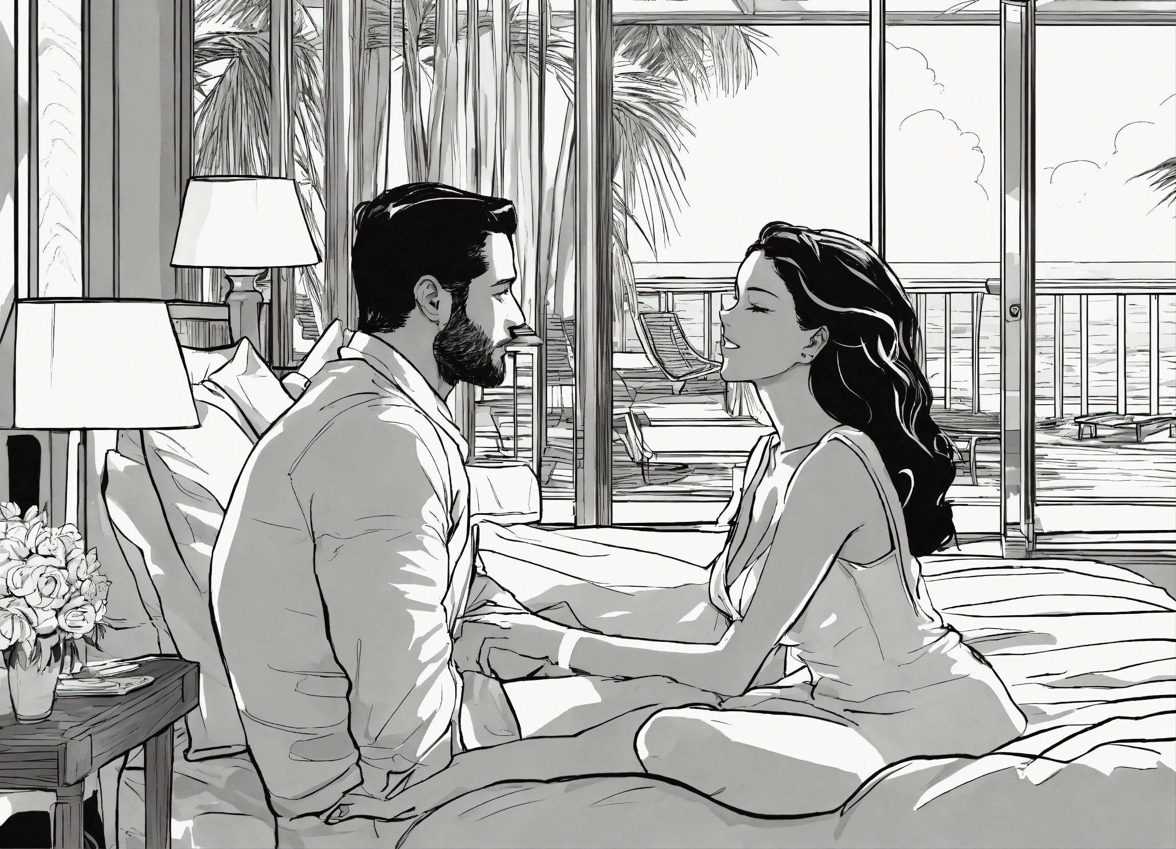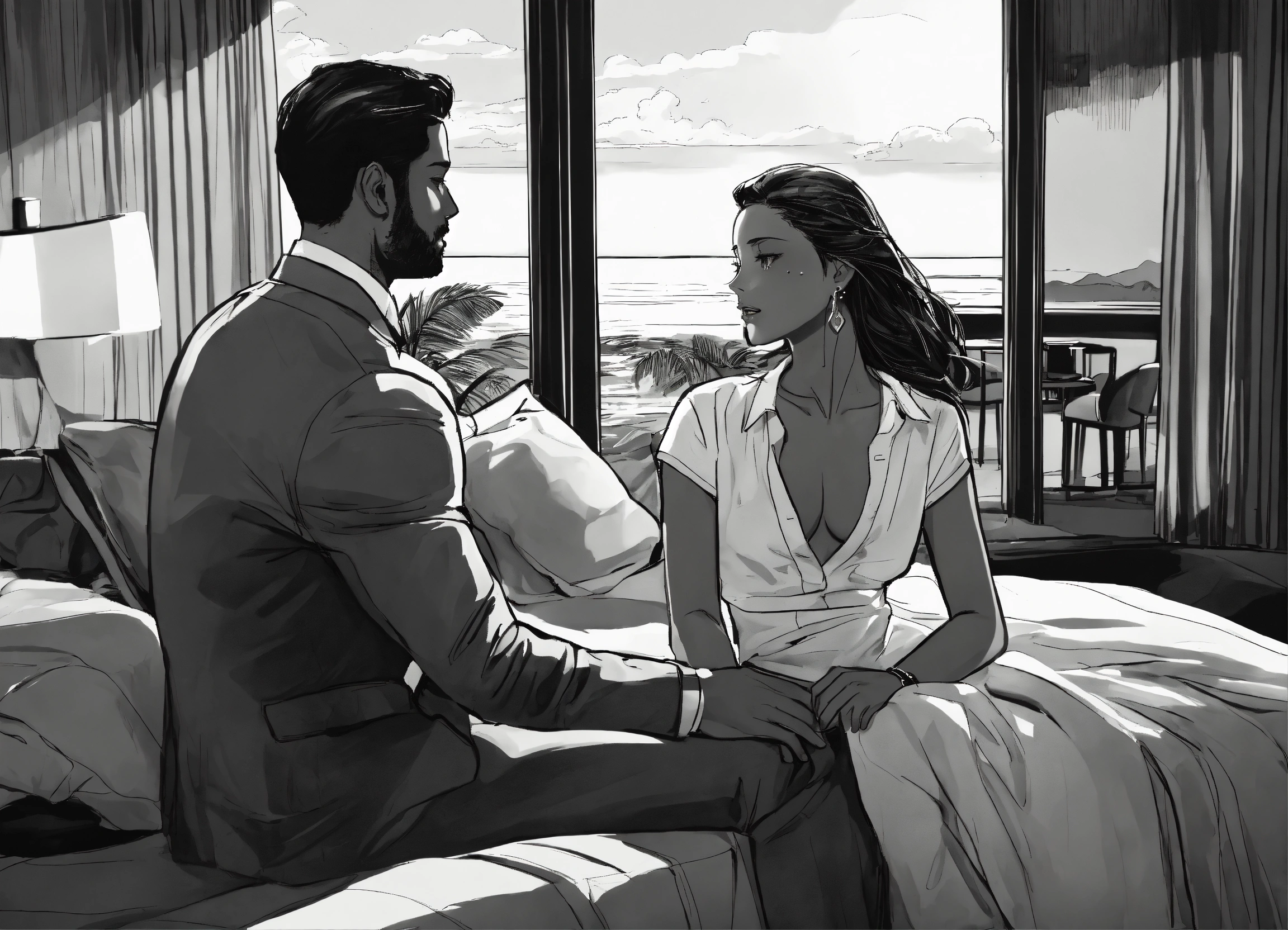 Illustration black and white, show the emotional and psychological impacts experienced by a new male and female couple as they dive deeper into the flirtatious lifestyle at the hotel resort