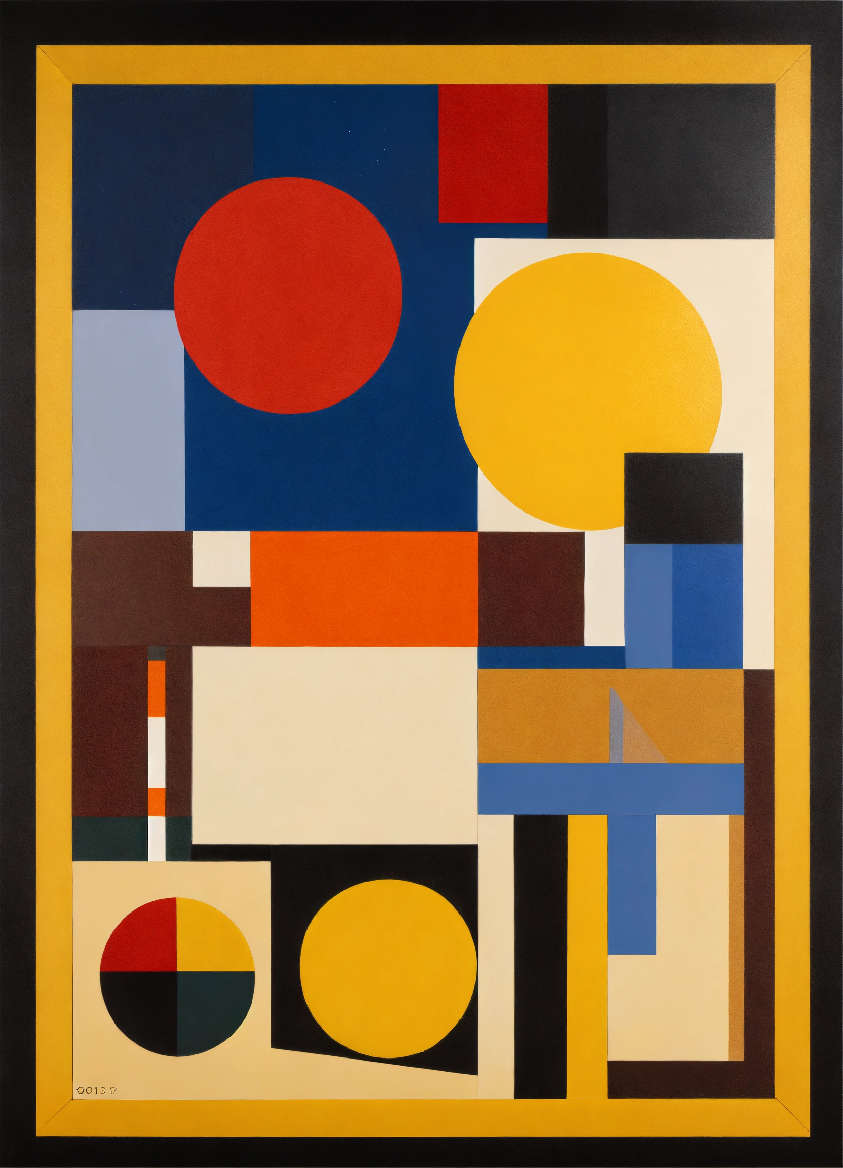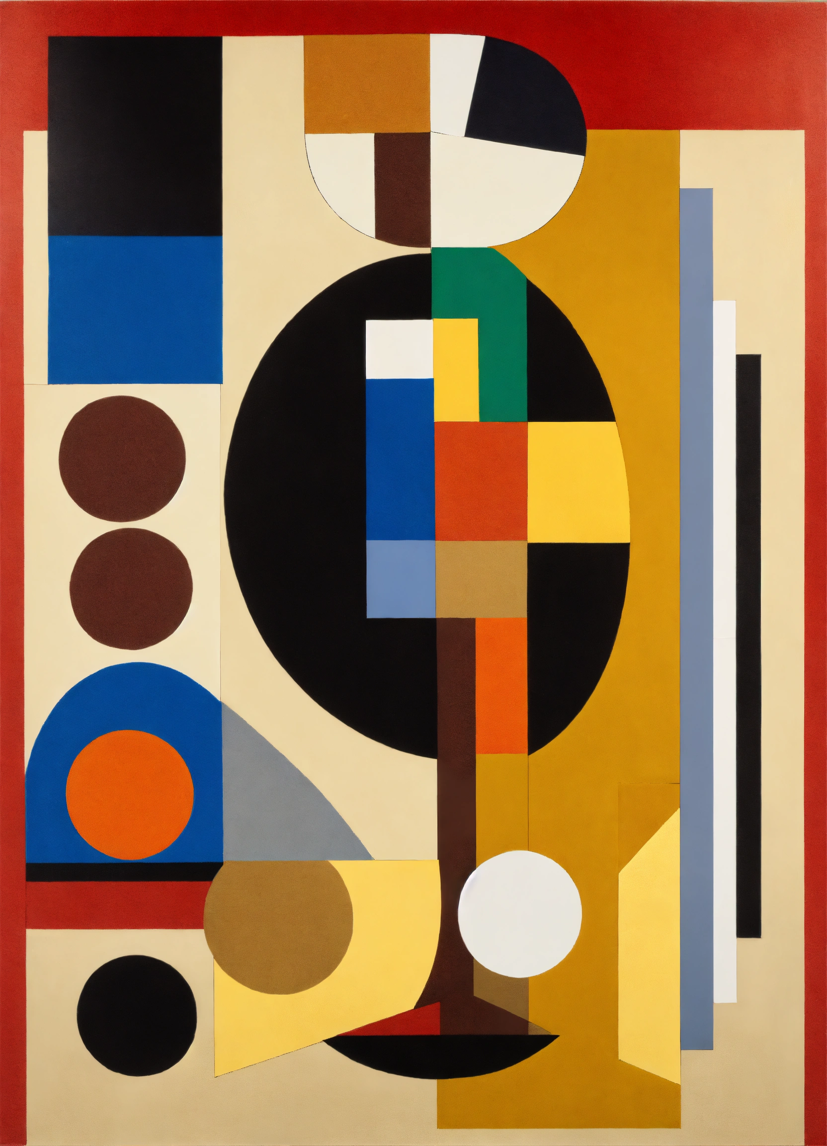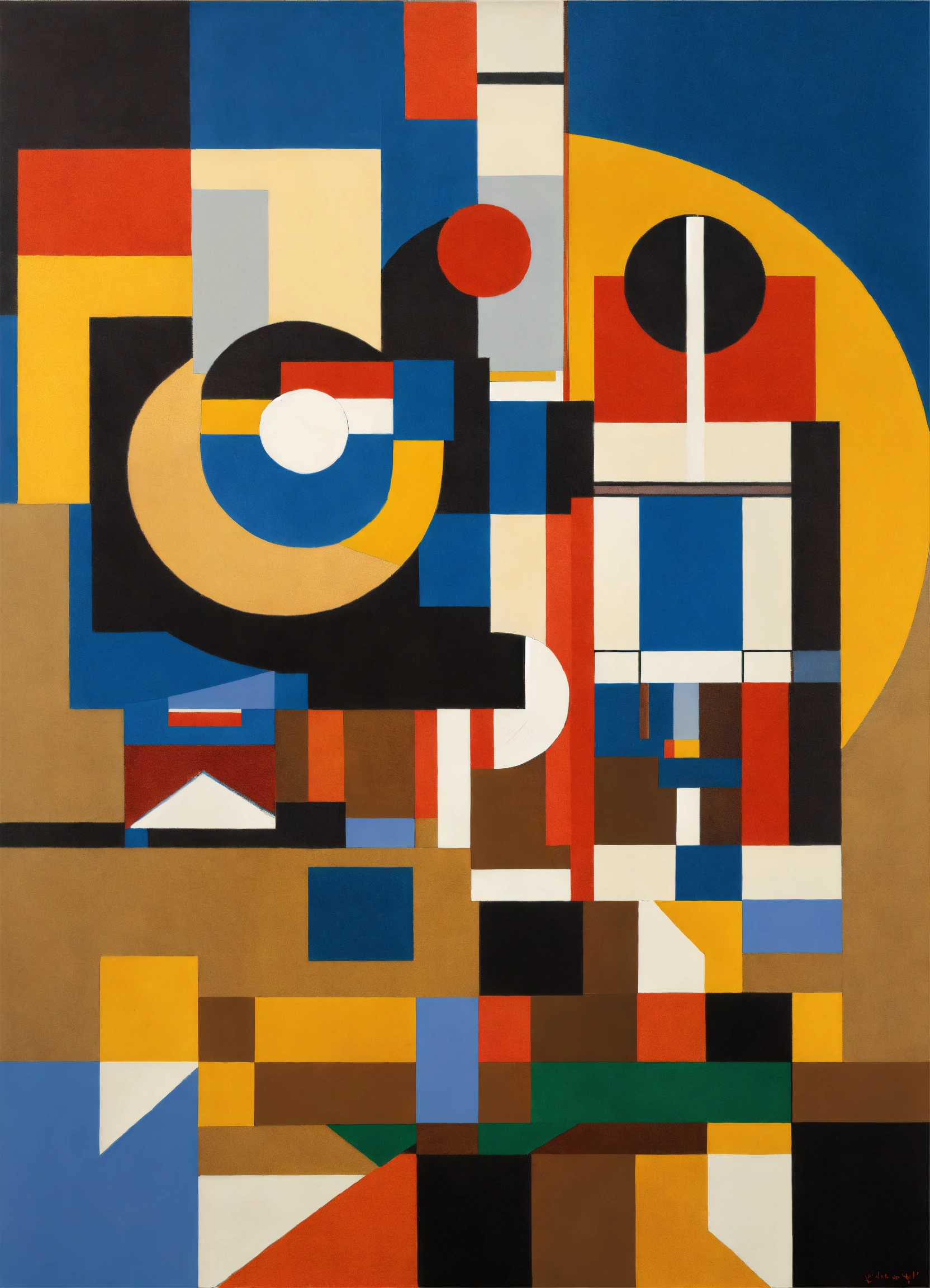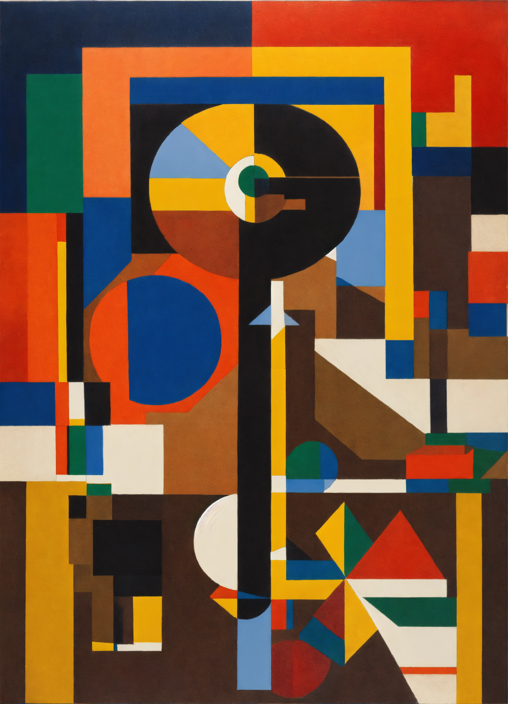 A suprematist composition with traditional african iconography floating in geometric abstraction