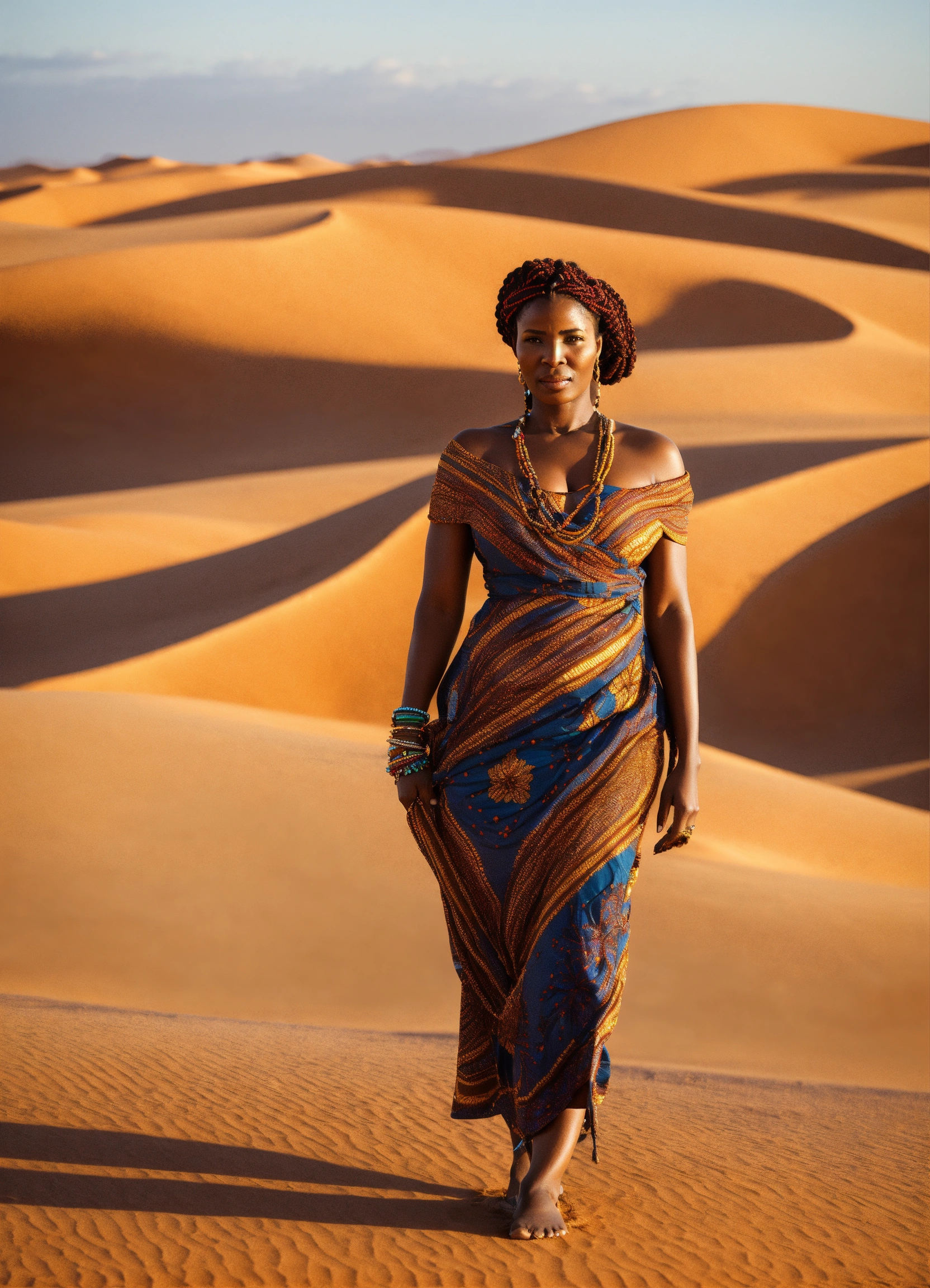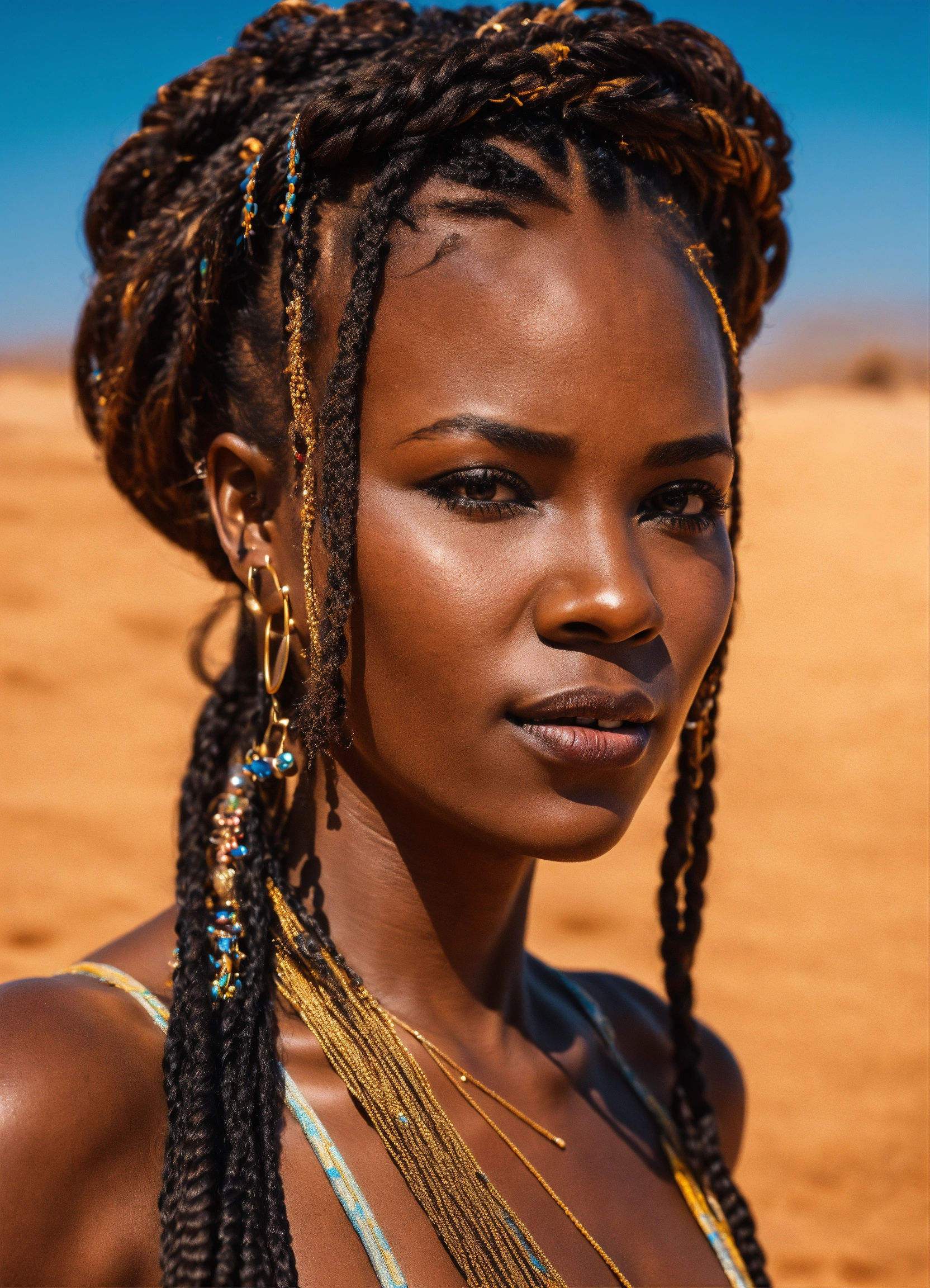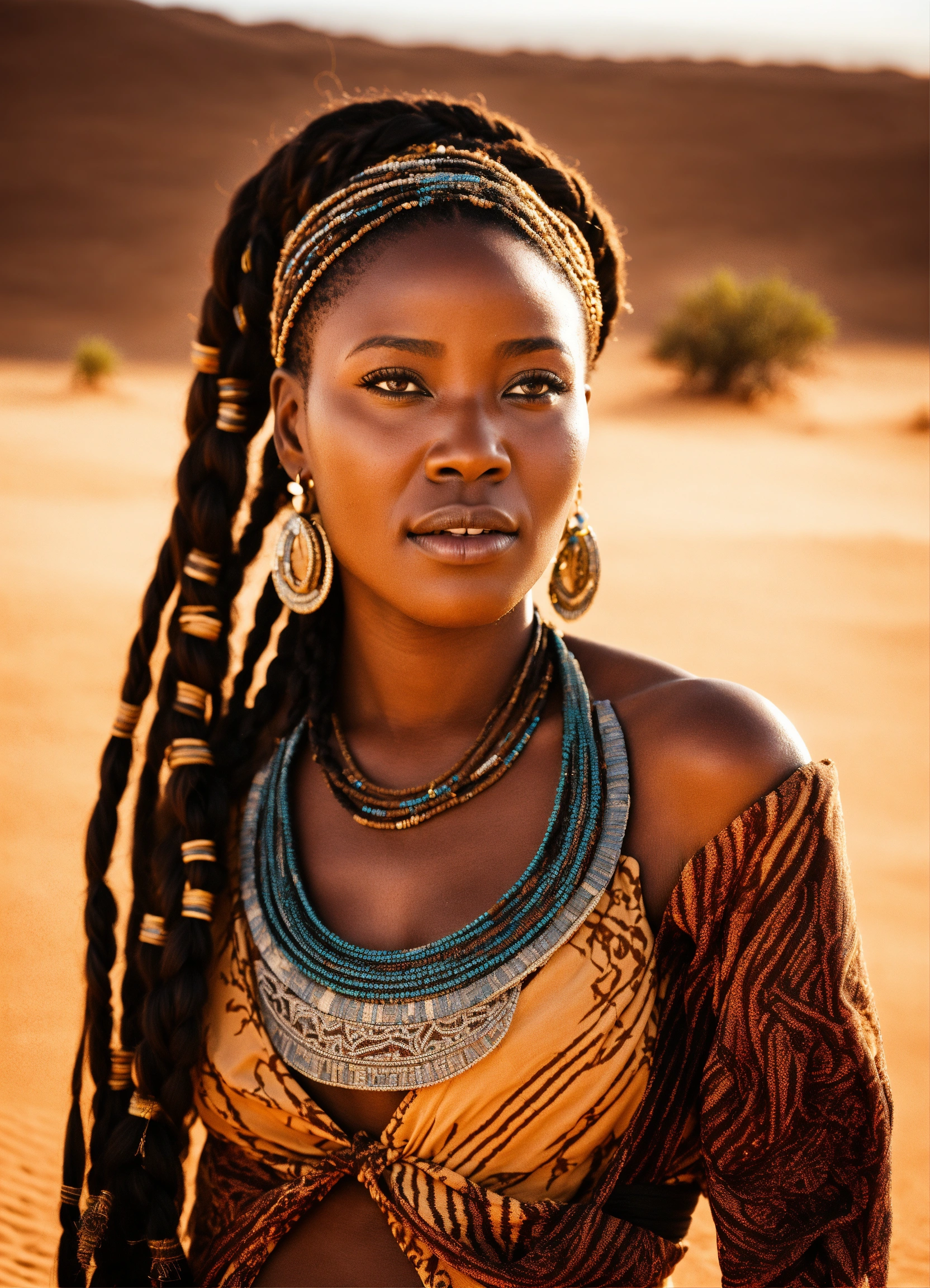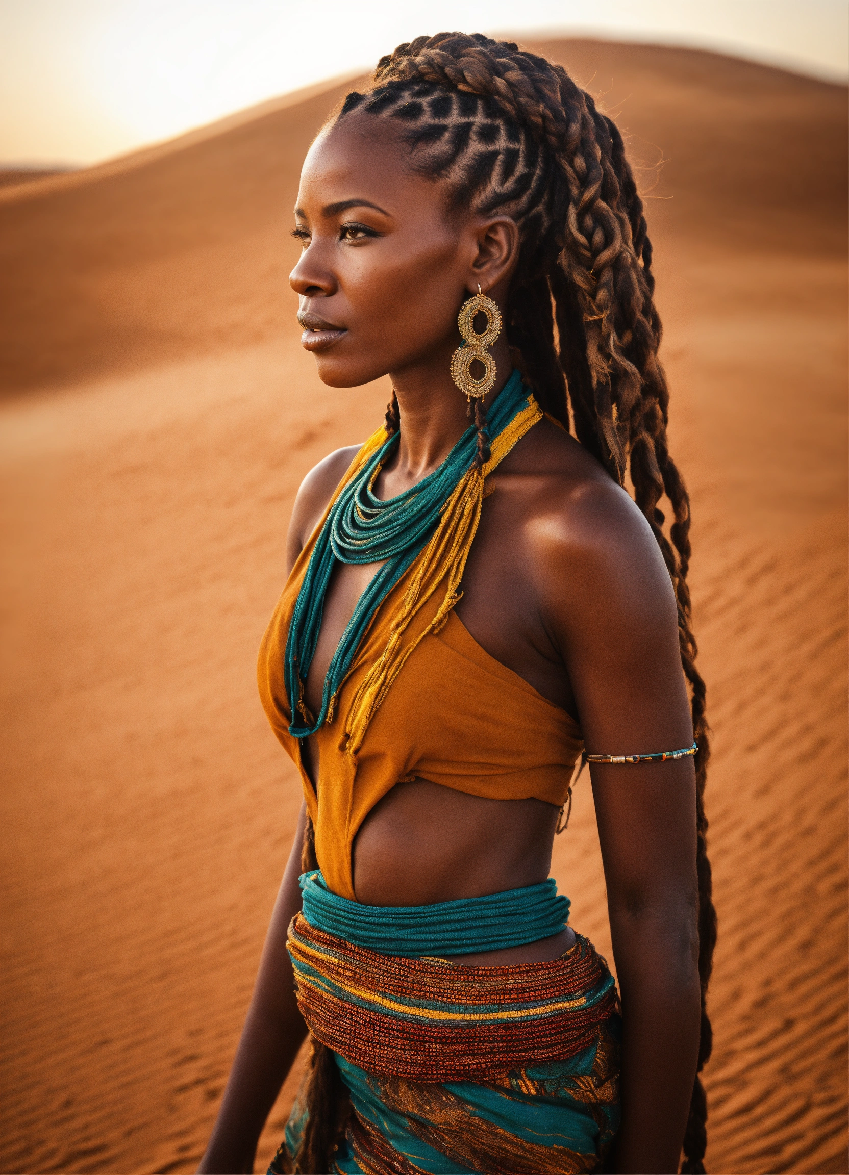 Breathtakingly stunning 40 year old african woman with intricate braids in her hair gloriously standing in the sahara desert looking powerful