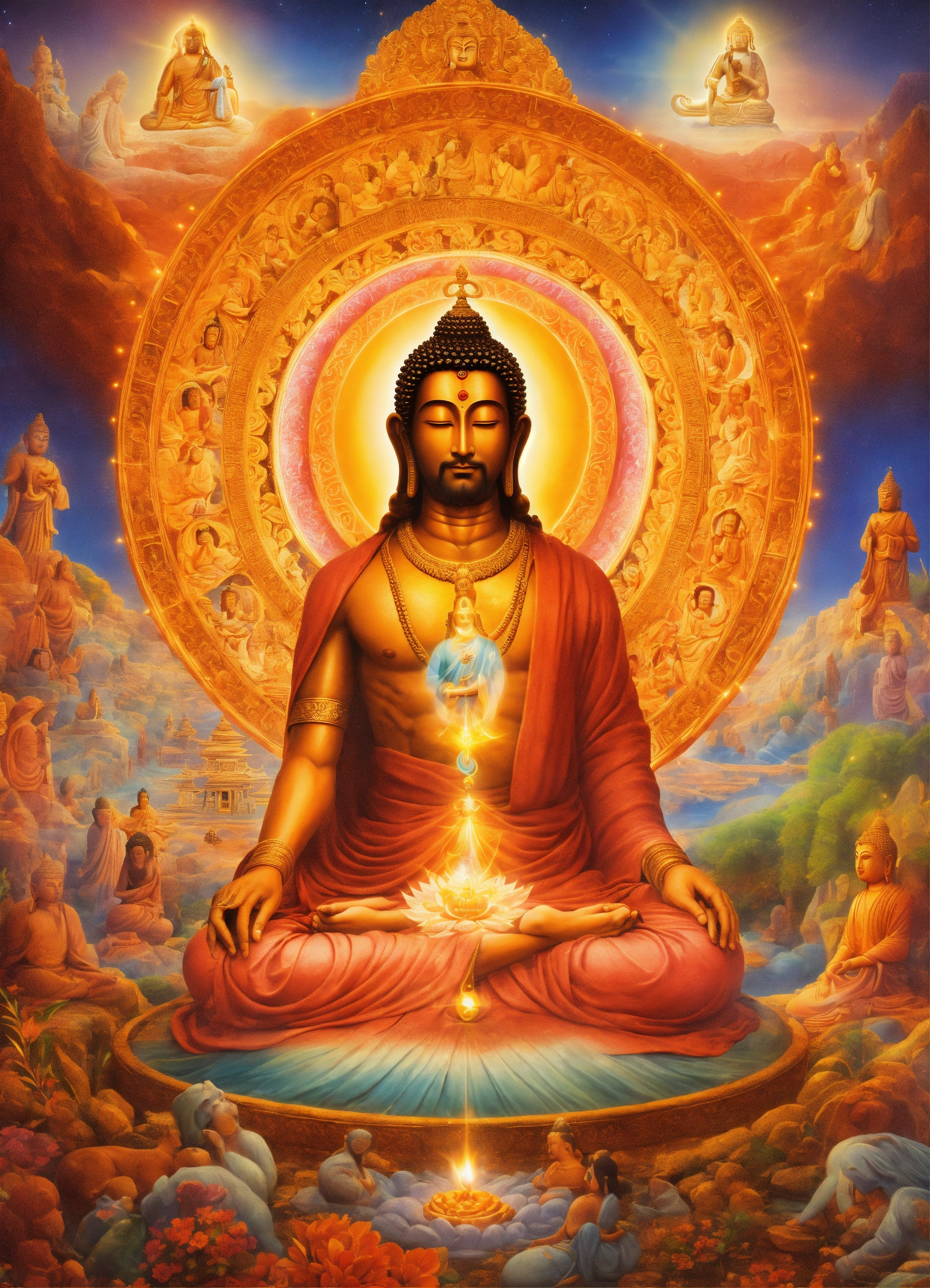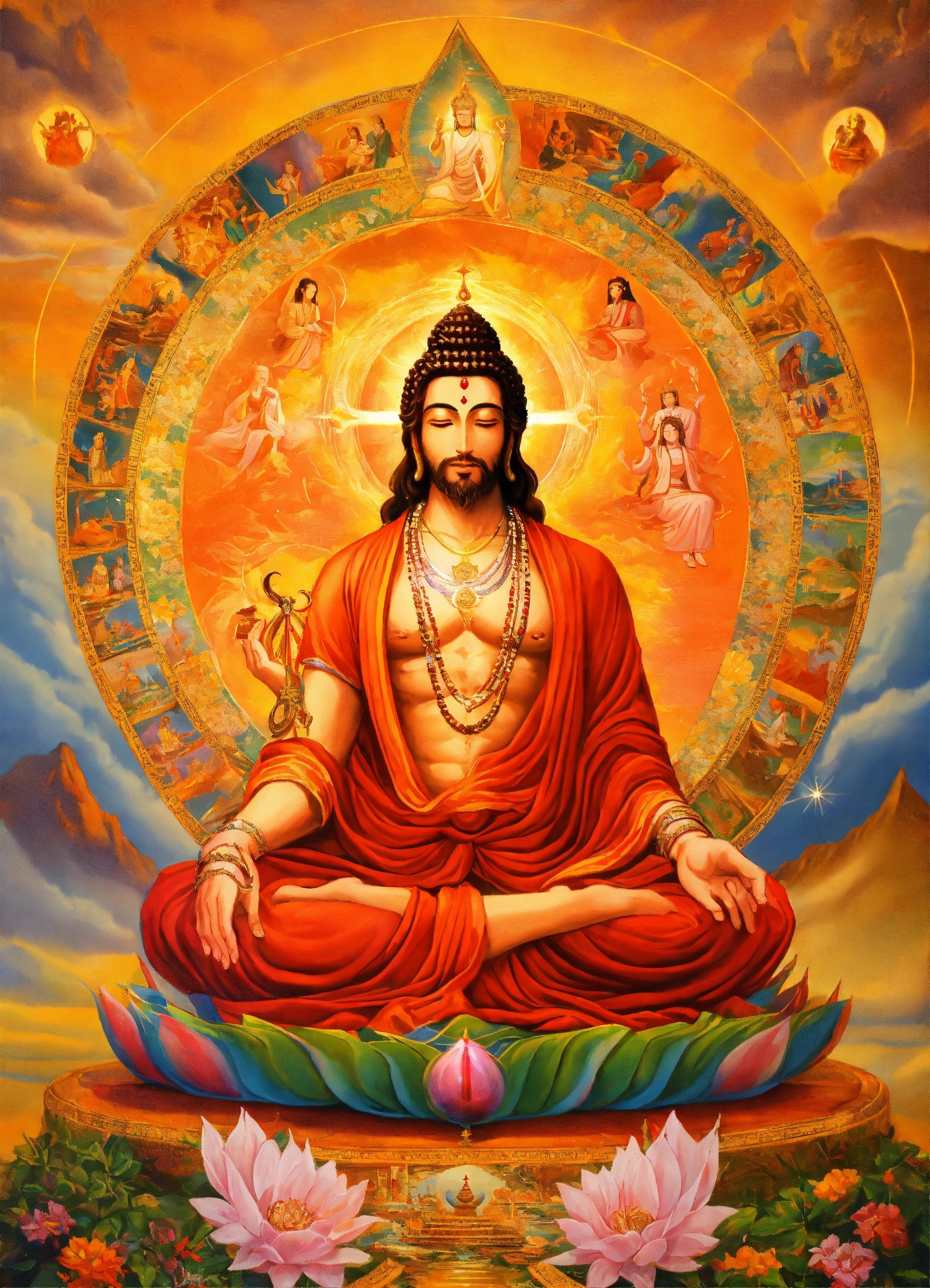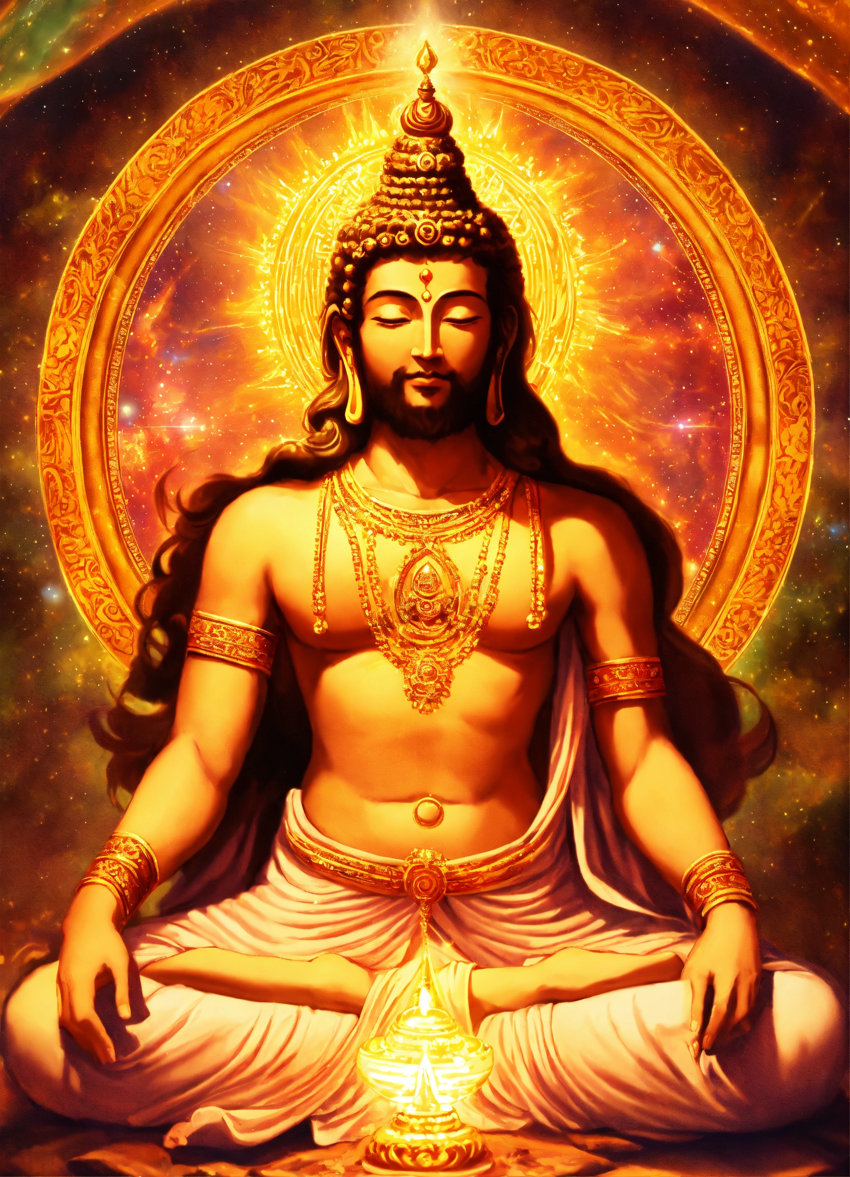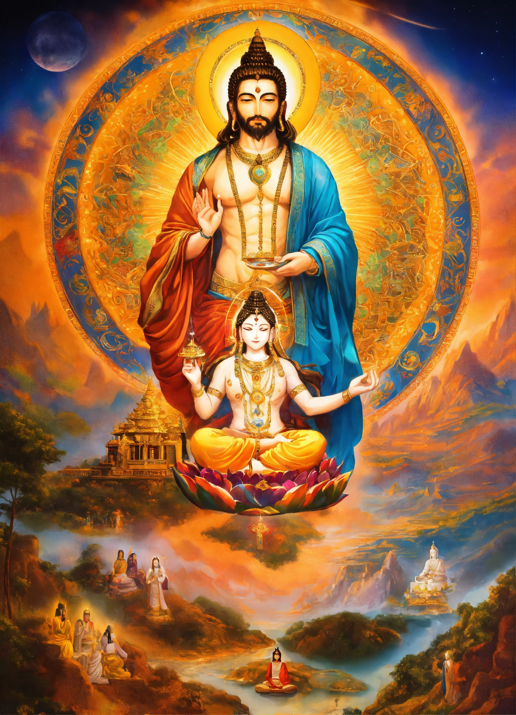 A combination of jesus, buddha, mohamed, shiva, shakti, illuminated god male and female tantra showring the path to unity of all living beings in the world and universe