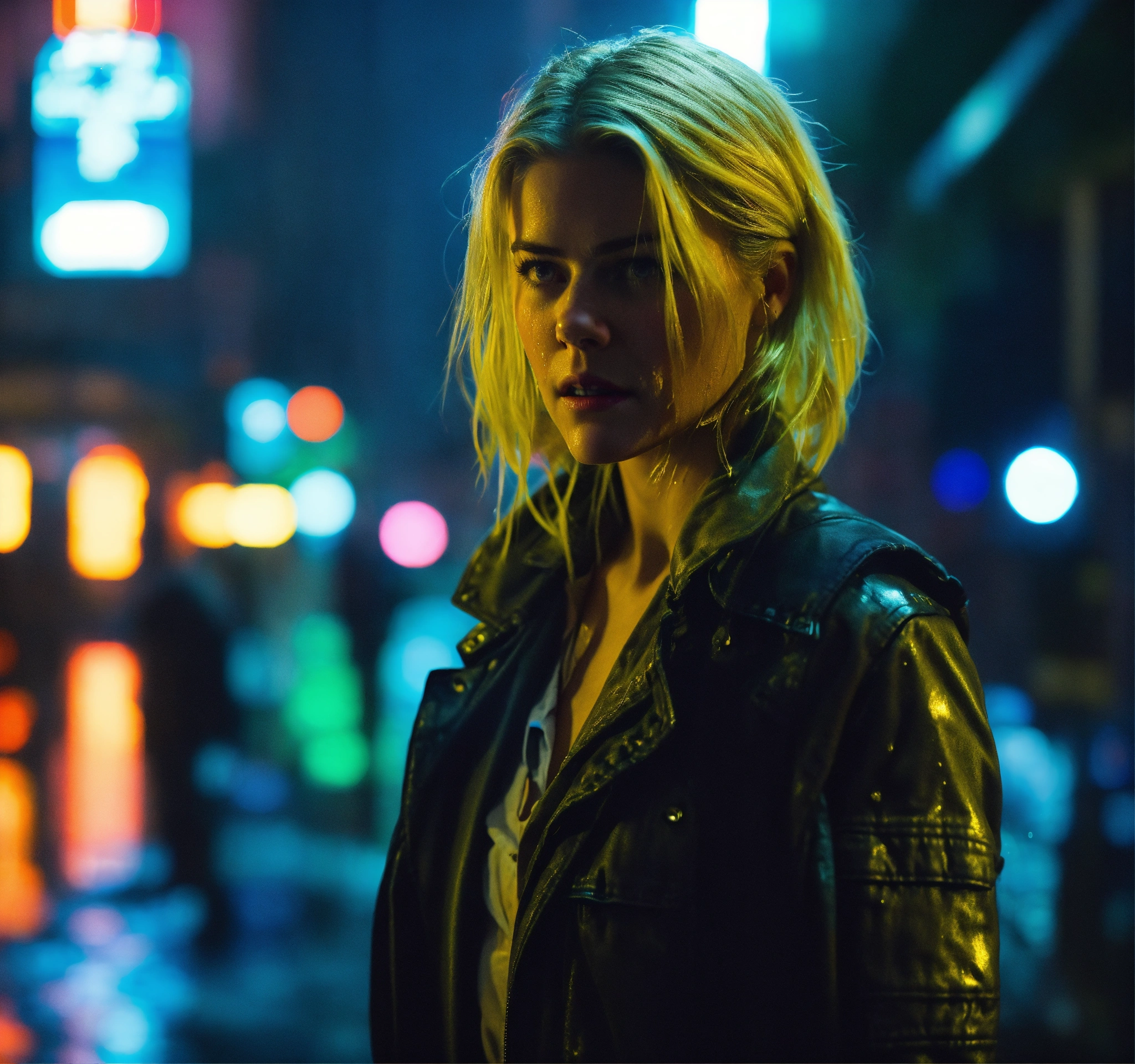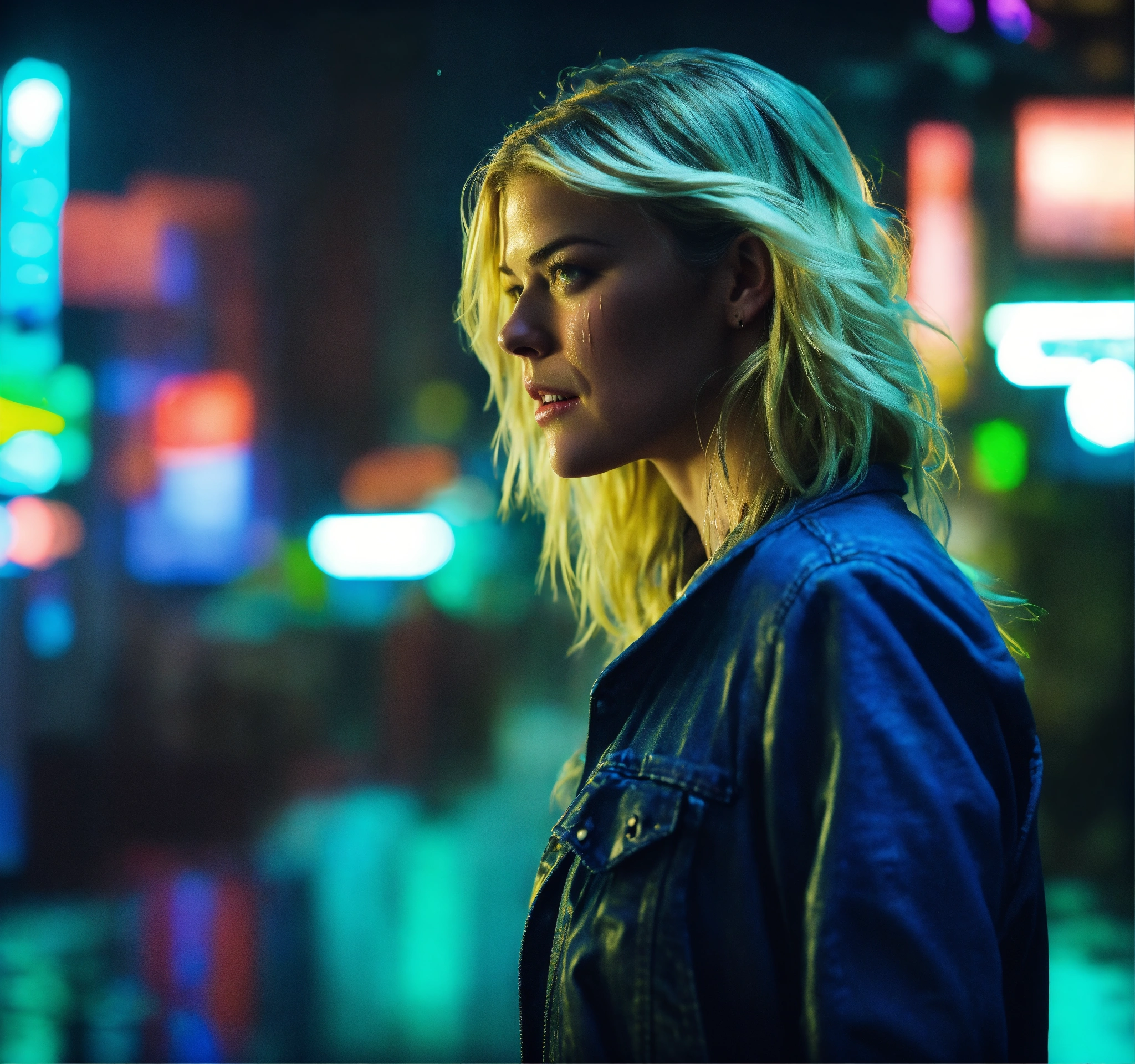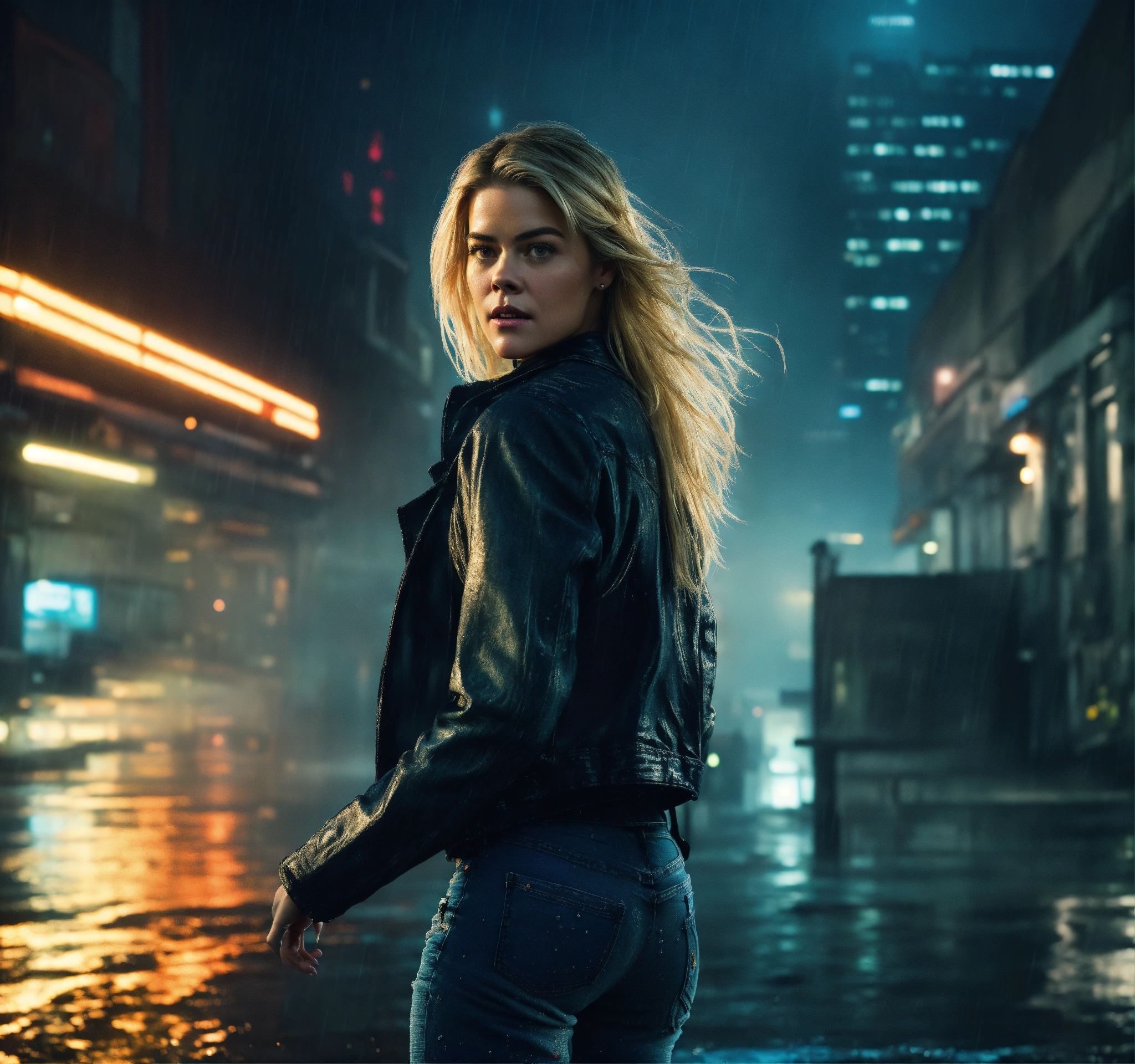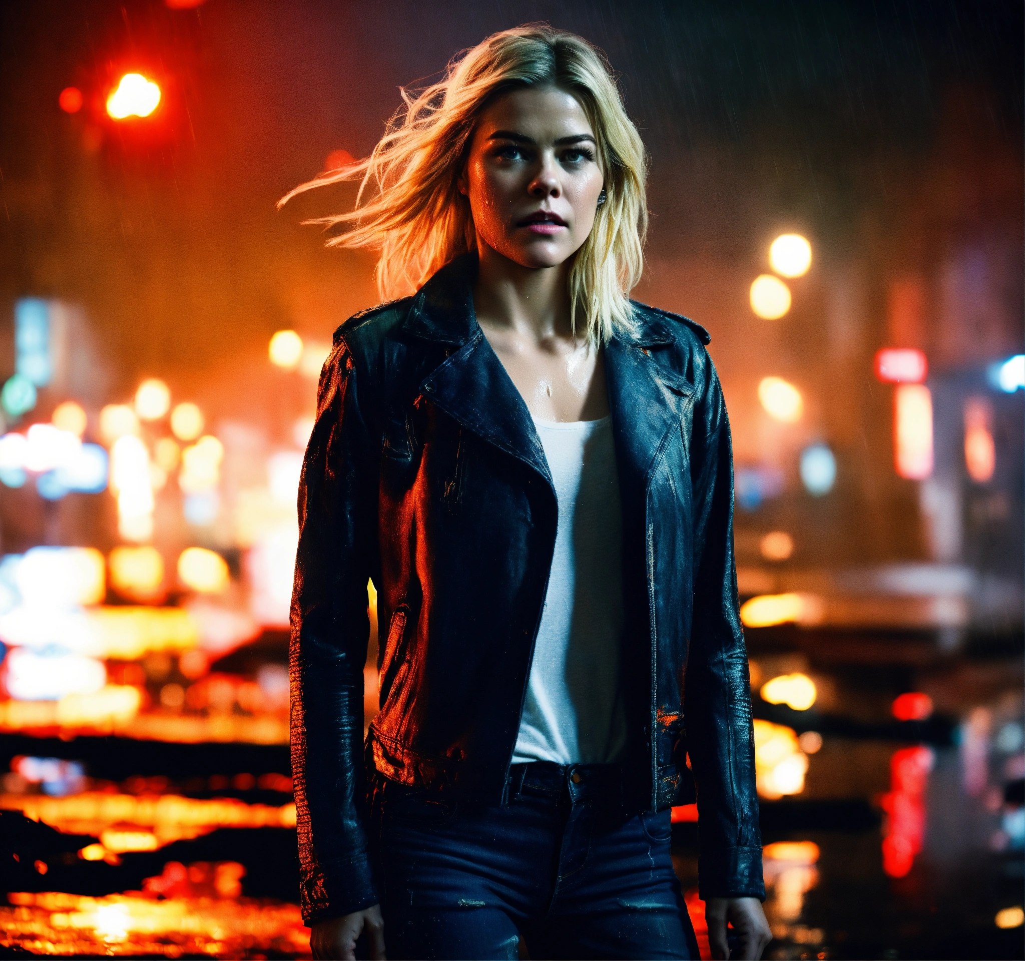 Beautiful blonde girl, rachael taylor long hair, altered carbon style, war, apocalypse, dark, walk, city, white, light, neon, cinematic, epic, detailed, wet, water, jeans, zombie