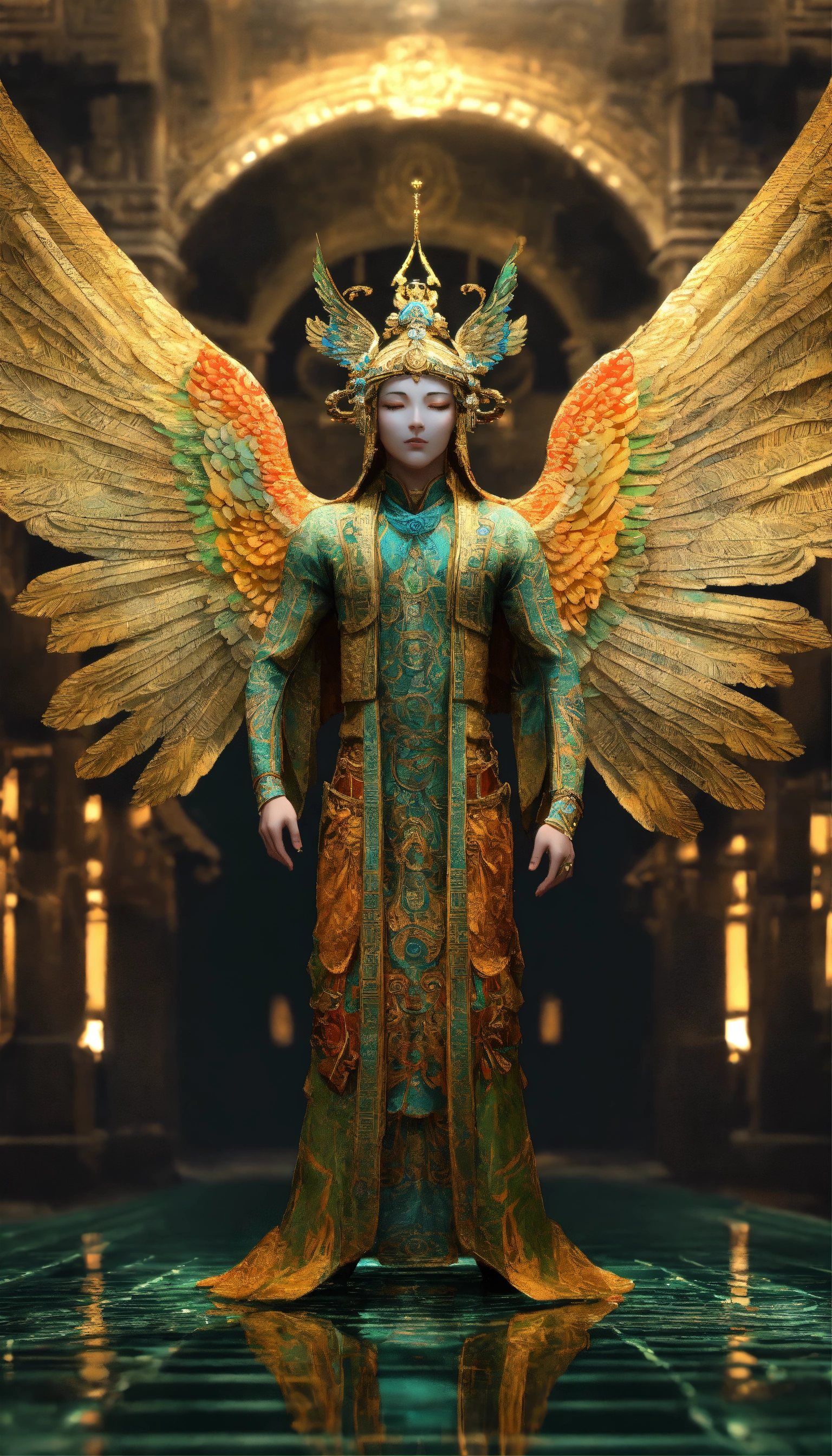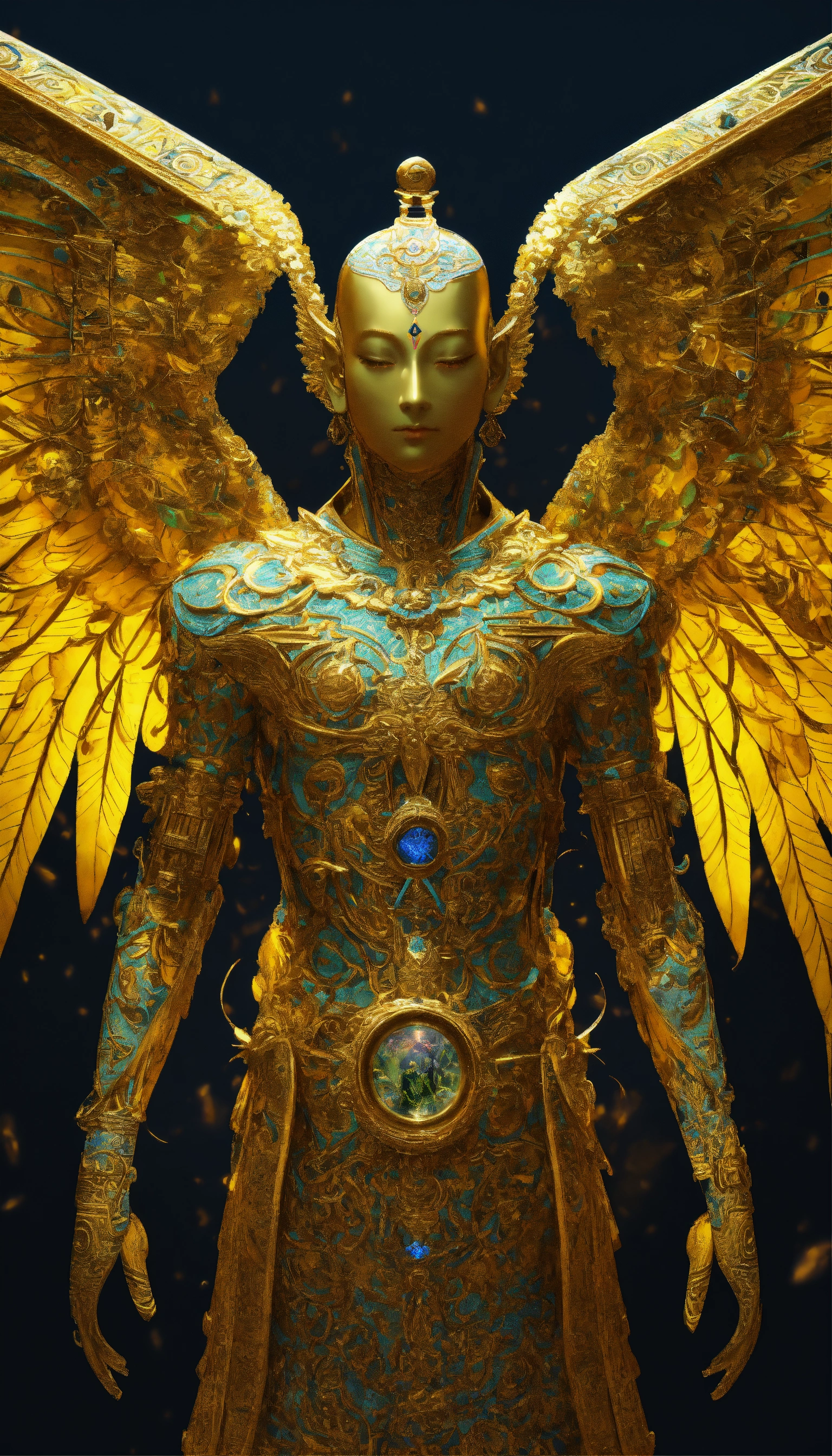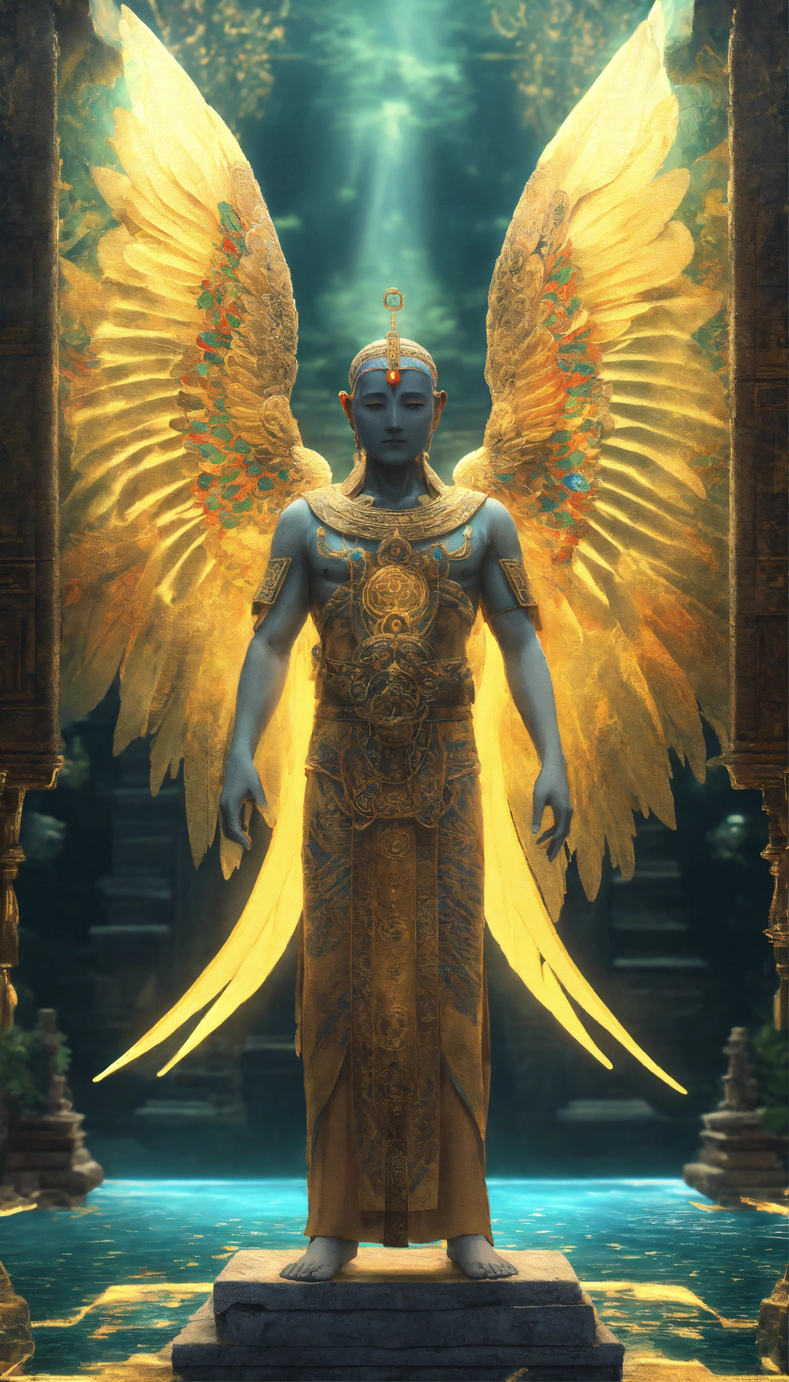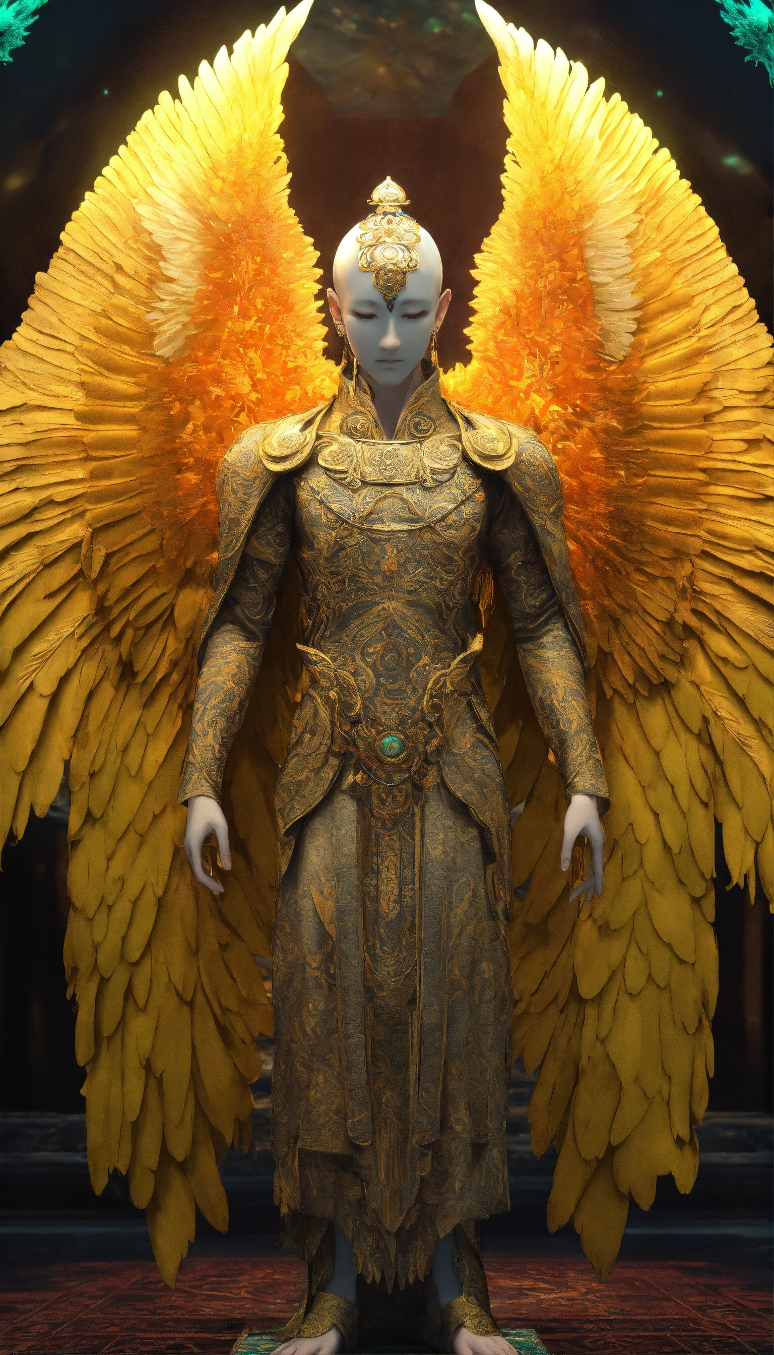 Monk with detailed and complete angel wings, taoist monk tesseract body fractal three point perspective hypercube mirror face zen brain mayan mantis mystical face underwater, has very detailed angel wings, defined face, clear eyes open with penetrating and deep look, high quality and resolution, 8k, hd