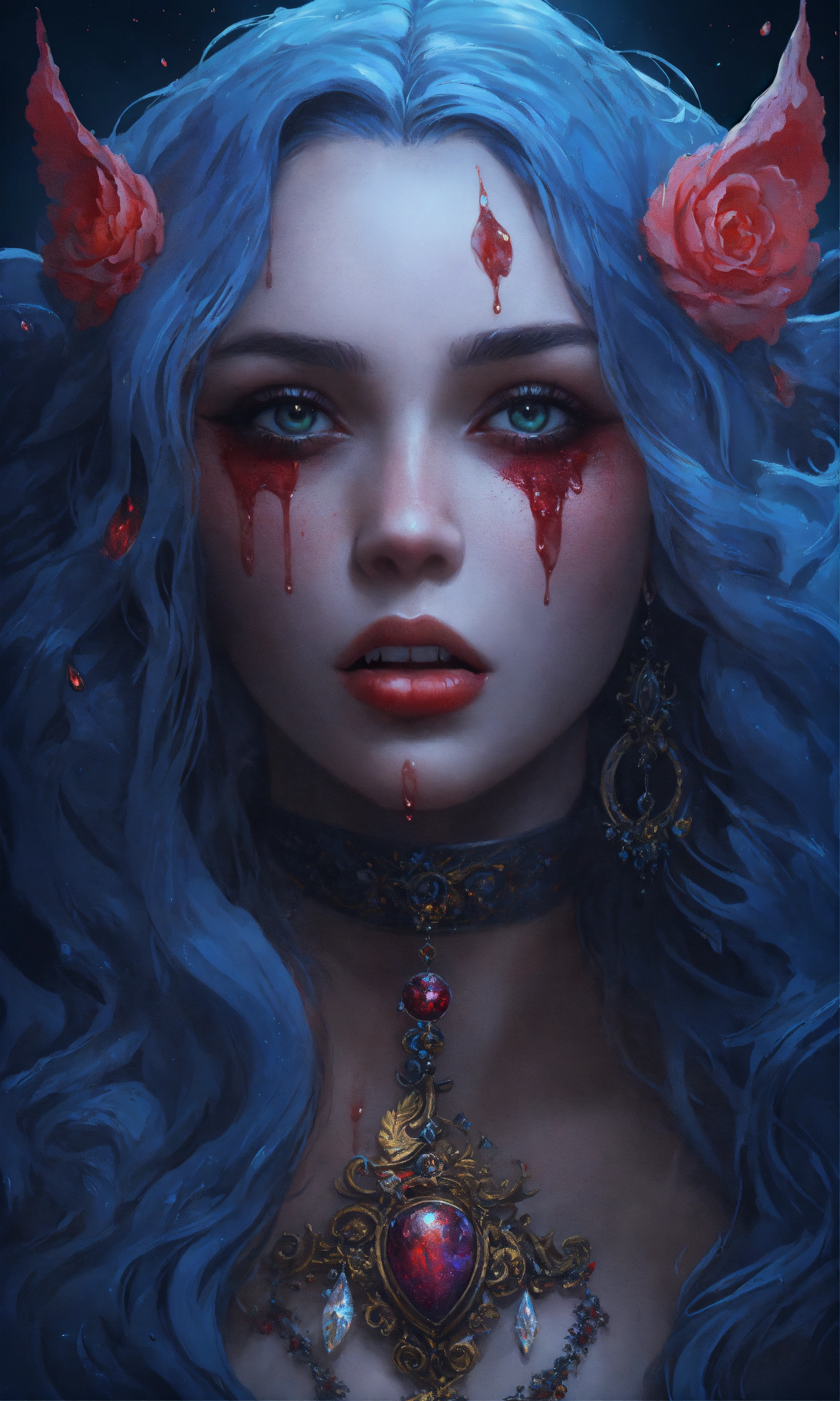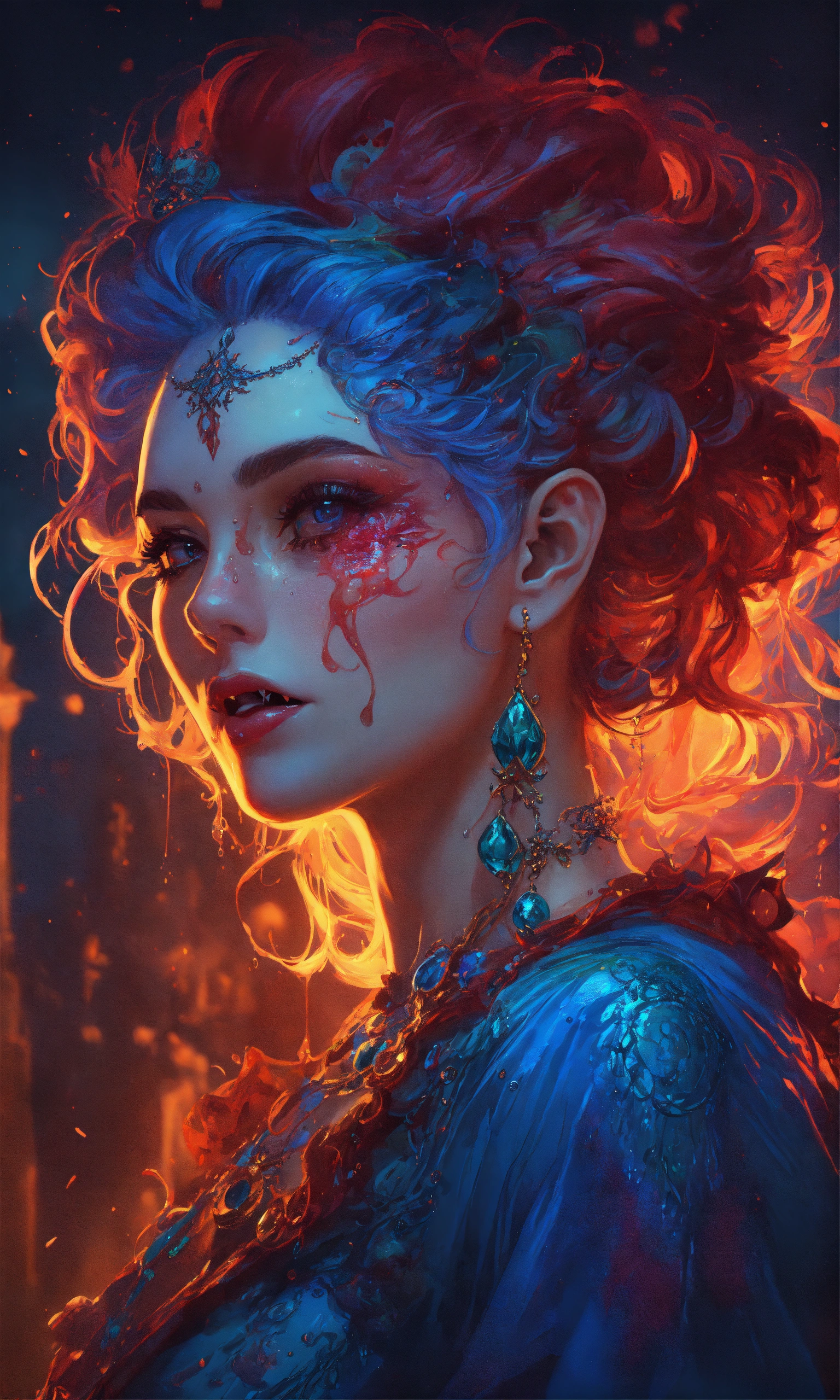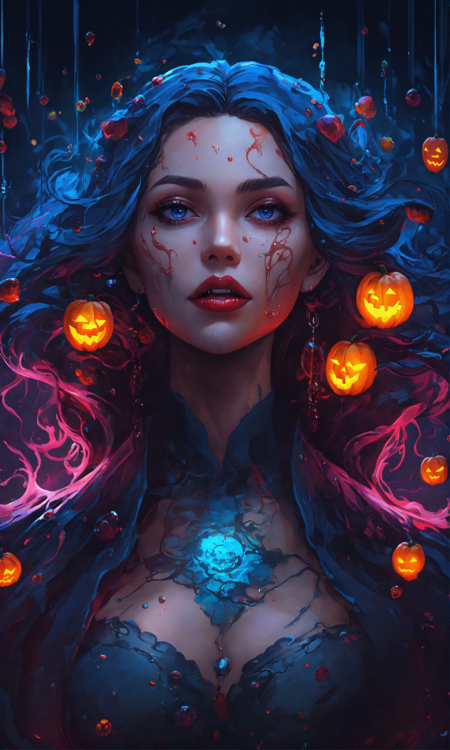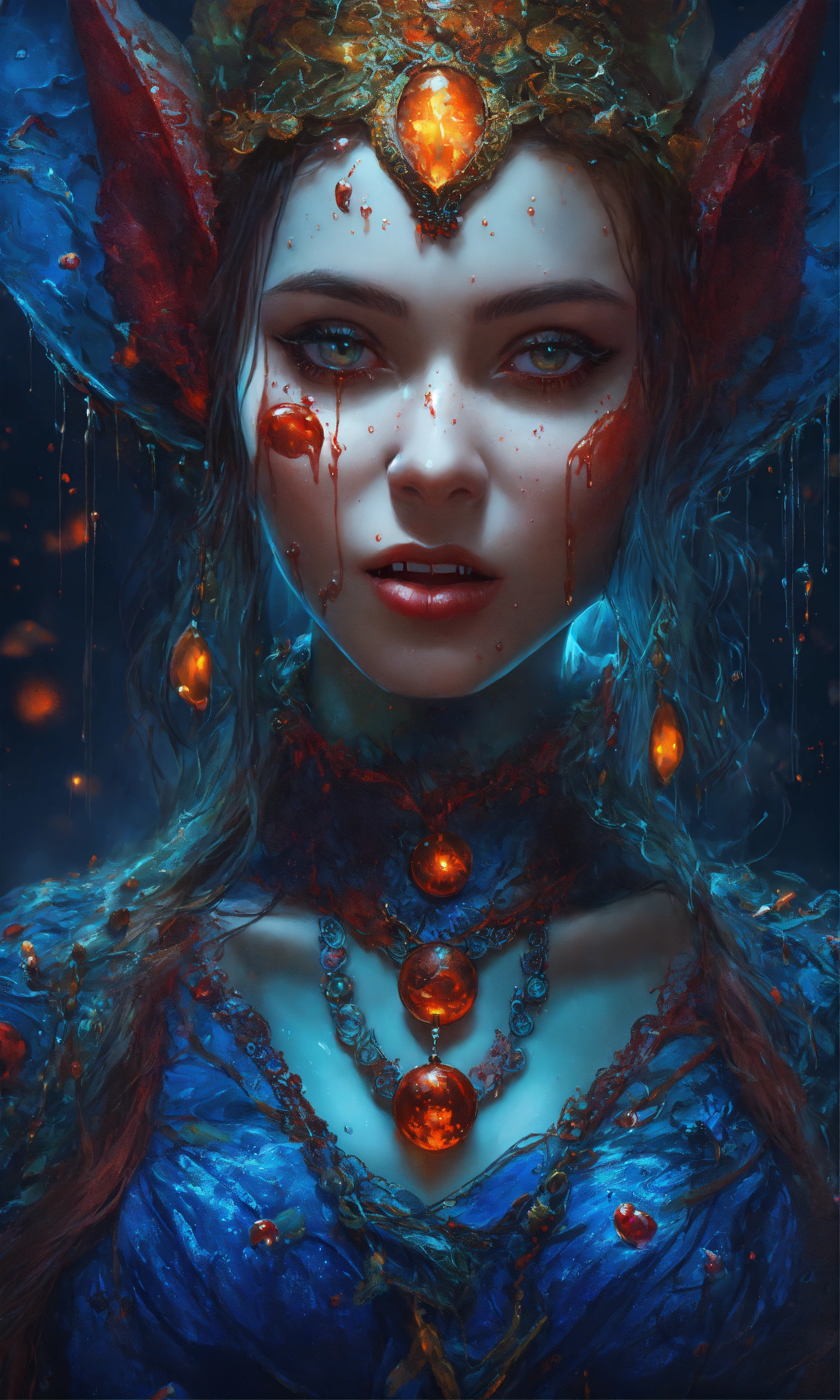 Splash art, a quirky liquid portrait of a hauntingly beautiful vampire woman with fangs, splash style of paint, pixar style, halloween colors, hyper detailed intricately detailed, fantastical, intricate detail, splash screen, liquid, gooey, slime, splashy, fantasy, concept art, 8k resolution, masterpiece, melting, complex background, intricate detailed, dark colors, fantasy, concept art, digital art, intricate, oil on canvas, masterpiece, expert, insanely detailed, 8k resolution. full blue moon background at night