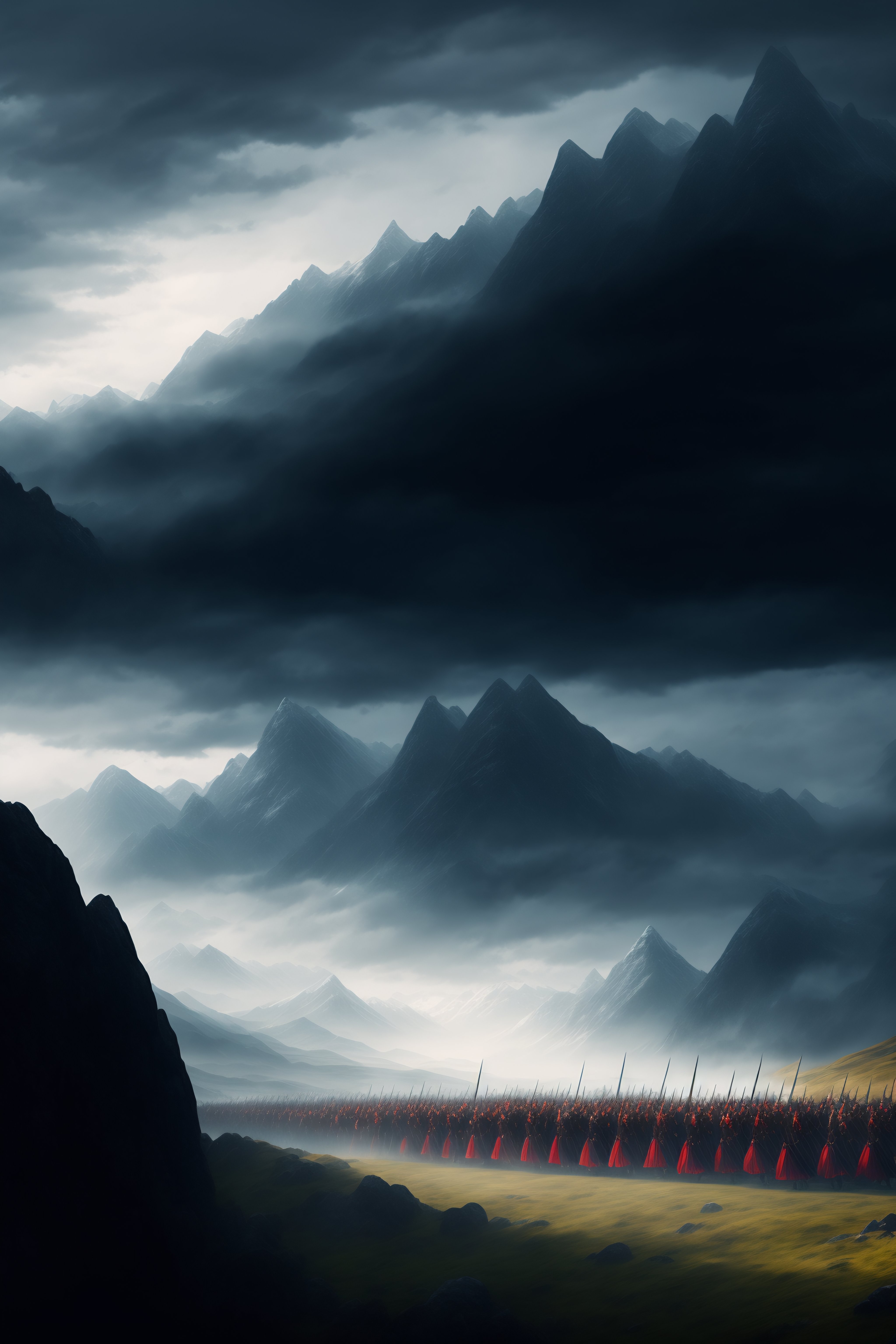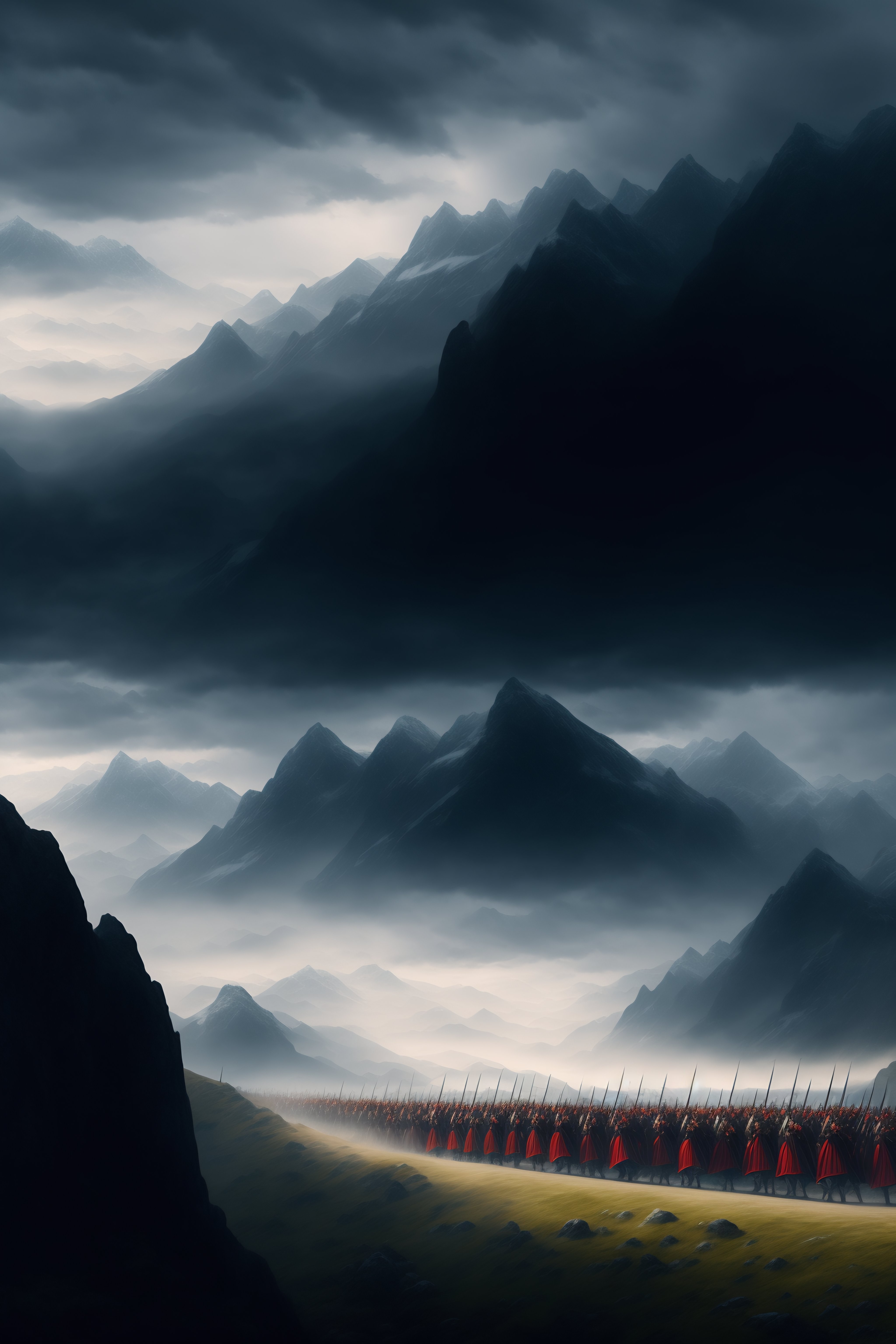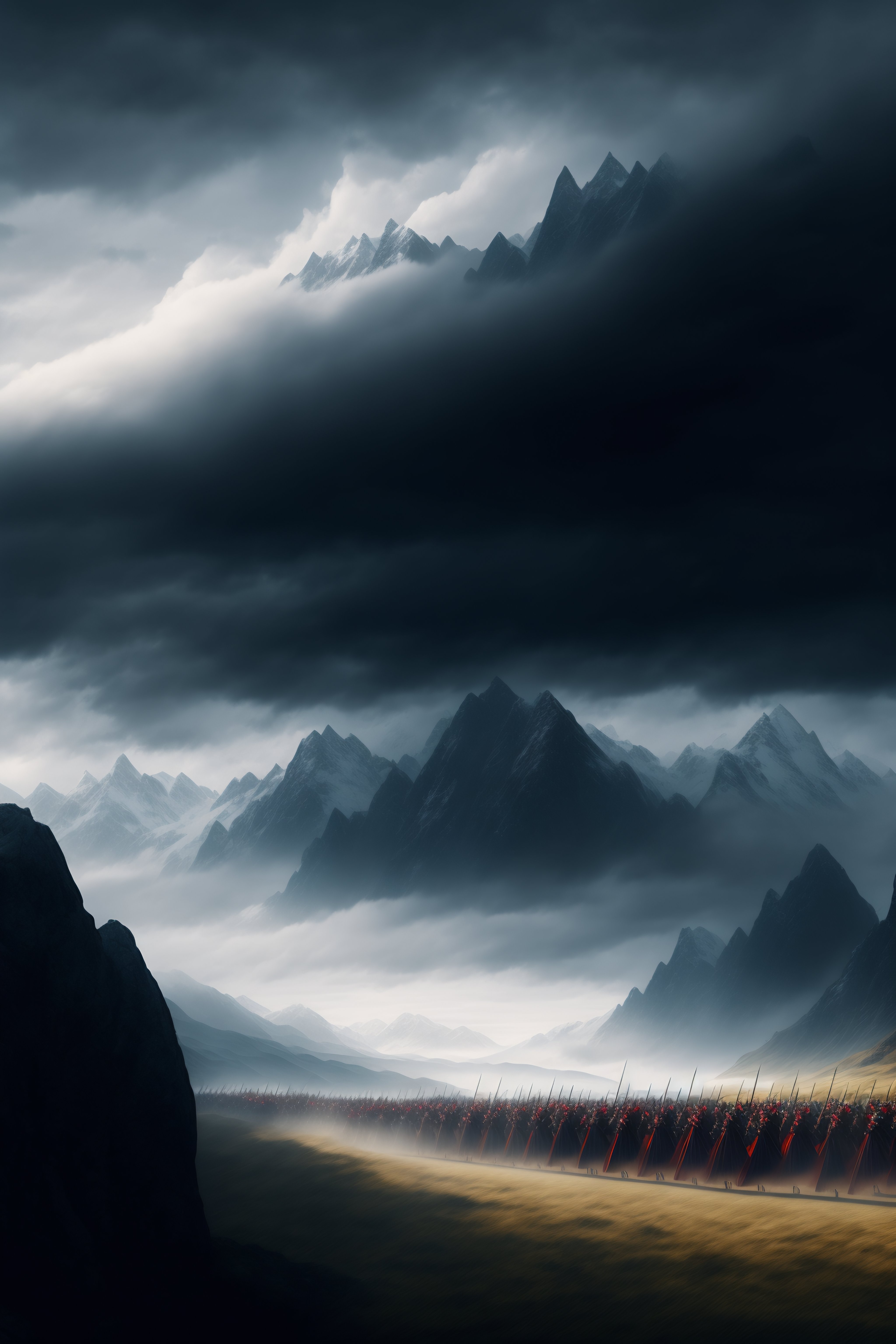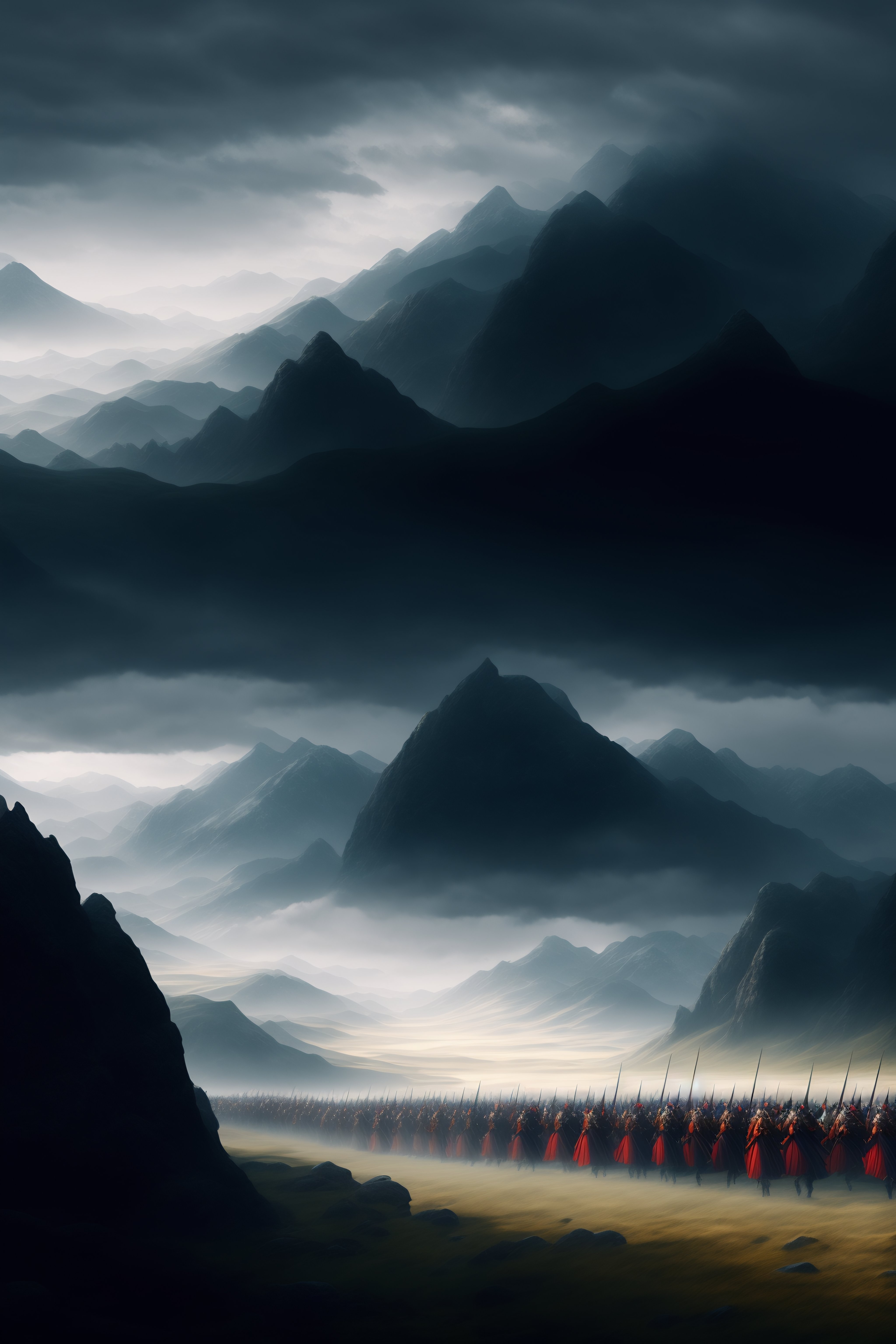 Distant mountains with dark clouds looming overhead and a medieval army marching toward them in fantasy art style