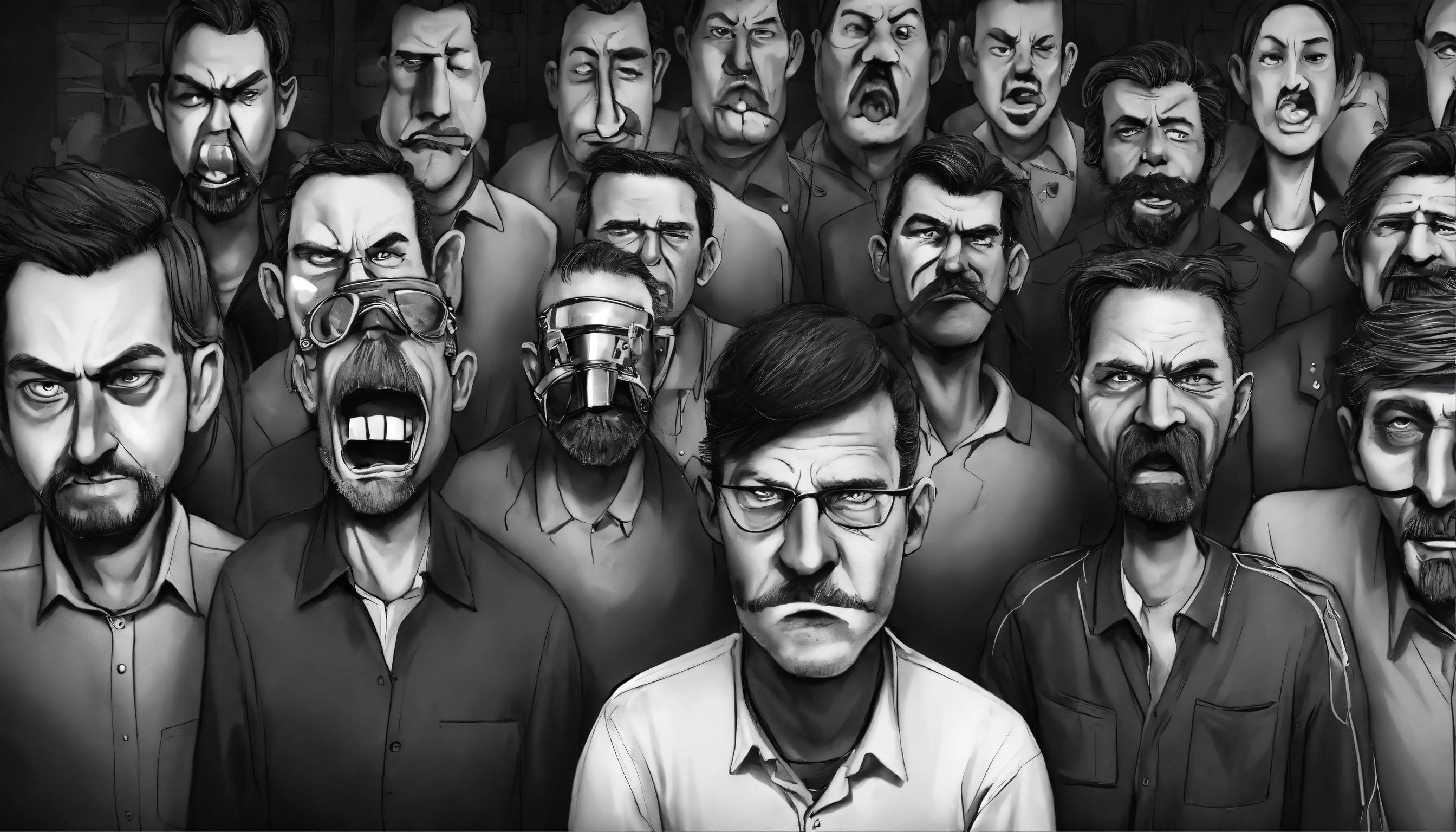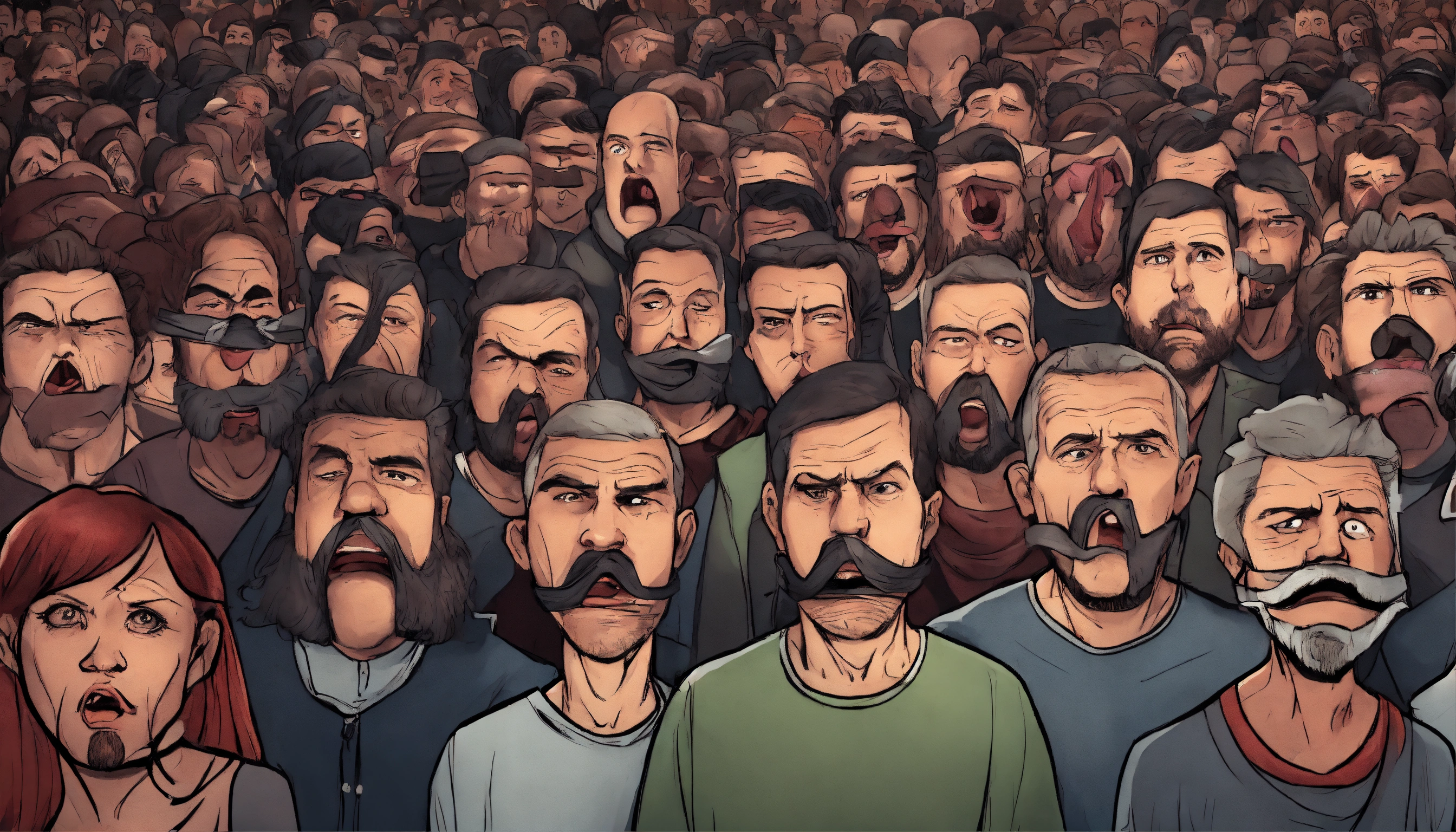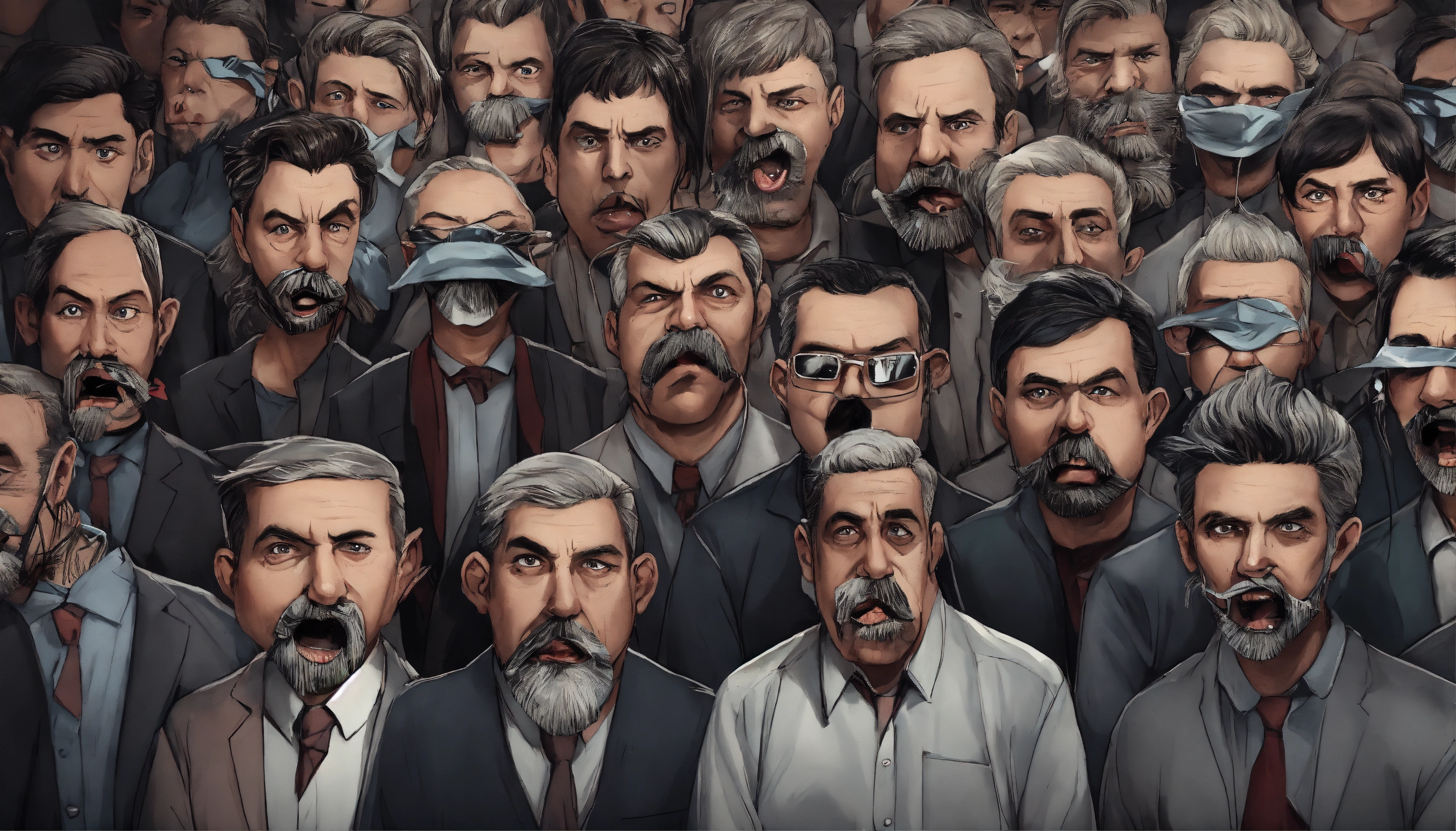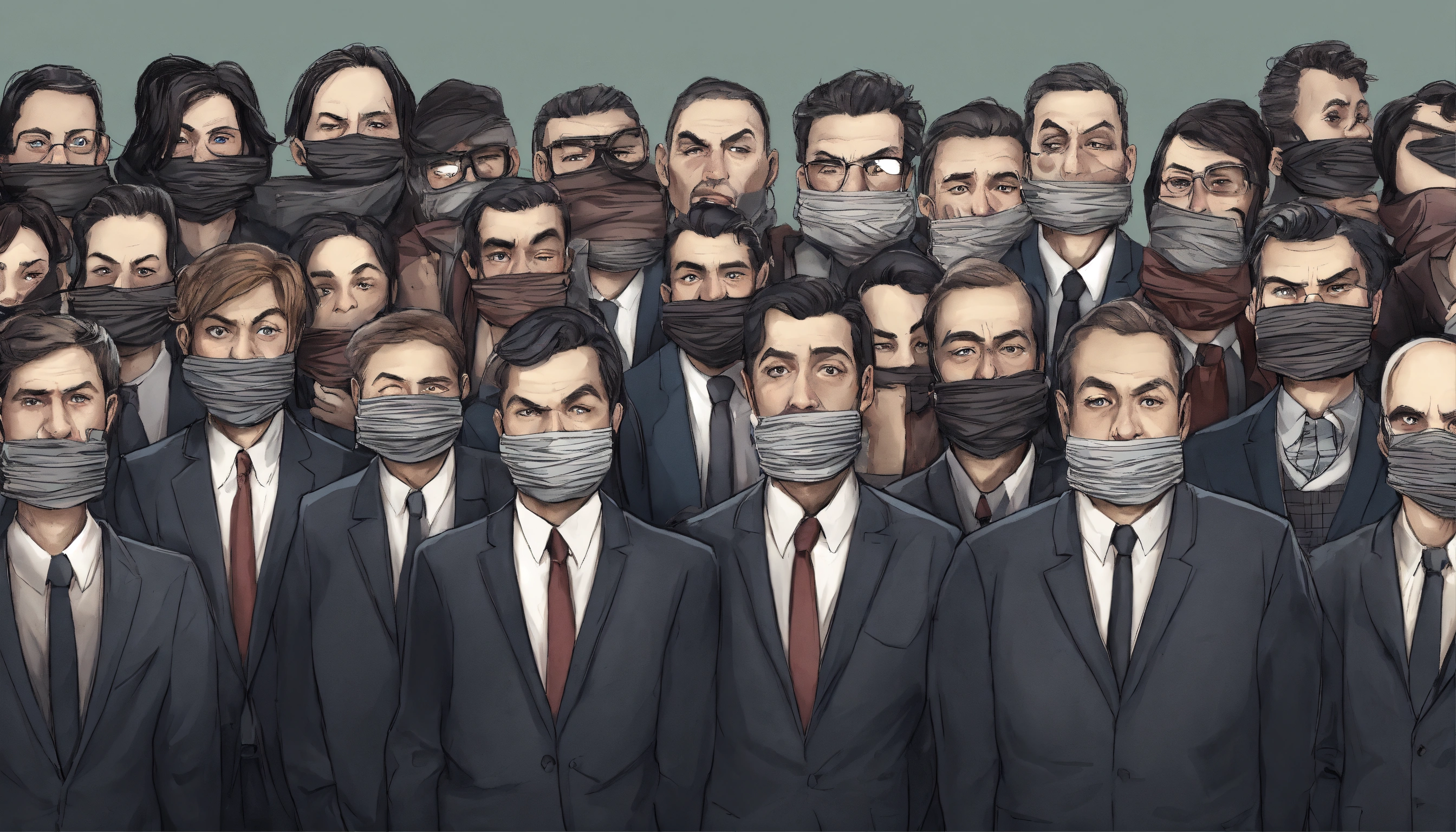 A bunch of people with their mouths duct taped shut, ominous and eery, censored people, caricature dark mood cartoon, extremely creative and unique, highly detailed and realistic