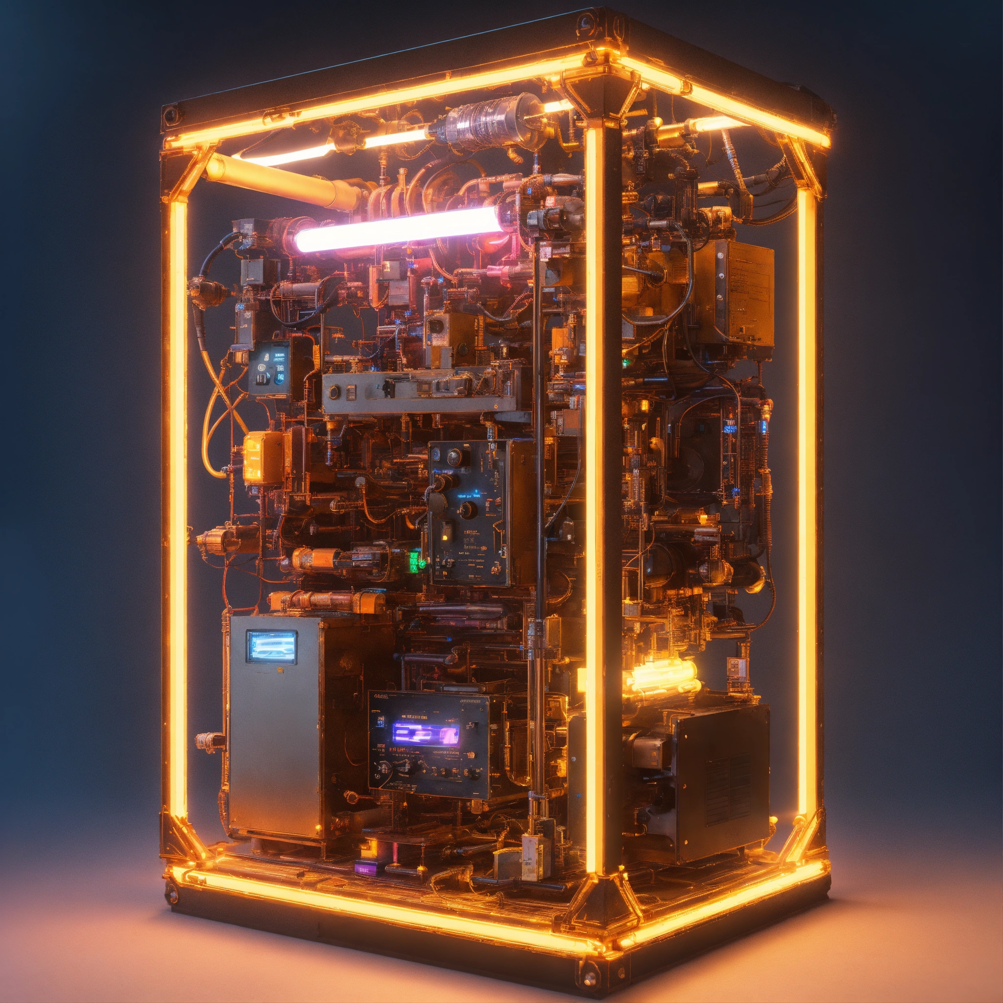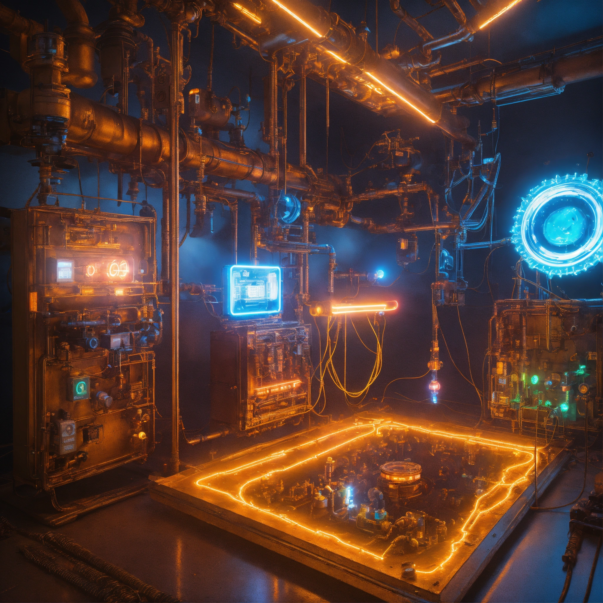 Industrial tech, costumes and props, knolling, knolling layout, deconstruction, reflective, super detailed, bioluminescence, plasma, neon, brimming with energy, electricity, power, sci-fi steampunk, highly detailed, depth, blender, lumen render, 8k