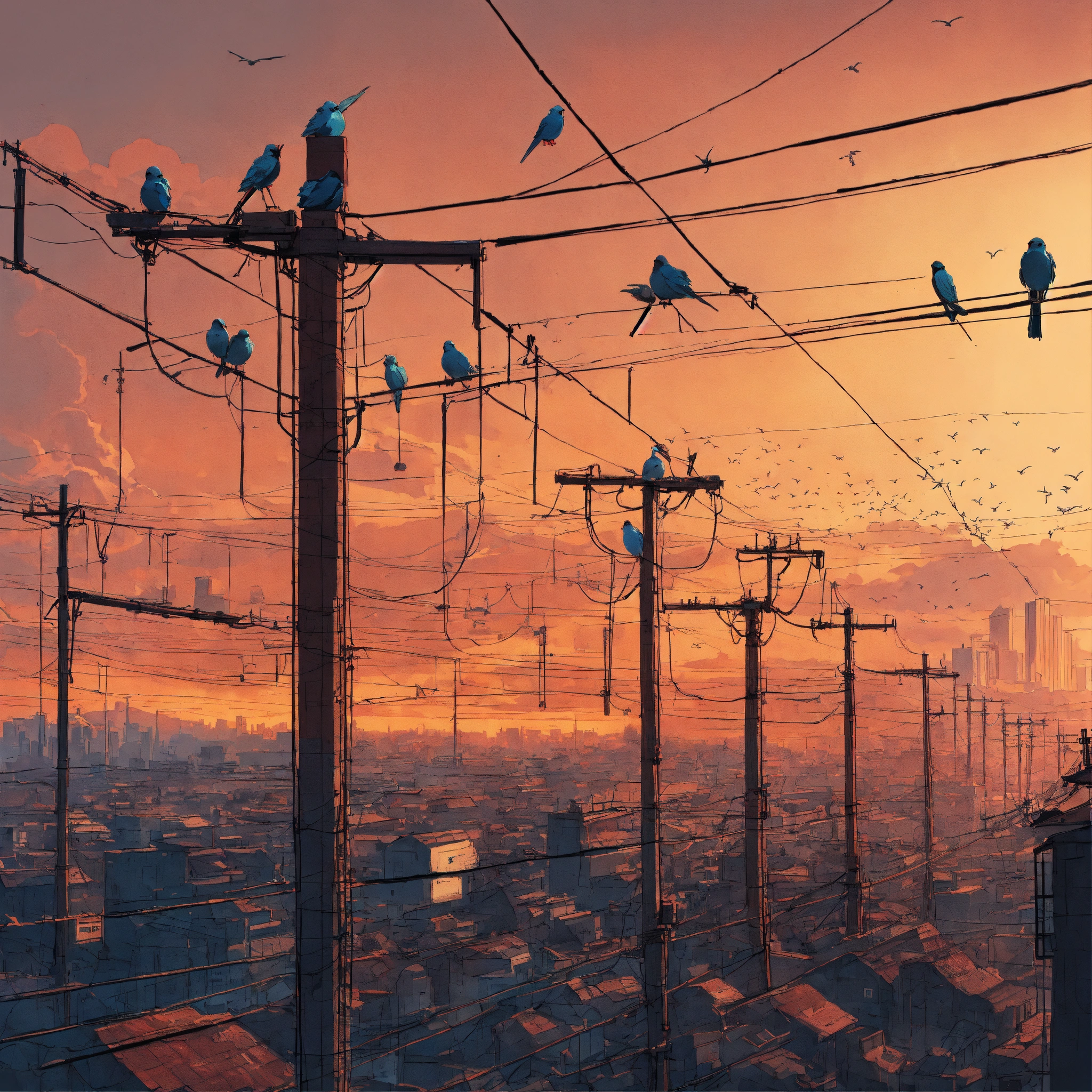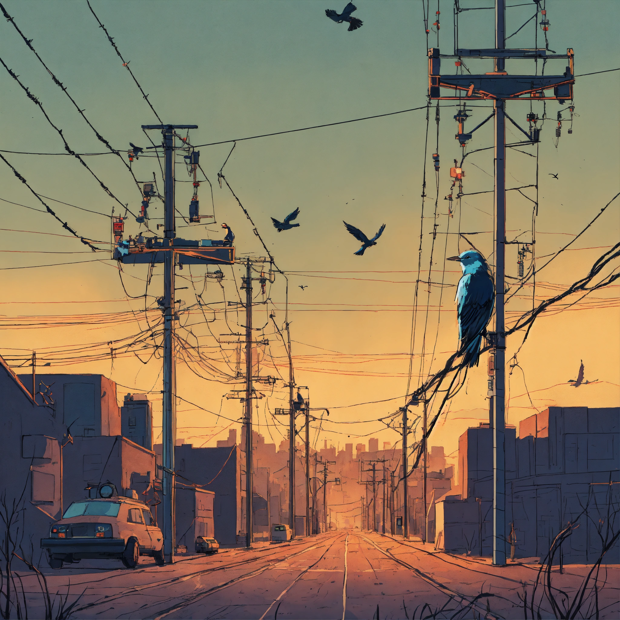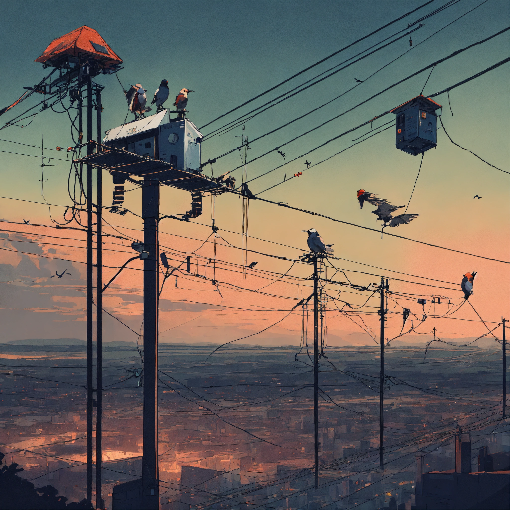 Illustrate a poster featuring robotic birds perched on power lines over a desolate cityscape