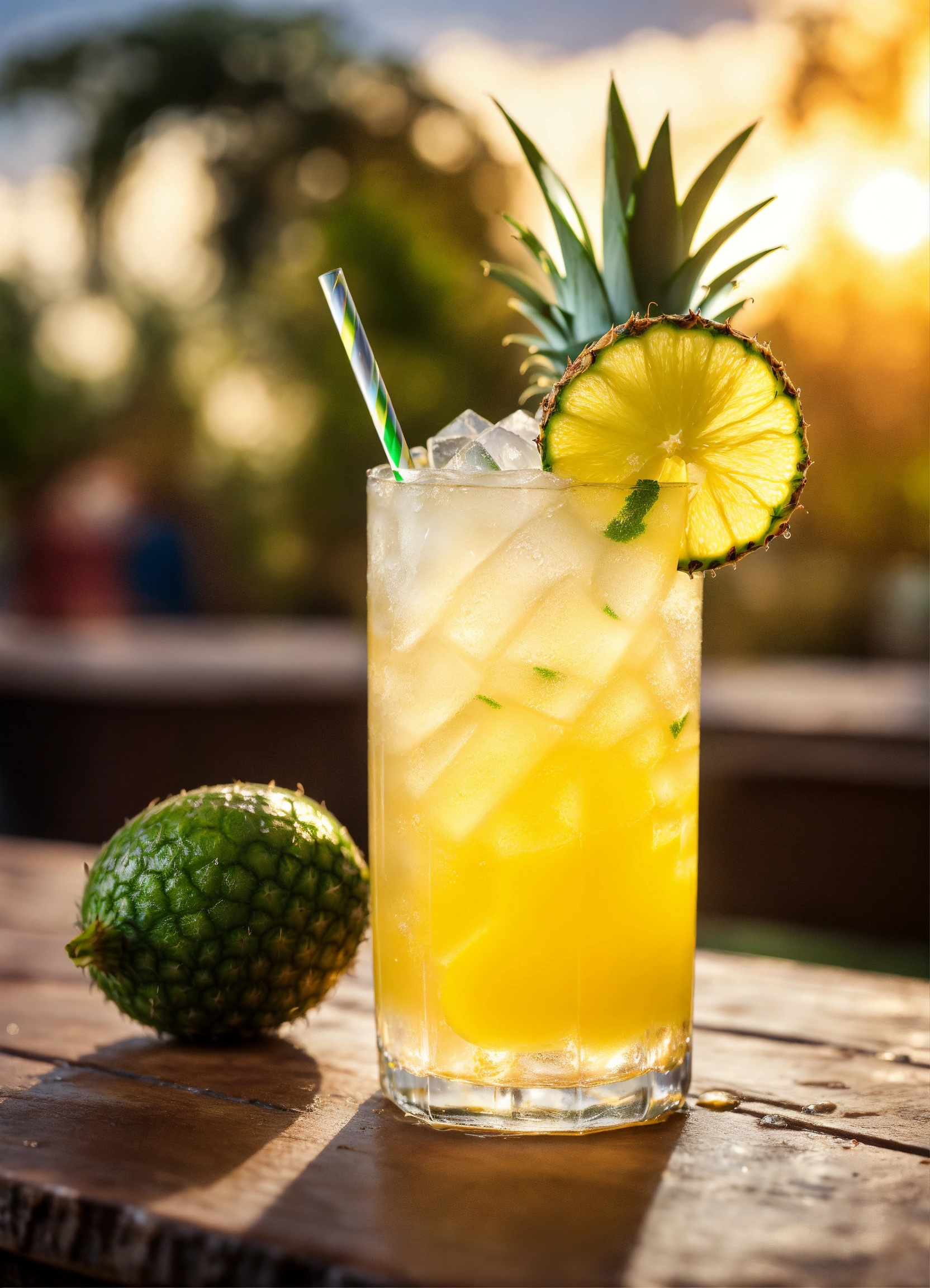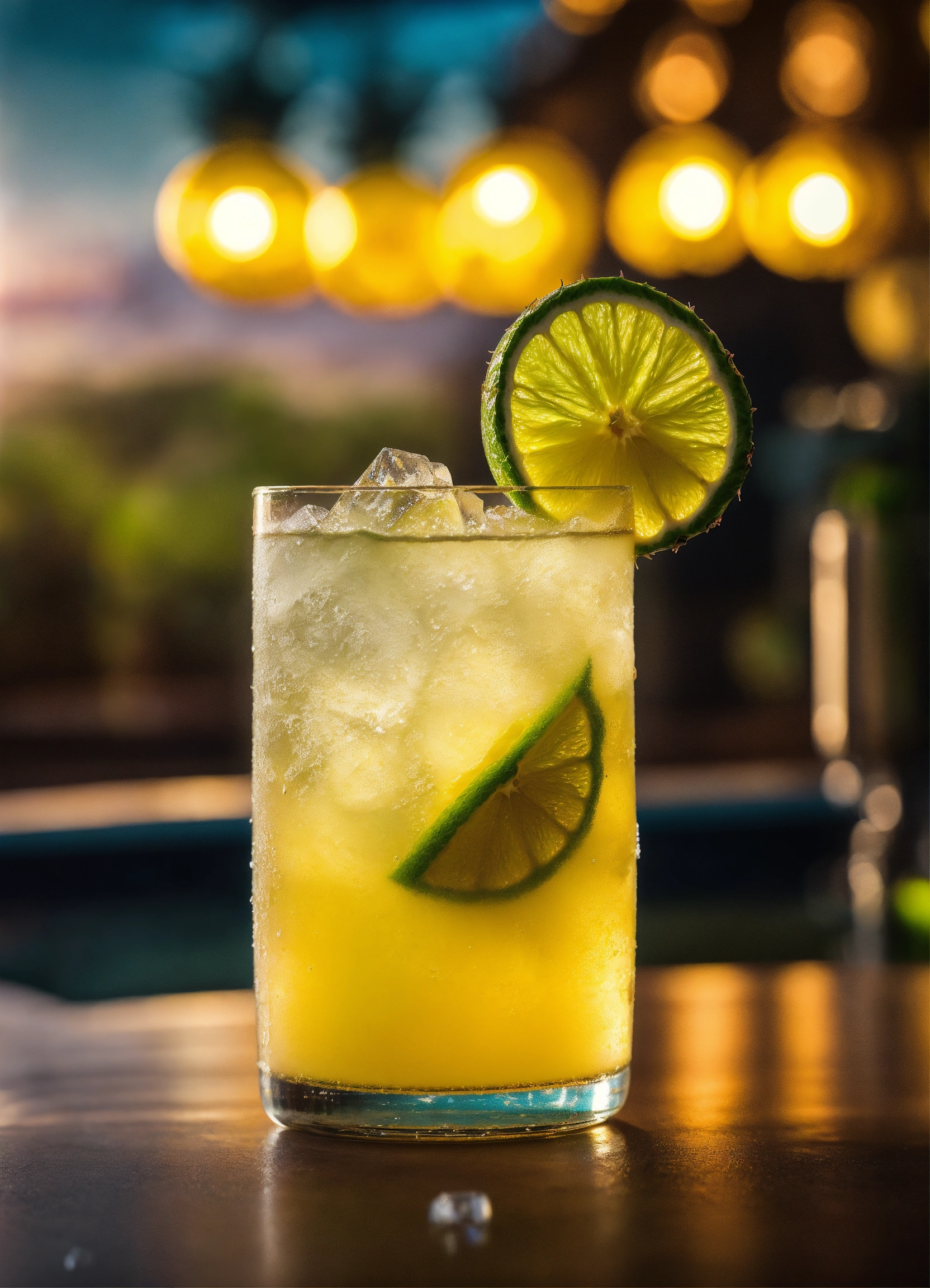 Pineapple and lime lemonade, with ice cubes in the glass, amazing photo, very realistic, elegant and tasty, photography, condensation, f2.8, 50mm lens, intricately detailed, 8k, cinematic production, highly detailed, highly realistic, sunny colombia in the background
