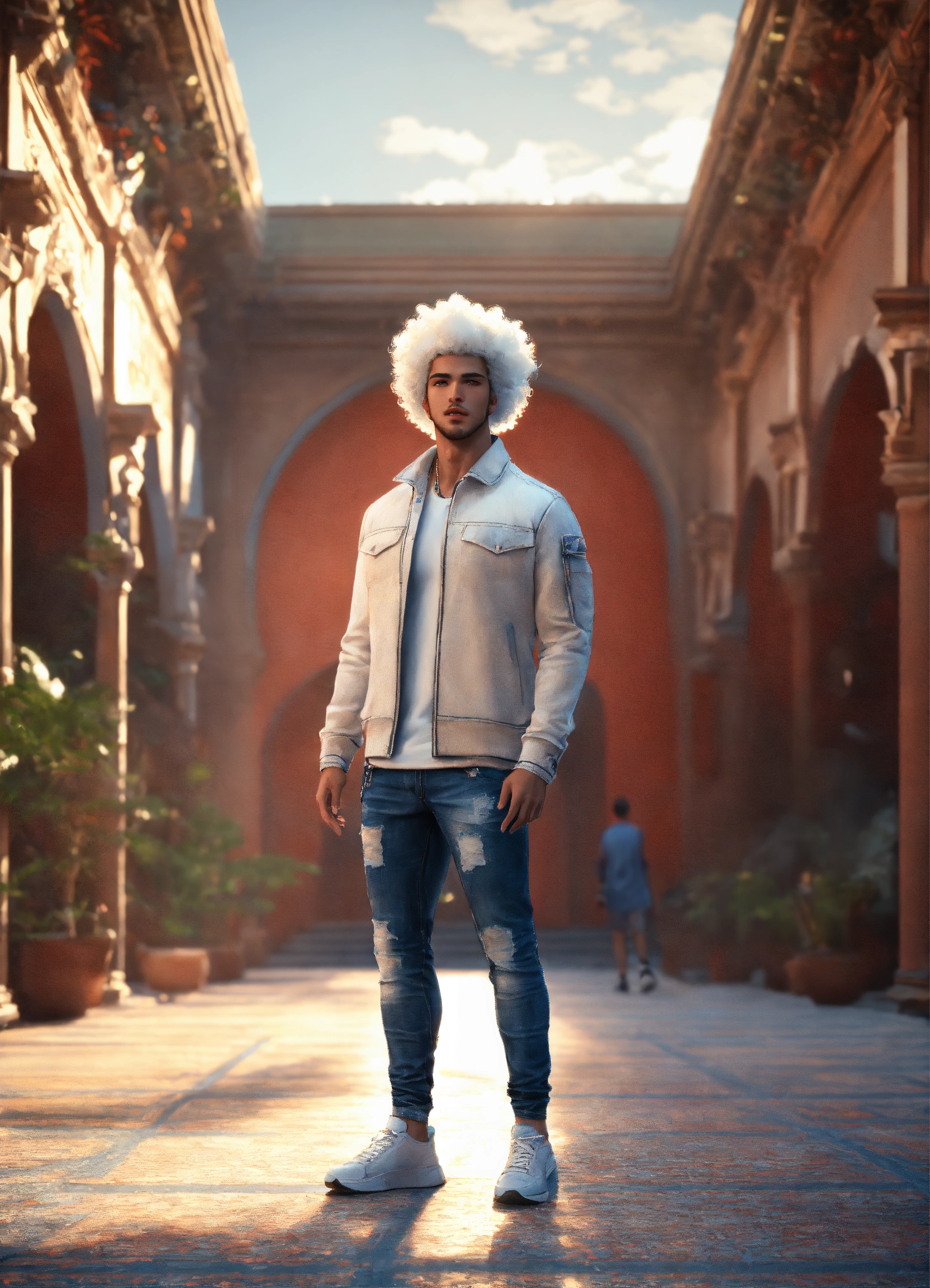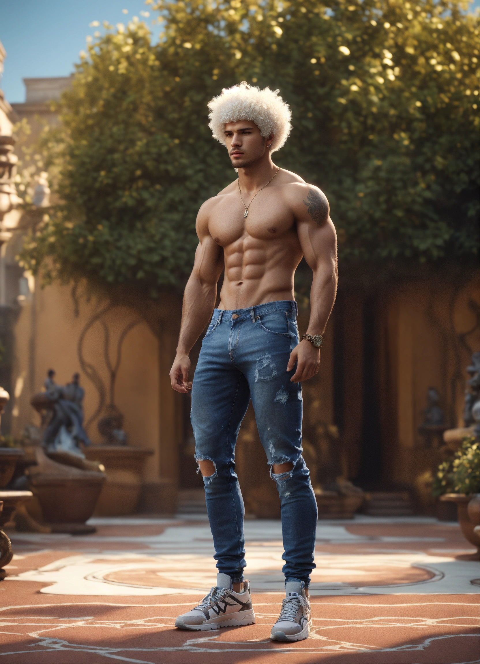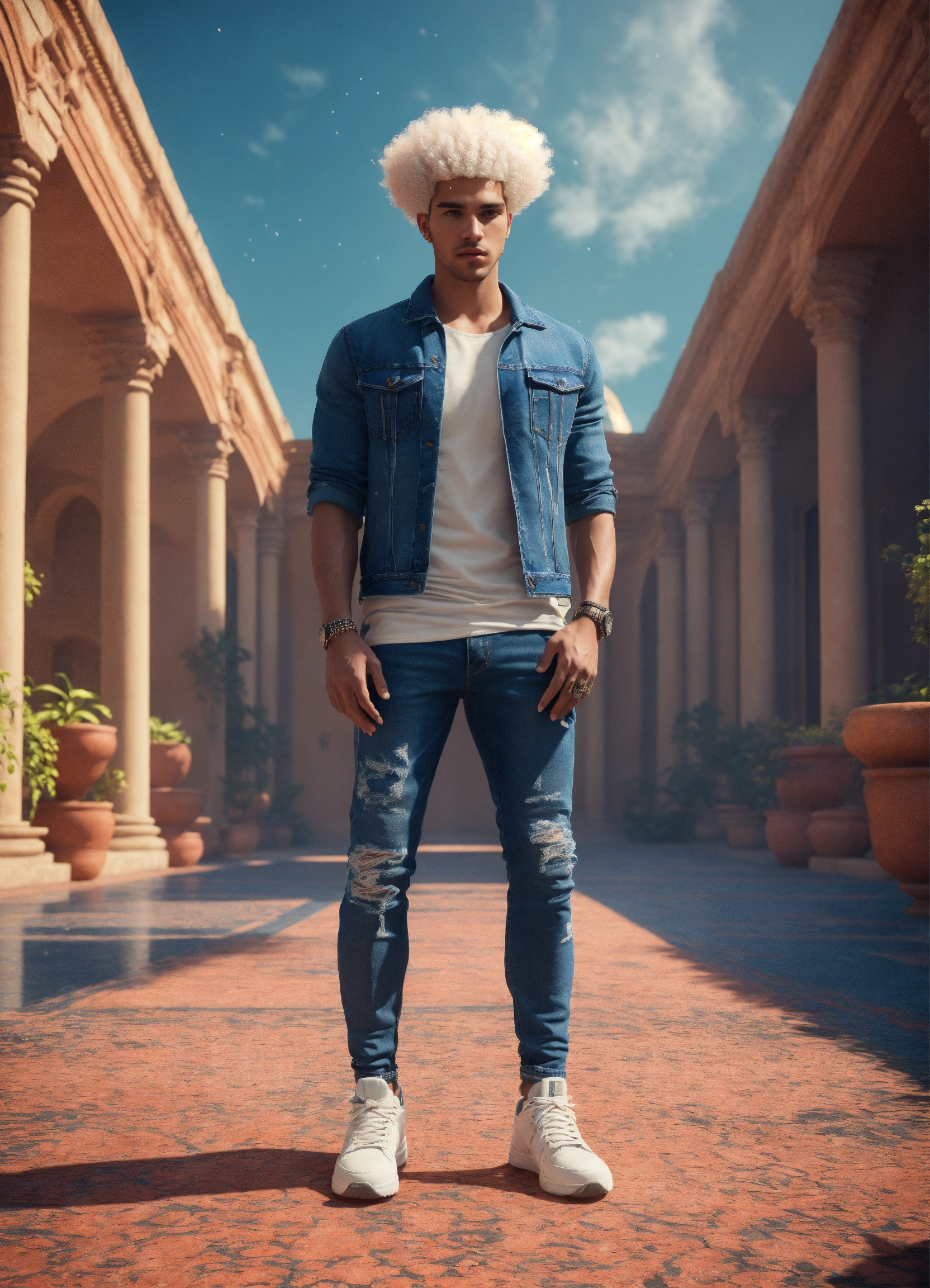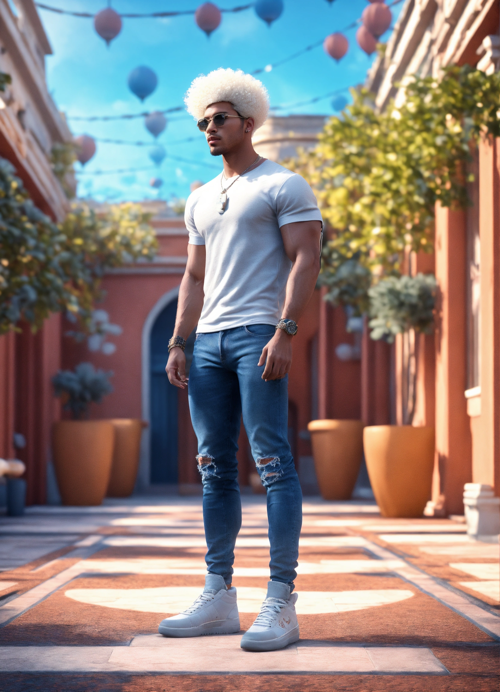 Handsome 27-year-old male. with short white afro. tall muscular build, dressed in haute couture jean, t-shirt and designer sneakers, misischievous persona, standing in extravagant courtyard, on alien planet, early afternoon, cinematic style, high detail, realistic physics, photorealistic, unreal engine, hdr, 8k
