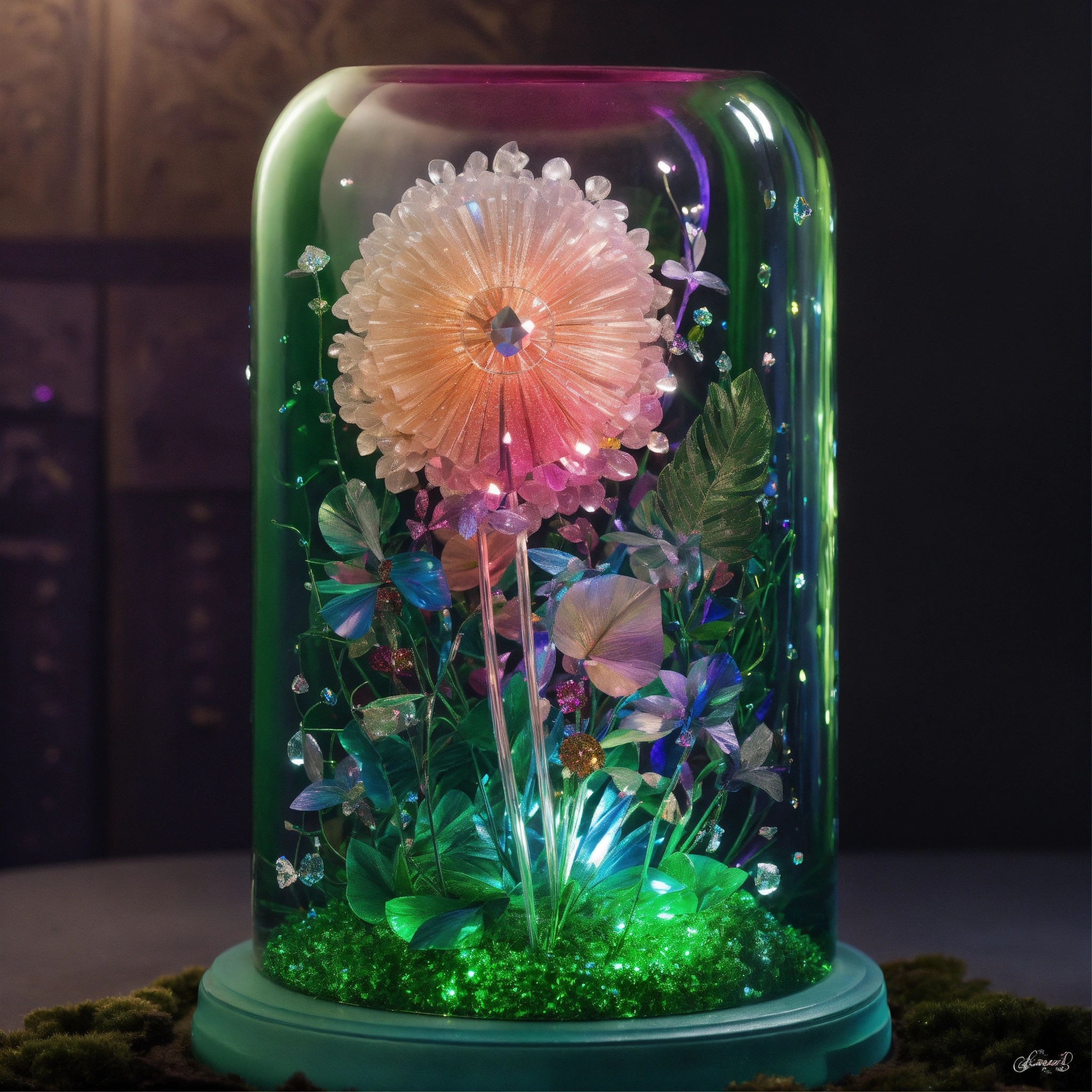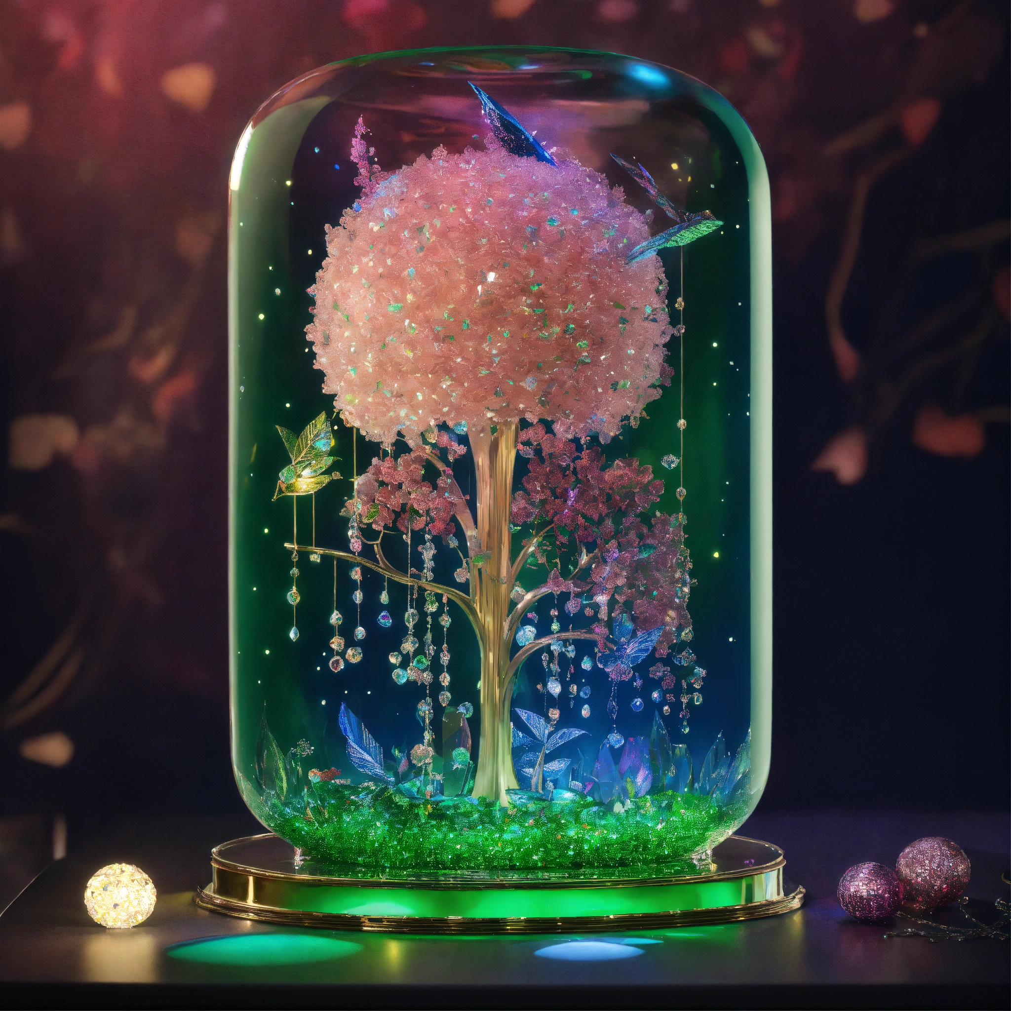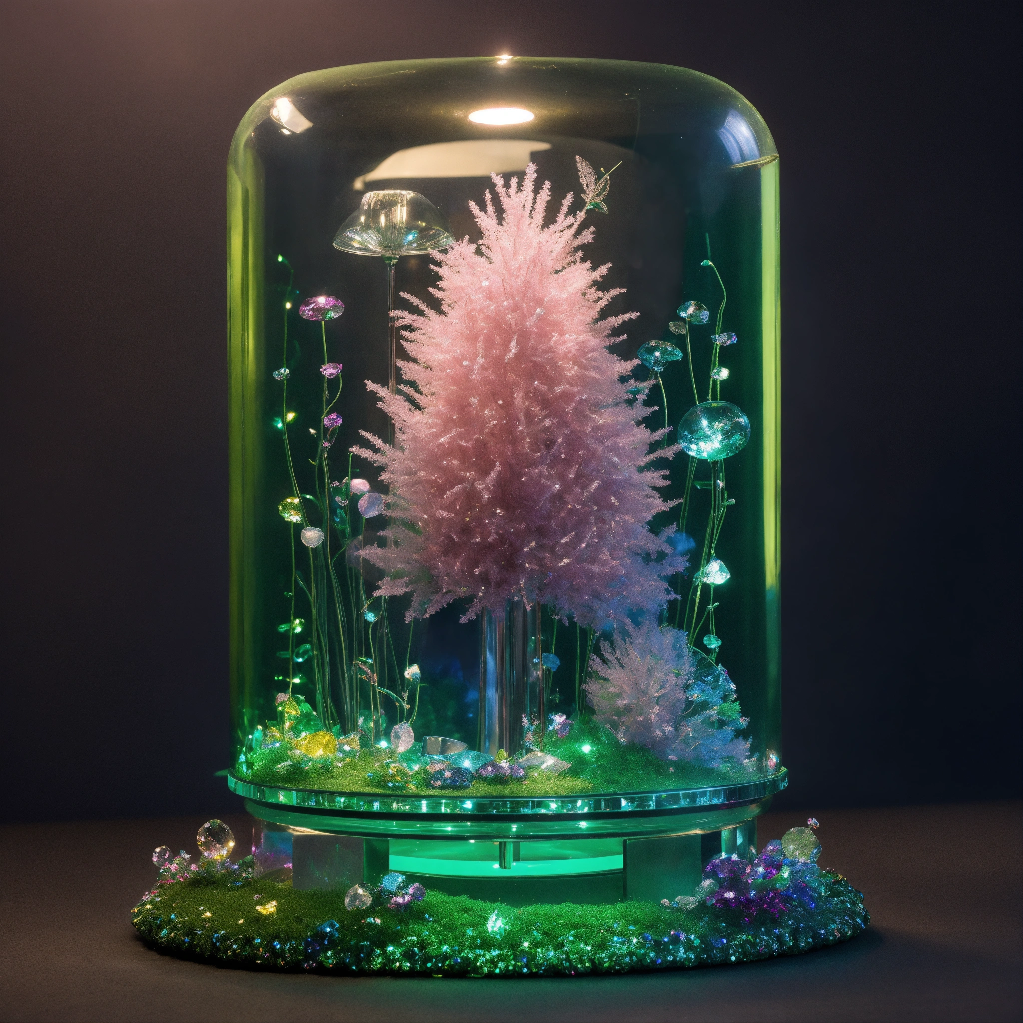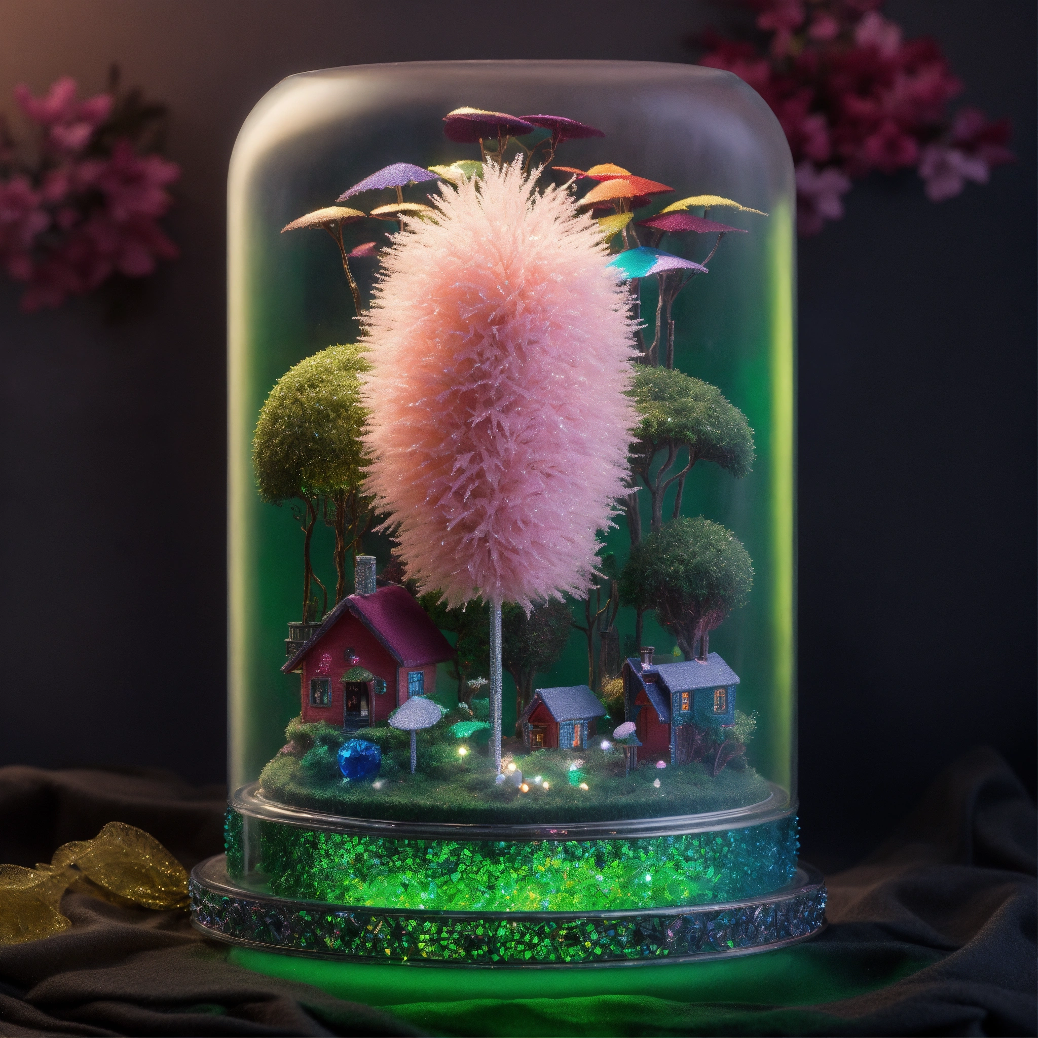 Strass swarovski, tim burton house, herbe verte en laine, lampe sous cloche en verre, socle rond, rendu 3d complexe hyper réaliste, ultra détaillé, details colorés, base en bois, design, color scheme, iridescent, pastel color, textured, intricate, 3d, highly detailed, deco style, laine cardée, brillant, soie, velour, organza, fourrure, strass swarovski