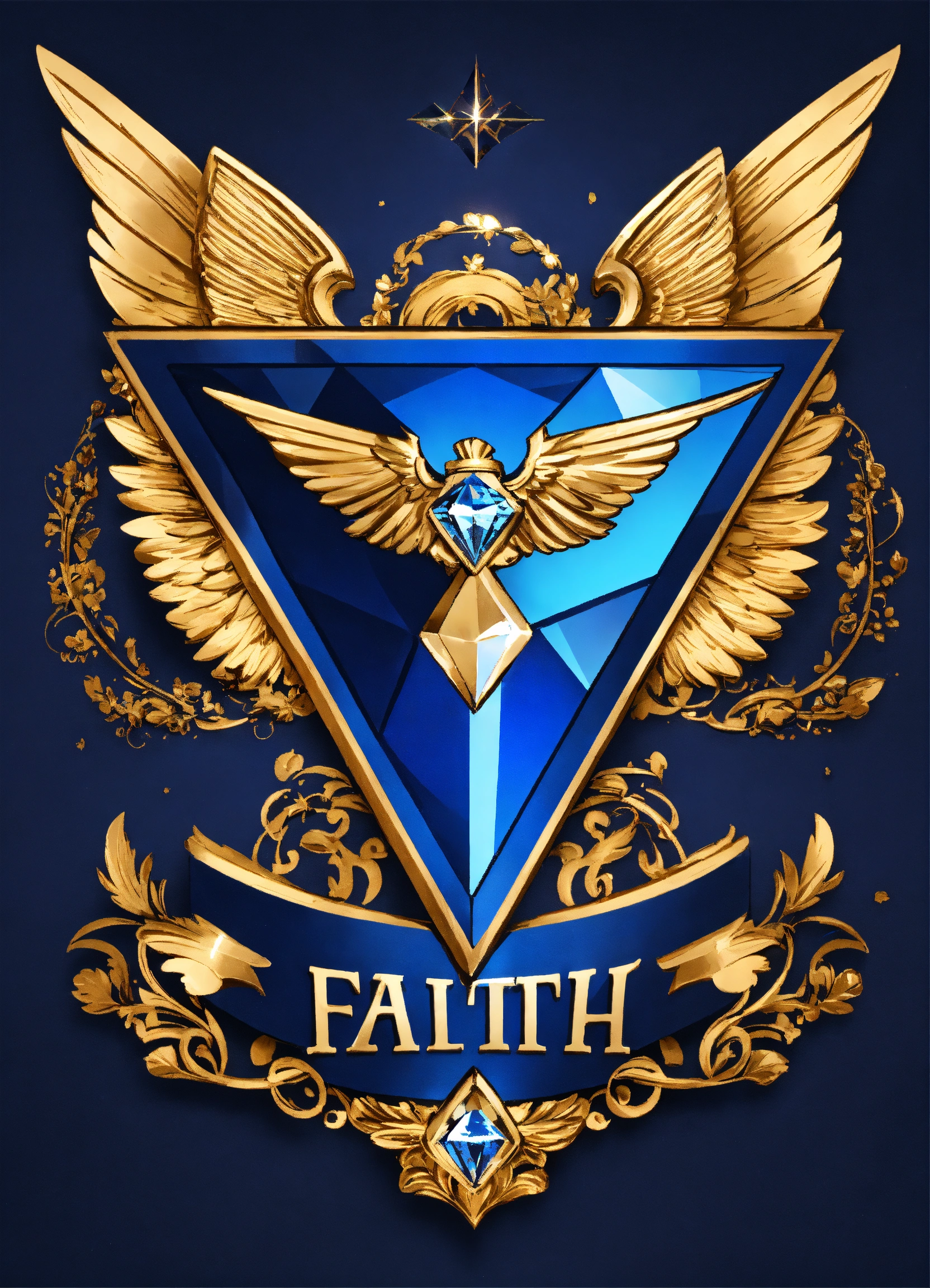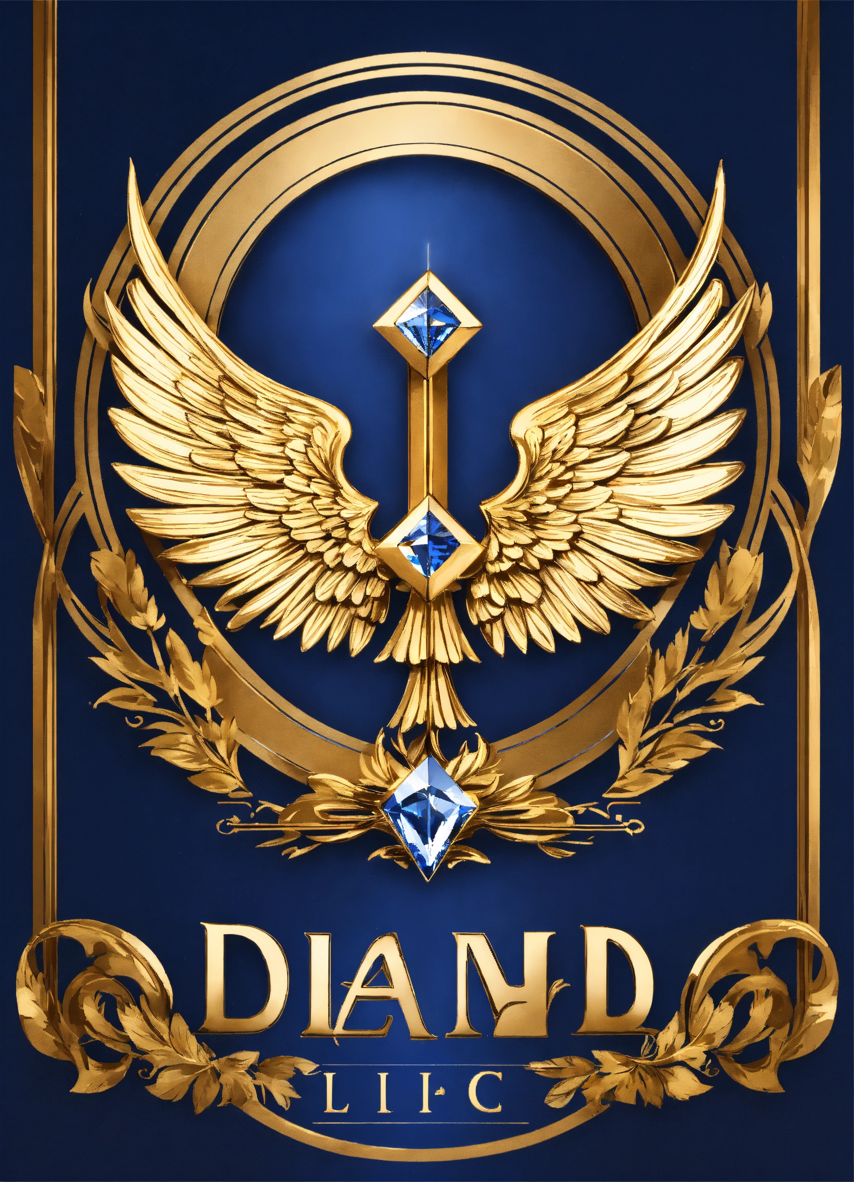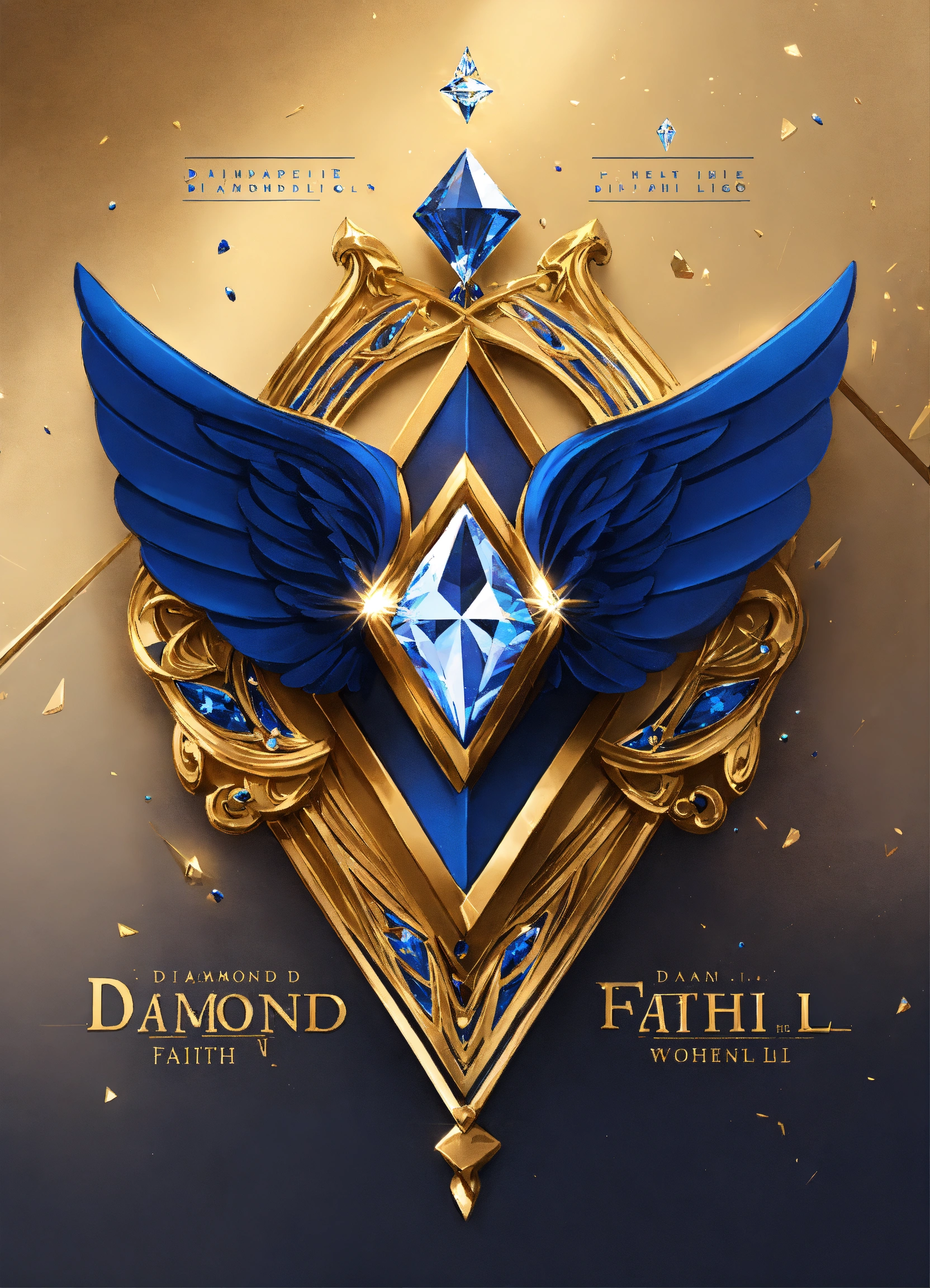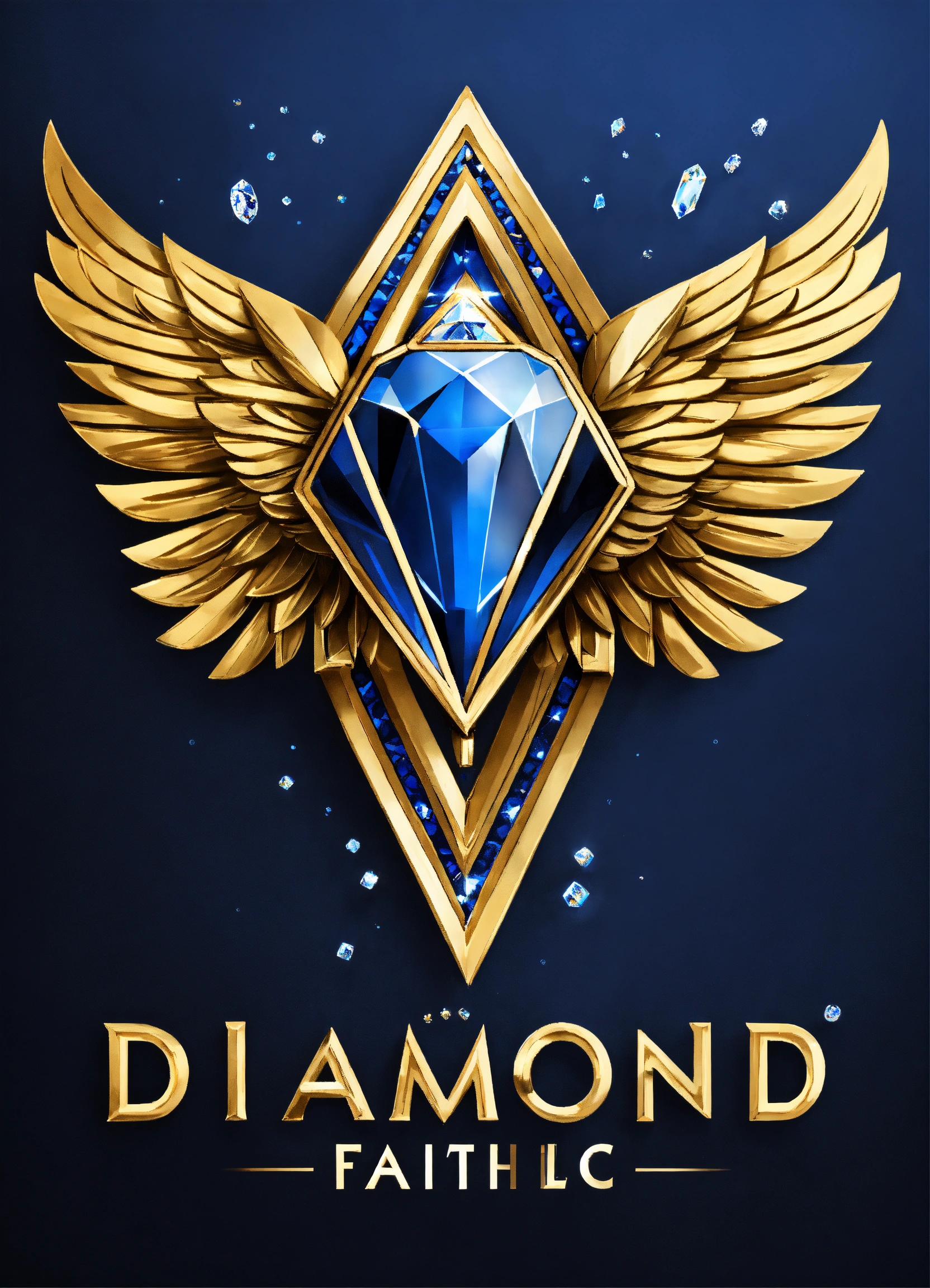 The main element of the logo is a diamond. accent wings with a pair of elegant, stylized wings on either side. sapphire blue and gold color scheme the text "diamond faith llc" is written neatly in bold font.