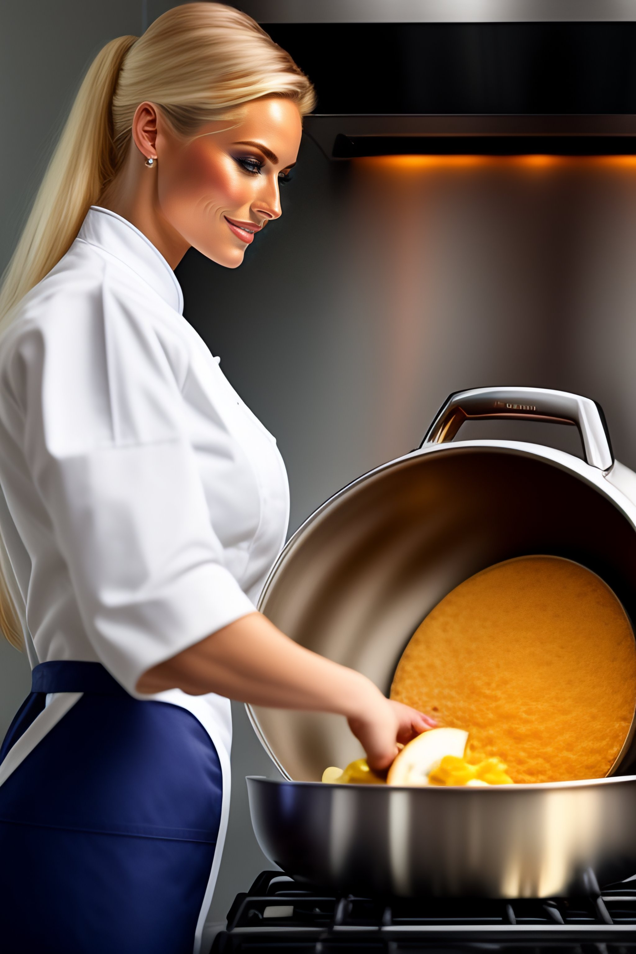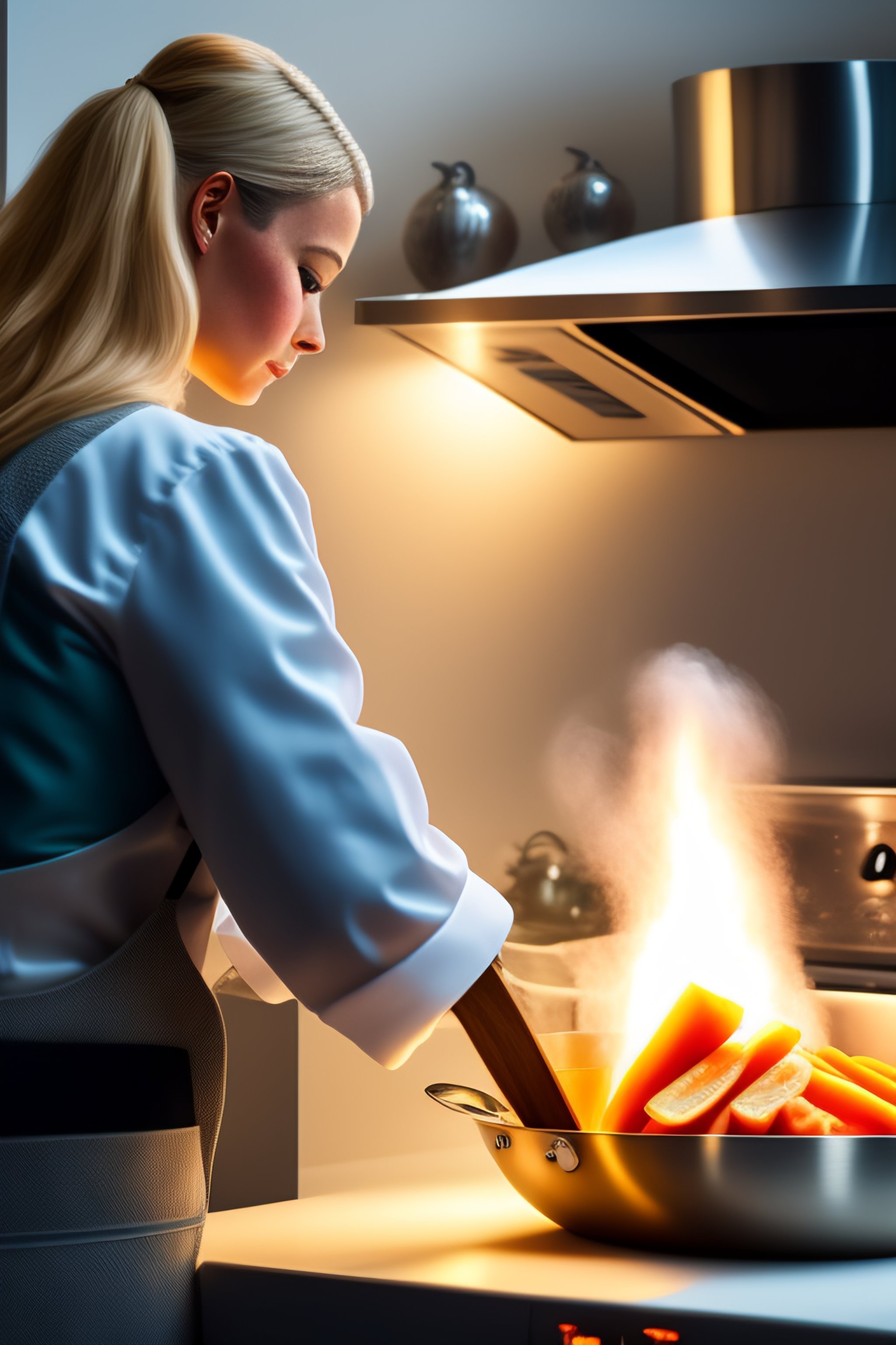 A blonde from behind in a white cook uniform with long sleeves cooks vegetables in a frying pan