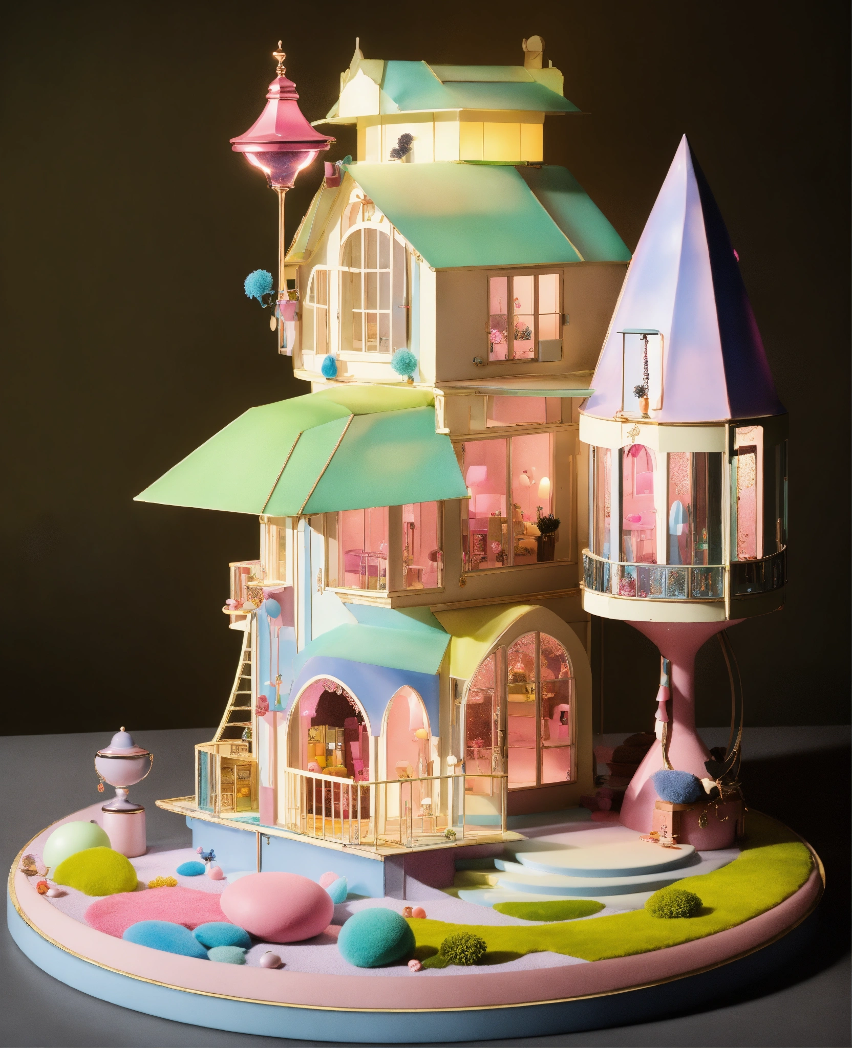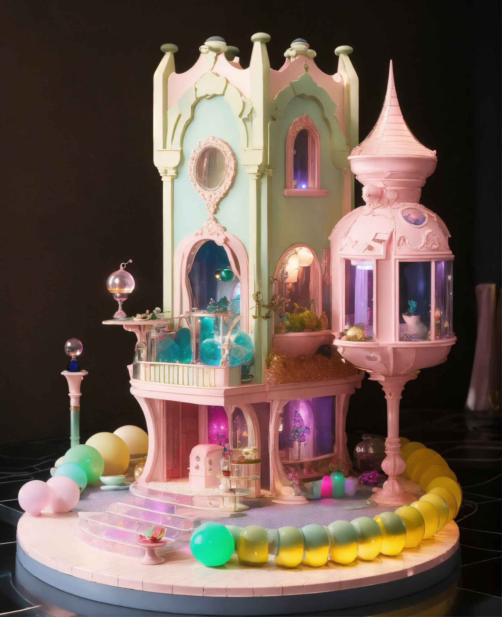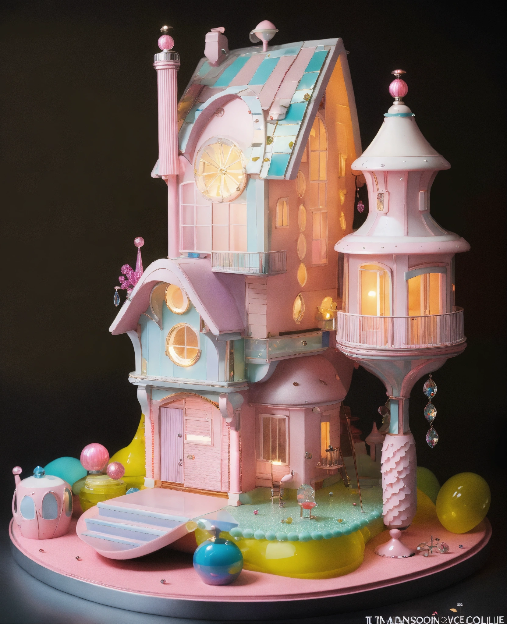 Maison conçue par tim burton, collection, inspiration. rendu moteur 8k, bel éclairage futuriste, maison sous dôme verre, laine cardée, strass colorés, fourrure, lampe bleue, led pink, socle plusieurs étages