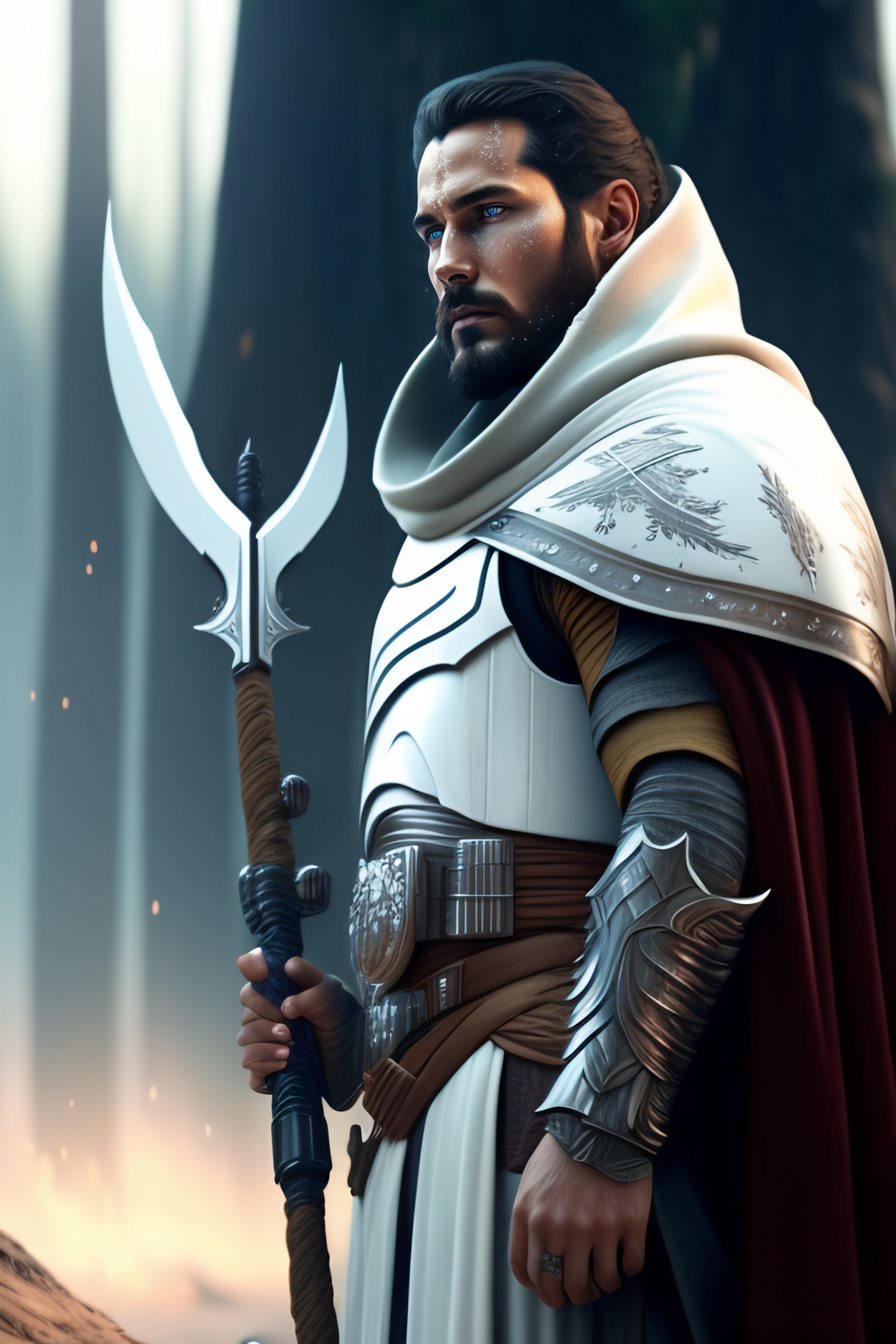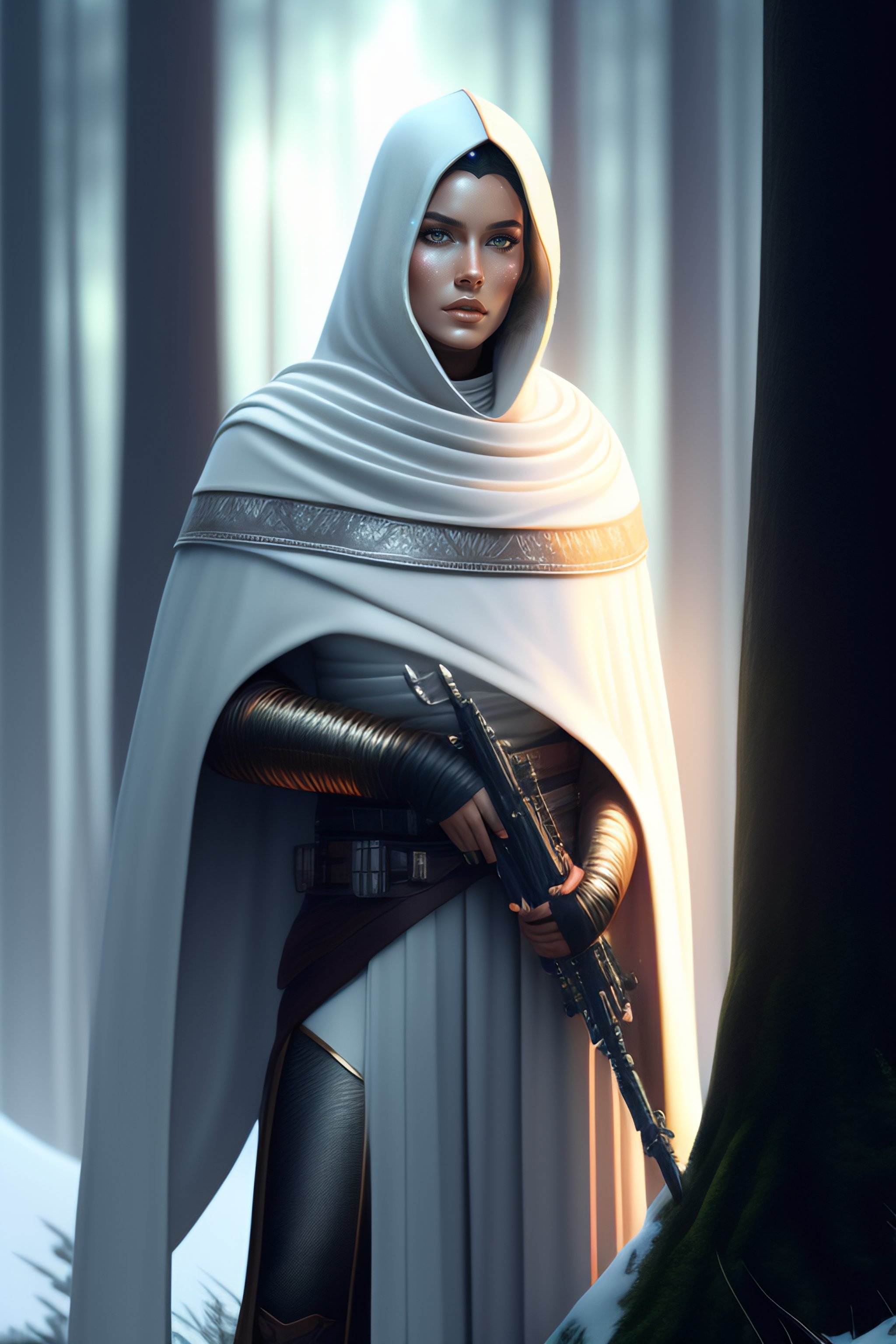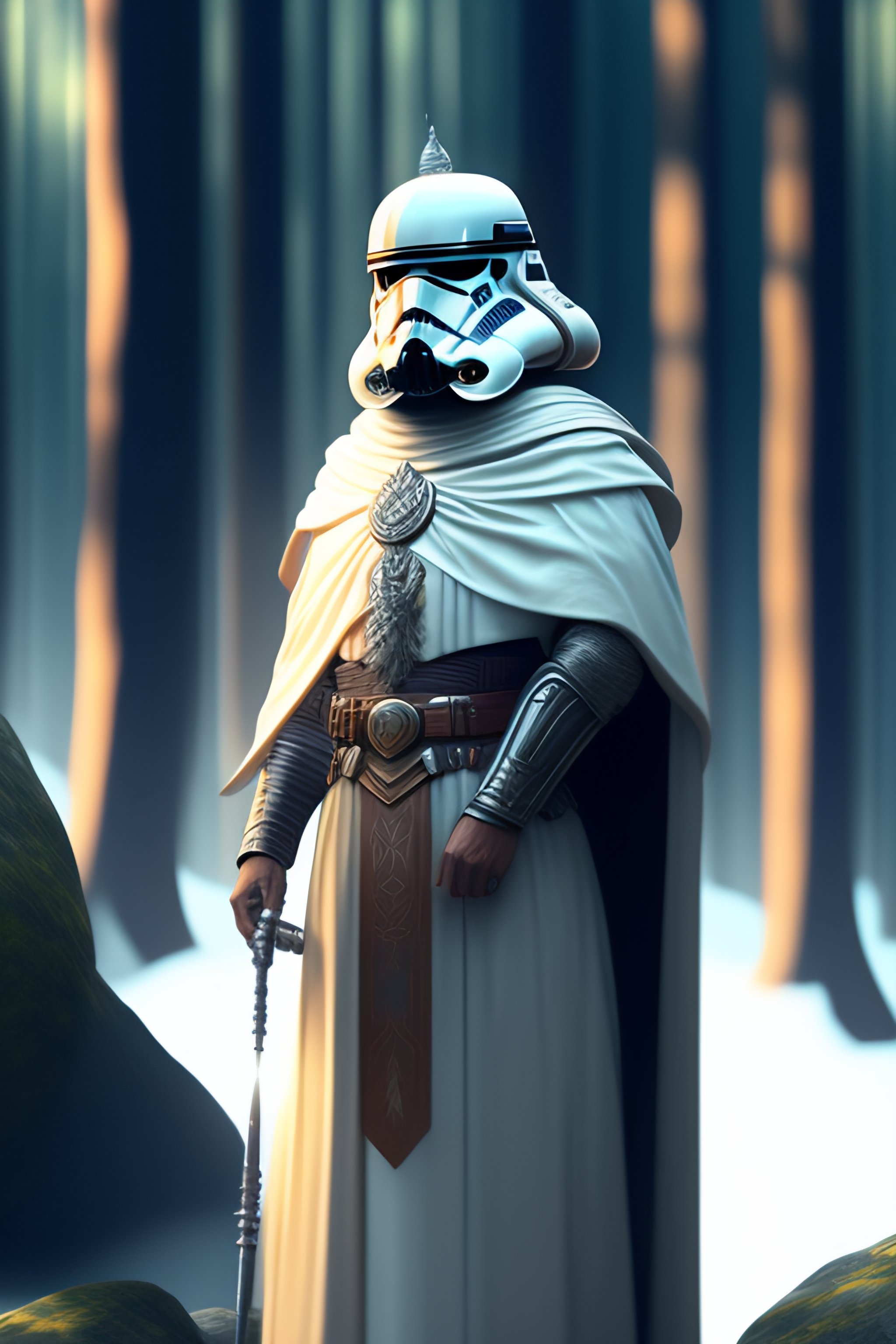 Star wars scene artificial intelligence a barbarian wearing white jedi knight cape holding a dagger in it's let paw, forest in background, artstation trends, concept art, highly detailed, intricate, sharp focus, digital art, 8 k