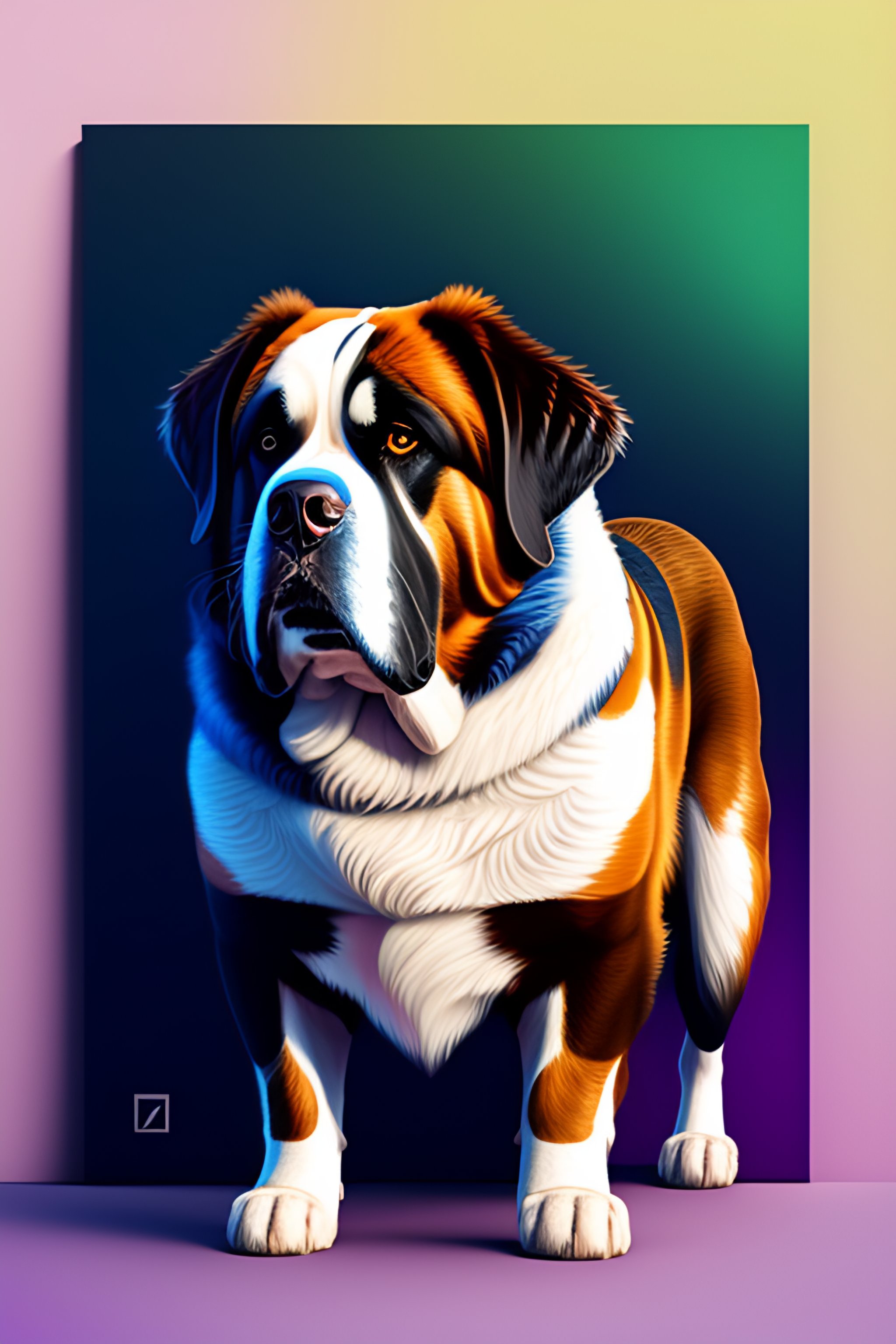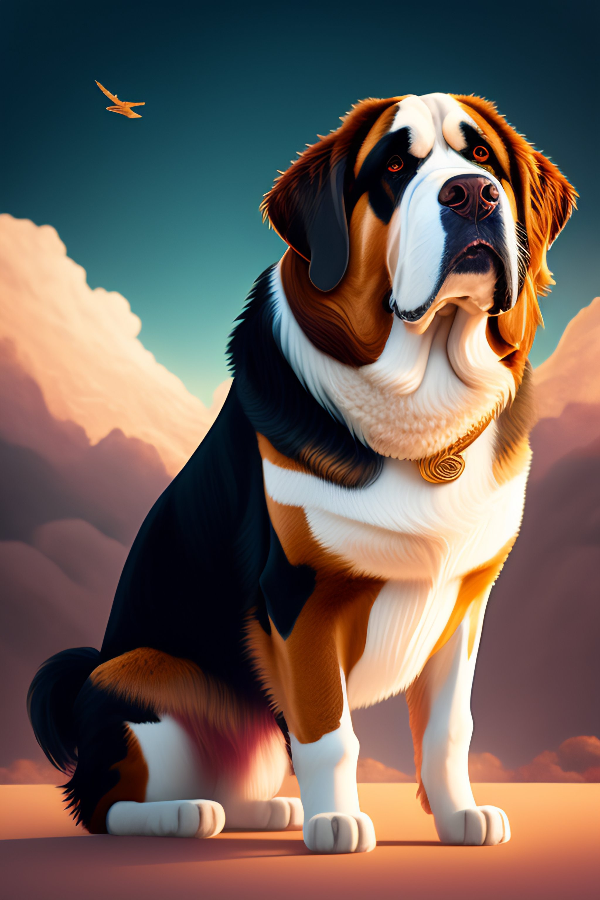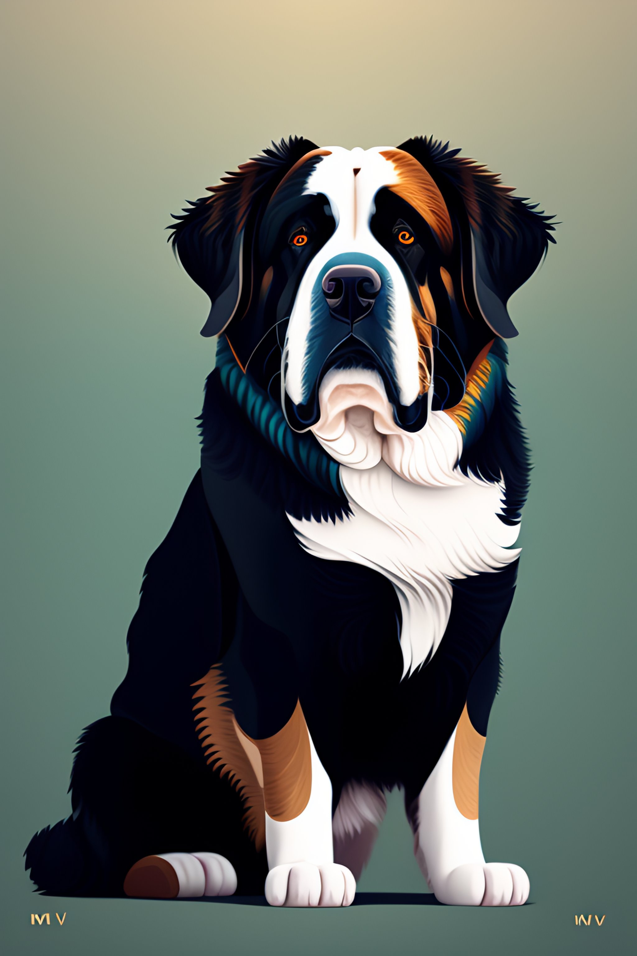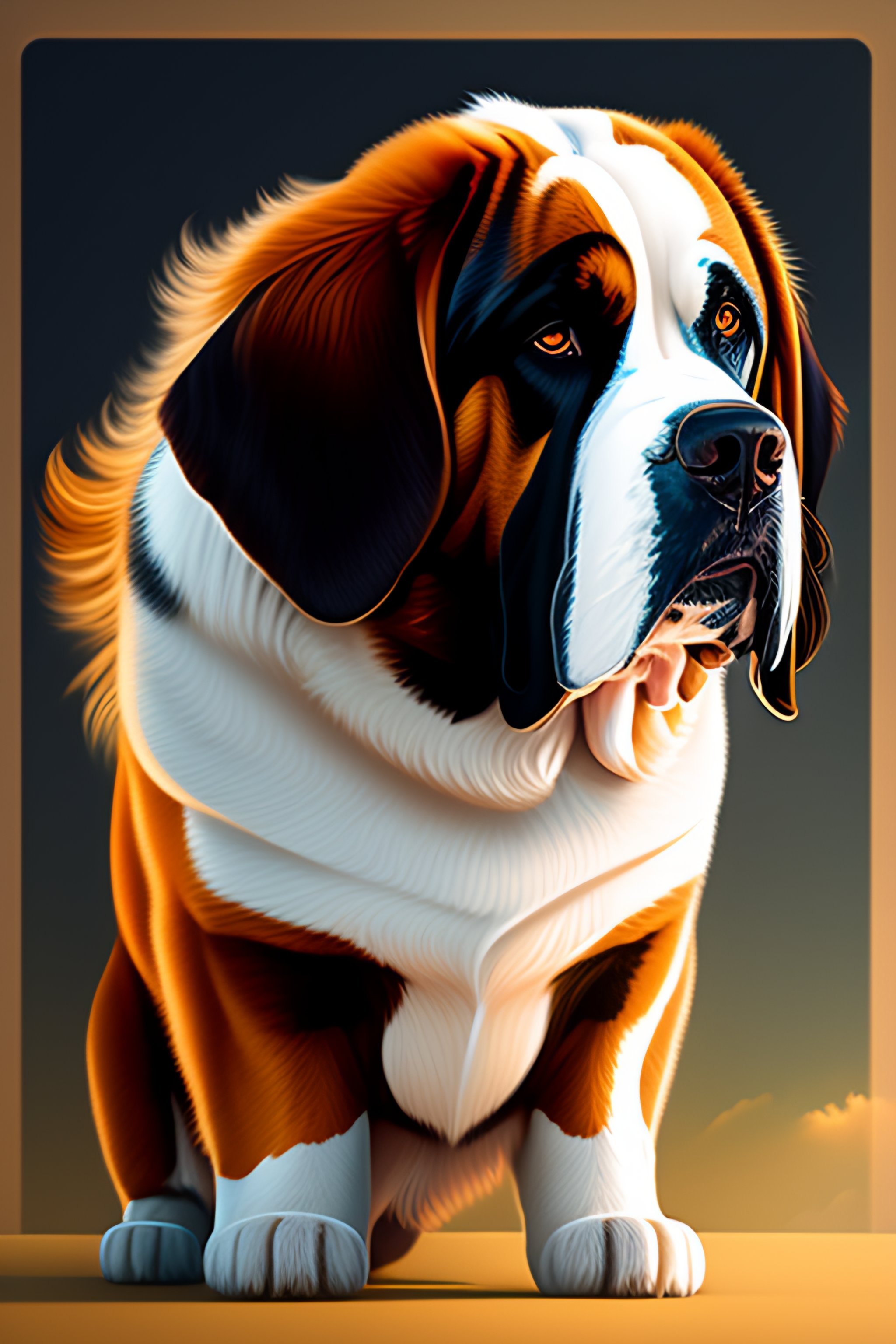 Mdjrny-v4 style full-length masterpiece fullbody emotional portrait of handsome st bernard dog with perfect face, standing. 4 legs, 2d heavily-stylized vector digital drawing in the style of artists chris foss, alberto giacomettin, alexander jansson. dynamic action pose, professional illustration, cinematic composition, beautiful lighting, extremely detailed, sharp-focus, magnificent, award-winning, epic, dramatic
