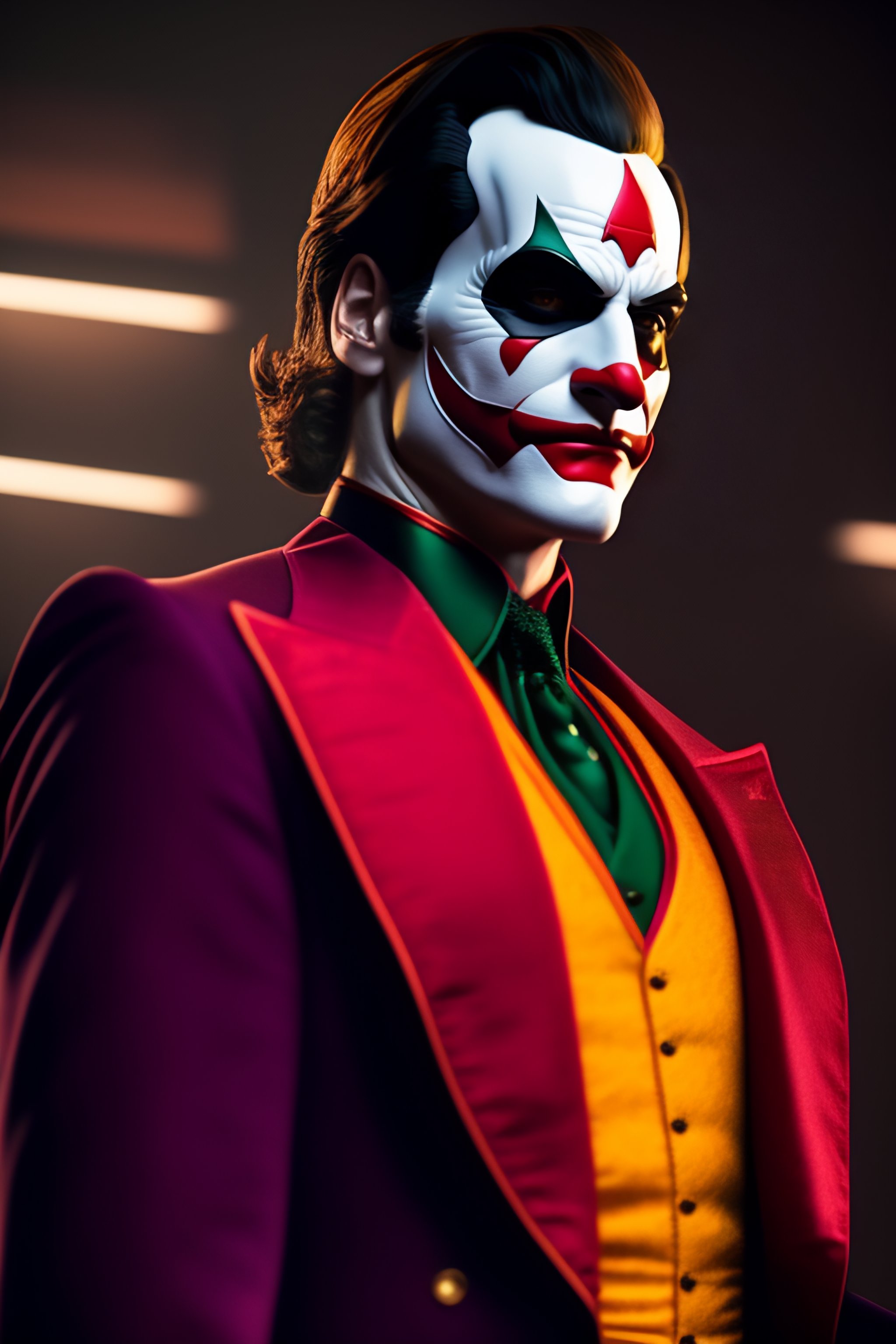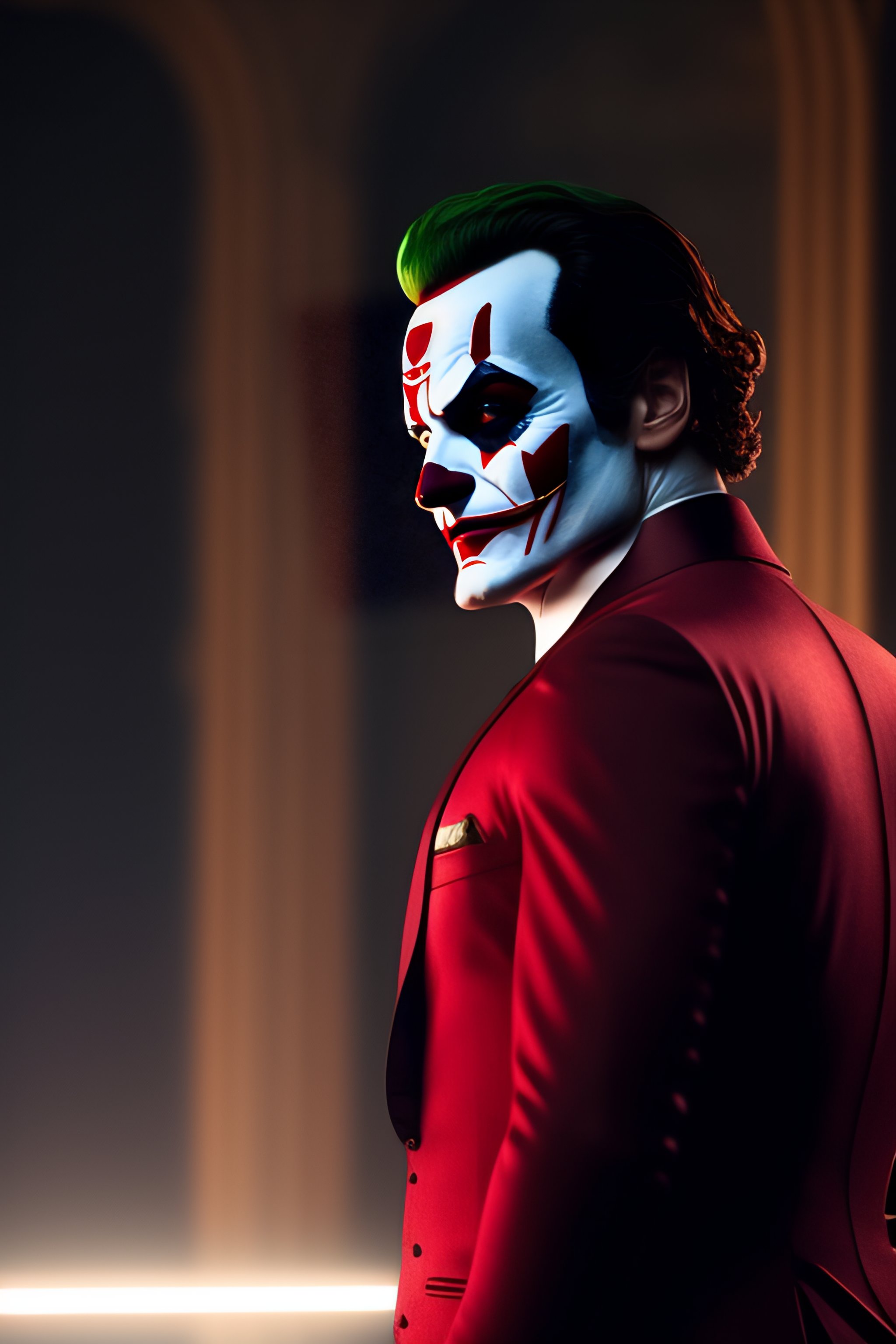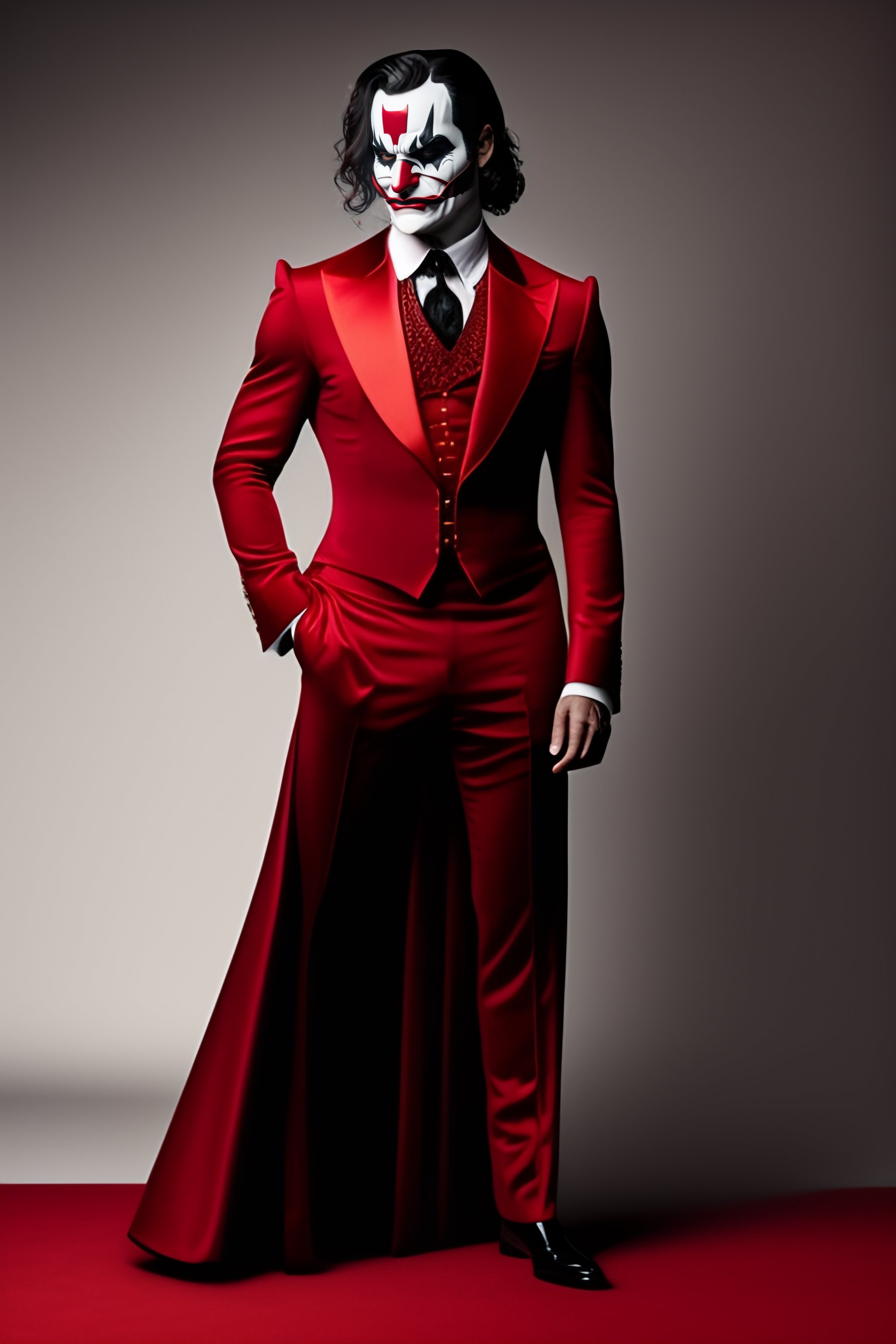 Full body shot of joaquin phoenix's joker wearing dark red batman suit