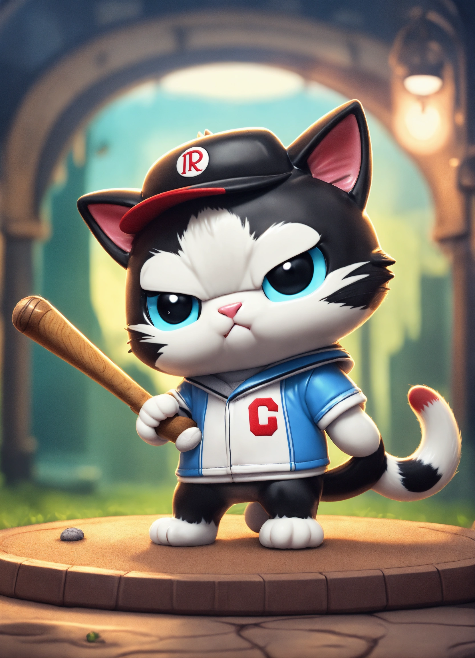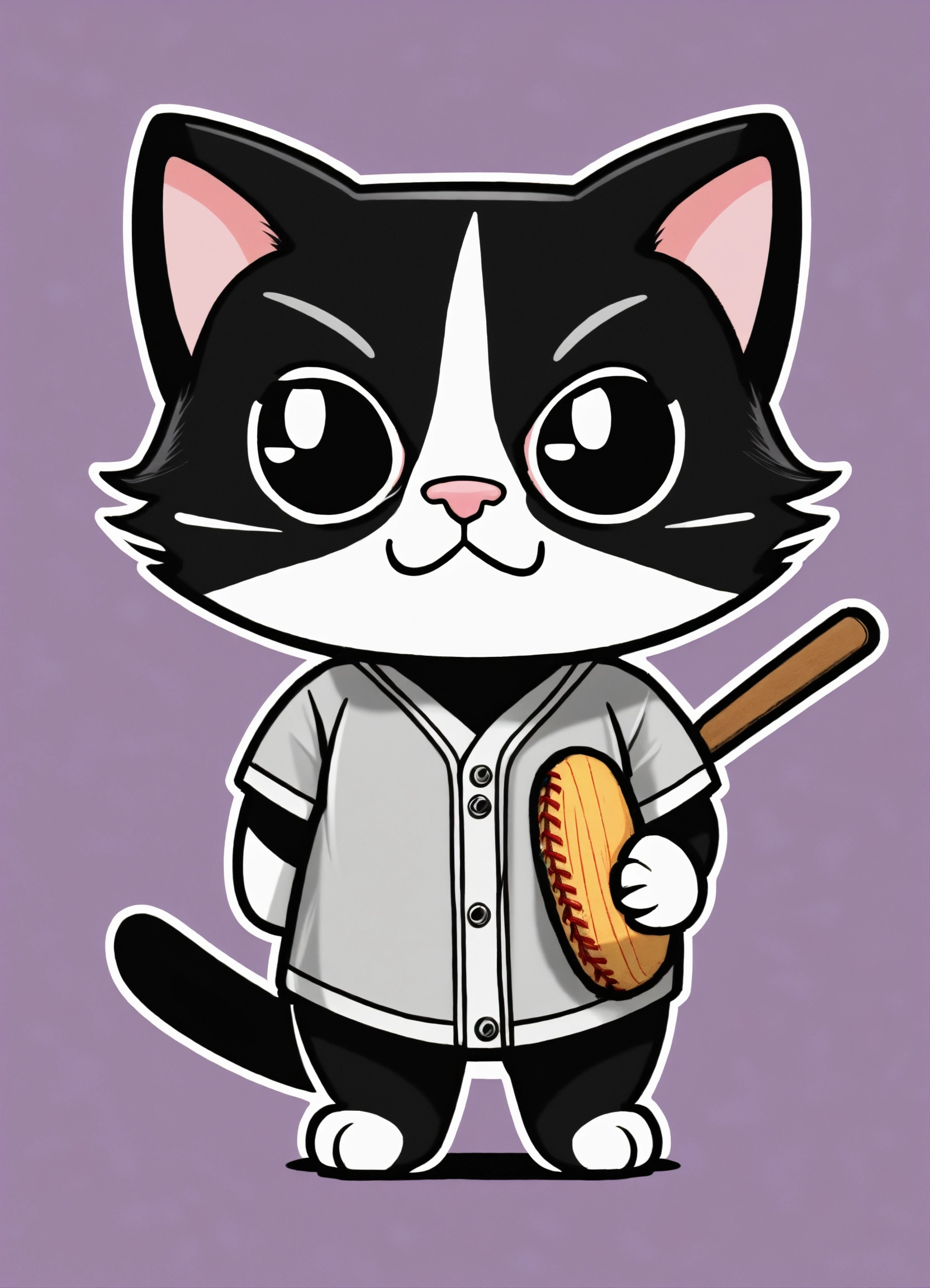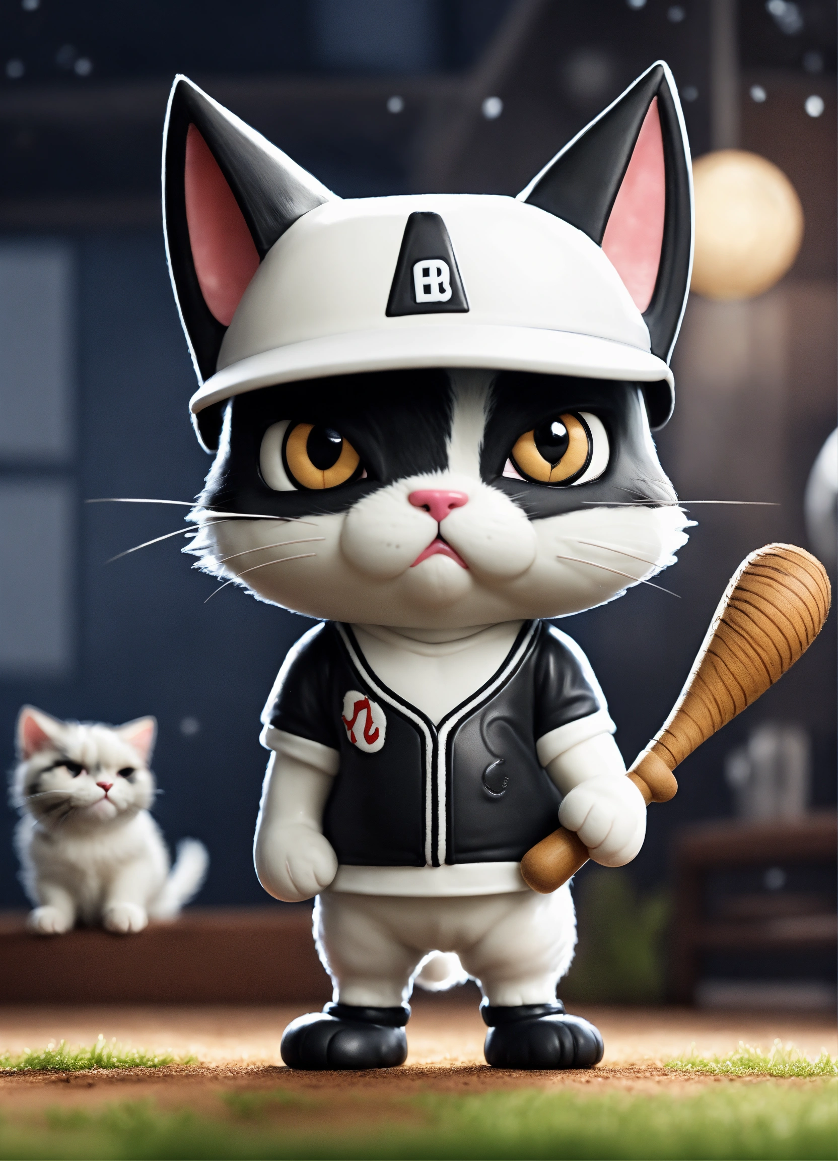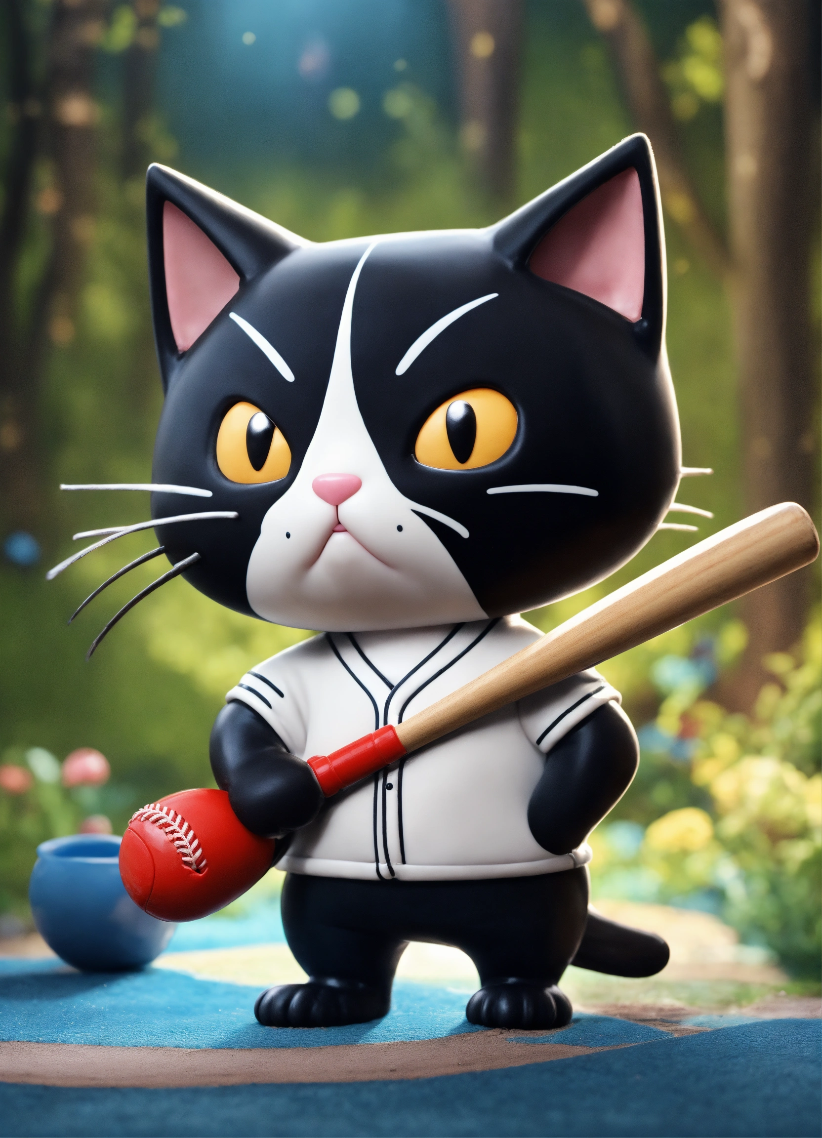 Cute and adorable cartoon angry black and white cat, standing up, fantasy, dreamlike, surrealism, super cute, holding a bat, funko pop, wearing a baseball shirt