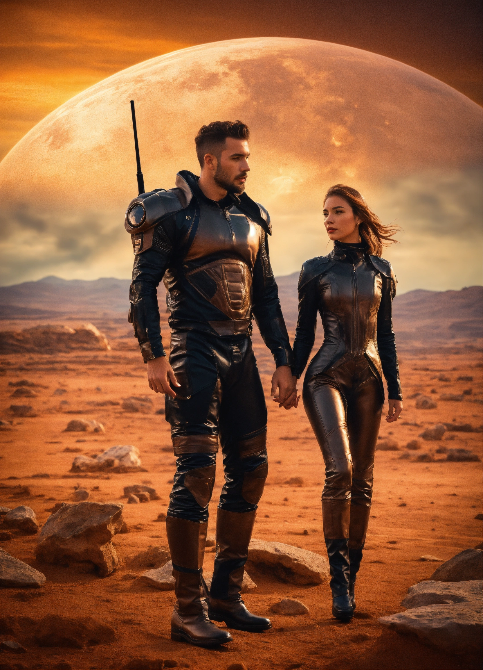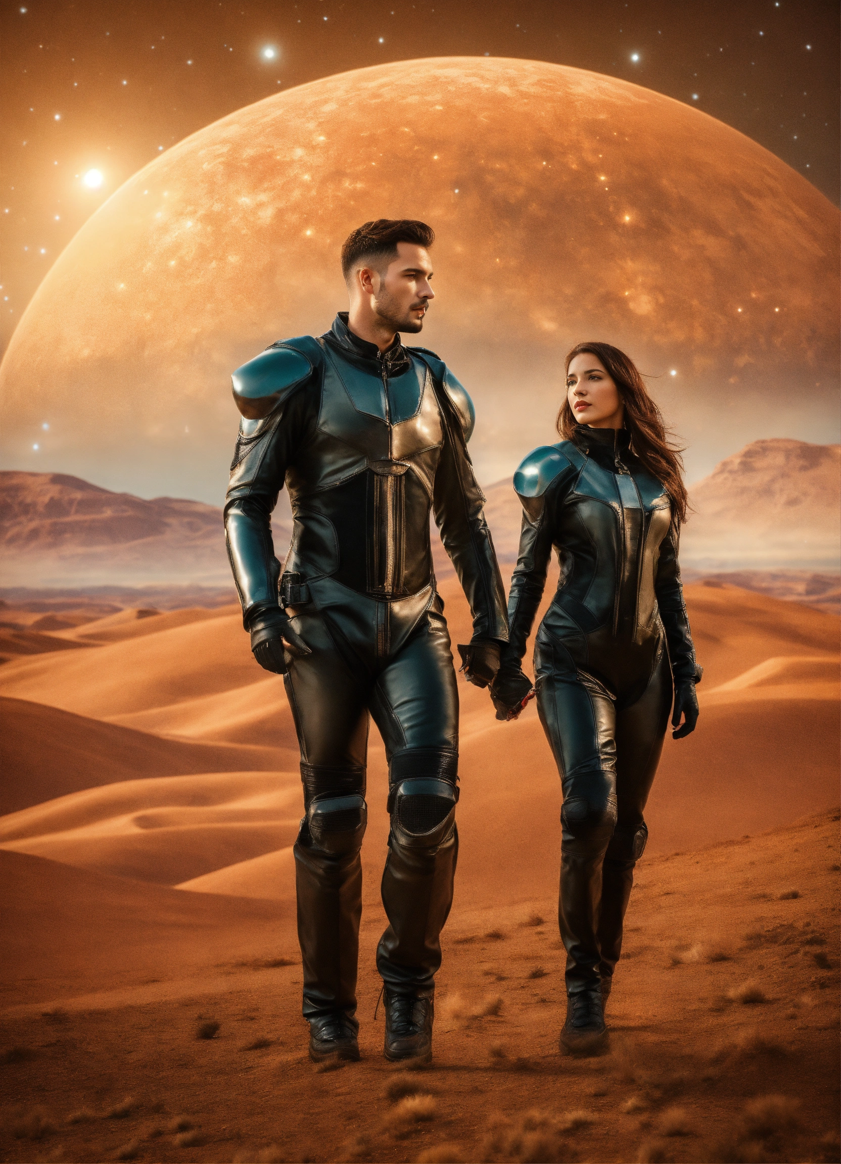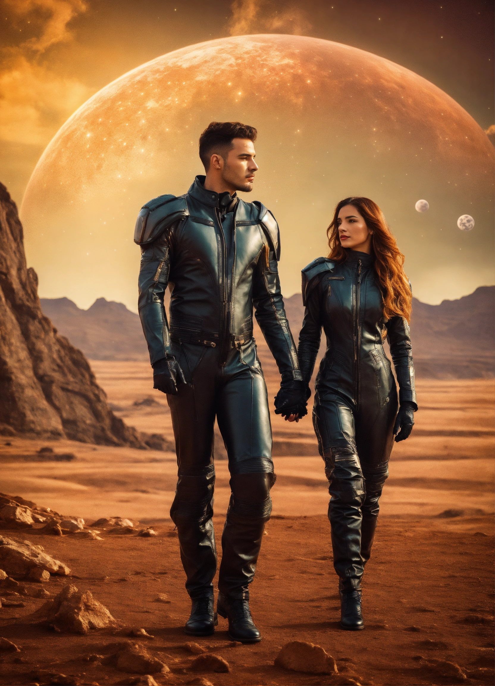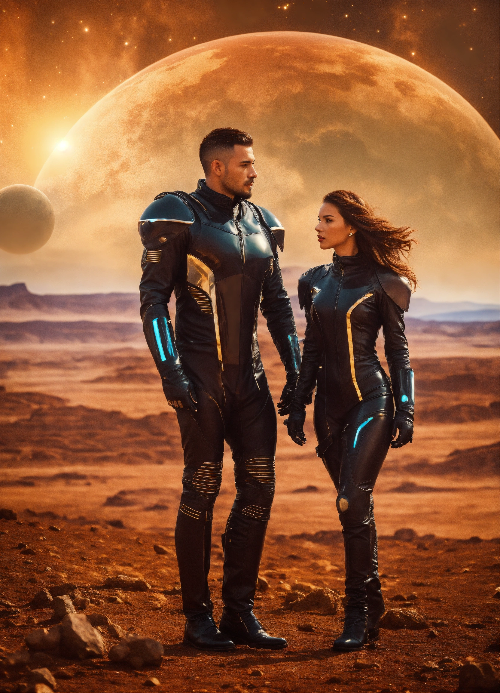 A very beautiful couple, a man and a woman, in leather suits of the future, in full growth, on an alien beautiful planet