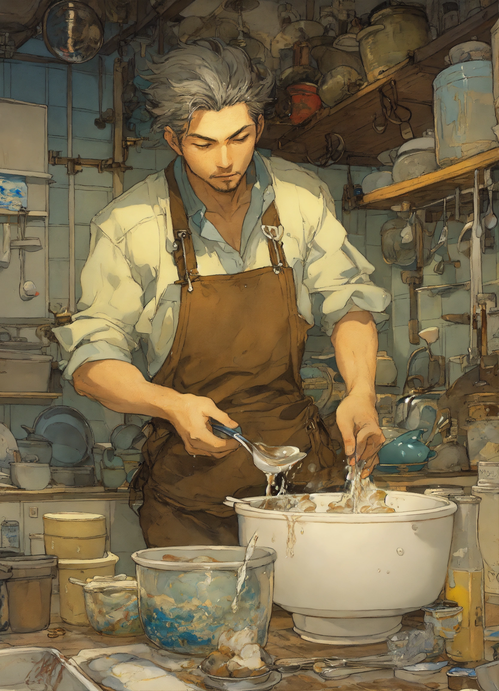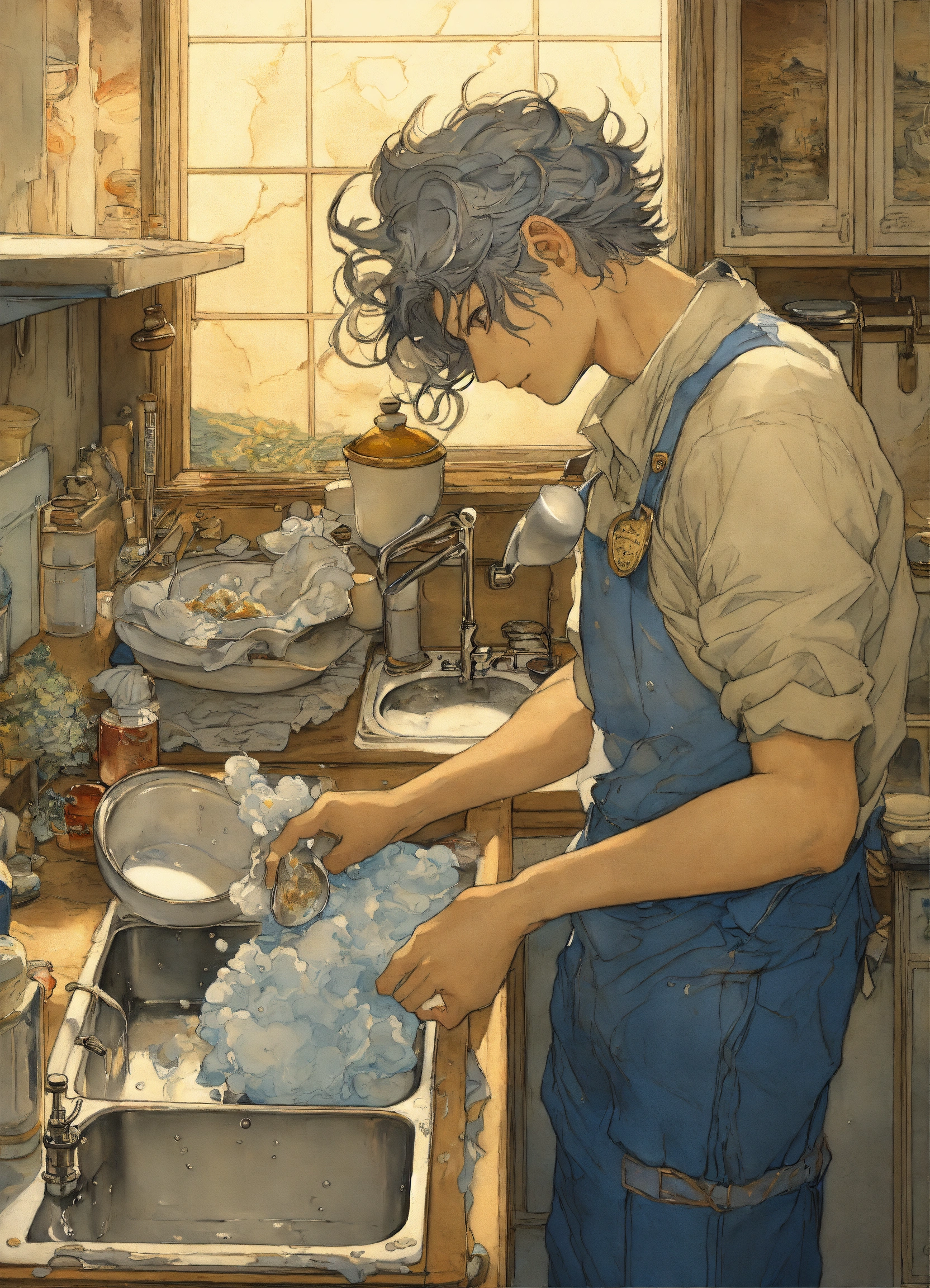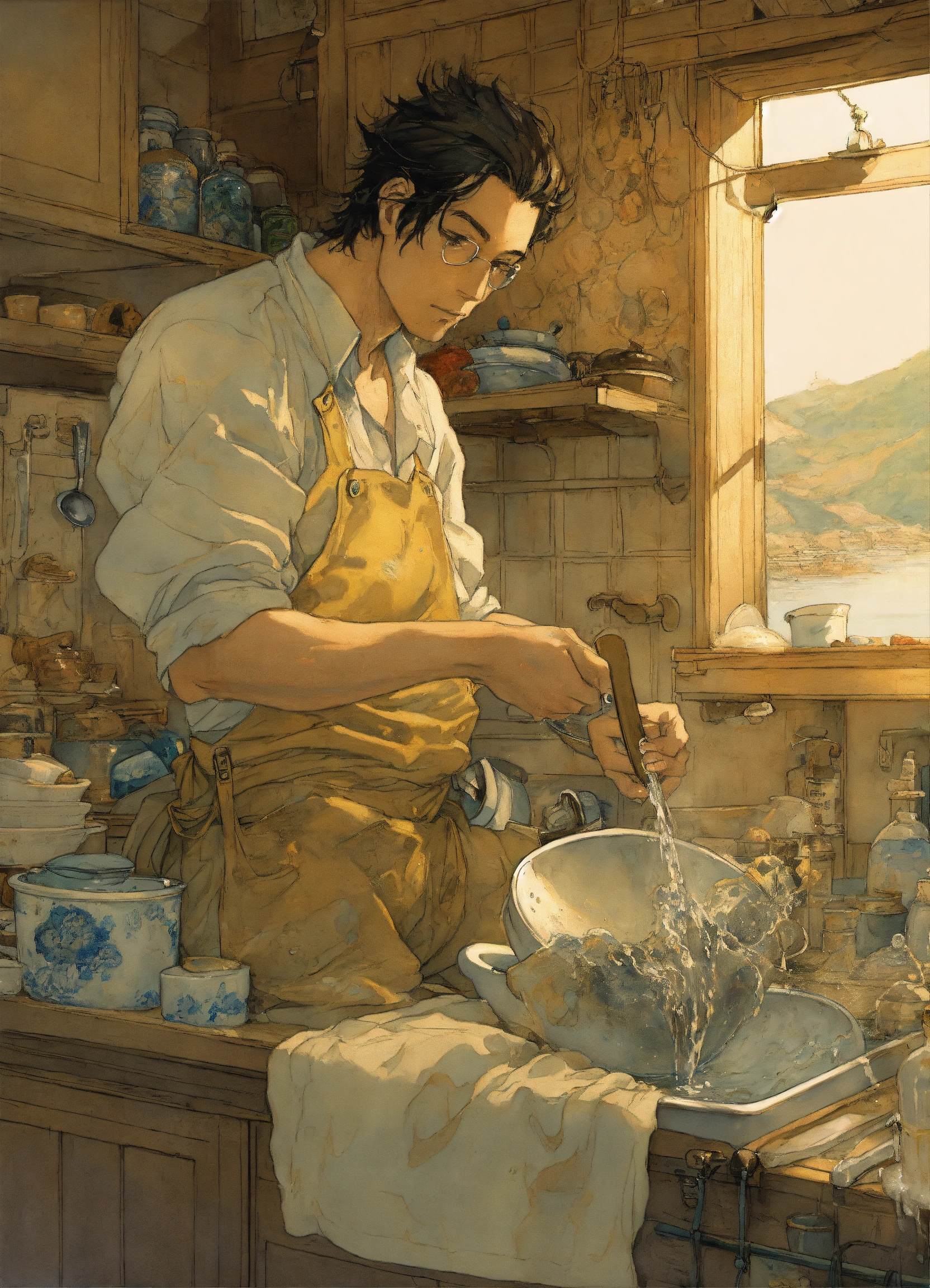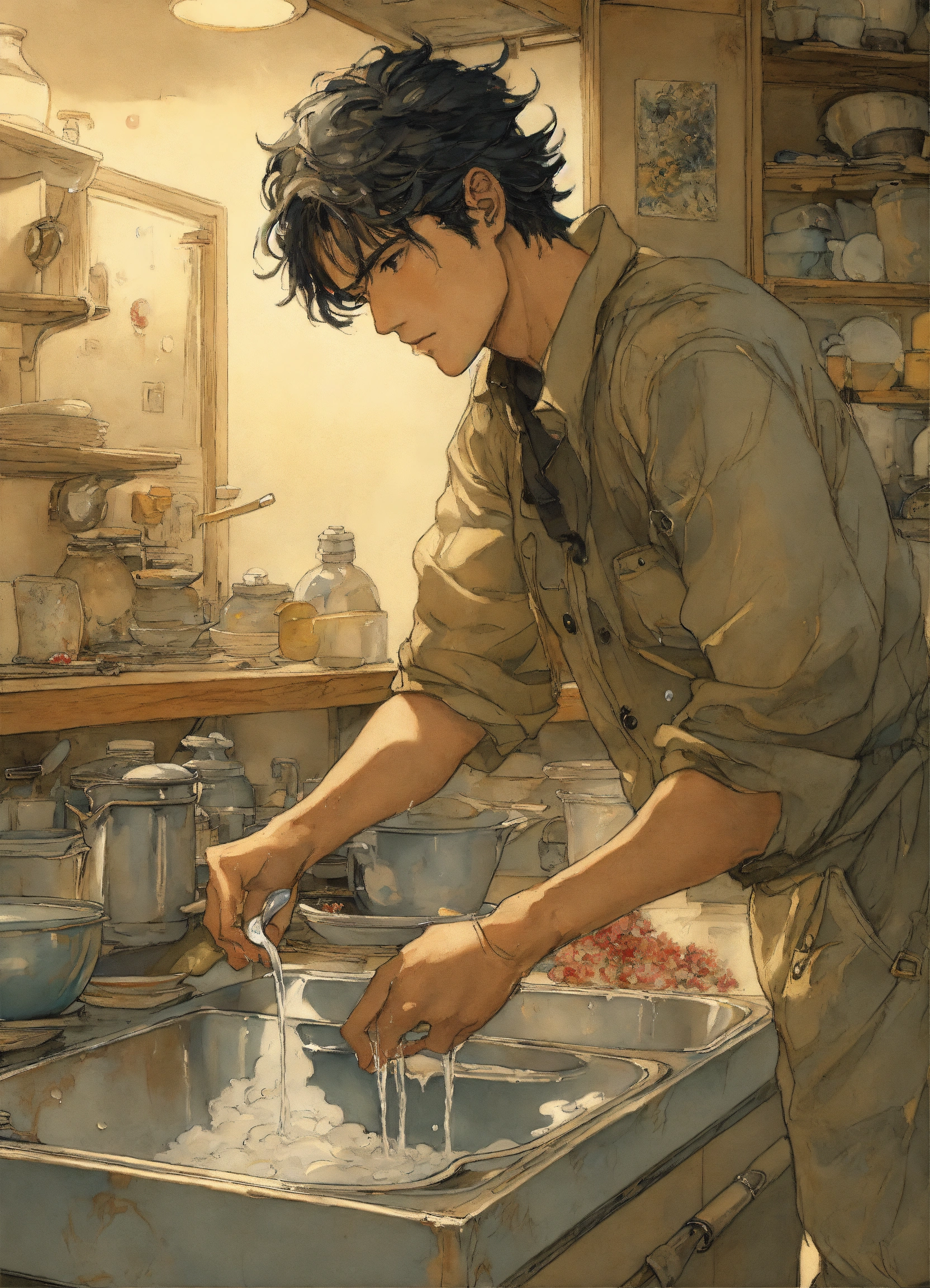 A man washes dishes, a detailed painting by katsuya terada, featured on pixiv, analytical art, detailed painting, 2d game art, official art