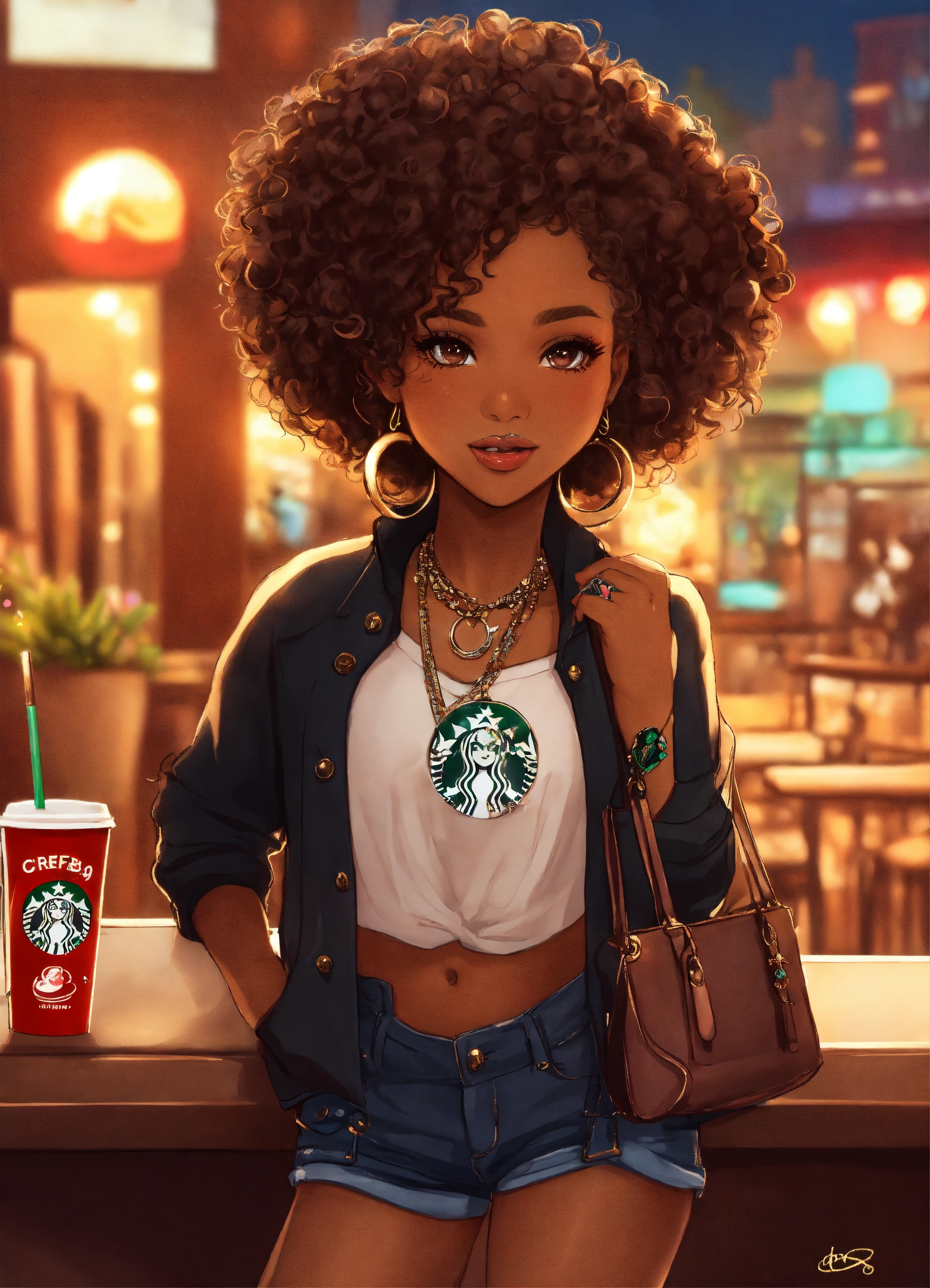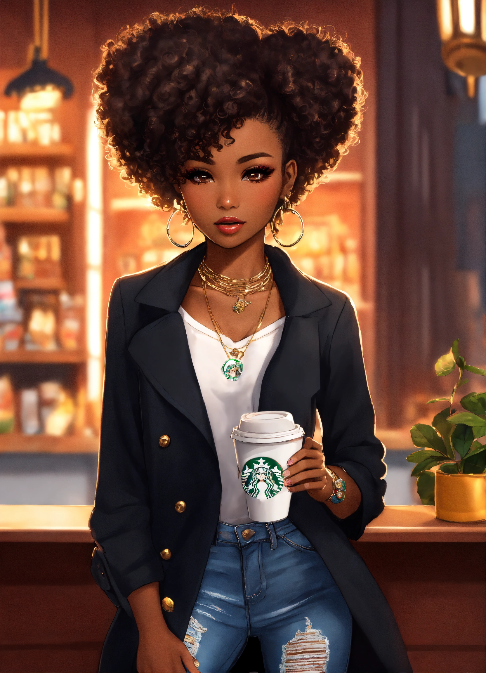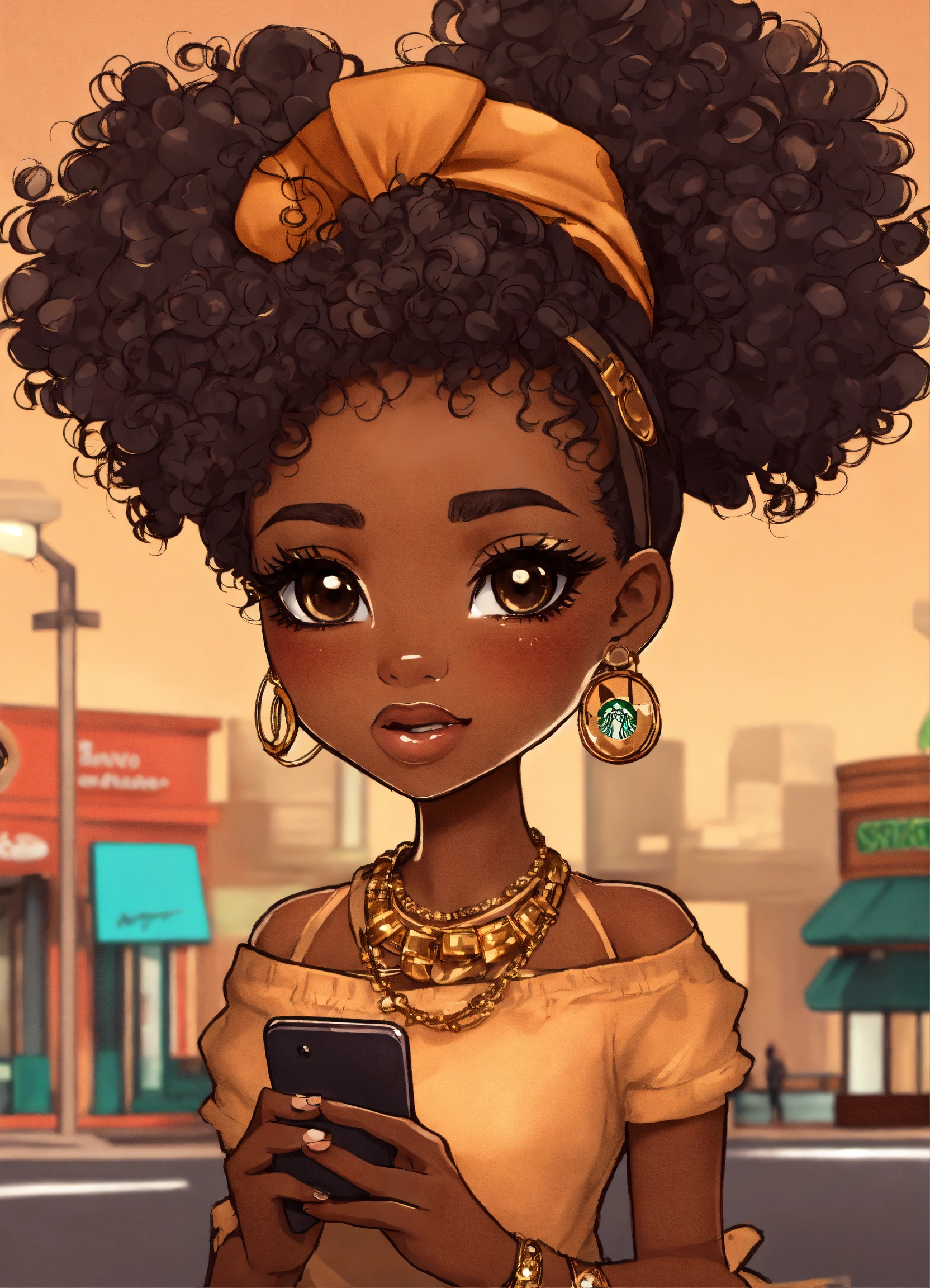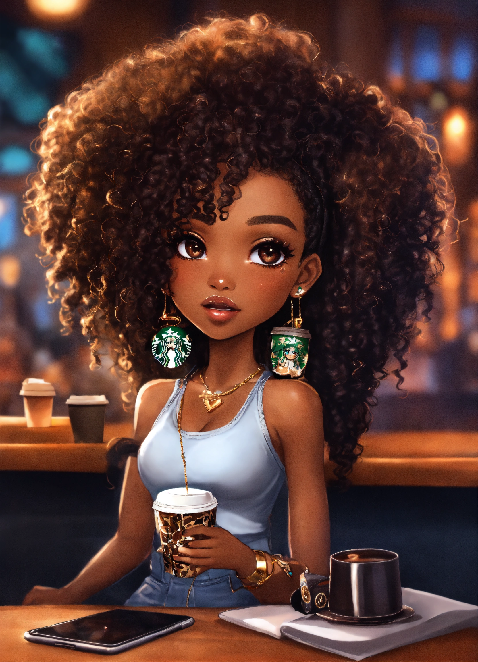 Create me a fabulous black chibi black girl with almond eyes, soft skin, natural curly hair, confident look, stylish outfit, earrings and necklaces on with gorgeous makeup, with a cell phone in one hand and starbucks coffee in the other. ratio 916