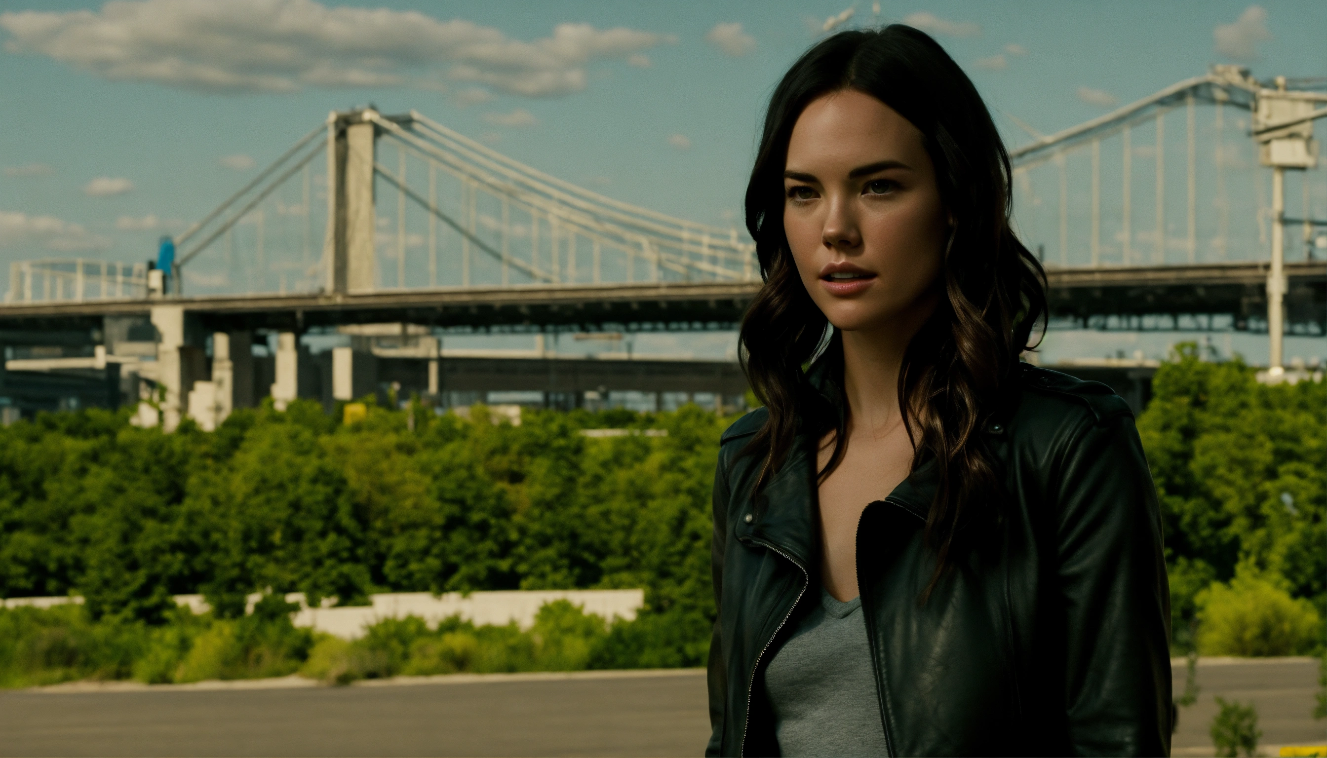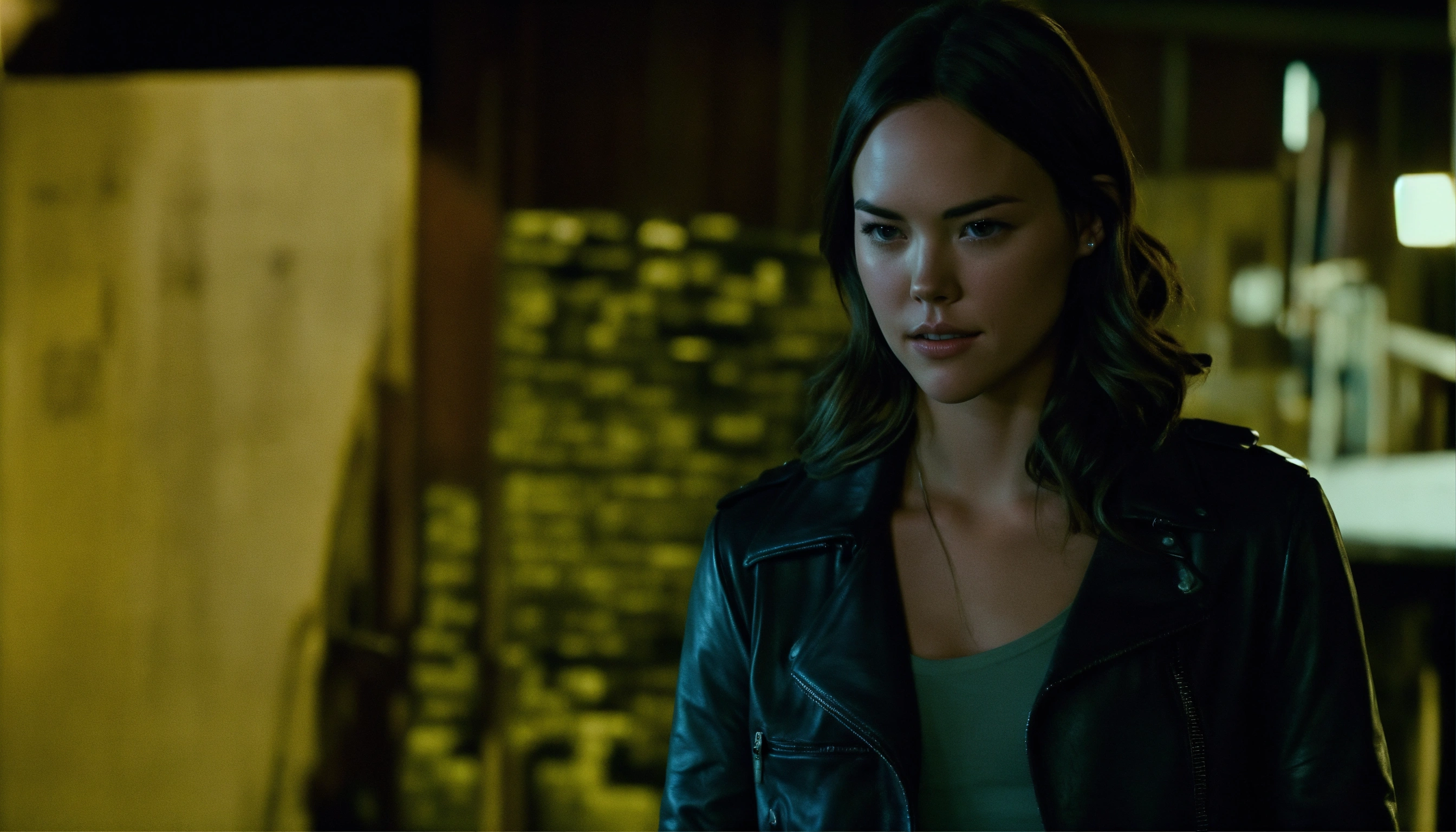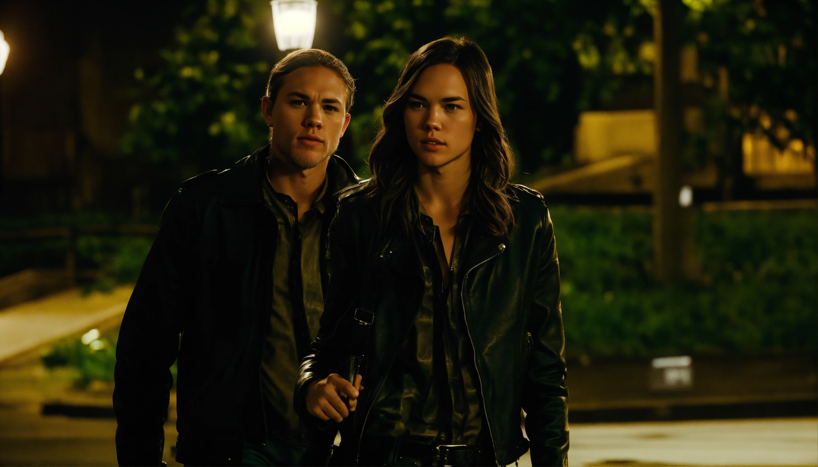 Beautiful cute 25 years old odette annable with charlie hunnam fbi, walks in a crime style. serial killer hunt, cinematic, night chicago, leather jacket, dangerous situation, suspense, cinematic