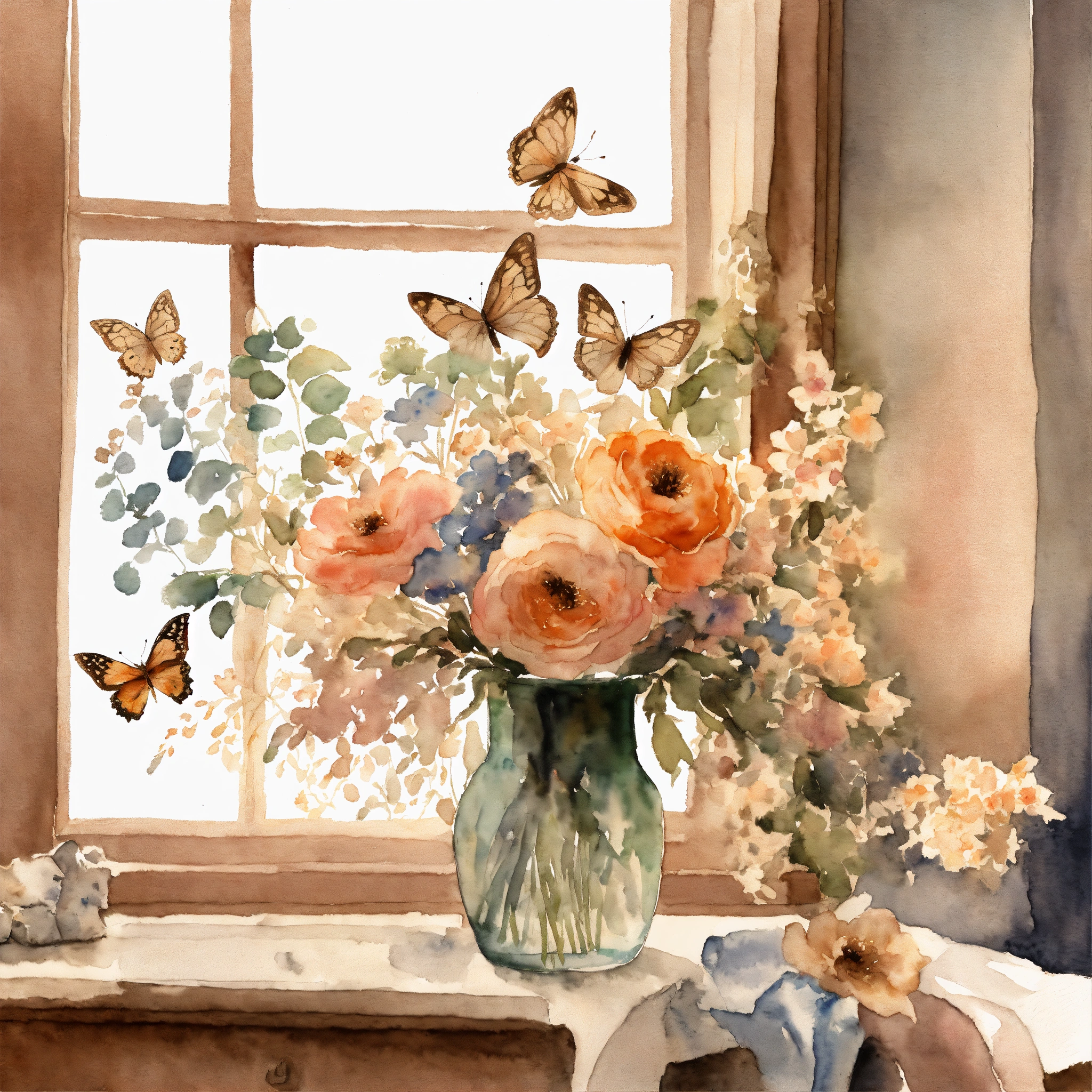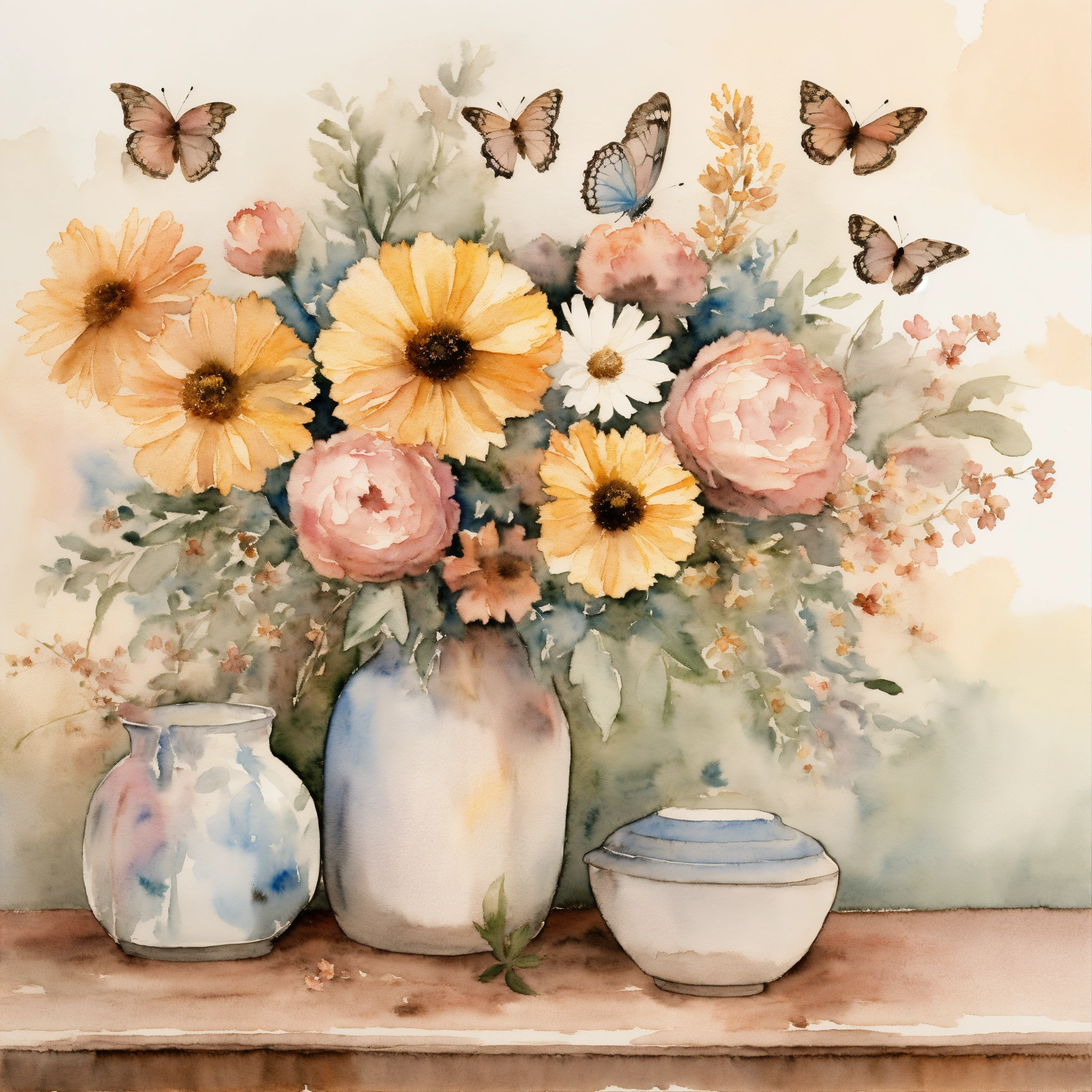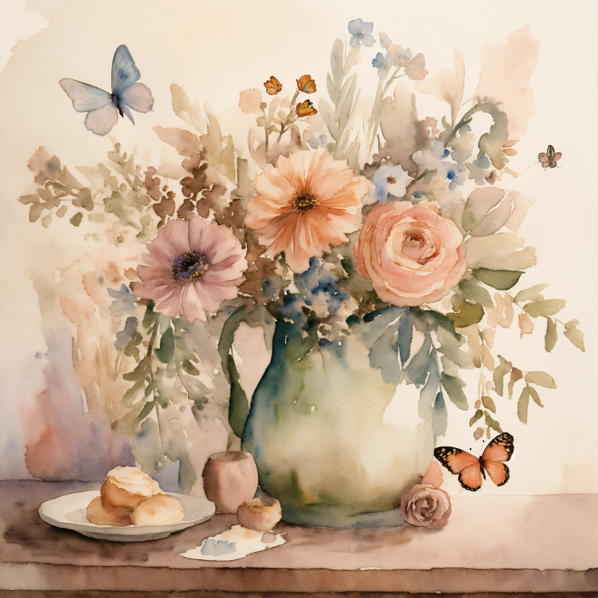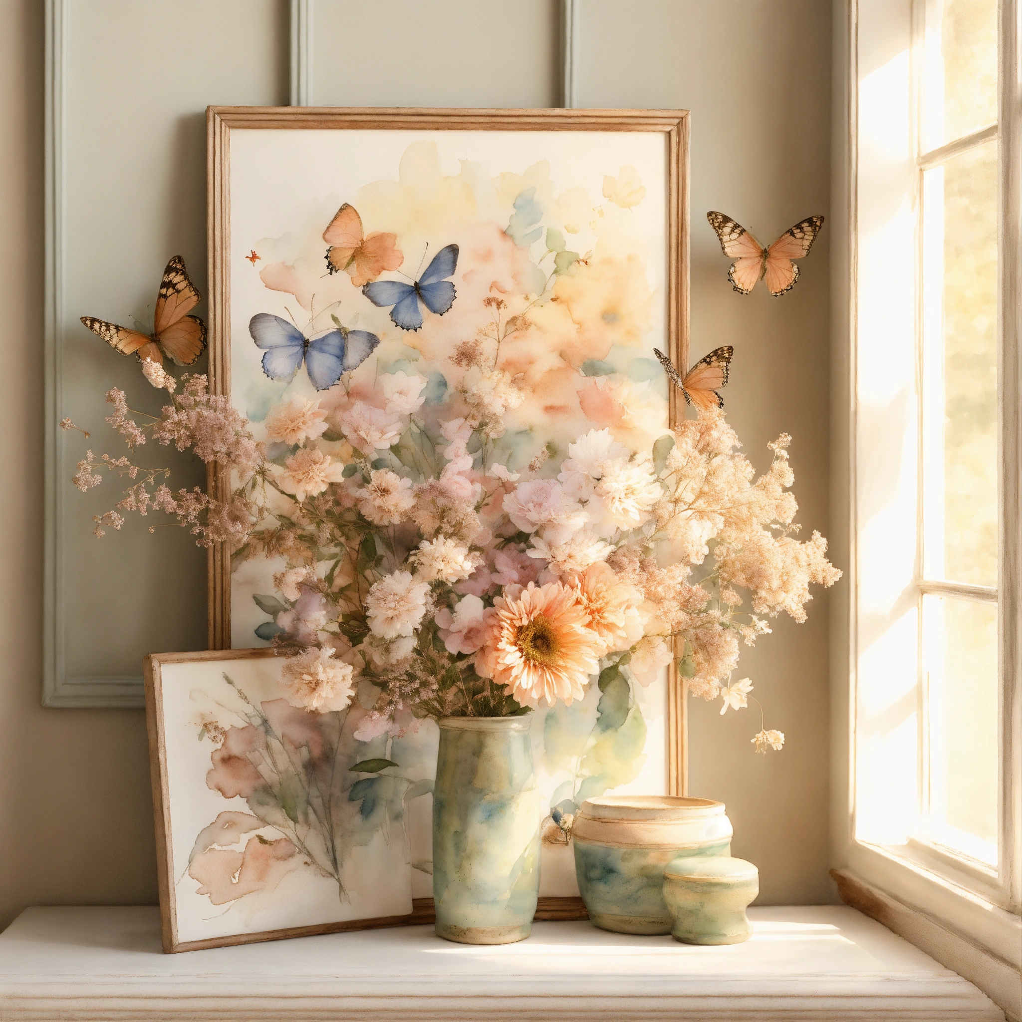 A charming watercolor painted vignette with dry florals and butterflies, cottagecore, muted warm pastel colors, white background