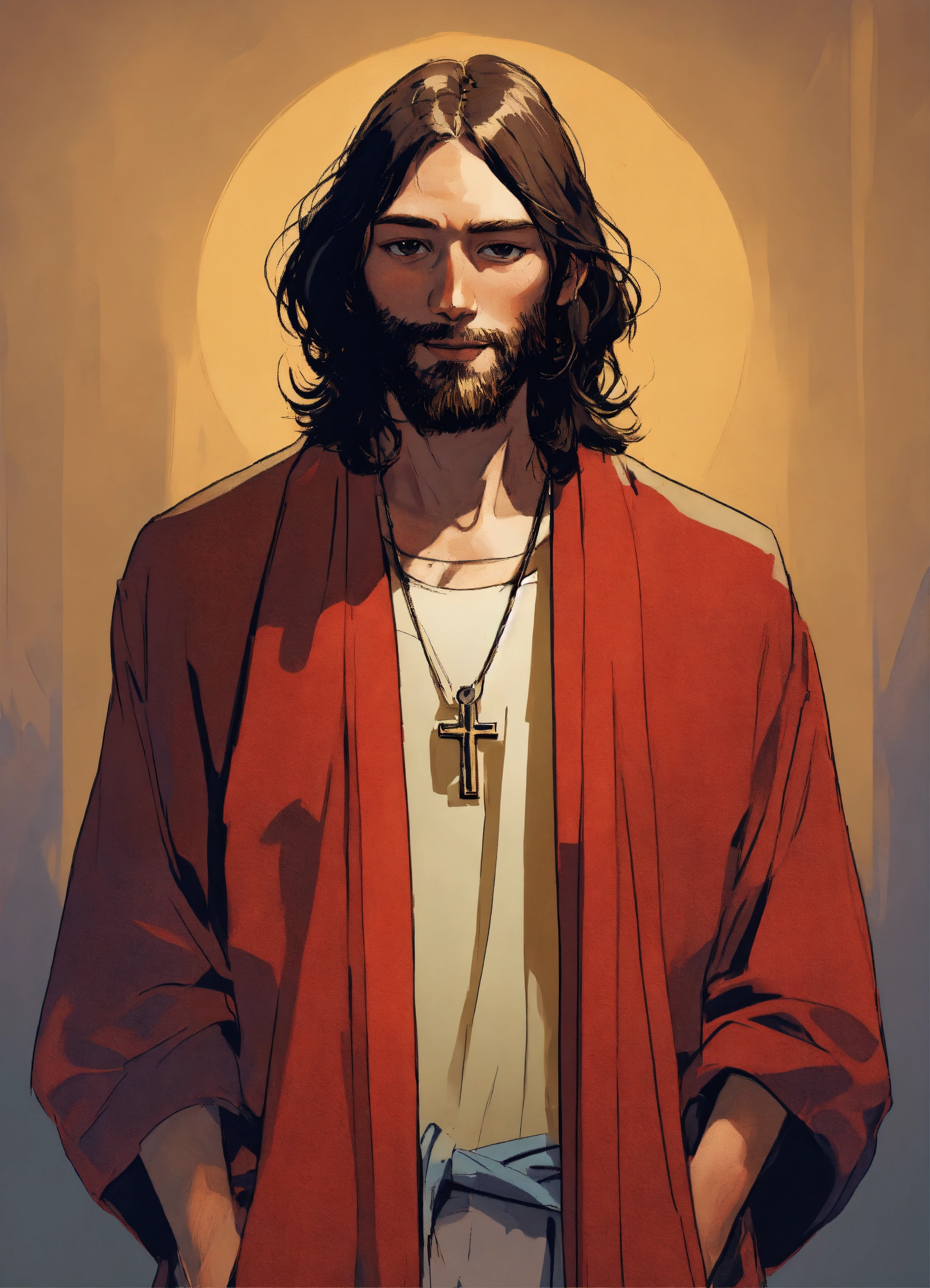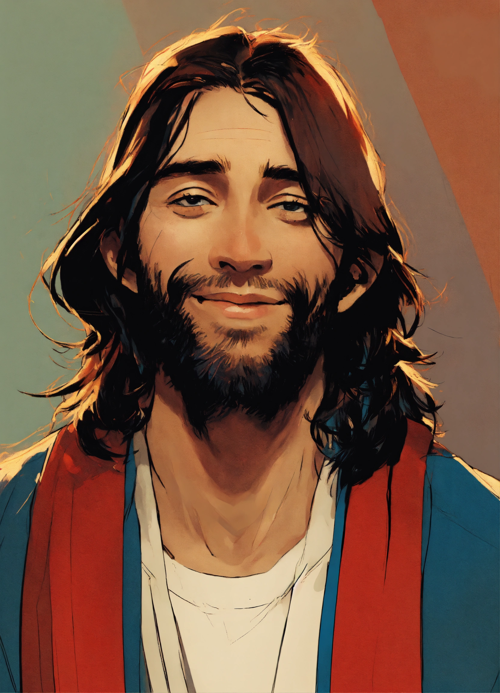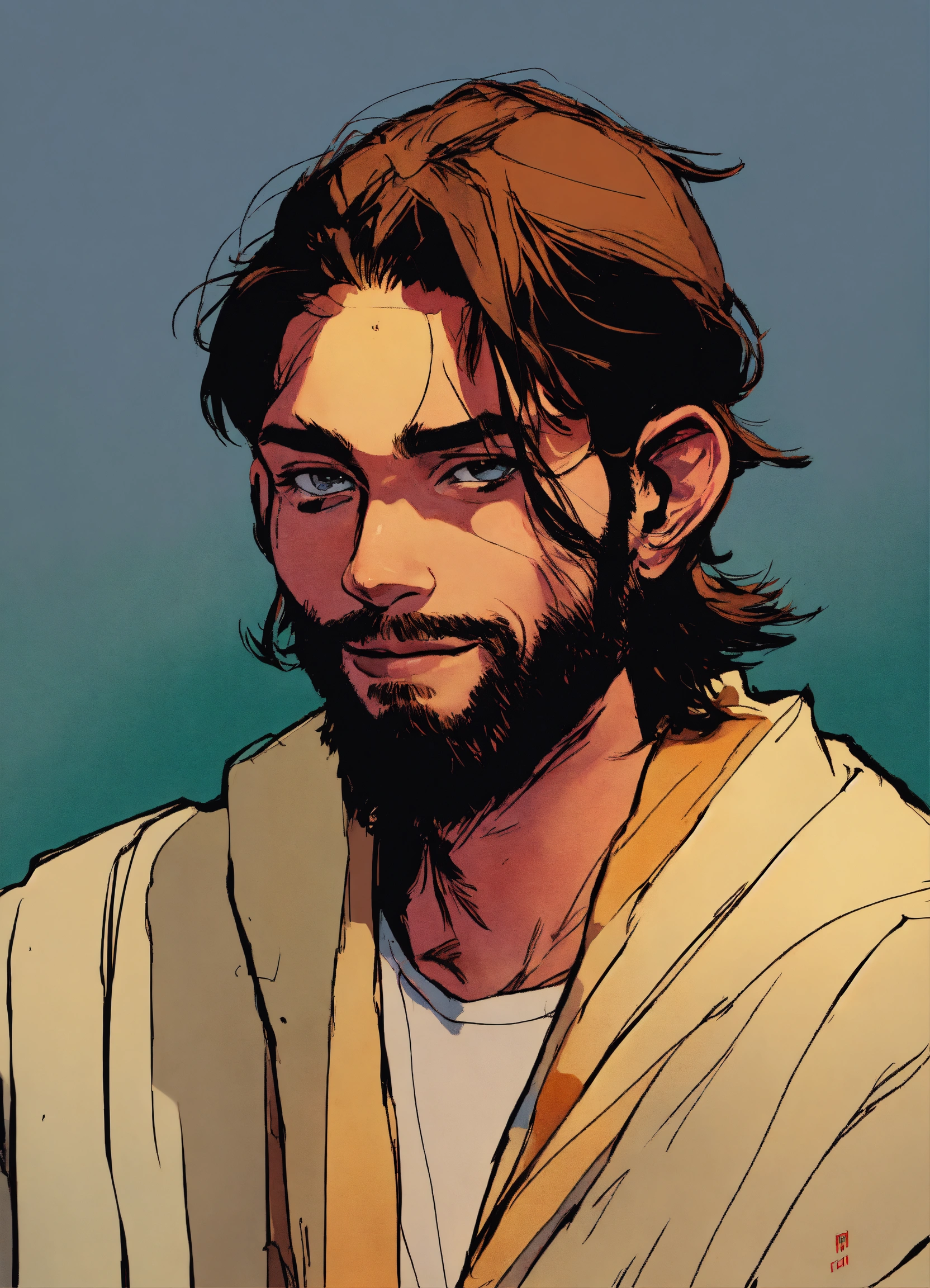 Jonathan roumie jesus by jamie hewlett, subtle smile, manga style, concept art by jamie hewlett, jamie hewl, ape nft style, simple, minimalistic