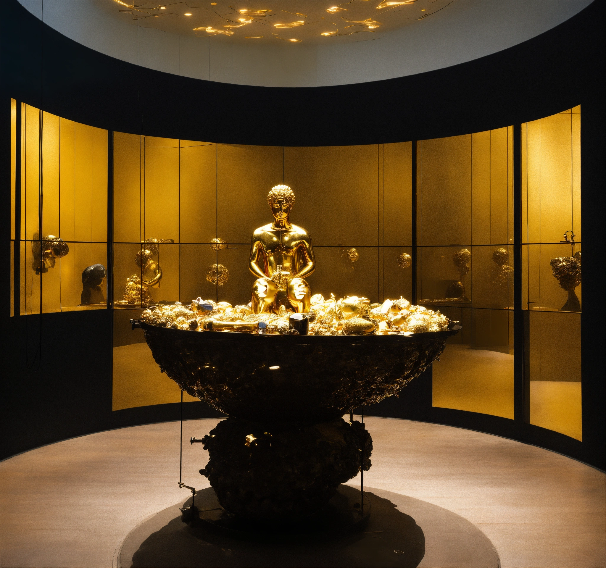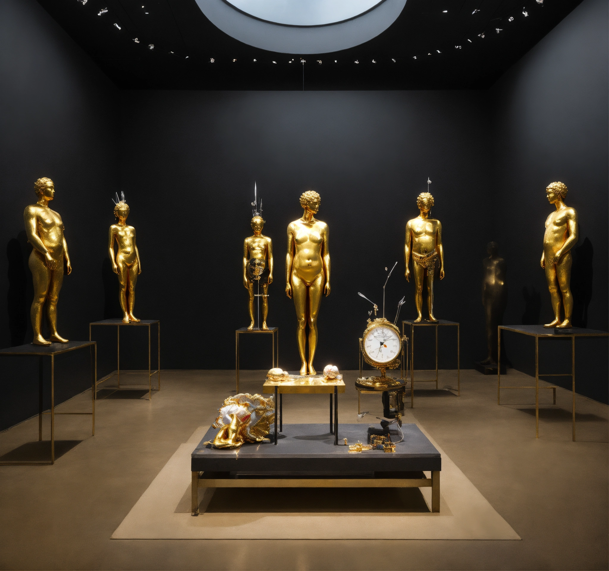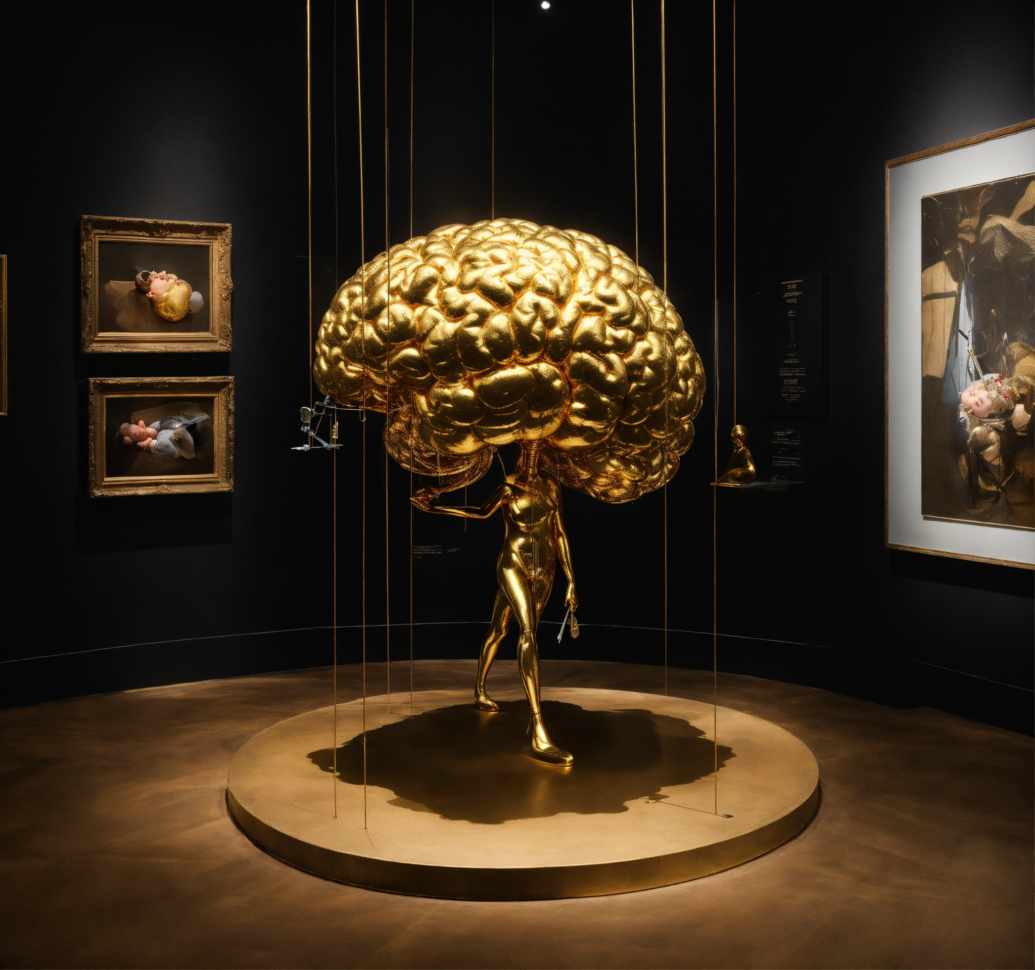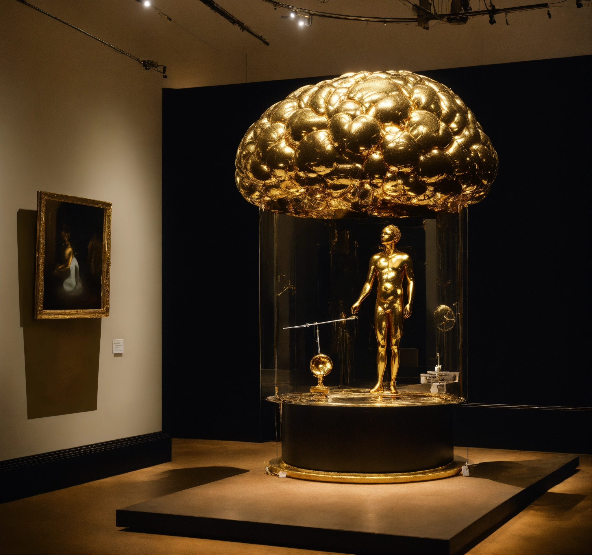 A huge golden brain, very small beautiful female human bodies, complex surgical instruments, and a newborn boy within a time vortex, minimalism, black background, installation, sculpture by adrian ghenie, lucian freud, rene magritte, salvador dali