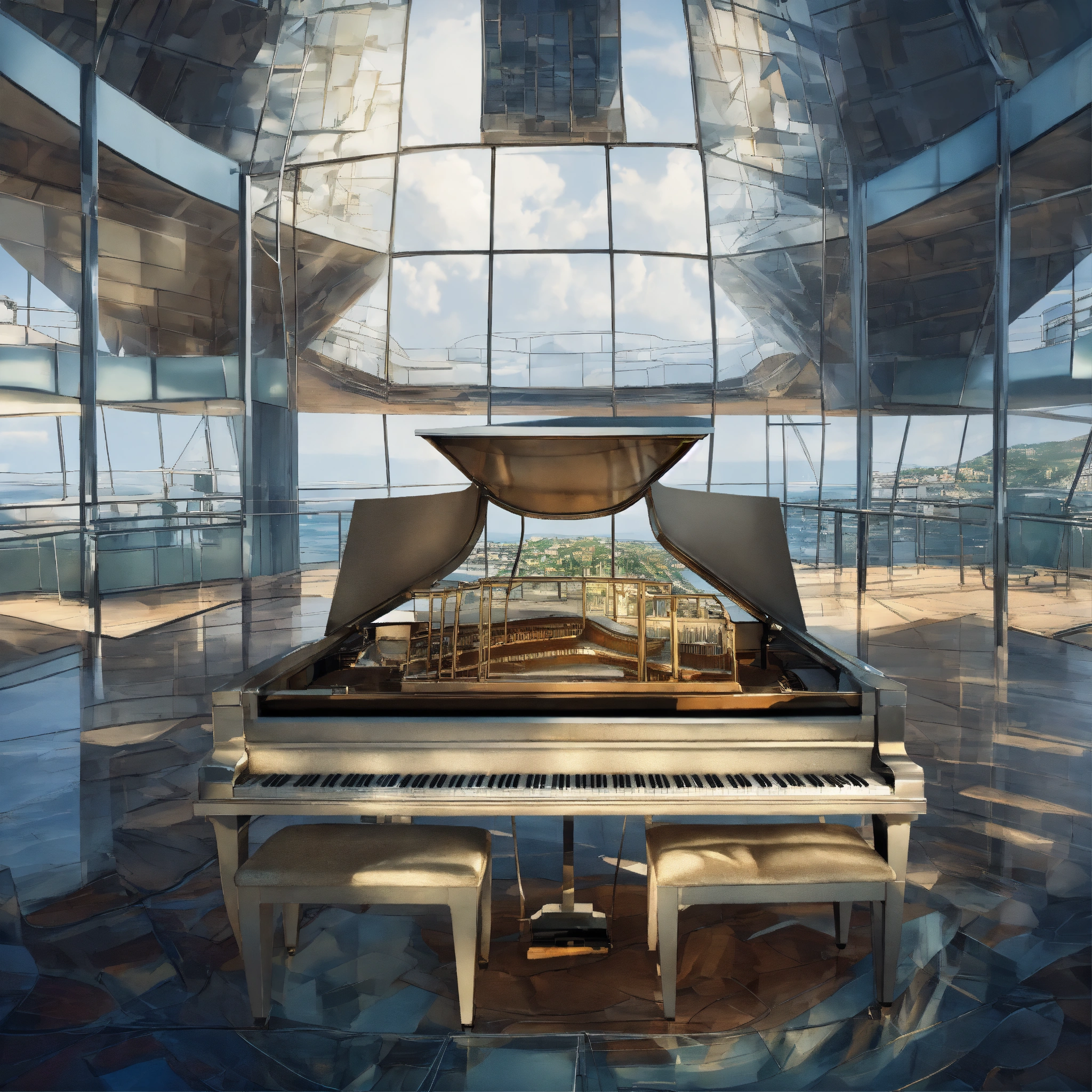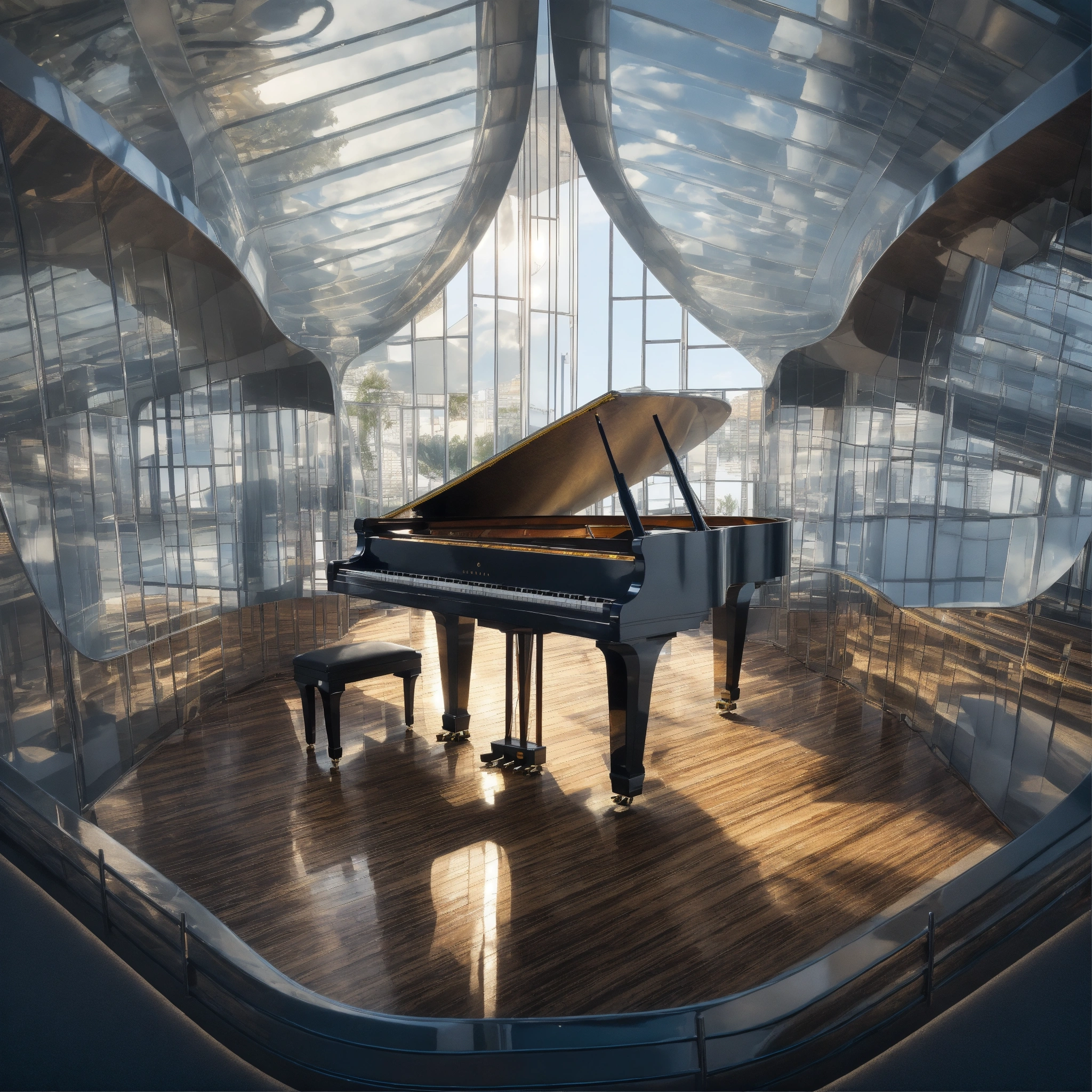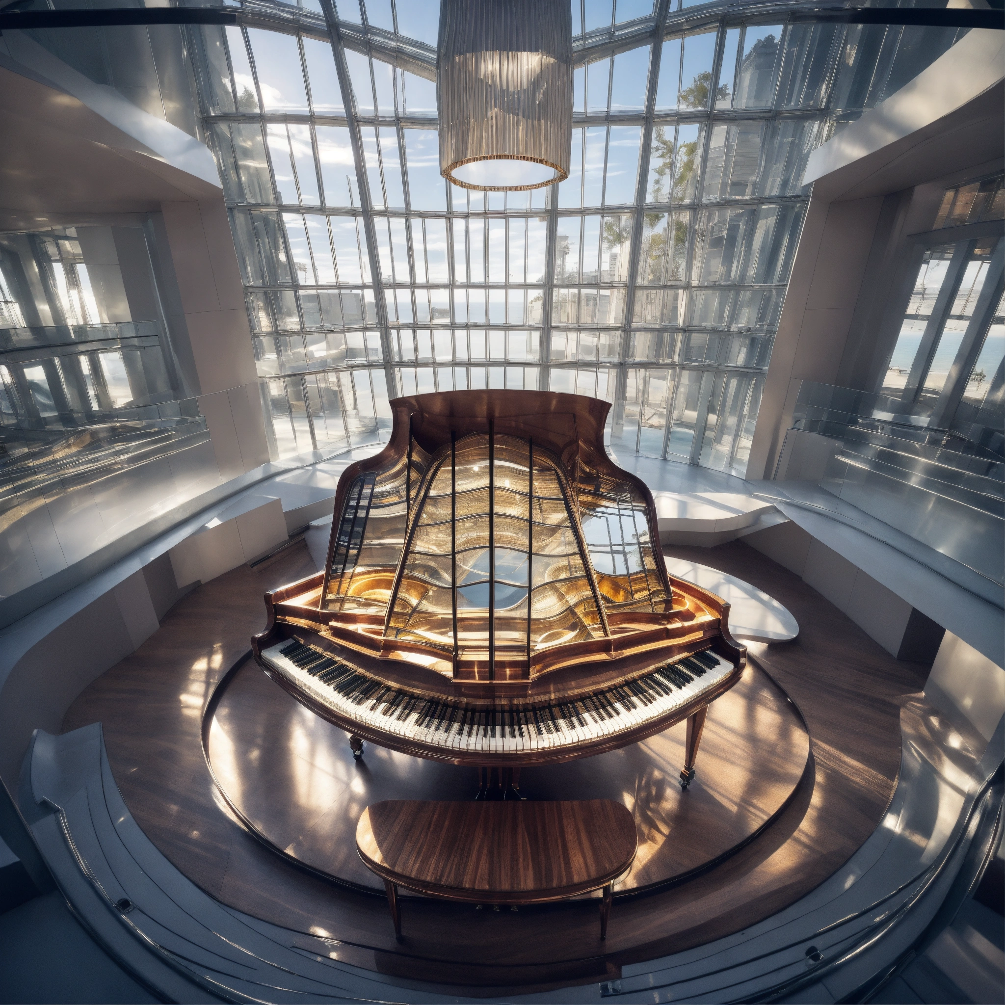 Very bizarre angle of a photorealistic closeup view of inside a transparent piano, imagine you are standing inside of a piano and watching a modern concert hall inside the architecture of the instrument designed by frank gehry, don't show anything outside of the instrument but an ocean, just inside, the hidden part from eyes. created by canaletto, highly detailed image, extremely high resolution, surrealistic construction inside the piano, landscape ratio, 16/9 aspect ratio