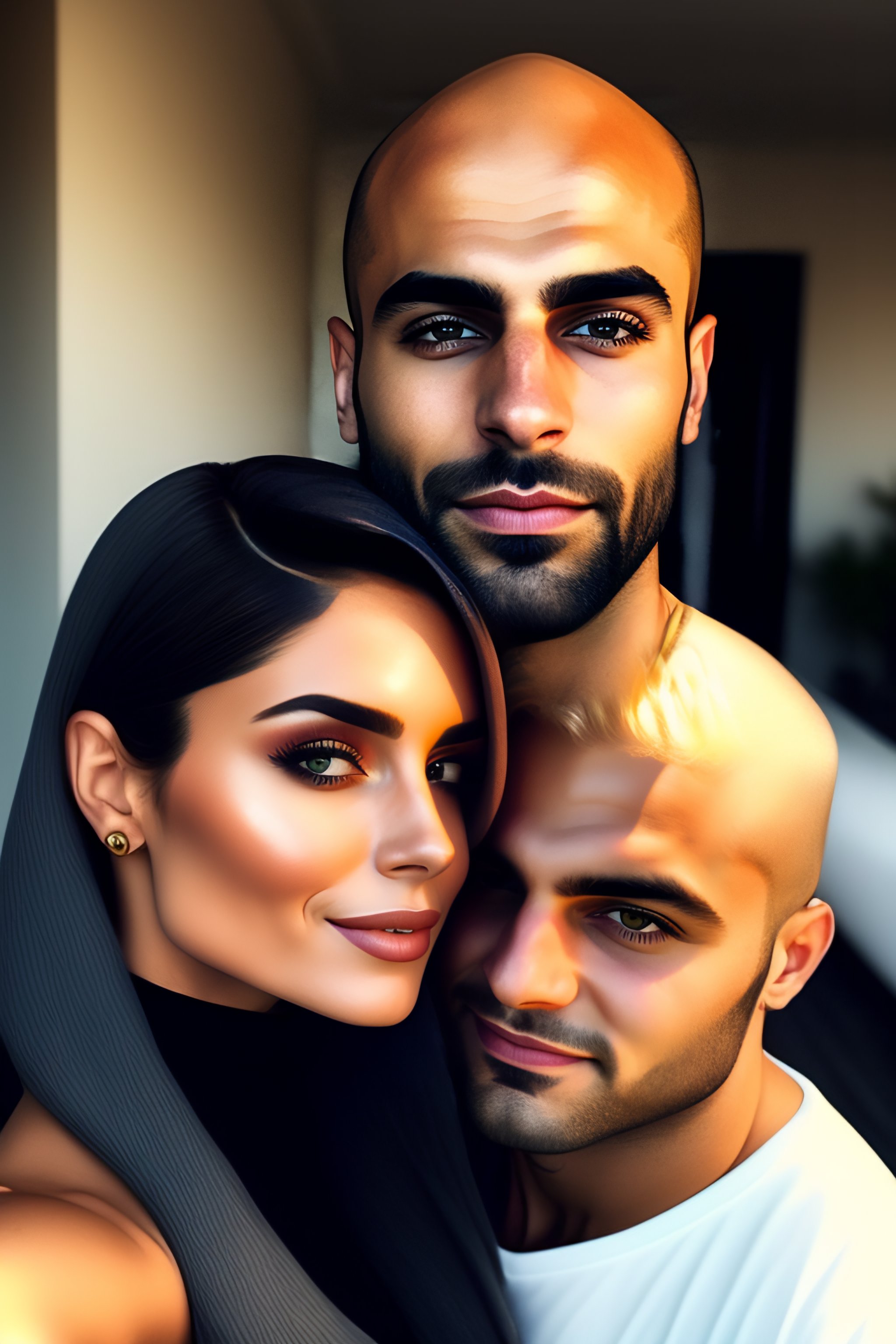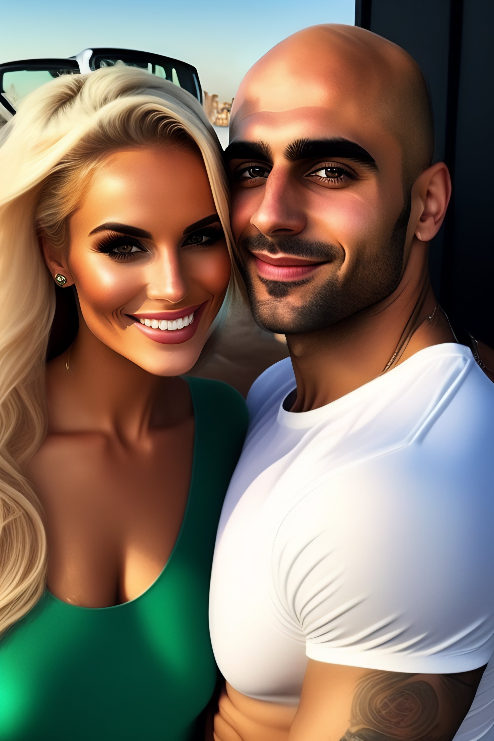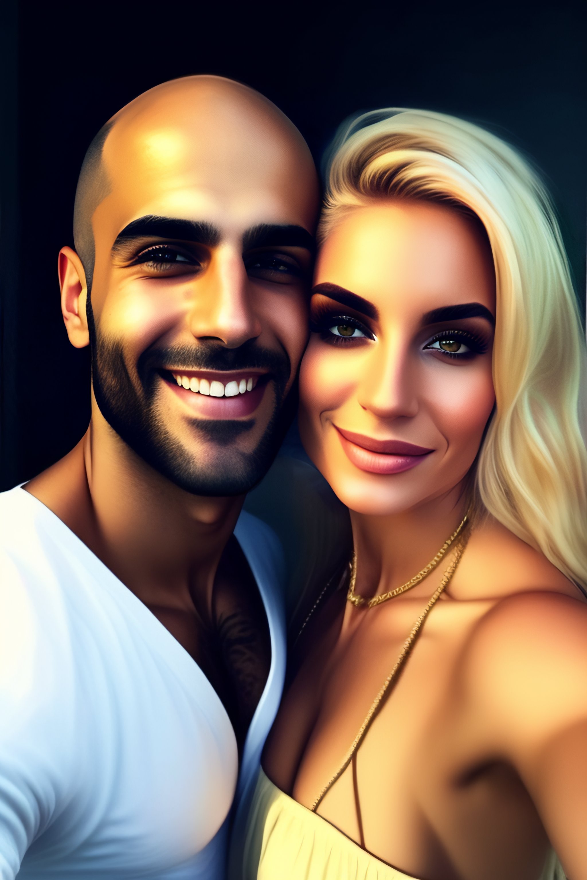 Typical bald young iranian man, in love, a typical young swedish woman with blonde hair and green eyes and no make up