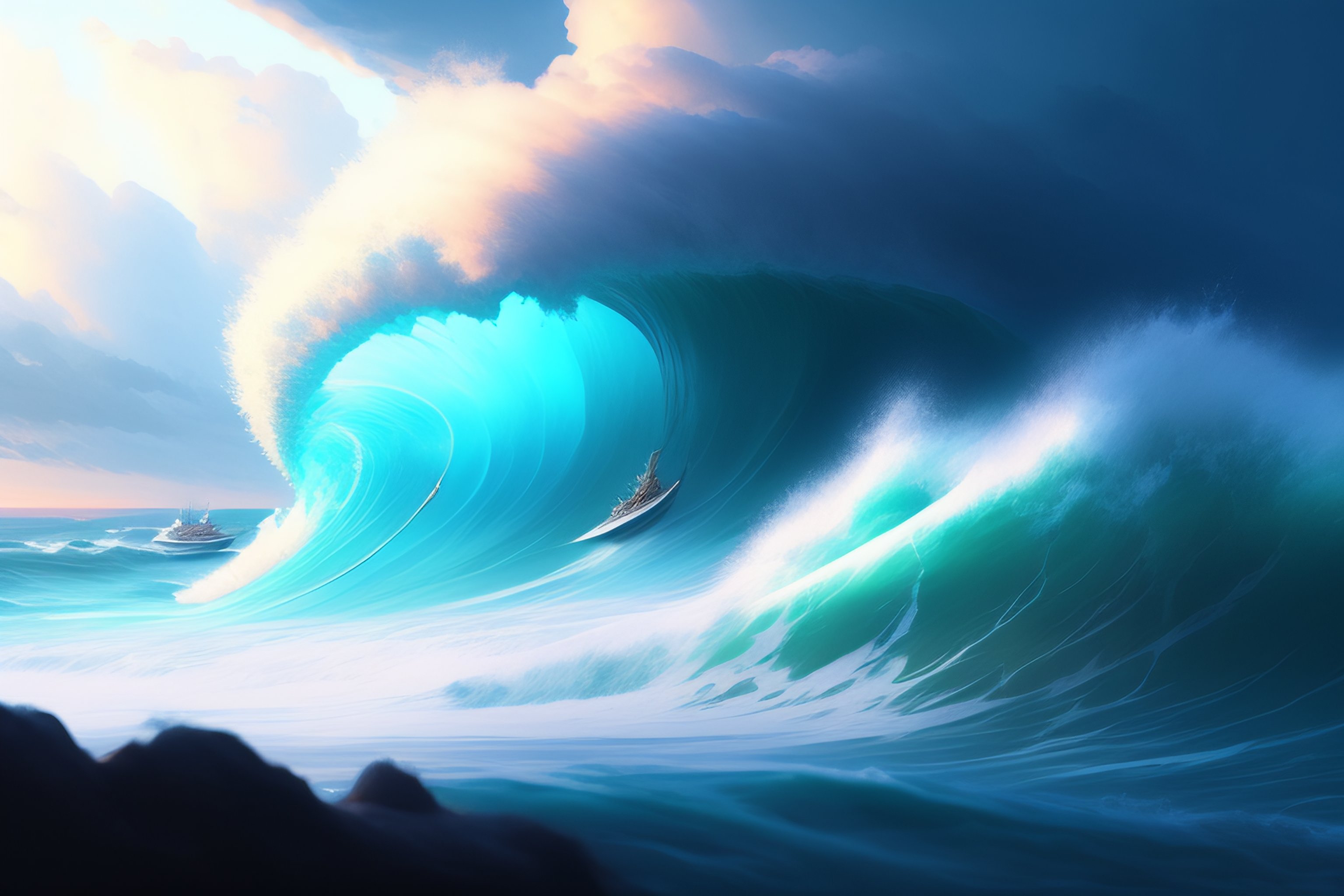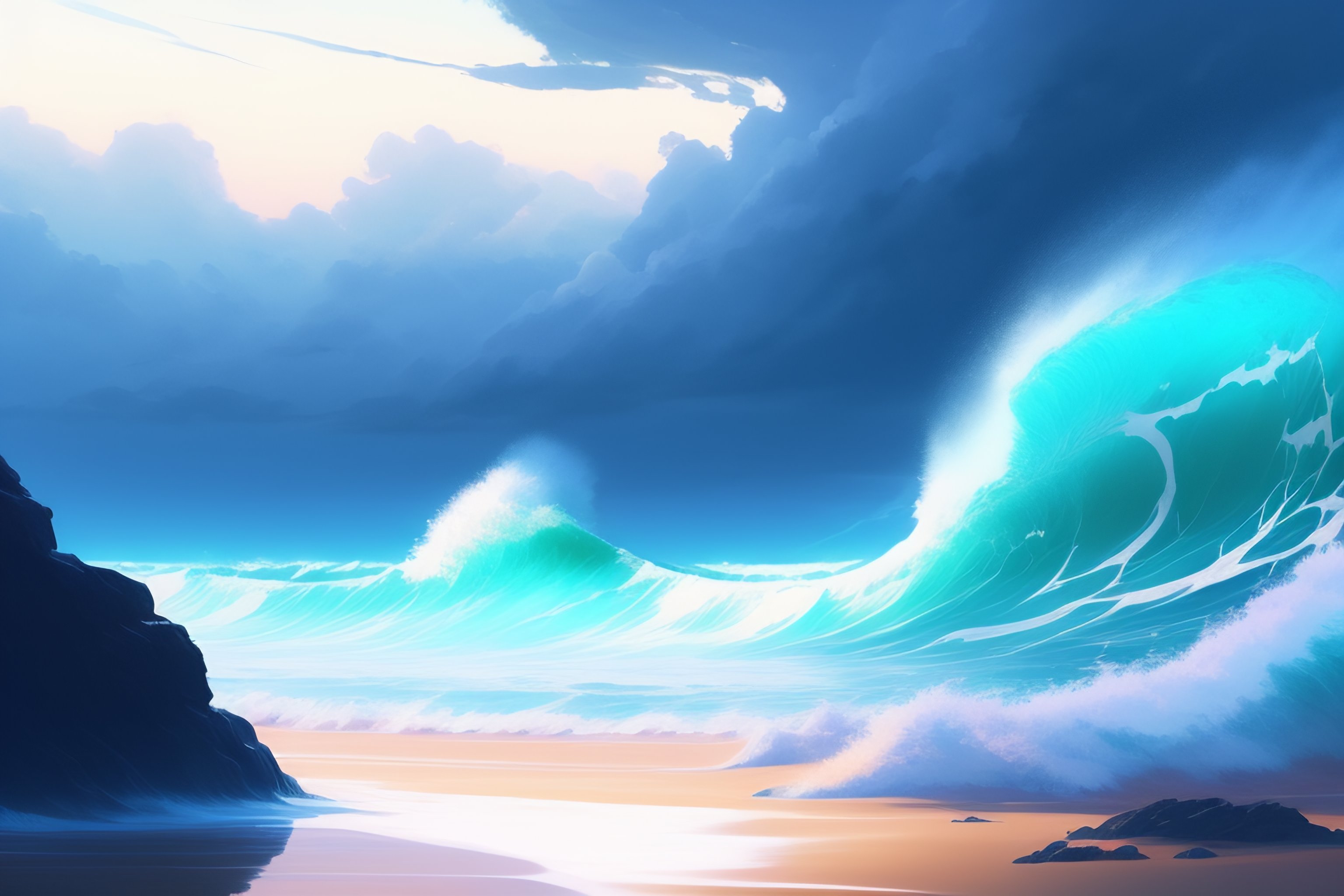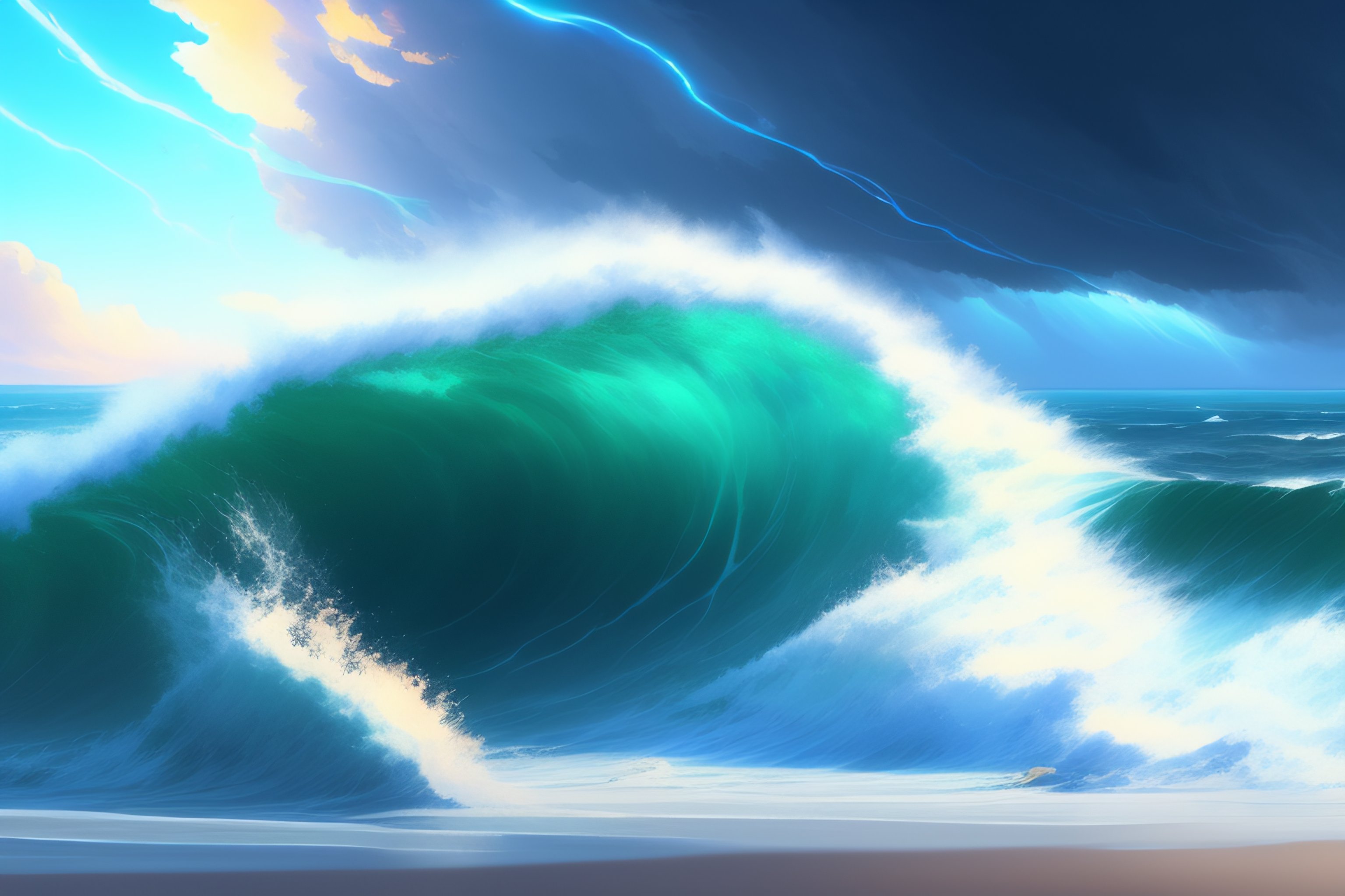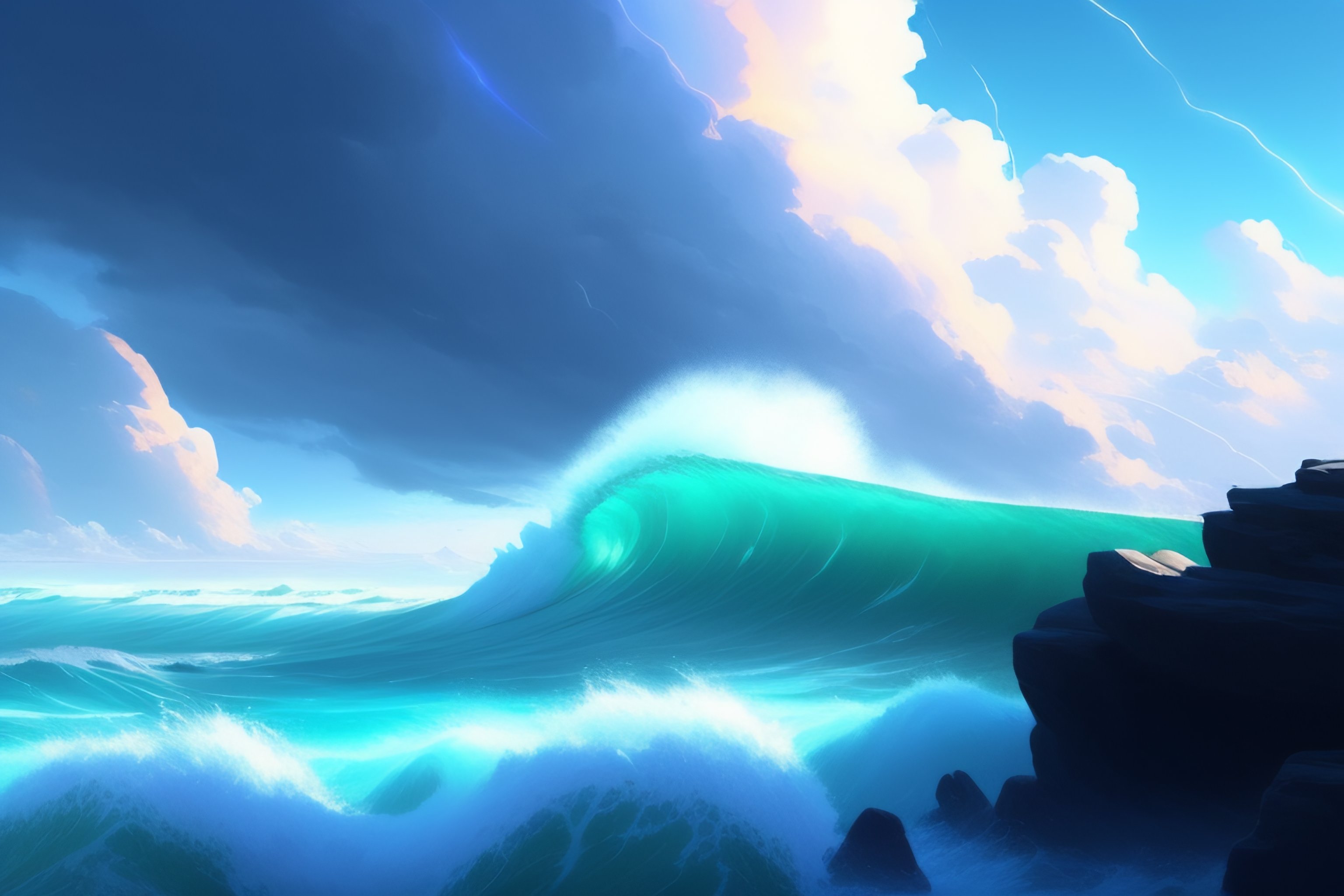 Concept art of a infinite storm, key visual, blue tinted clouds, ocean has large and dangerous waves, waves reflects lightning, highly detailed, digital painting, artstation, concept art, sharp focus, violent blue lightning, streamlined, by makoto shinkai and akihiko yoshida and hidari and wlop