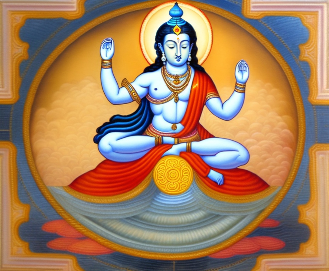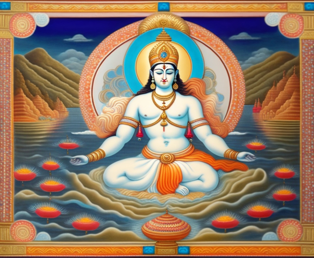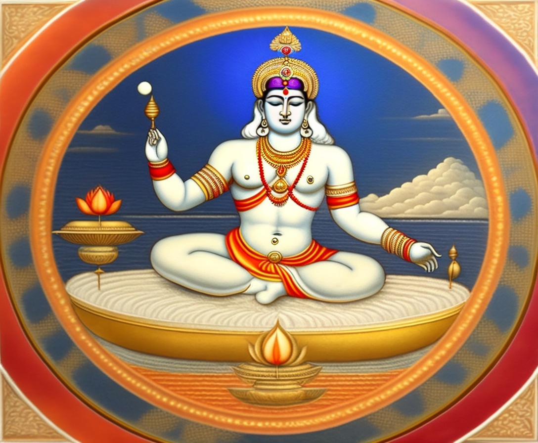 Lord vishnu having four arms with shanka, chakra, gadha, lotus, and sleeping on adhi sheshu in milk sea